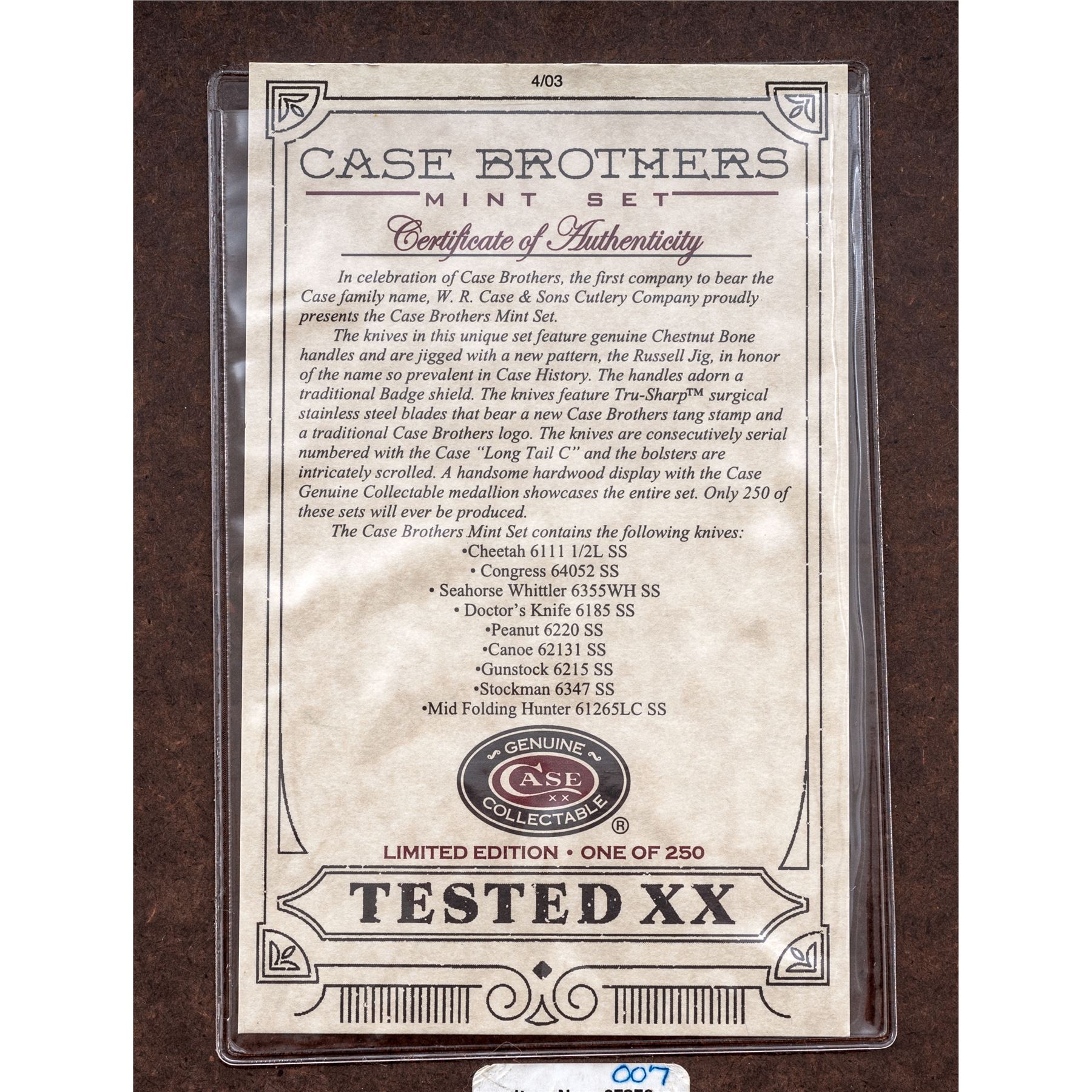 Framed Limited Edition Case Knives ''Tested XX'' Mint Set, consisting of nine (9) folding knives and one fixed blade knife, all with Peach Seed Jigged Midnight Black Bone handles, engraved bolsters, and includes the following patterns: Cheetah, Large Stockman, Sowbelly, Saddlehorn, Folding Hunter, Trapper, Small Slab Side Hunter, Mid-Folding Hunter, Drop Point RussLock, and Barlow. This set is number 017 of only 250 produced and includes a COA. In hardwood glass front display case with Case ''Genuine Collectible'' & ''Tested XX'' medallion; glass is decorated with silver lettering. The knives and wood display are in excellent as new overall condition. This limited edition set would make a fine display or addition to Case knife collection. Est.: $500-$700.