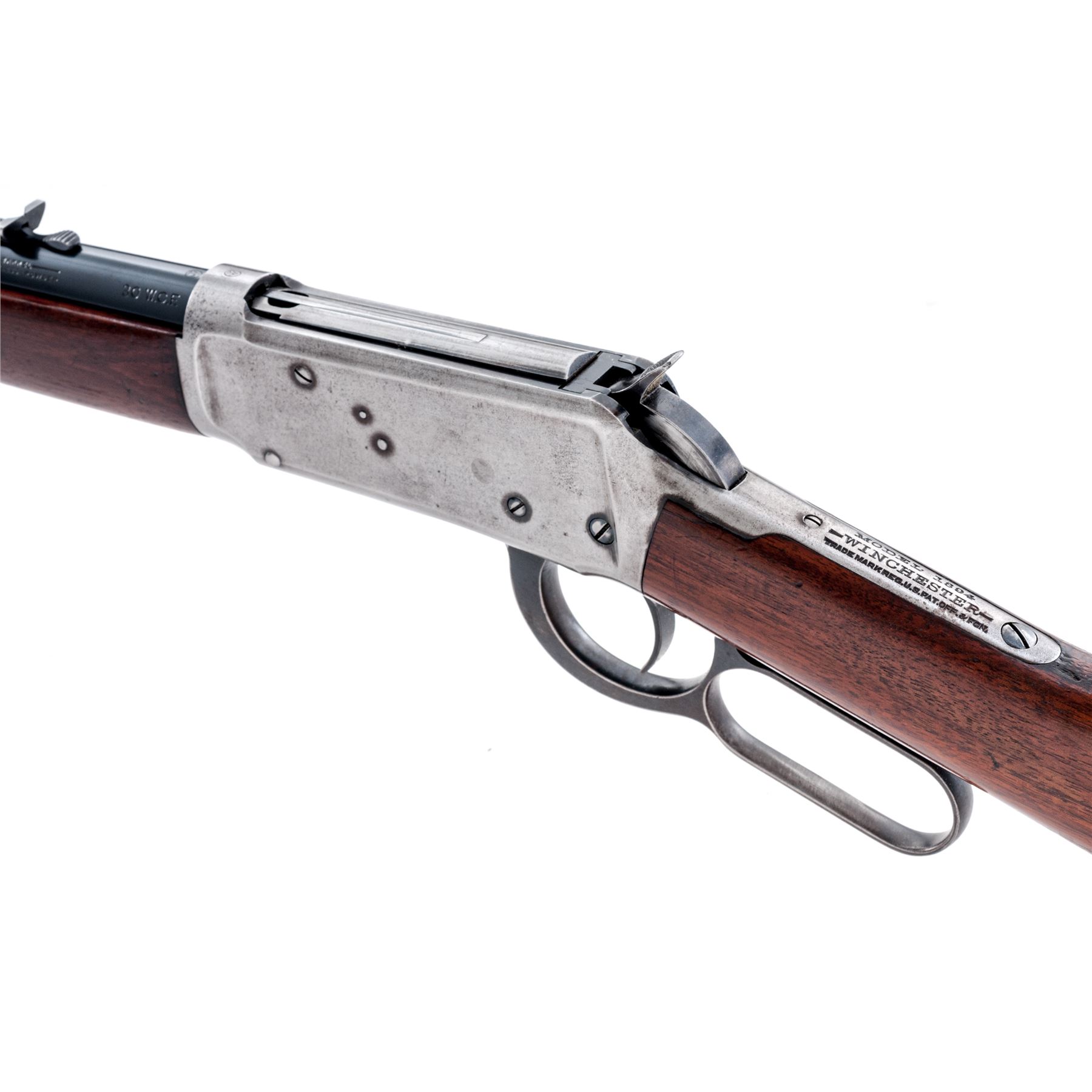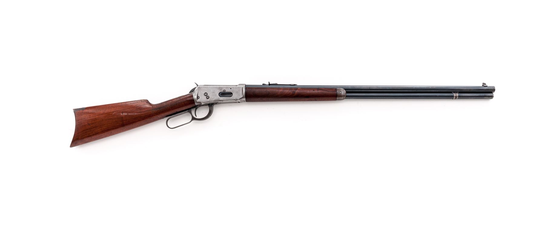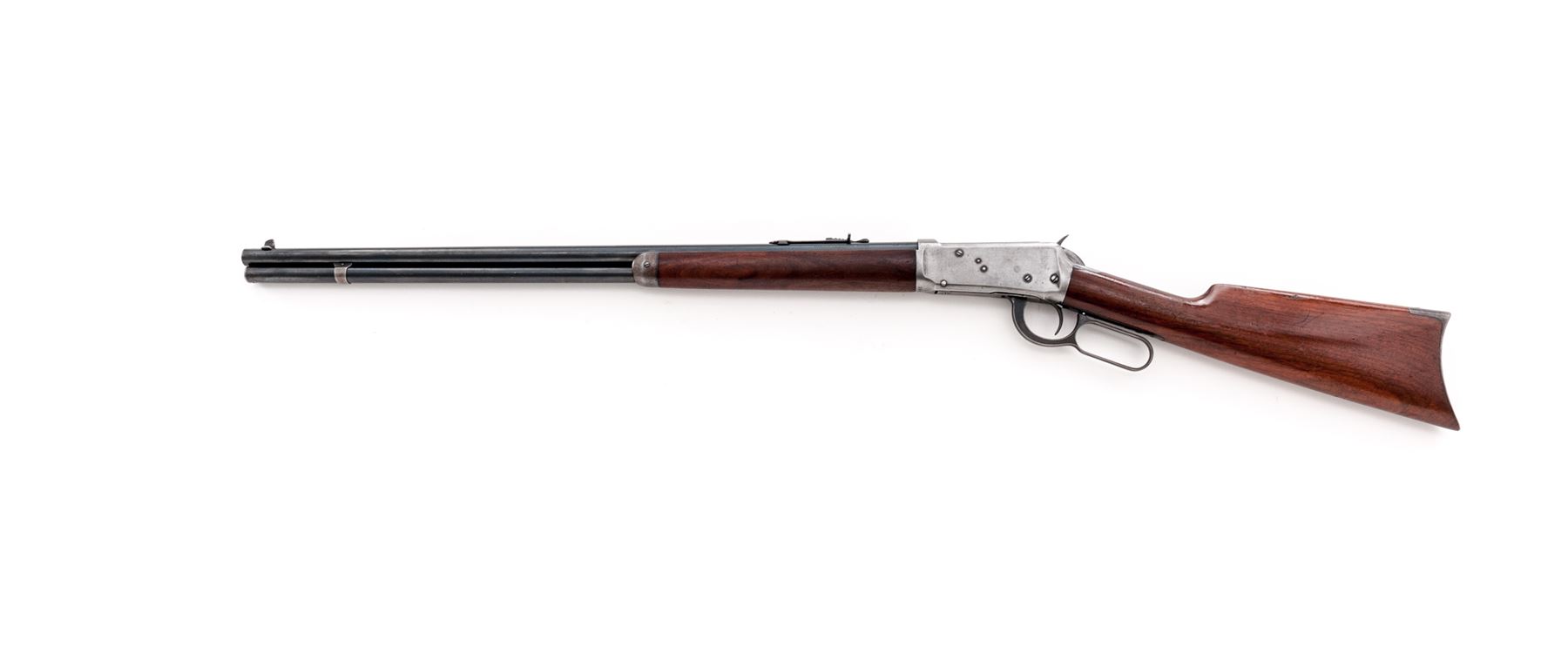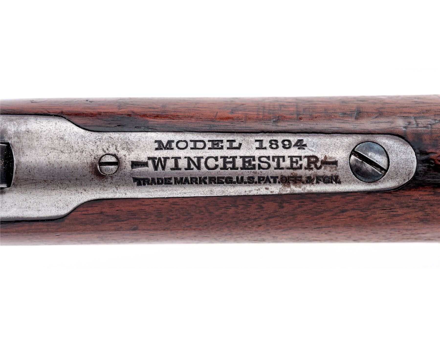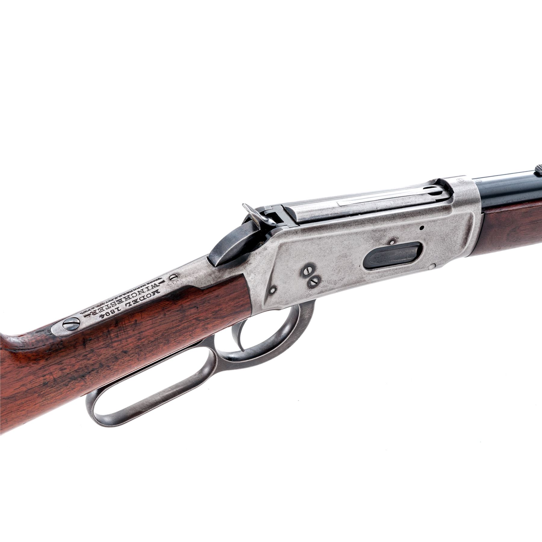 Winchester Model 1894 Lever Action Rifle, #820941, .30 WCF (.30-30 CF) cal., blued 26'' barrel, with dovetailed blade front and adjustable notched rear sights, marked with maker's name, address and 1894 patent date on left side above nosecap, ''Nickel Steel Barrel/Especially for Smokeless Powder'' and ''30 W.C.F.'' at left breech; blued tubular magazine; receiver is marked ''Model 1894/Winchester/Trade Mark Reg. U.S. Pat. Off. & Fgn.'' on upper tang, and serial number at lower front; case hardened loop operating lever and hammer; varnished walnut stocks, forend with steel nose cap, buttstock with steel crescent buttplate. Mfg'd 1917. Condition is fine. Barrel and mag tube approx. retain 90% smooth original blue; receiver is a cleaned gunmetal gray; lever, nose cap and buttplate are a darkening gray. Stocks are smooth and sound with light marks of age and use (a shallow scrape at right wrist), and pleasing grain and color. Action is strong and smooth; bore is dark with defined rifling. Est.: $600-$900. (C&R)