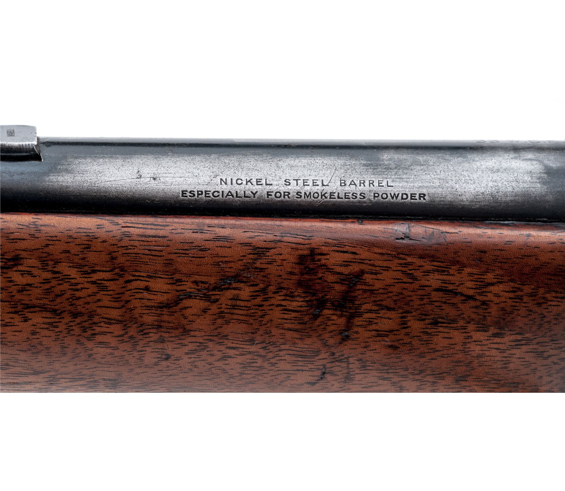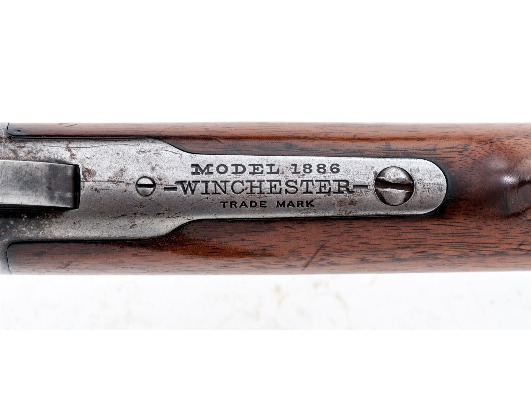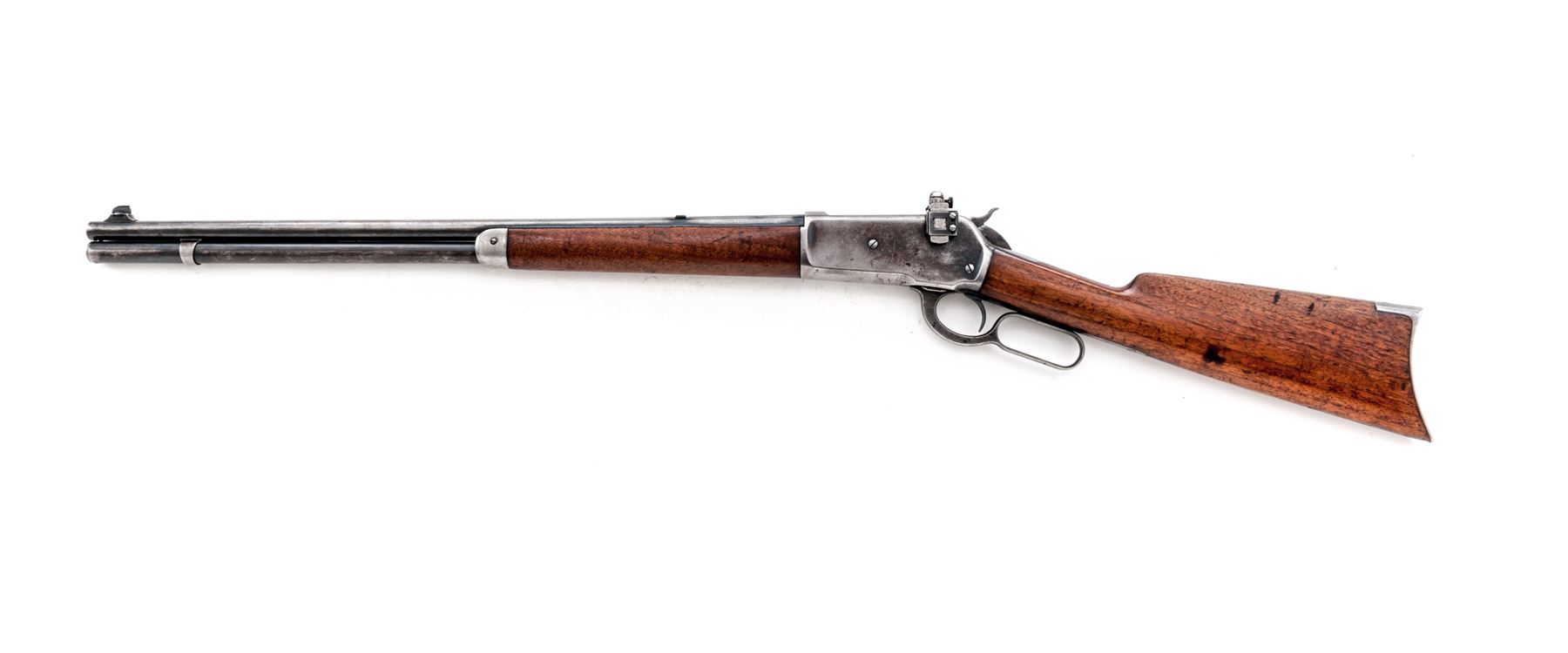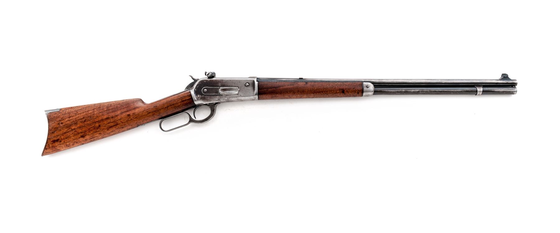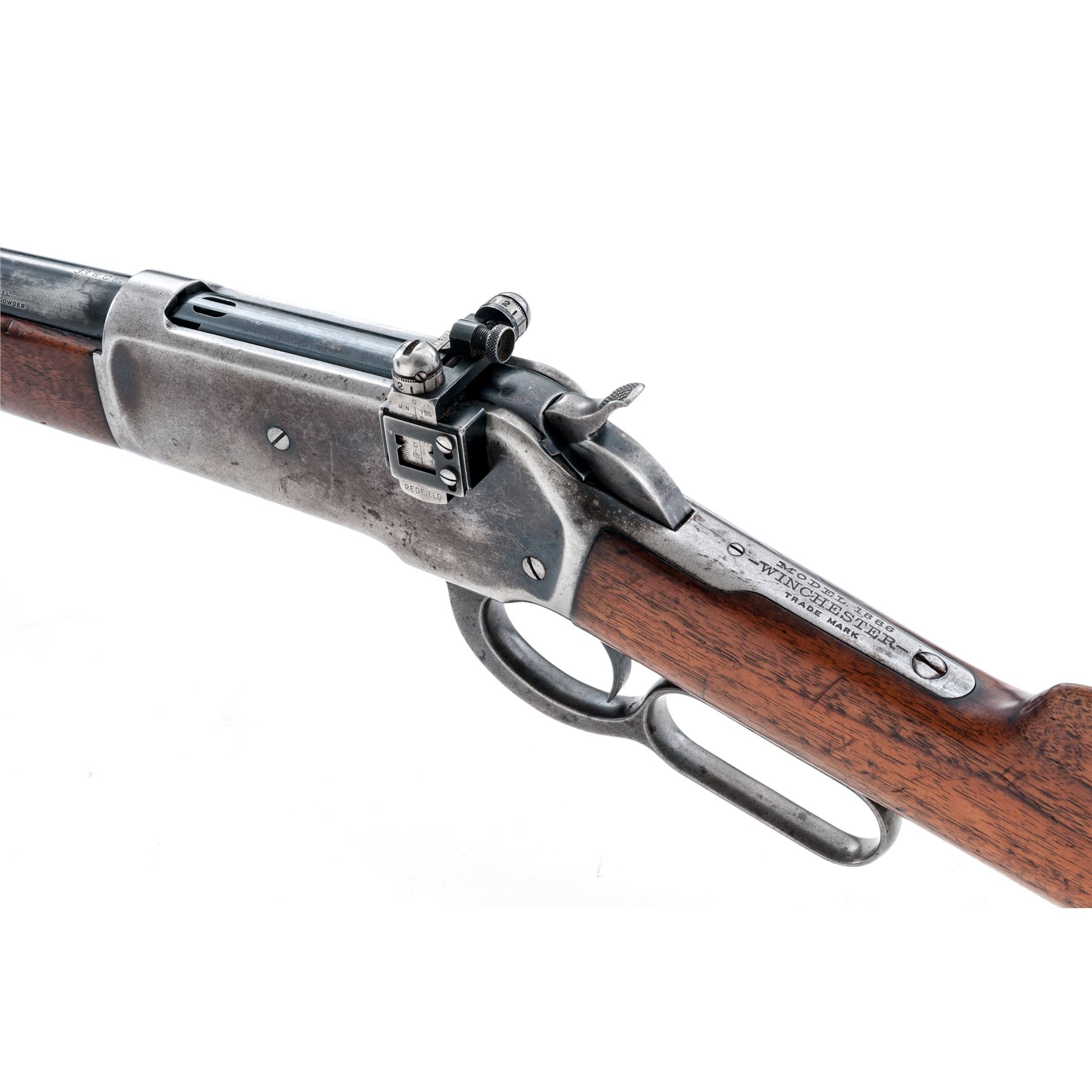 Winchester Model 1886 Lever Action Rifle, #133063A, .33 WCF cal., blued 24'' round barrel, with dovetailed raised bead-blade front sight (and plugged rear sight dovetail), marked with maker's name and address in two lines on top, and ''33 W.C.F.'' at breech; blued tubular cartridge magazine; blued receiver with Redfield multi-adjustable sight, is marked ''Model 1886/Winchester/Trade Mark'' on upper tang, and serial number on lower; loop operating lever; oil-stained walnut forearm with steel nose cap, matching buttstock with steel crescent buttplate. Mfg'd 1904. Condition is very good. Barrel, mag tube and receiver retain approx. 35% original deep blue in protected areas (the balance gunmetal gray); hammer, lever, nose cap and buttplate are gunmetal gray. Stocks are sound and smooth showing the marks of age and use, and perhaps an added coat of linseed oil. Action is tight and smooth; bore is brilliant with deep rifling. Est.: $1,200-$1,800. (C&R)