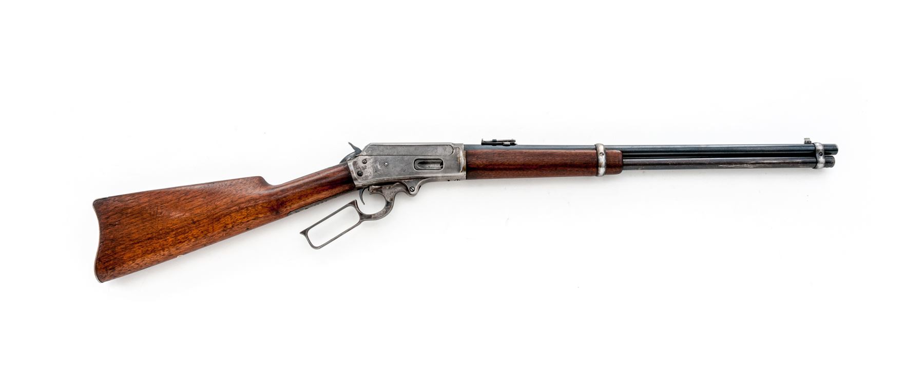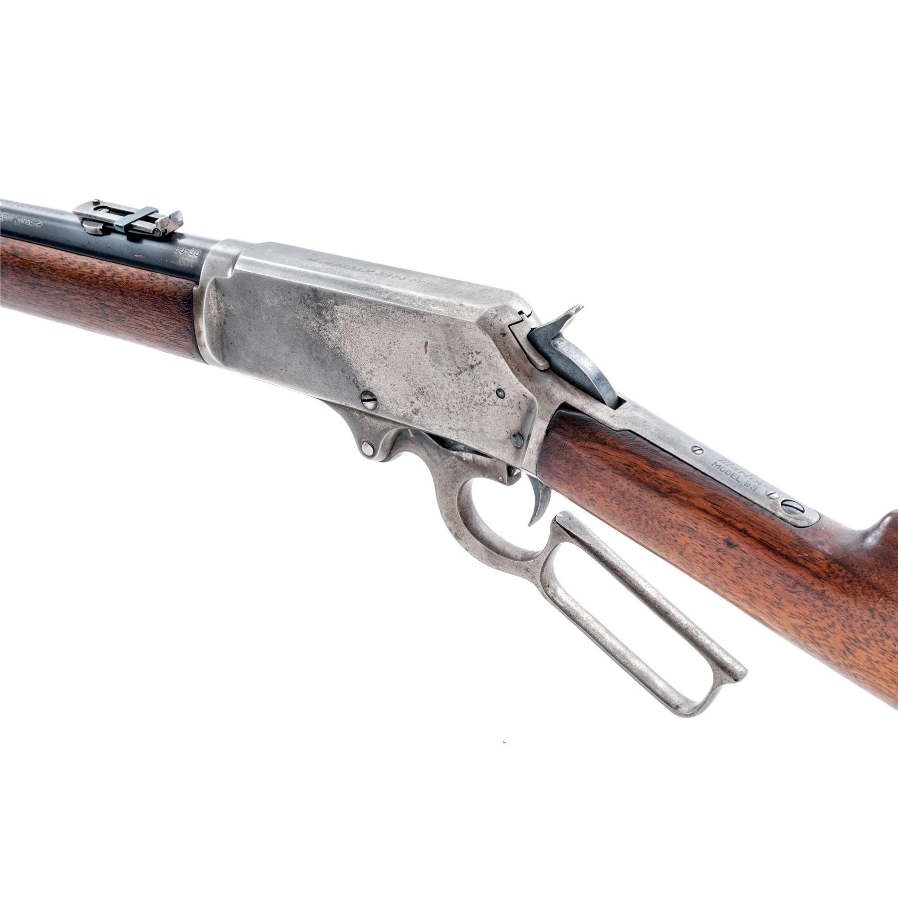 Marlin Model 93 Lever Action Repeating Carbine, #8085, .30-30 CF cal., 20'' round barrel, with block-blade front and adjustable sliding-leaf rear sights, marked with the maker's name, address and ''Special Smokeless Steel'' flanked by diamonds behind the rear barrel band, and ''30-30'' at breech; full-length tubular magazine with retaining band at front sight; solid receiver is marked ''Marlin Safety'' flanked by feather-like brackets, ''Marlin/Model 93'' on top tang, and ''8085'' on bottom tang; loop operating lever; oil-stained walnut forearm and buttstock with carbine buttplate. Mfg'd ca. 1920s-30s. Condition is very good. Barrel retains approx. 80% blue, mag tube 40%, case hardened receiver and buttplate have silvered out, hammer and lever show good case colors. Stocks are sound and smooth showing nice grain and color. Action is currently inoperable; bore is brilliant with shallow rifling. Est.: $350-$550. (C&R)