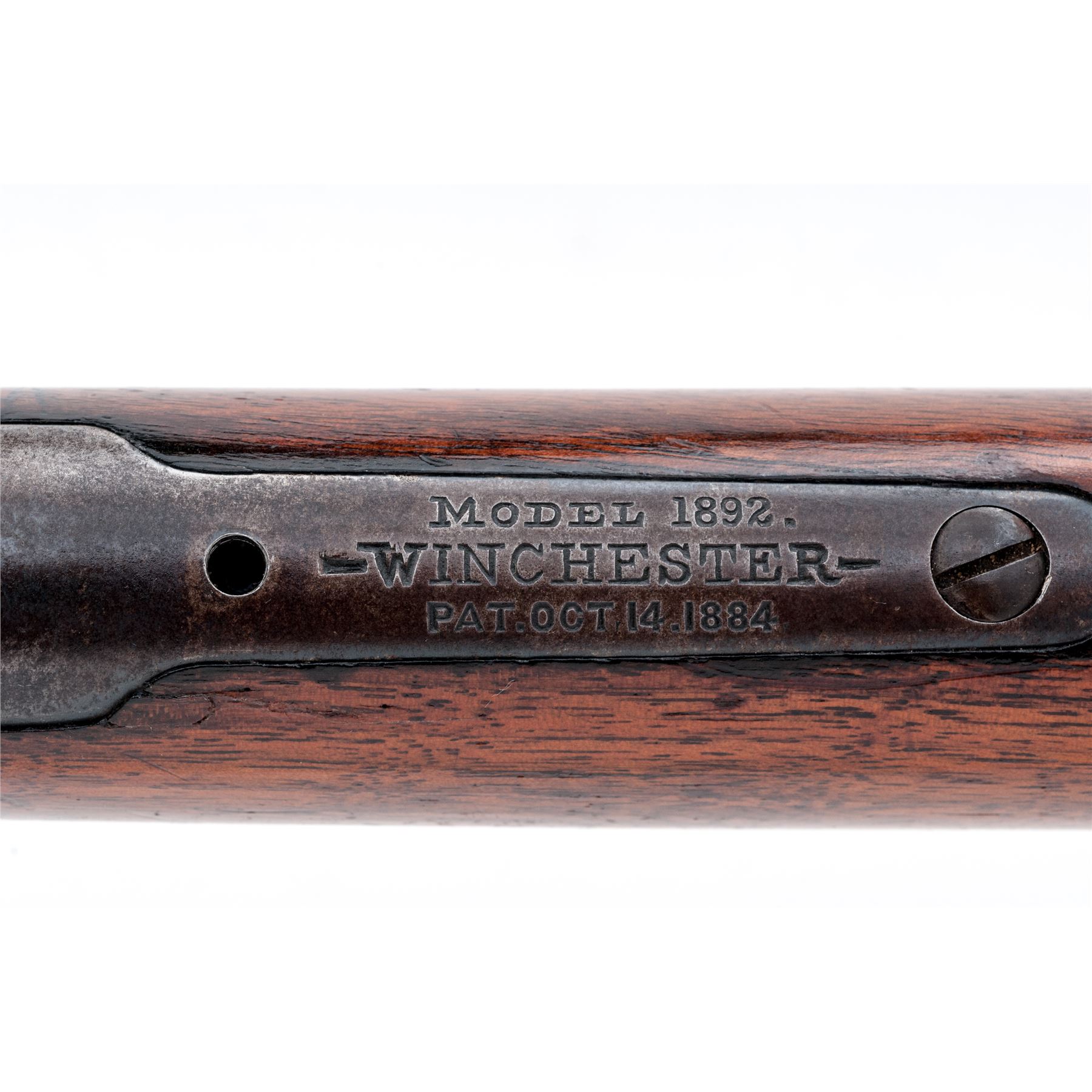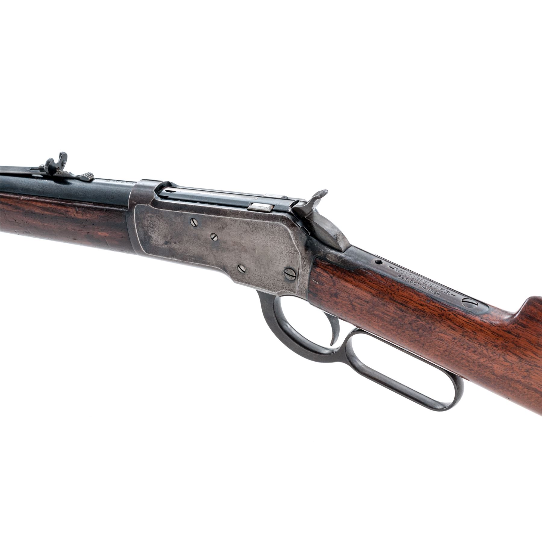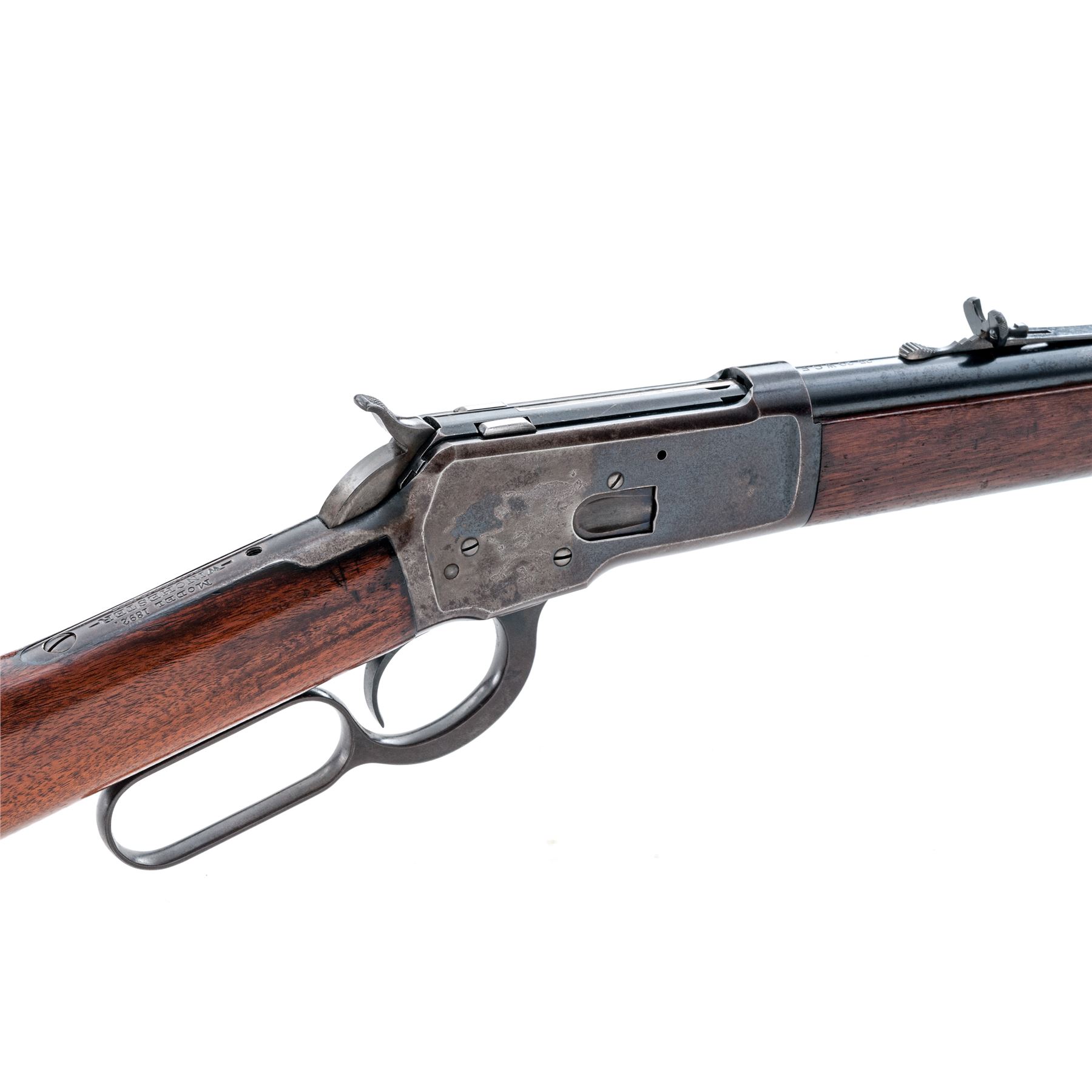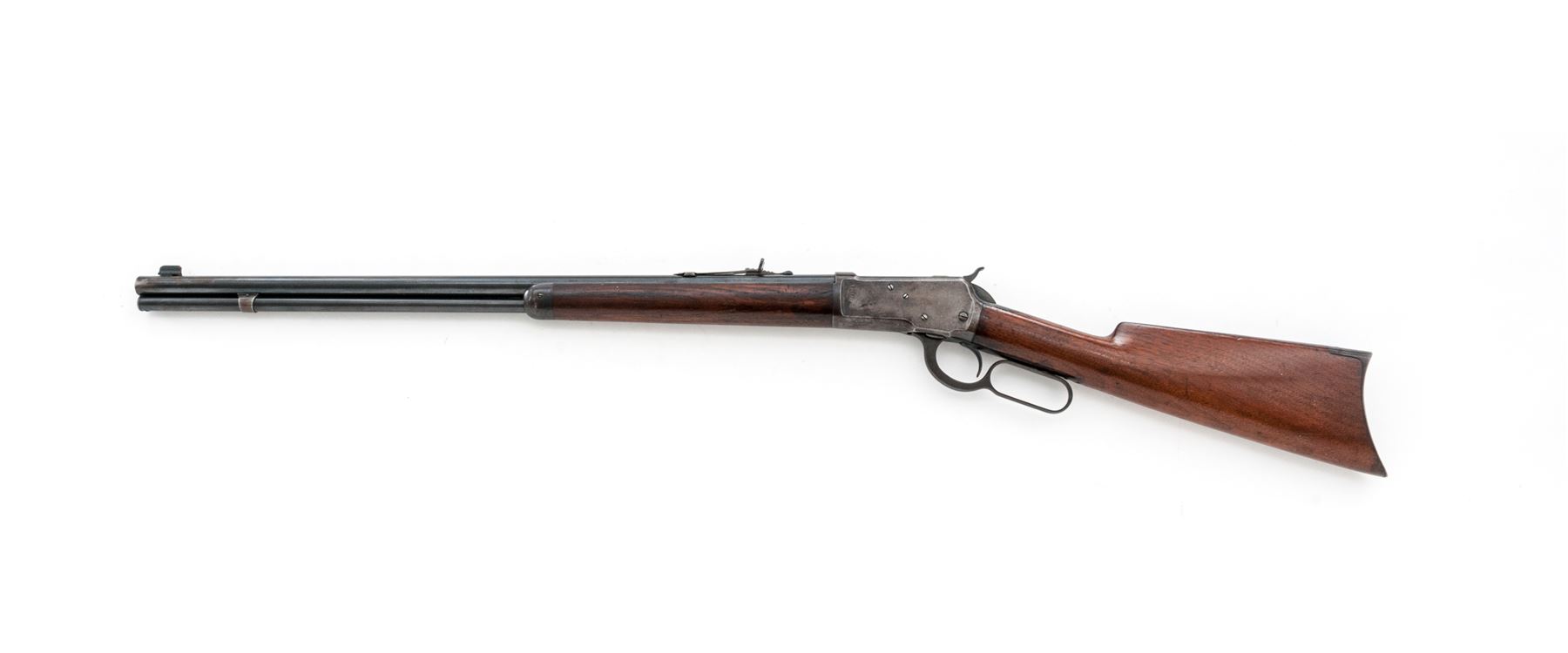 Winchester Model 1892 Lever Action Rifle, #225788, .25-20 WCF cal., blued 24'' barrel, with dovetailed long-blade front and adjustable buckhorn rear sights, marked with maker's name, address and 1884 patent date on top, and ''25-20 W.C.F.'' at breech; blued receiver is marked ''Model 1892'', ''Winchester'' and trademark on upper tang, and ''225788'' at lower front; oil-finished walnut forend with steel nosecap, and matching buttstock with crescent buttplate. Mfg'd 1903. Condition is very good. Barrel retains approx. 85% blue (missing areas at muzzle and front sight), magazine tube with 70% thinning blue, receiver is a bluish-brown tone (with an area of erosion and 50% blue on right side). Stocks are sound with normal use/handling marks and a later coat of varnish. Front sight is a replacement; front top tang screw is missing. Action is smooth; bore shines with crisp rifling. Est.: $600-$900. (C&R)