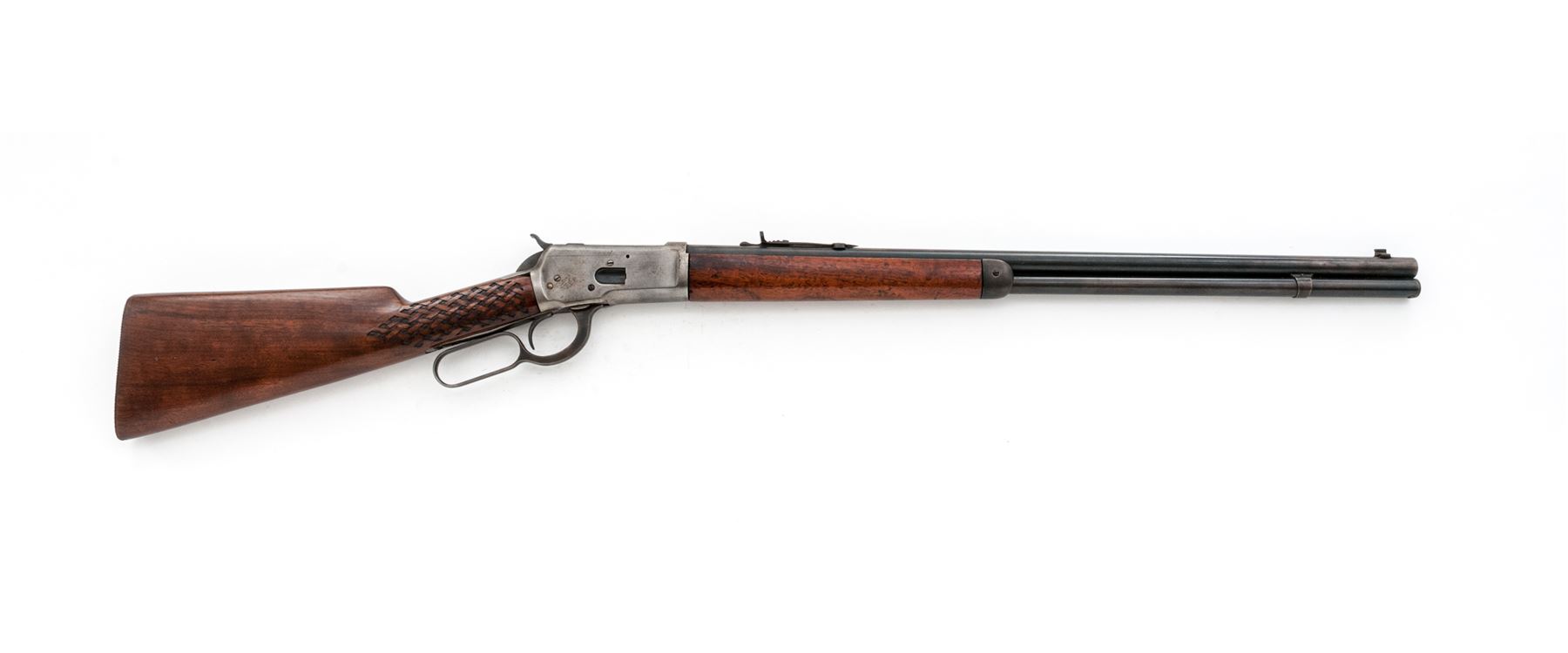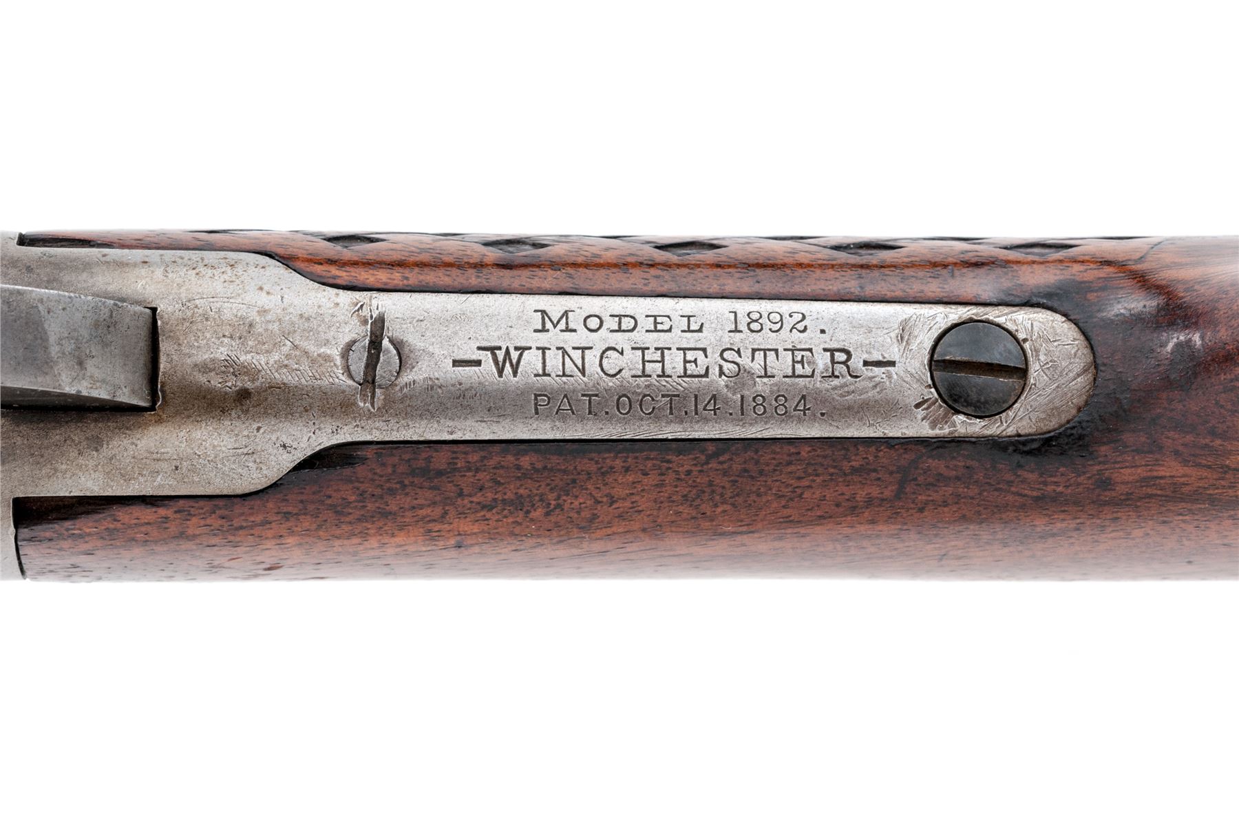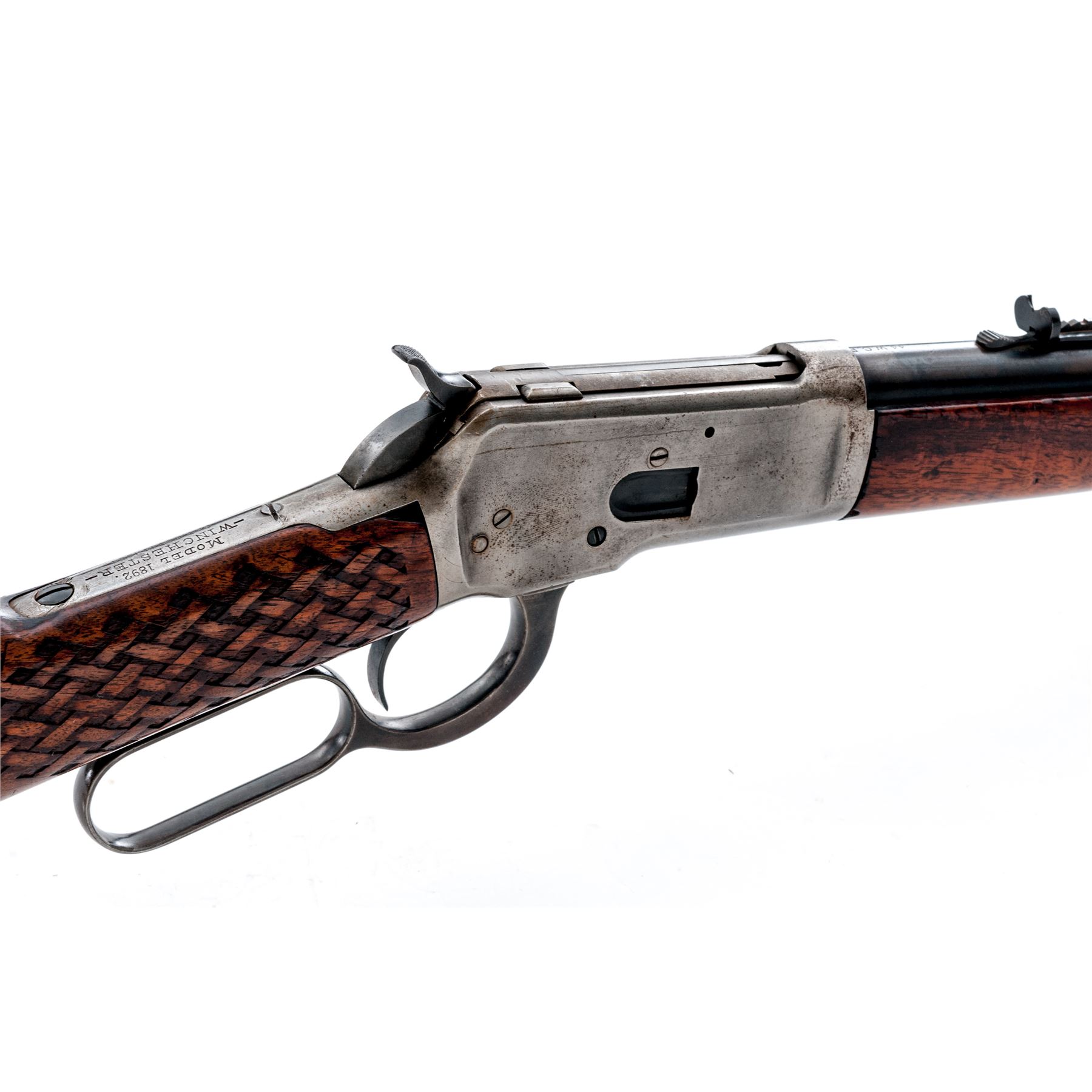 Antique Winchester Model 1892 Lever Action Rifle, #123296, .44 WCF (.44-40) cal., blued 24'' round barrel, with dovetailed bead-blade front and adjustable buckhorn rear sights, marked with maker's name and address on top, and ''44 W.C.F.'' at breech; blued tubular magazine; blued receiver is marked ''Model 1892/Winchester/Pat. Oct. 14, 1884'' on upper tang, and serial number at lower front; case hardened loop operating lever and hammer; oil-stained walnut stocks, forend with steel nose cap, buttstock with checkered straight buttplate. Mfg'd 1896. Condition is very good. Barrel, mag tube and nose cap show traces of original blue mixing with a dark-blue tone that was likely added later; receiver is a cleaned gunmetal gray; buttplate is an overall blue-black tone. Stocks are solid and smooth with basketweave checkering at right wrist, 3/8'' chips out at both sides at frame juncture, and a later coat of varnish. Action is smooth; bore is clean with overall etching and defined rifling. This '92 is quite desirable with its largest-available .44-40 caliber. Est.: $700-$1,000. (Antique)