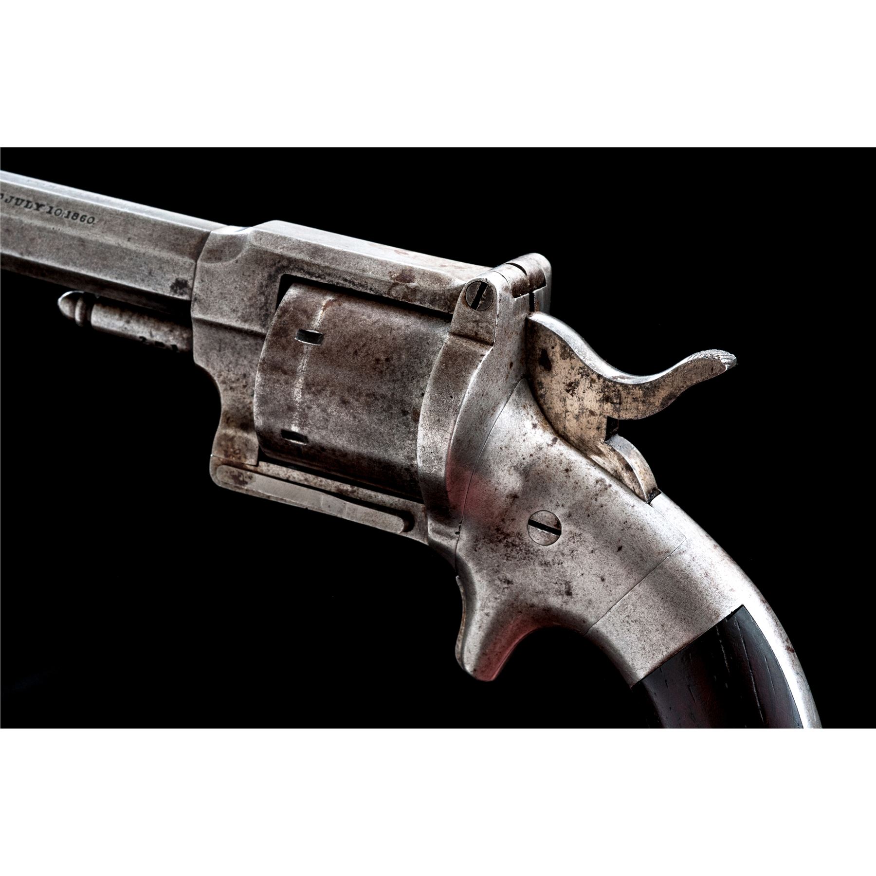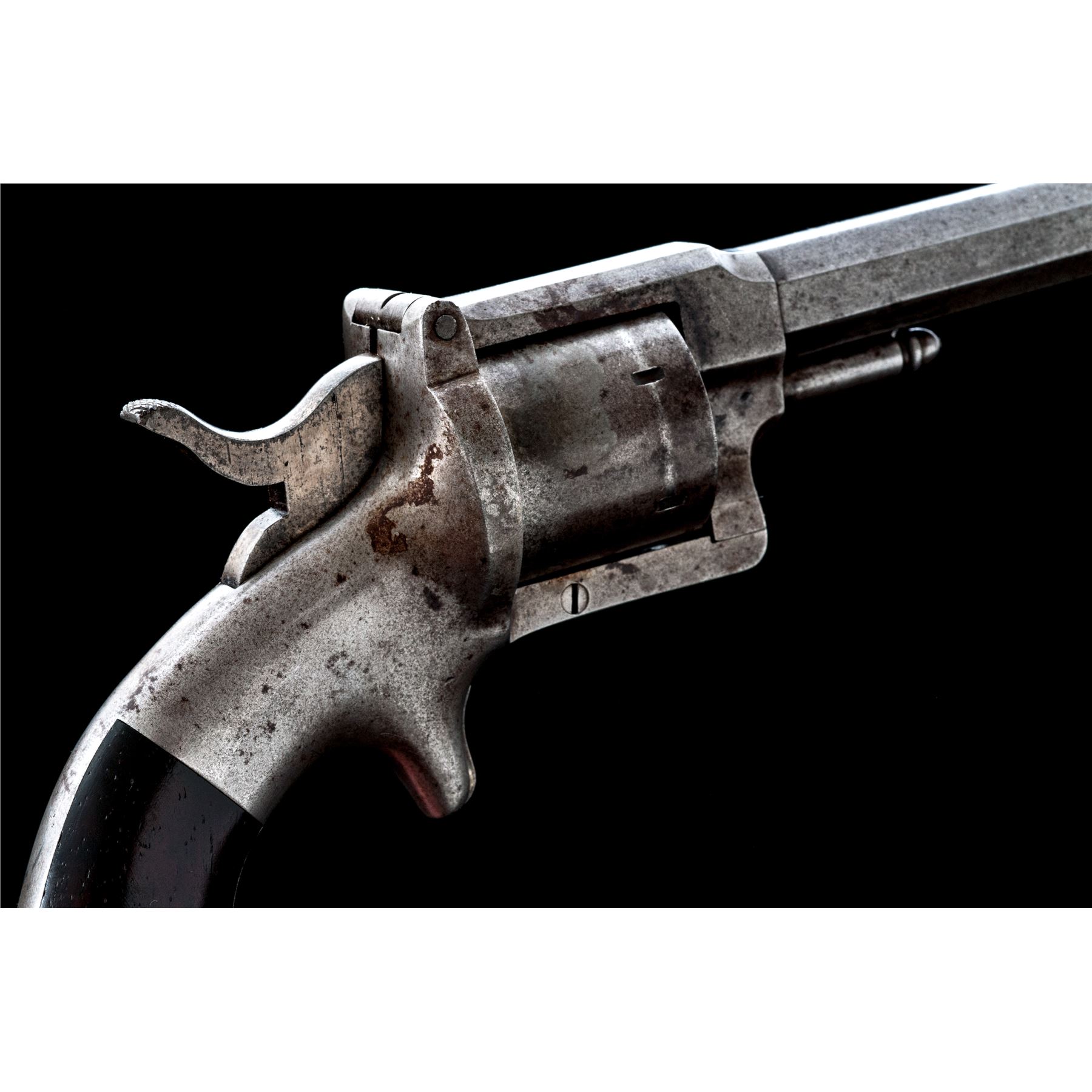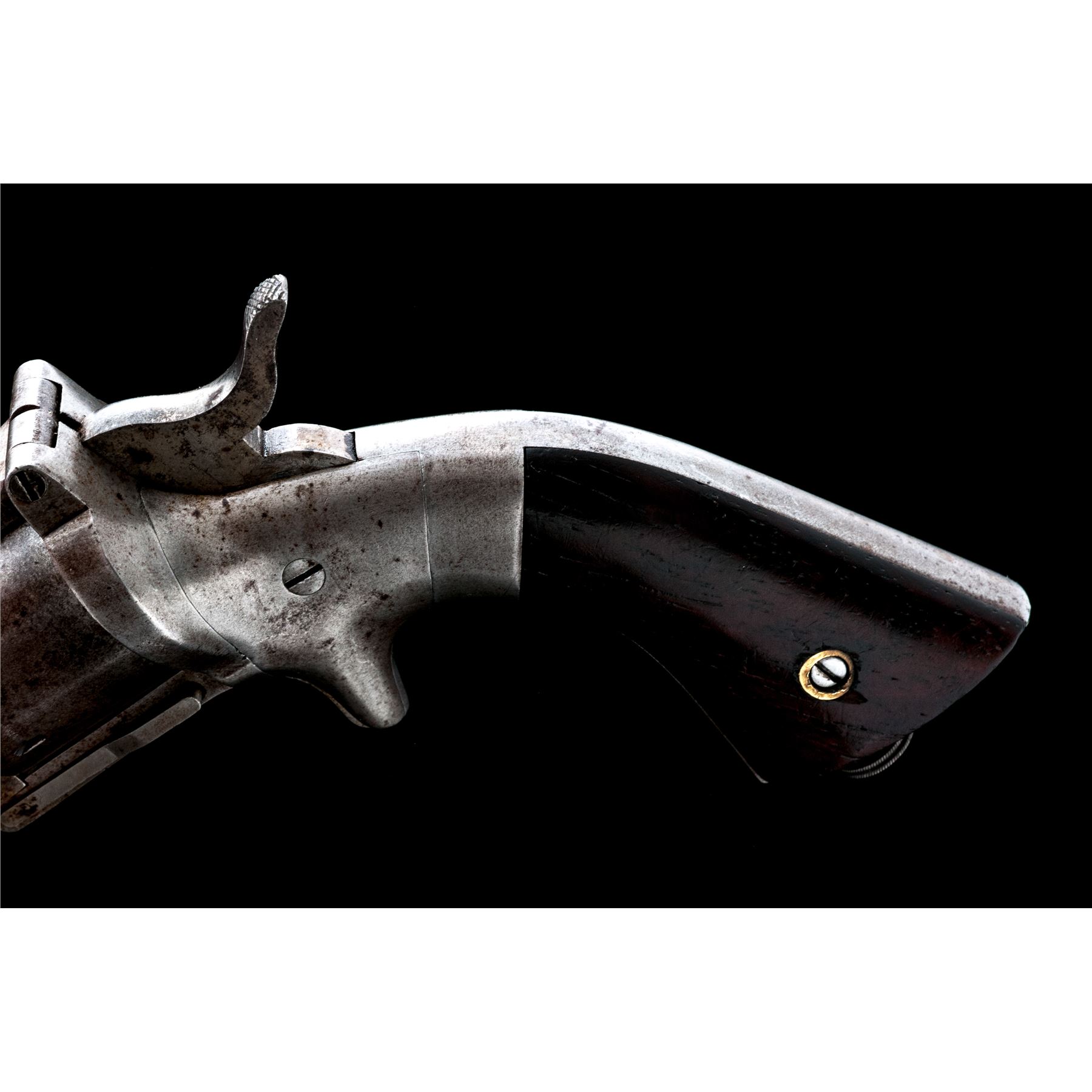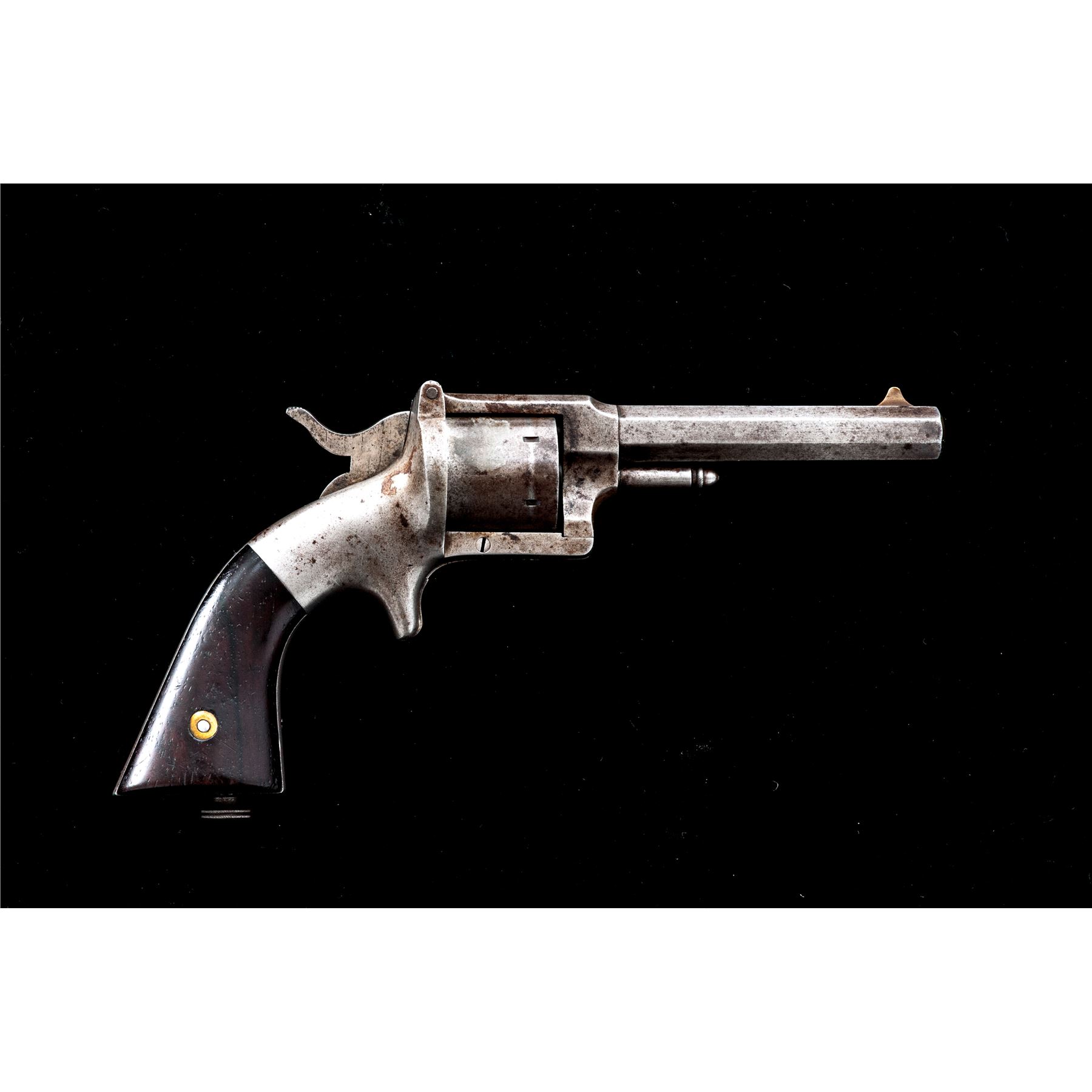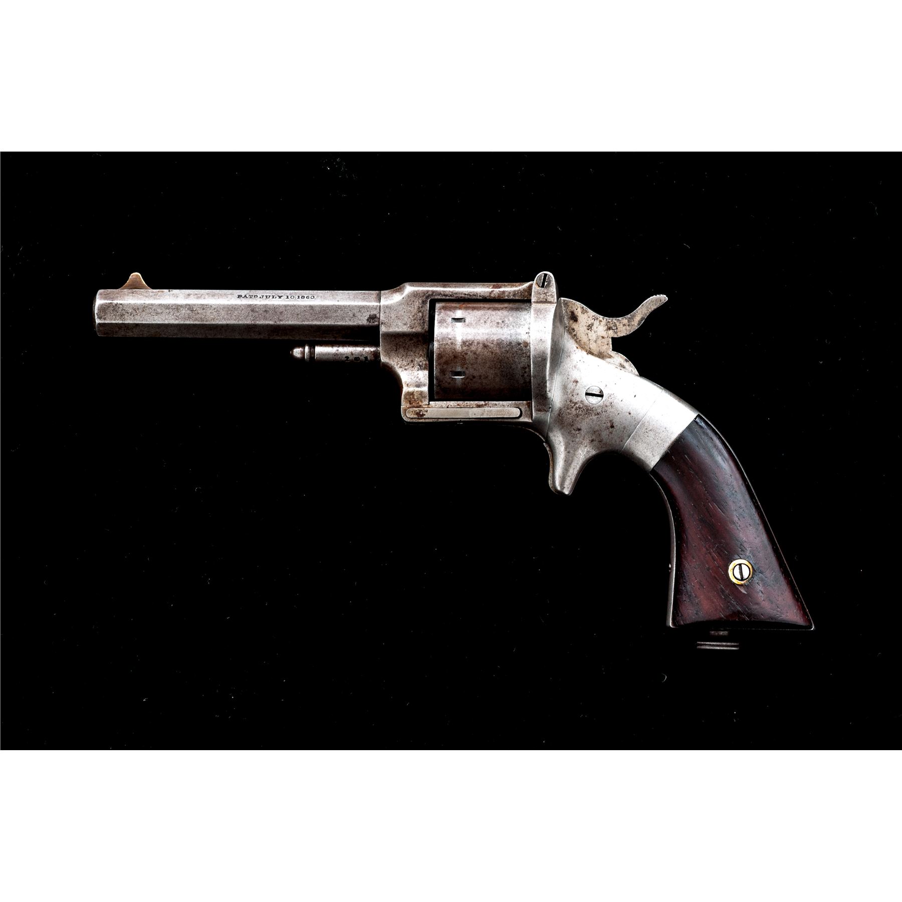 Lucius W. Pond Tip-Up Spurtrigger Cartridge Revolver, #201, .32 RF cal., 3-7/8'' octagonal barrel, with tall brass blade front sight marked ''L.W. Pond Worcester, Mass.'' on top flat, and ''Patd. July 10, 1860.'' on left angled flat; 6-shot round cylinder; rounded iron frame with integral gripstraps features a left-side push-bar that releases the barrel for loading/spent cartridge removal; square butt has a unique knurled-head screwdriver that threads into the butt; two-piece varnished rosewood grips. Mfg'd ca. 1861-70 in a very small quantity due to its infringement on Smith & Wesson's bored-thru cylinder design patent. Condition is very good. Metal surfaces are a smooth unblemished gunmetal gray color, grips are smooth and solid with some original varnish finish, barrel hinge and release are secure, screwdriver is present in butt, and all visible serial numbers match. Action is smooth; bore is clean with scattered black powder etching and defined rifling. This Pond revolver, with its spring-actuated barrel release bar, is considered a scarce variant. Est.: $300-$500. (Antique)