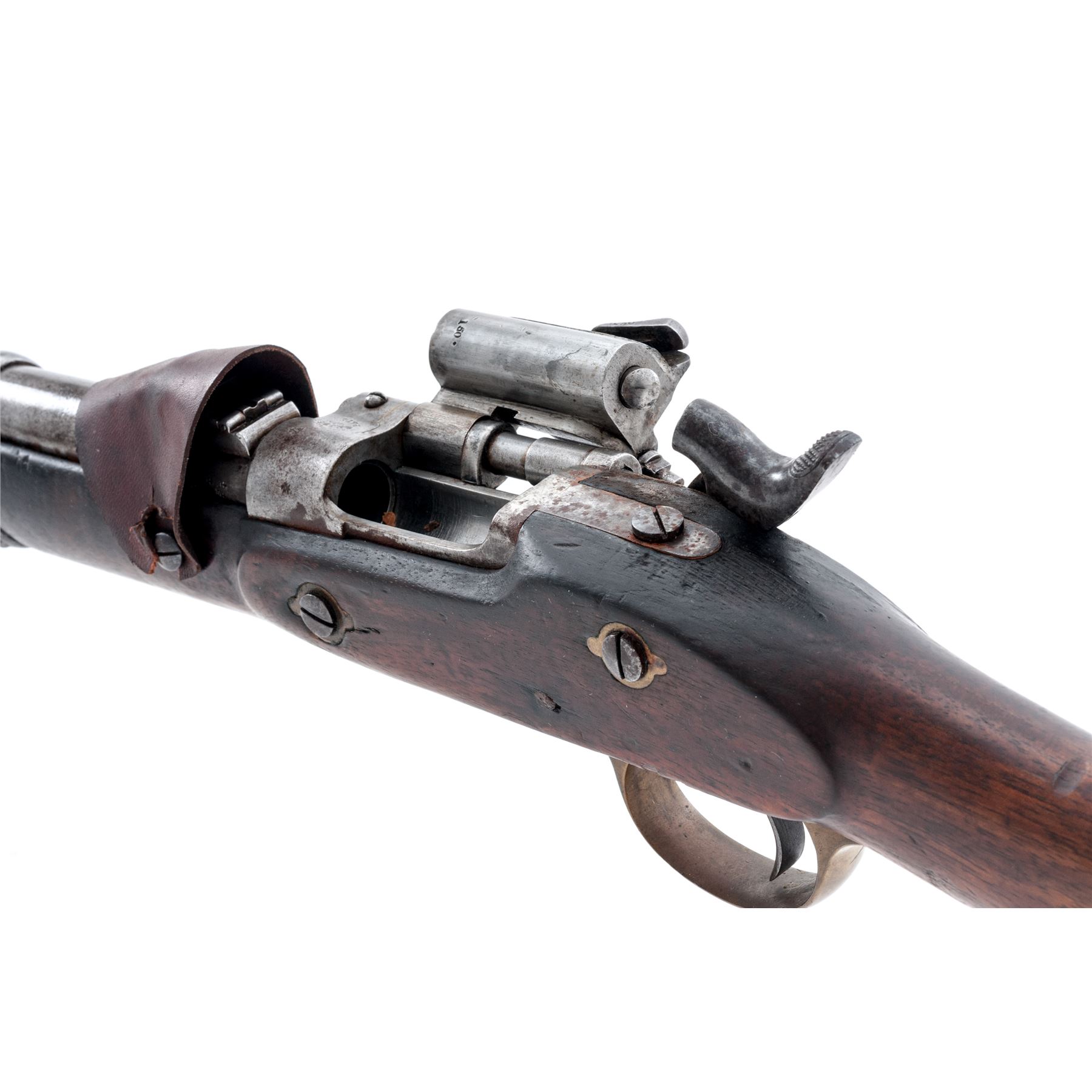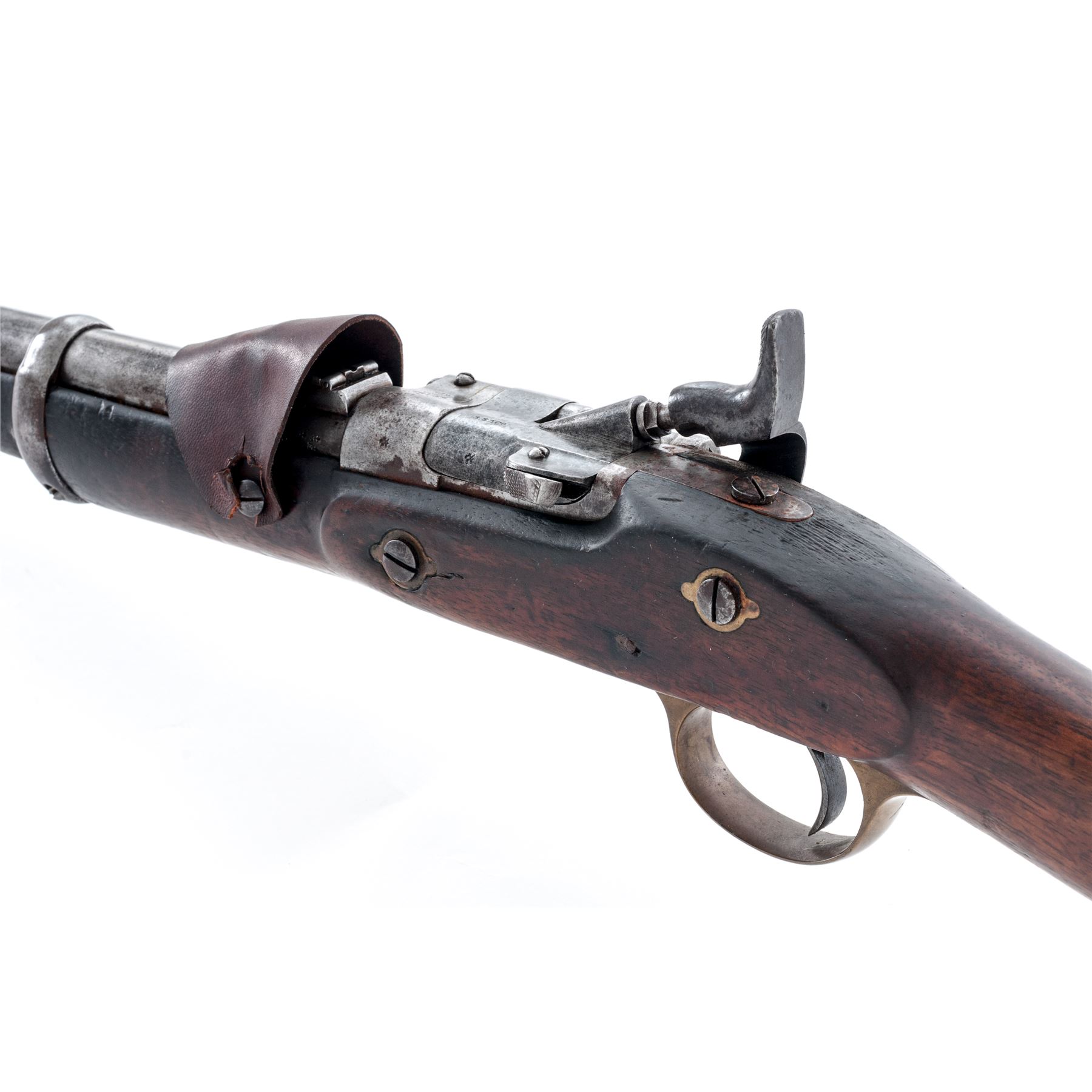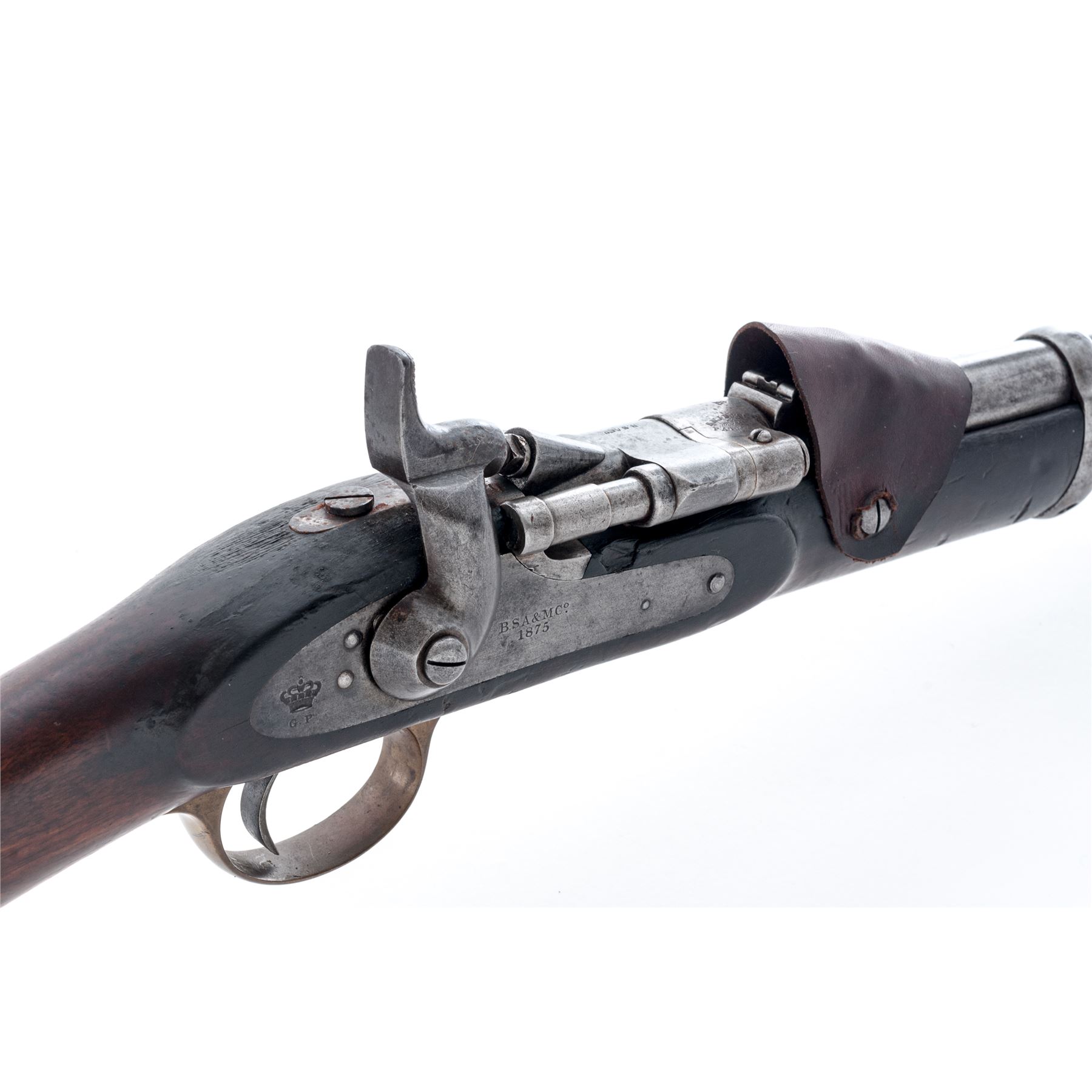 Antique British P-1853 Percussion Cavalry Carbine, altered to Breechloading Cartridge Carbine utilizing the Snider Patent, NVSN, .577 Boxer CF cal., 19.25'' round barrel with block-blade front and adjustable leaf rear sights marked with numerous proofmarks and ''25'' at left breech, ''C98'' at right; steel receiver is marked ''Snider/Patent'' at top of breech, the right-hinged steel breechblock is marked ''B.S.A. Co.'' (British Small Arms Co.) outside and ''150.'' inside; flat lockplate is marked ''B.S.A. & MC Co./1875'' ahead of the hammer and with a large crown over ''G.P'' behind; brass triggerguard (marked ''PA'' in tiny letters on front tang) with steel rear extension mounted with a sling ring; brass buttplate (marked ''PA'' in tiny letters on top tang) with hinged door opening to trap in butt containing two-piece steel cleaning rod (present); single iron barrel band; two sideplate screws with brass ''eared'' escutcheons. Condition is very good, the steel parts having an overall smooth gunmetal gray patina with scattered discoloration and light surface rust on side of receiver and rear tang (will easily clean off); the brass with a soft age patina. Nicely-grained English walnut stock is solid and smooth with a few minor handling marks and what appears to be a half-inch cross carved into the right side. A russet leather flap retained by two screws has been added to cover the rear sight, perhaps to prevent its catching on a saddle scabbard. Action is smooth and tight; bore is bright with sharp rifling. This simple yet brilliant hinged breechblock conversion, invented by American Jacob Snider, was widely used until the advent of the Martini-Henry action in the mid-1870s. Est.: $700-$1,000. (Antique)