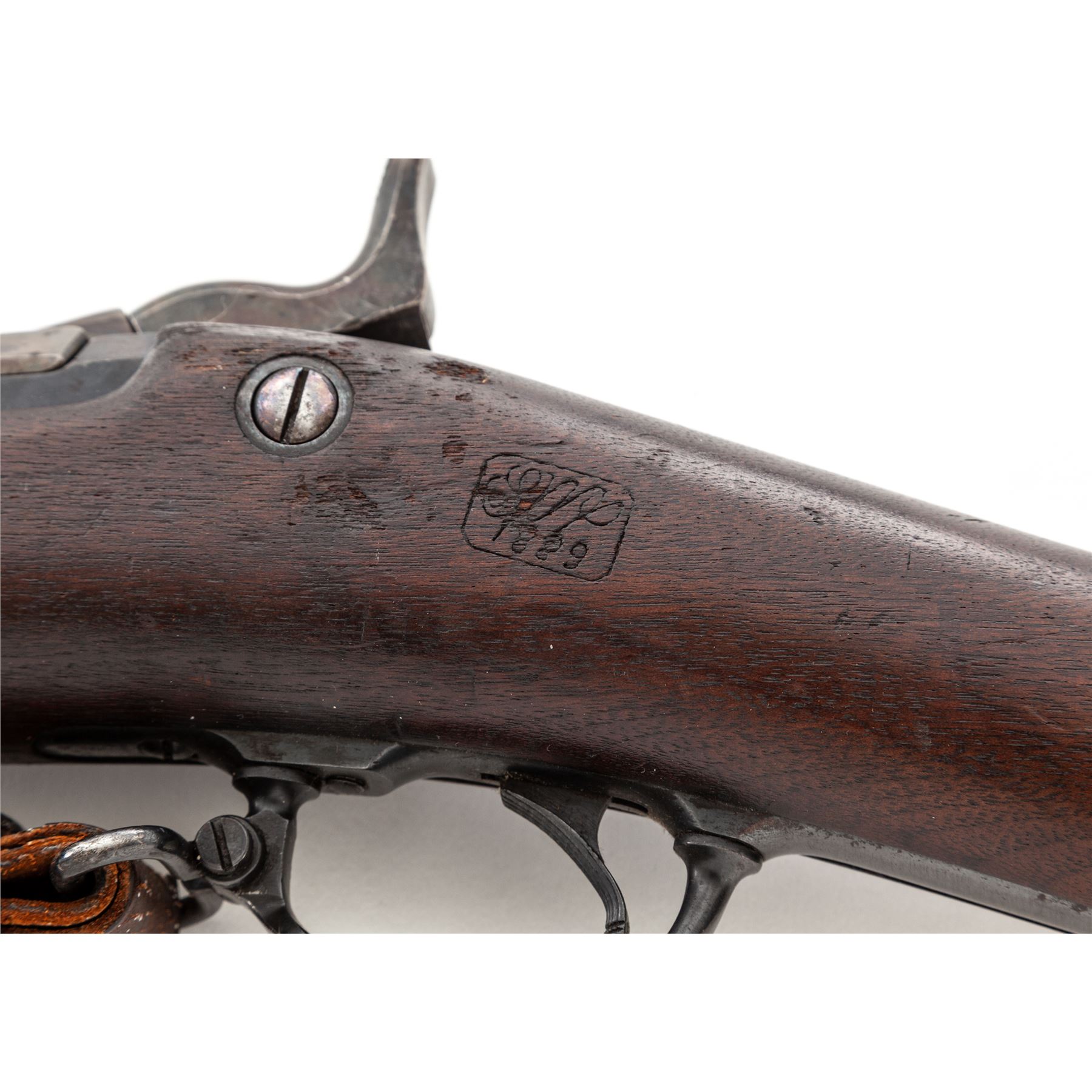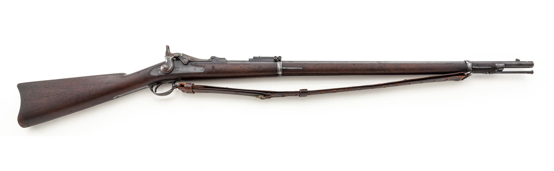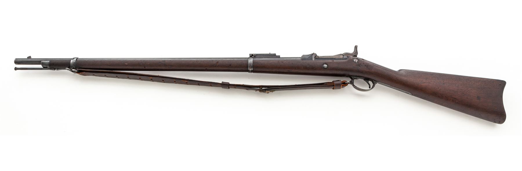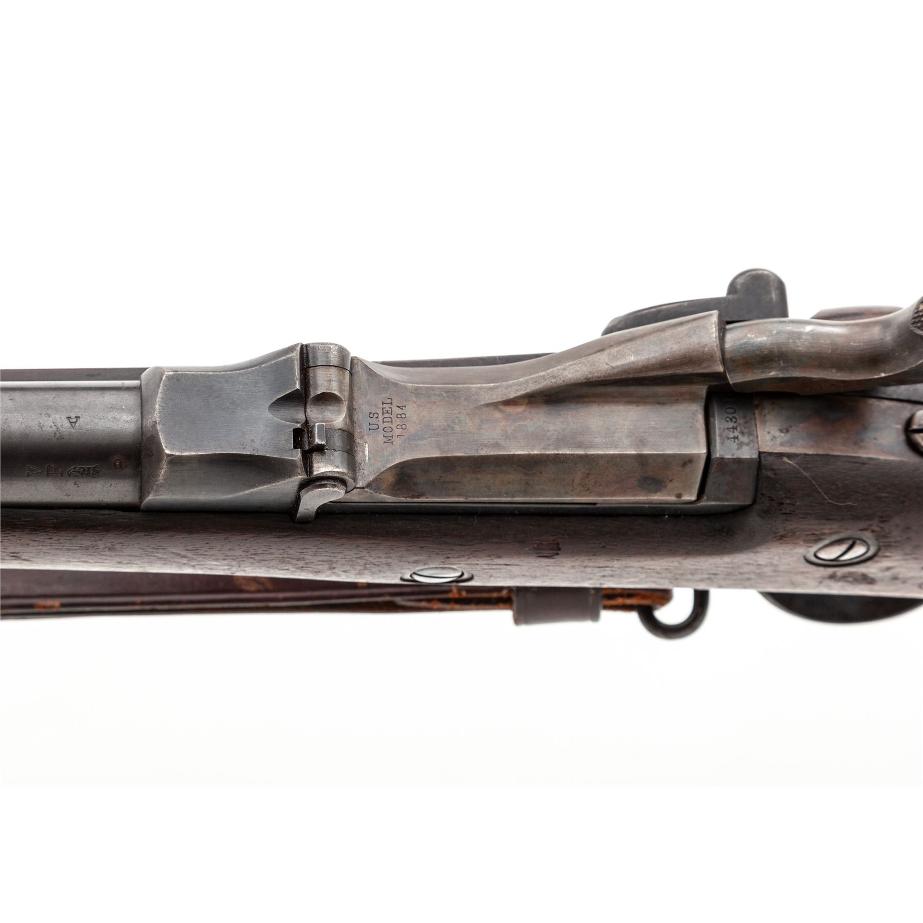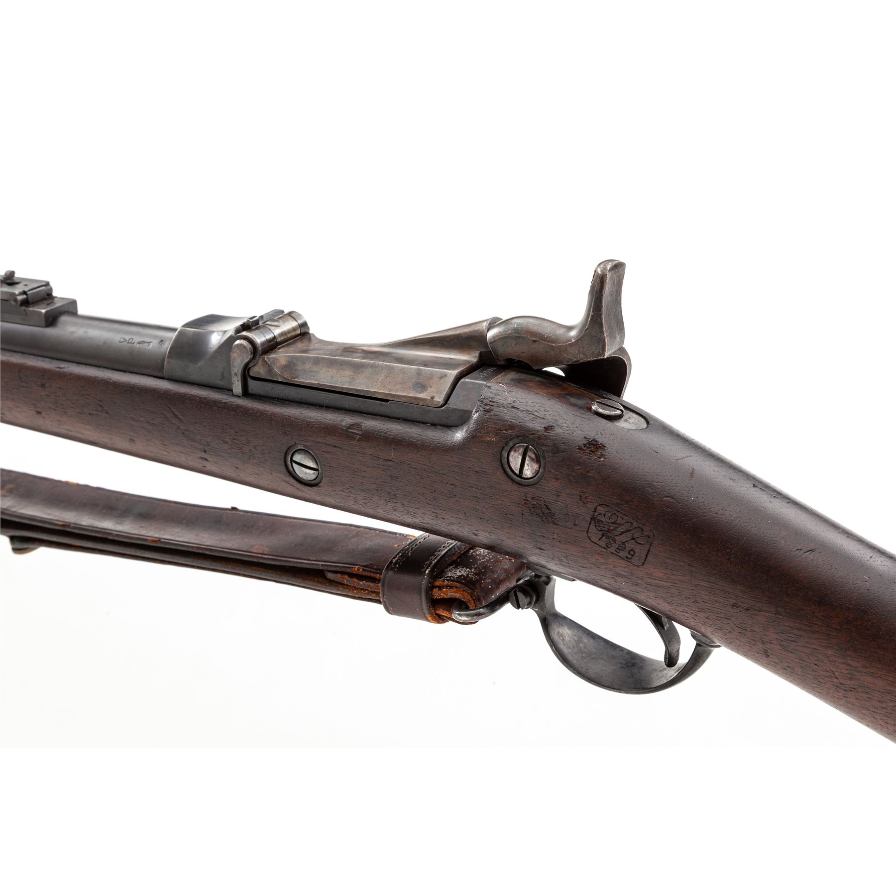 Indian Wars Springfield Model 1884 Trapdoor Rifle, with leather sling, #443016, .45-70 Gov't cal., 32-5/8'' barrel marked ''V/P/(eaglehead)/P'' and ''A'' at breech and fitted with a block-blade front sight (serves as a bayonet lug) and Buffington adjustable rear sight (correctly marked ''R'', for Rifle); hinged breechblock (trapdoor) is marked ''U.S./Model/1884''; flat lockplate is marked ''(spread eagle)'' to left of ''U.S./Springfield'' beneath trapdoor latch; steel furniture including two spring-retained barrel bands (top with stacking swivel), two-piece triggerguard (with sling swivel at front), buttplate marked ''US'' on top tang, nosecap, and slotted button-head steel cleaning rod; one-piece oil-stained walnut fullstock. Mfg'd 1889. Condition is fine. Barrel, bands, lockplate and triggerguard retain most of their original military blue, buttplate with 50% blue and cleaned erosion, trapdoor and rear tang with mottled case hardening colors; all markings are clear. Stock is solid with scattered use and handling dings, nice color and a crisp ''SWP/1889'' cartouche of armory inspector Samuel W. Porter at left wrist and an encircled ''P'' on belly. Action is strong and smooth; bore is brilliant with distinct rifling. Leather sling shows light age cracking, good color and finish, and is marked ''Rock Island/Arsenal/E.H.S.''. Est.: $600-$900. (Antique)