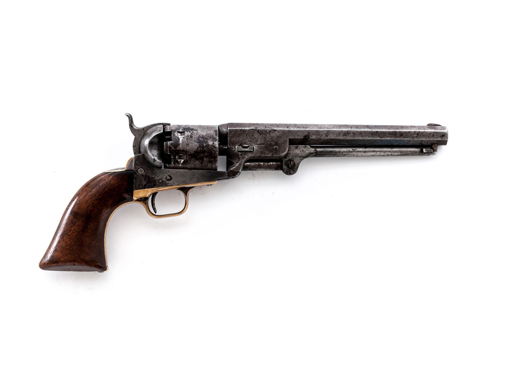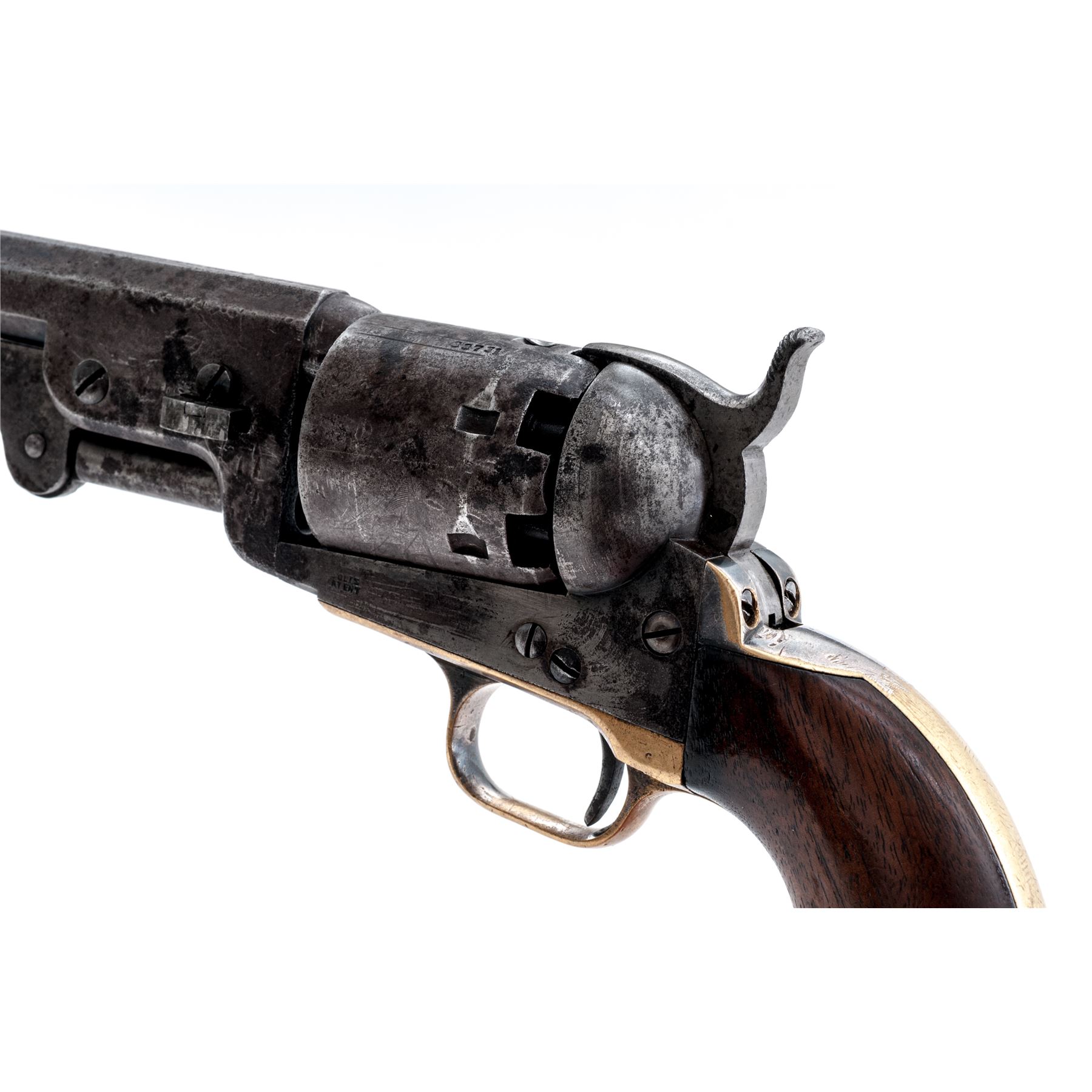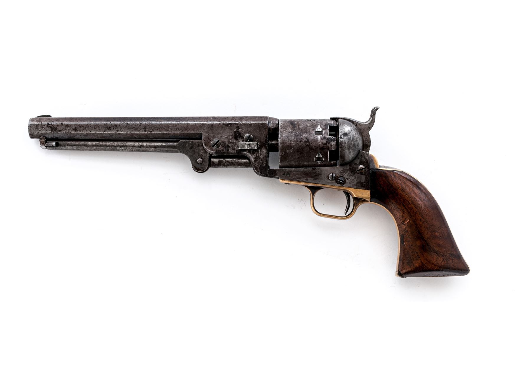 Civil War Colt Model 1851 Navy Percussion Revolver, #33731, .36 cal., 7.5'' octagonal barrel with low blade front sight marked ''Address Saml. Colt New-York City'' in one line on top flat, 6-shot round cylinder with rolled naval battle scene; frame is marked ''Colts/Patent'' in tiny letters on left side; brass gripstraps with small rounded triggerguard; one-piece varnished walnut grips. Mfg'd 1853. Condition is about very good having no original finish, but a generally gunmetal gray patina with scattered cleaned erosion, the cylinder scene approx. 50% visible with a clear serial number, the straps with a smooth patina and perhaps 10% original silver on backstrap apron and ahead of triggerguard. Grips are smooth with minor edgewear and chip at left toe, two replaced screws. All visible serial numbers match including wedge and lever. Action is smooth; bore is shiny with deep rifling. Est.: $700-$1,000. (Antique)