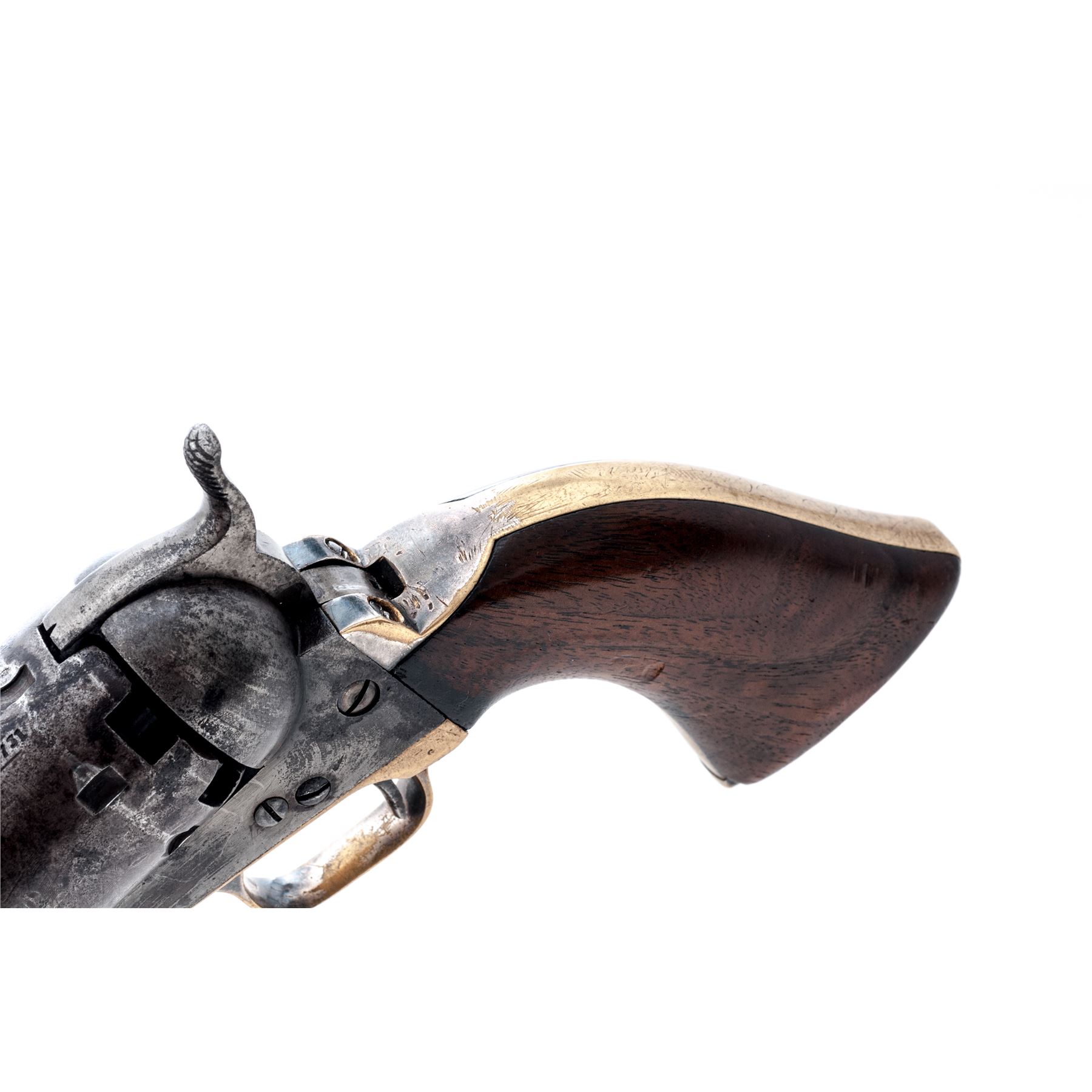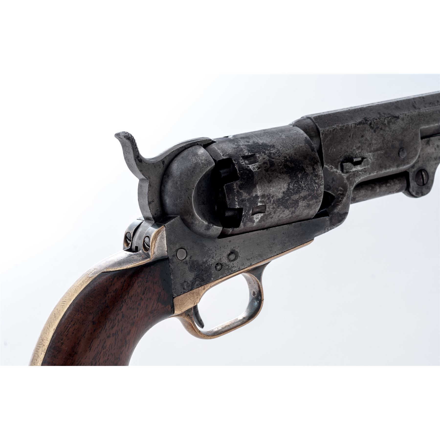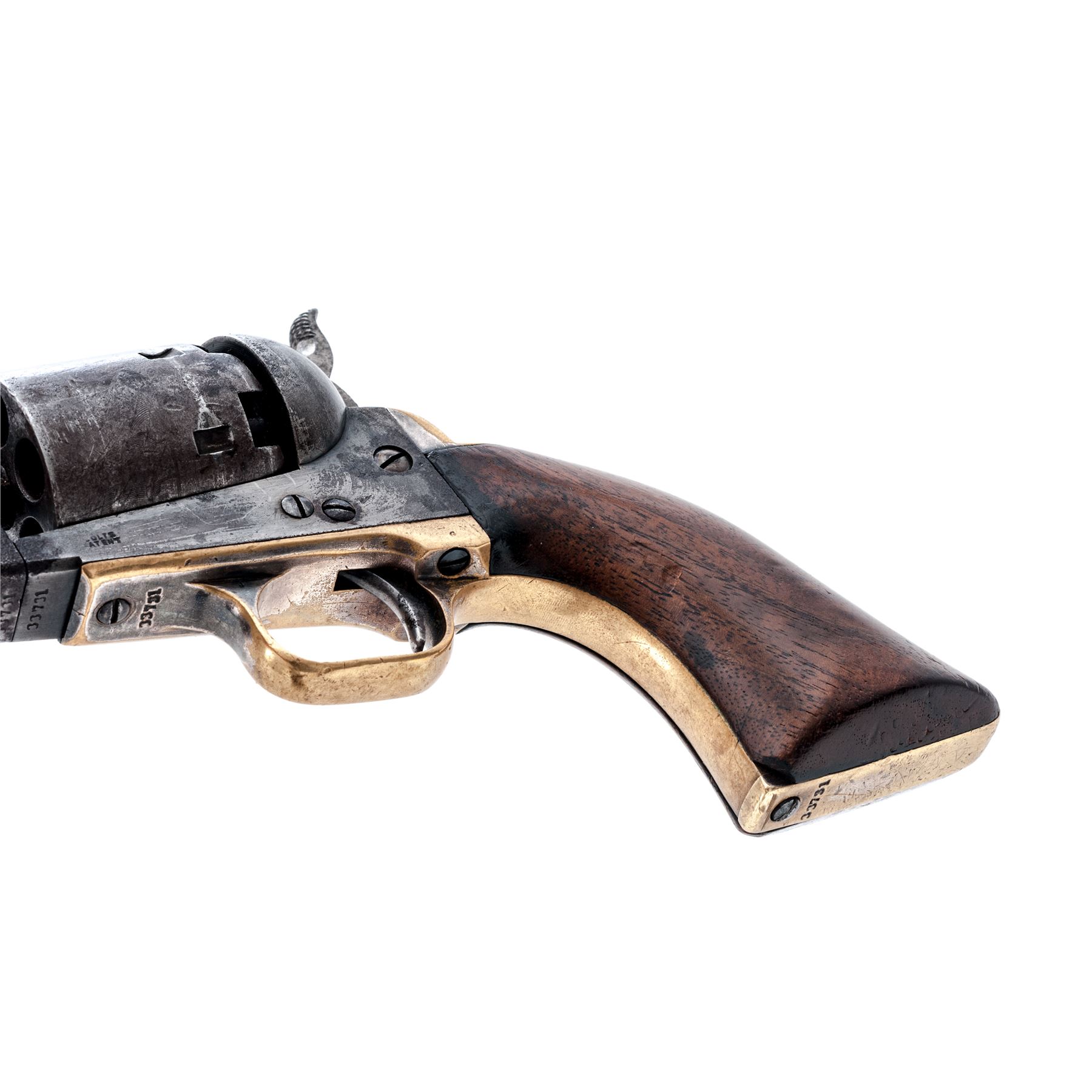 Civil War Colt Model 1851 Navy Percussion Revolver, #33731, .36 cal., 7.5'' octagonal barrel with low blade front sight marked ''Address Saml. Colt New-York City'' in one line on top flat, 6-shot round cylinder with rolled naval battle scene; frame is marked ''Colts/Patent'' in tiny letters on left side; brass gripstraps with small rounded triggerguard; one-piece varnished walnut grips. Mfg'd 1853. Condition is about very good having no original finish, but a generally gunmetal gray patina with scattered cleaned erosion, the cylinder scene approx. 50% visible with a clear serial number, the straps with a smooth patina and perhaps 10% original silver on backstrap apron and ahead of triggerguard. Grips are smooth with minor edgewear and chip at left toe, two replaced screws. All visible serial numbers match including wedge and lever. Action is smooth; bore is shiny with deep rifling. Est.: $700-$1,000. (Antique)