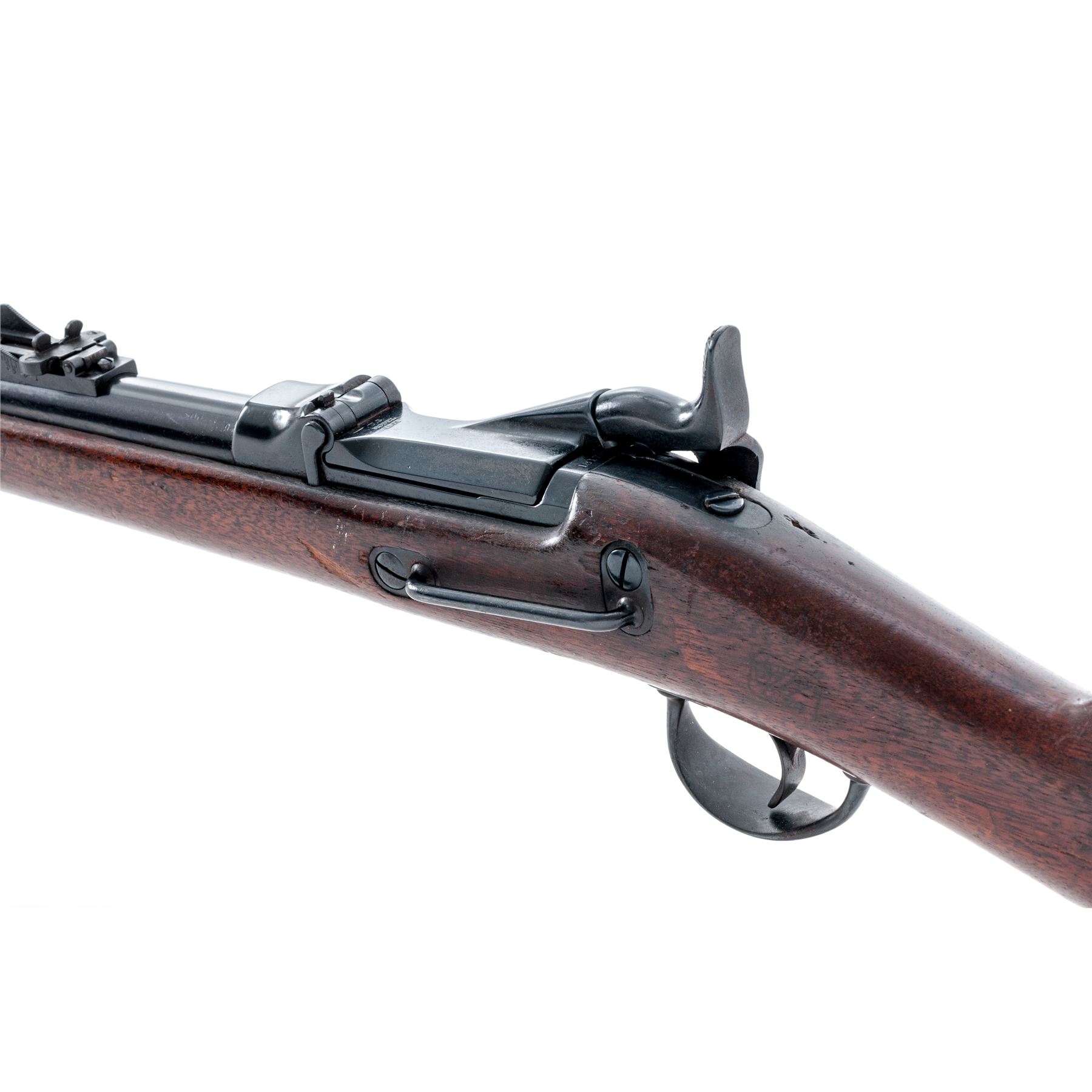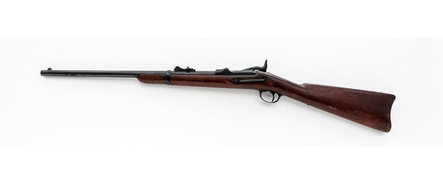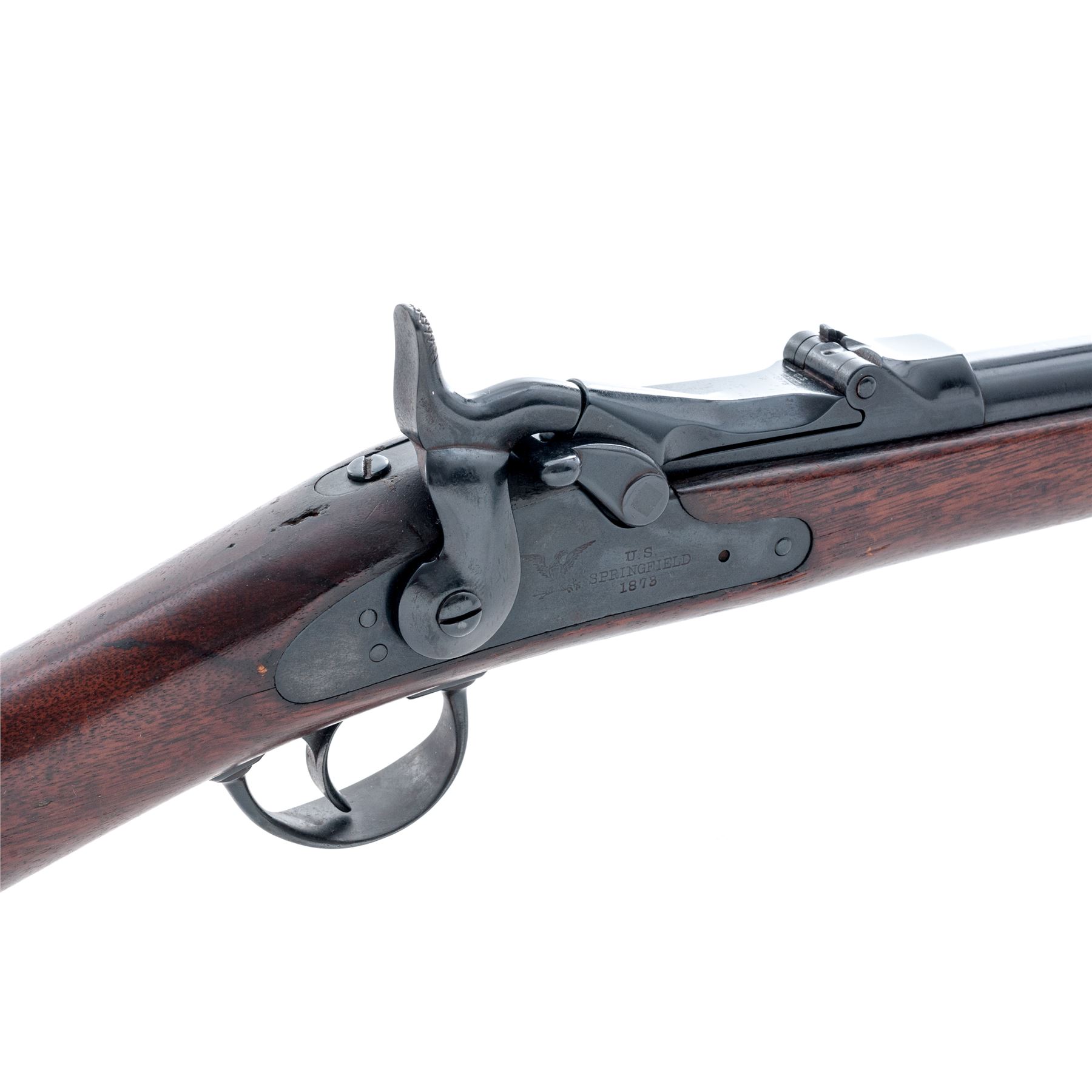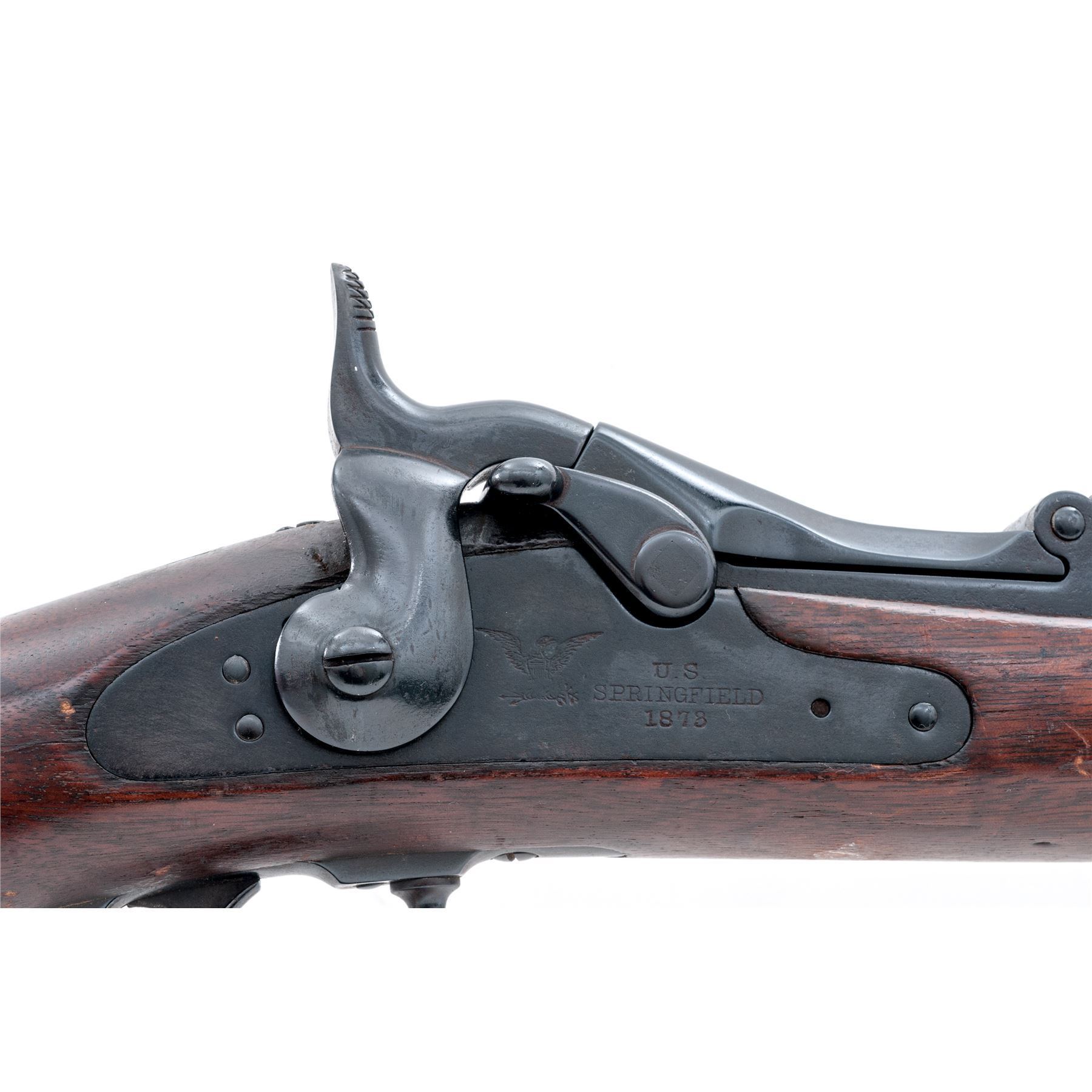 Indian Wars Era U.S. Springfield Model 1873-1877 Saddle Ring Carbine, #181751, .45-70 Gov't CF cal., 22'' barrel with integral block-blade front sight and sliding-leaf rear sight (correctly marked ''C'' for Carbine), is marked ''V/P/(eagle head)/P'' at left breech; trapdoor breechblock is marked ''U.S./Model/1873'' at hinge; flat lockplate has a spread-wing eagle clutching olive branches to the left of ''U.S./Springfield/1873'' under trapdoor latch; steel furniture including a single spring-retained barrel band and two-piece triggerguard (both without sling swivels), and curved buttplate with sliding door opening to trap in butt for three-piece cleaning rod (rod is present) marked ''U.S./S.C.'' at top screw; oil-stained walnut halfstock. Mfg'd ca. 1877-78. While this Model 1873 carbine retains some early features, such as the ''1873'' lockplate date, sling bar and ring opposite the lock, and the pin-fastened front sight blade, it also features 1877 updates, such as the stock with a longer comb and trap in butt for a jointed cleaning rod, the ''low arch'' breechblock, and stepped receiver-barrel juncture. Condition is good. All metal surfaces are refinished in a deep blue-black finish. Stock is sound, showing light marks of military use and a partial ''SWP'' cartouche of Master Armorer Samuel W. Porter on left side, as well as an encircled ''P'' proofmark below. Action is strong; bore is clean with defined rifling. Est.: $500-$900. (Antique)