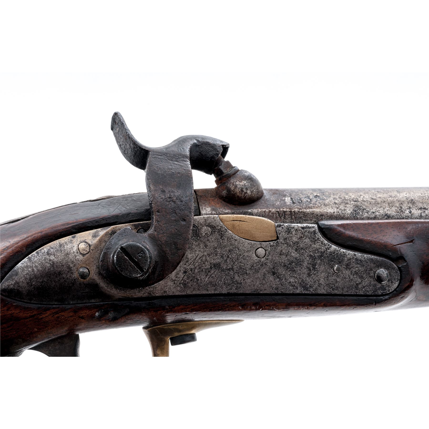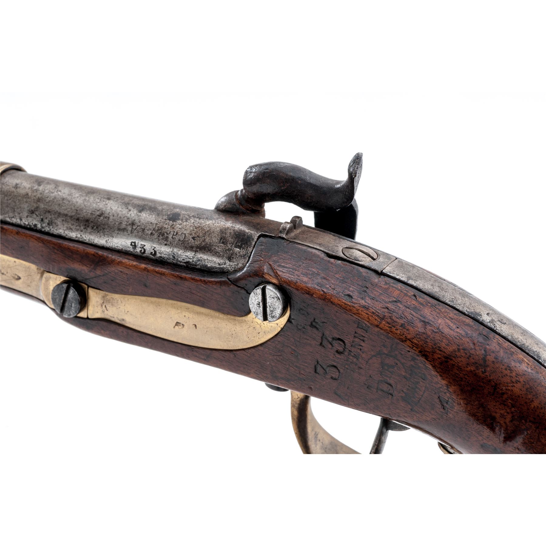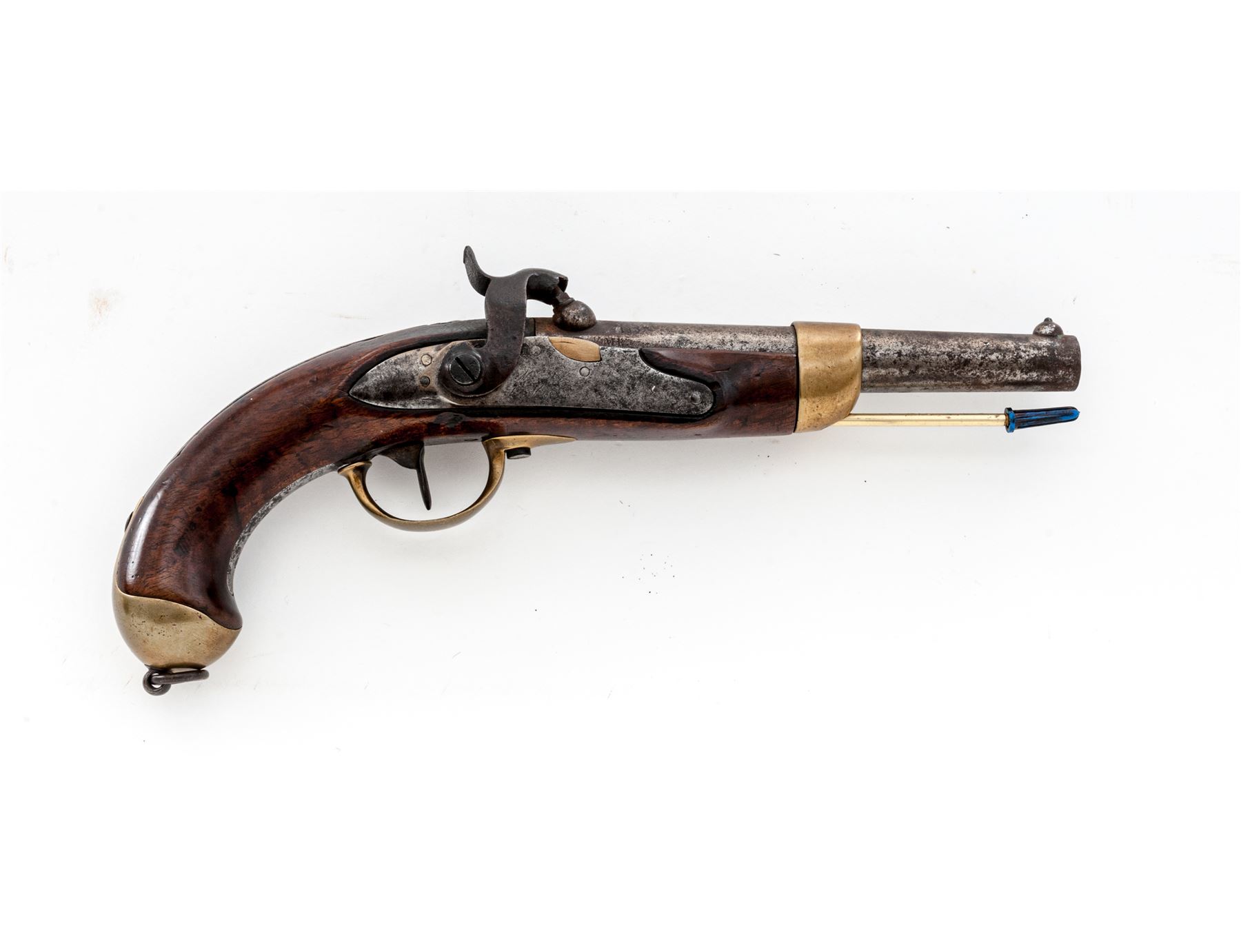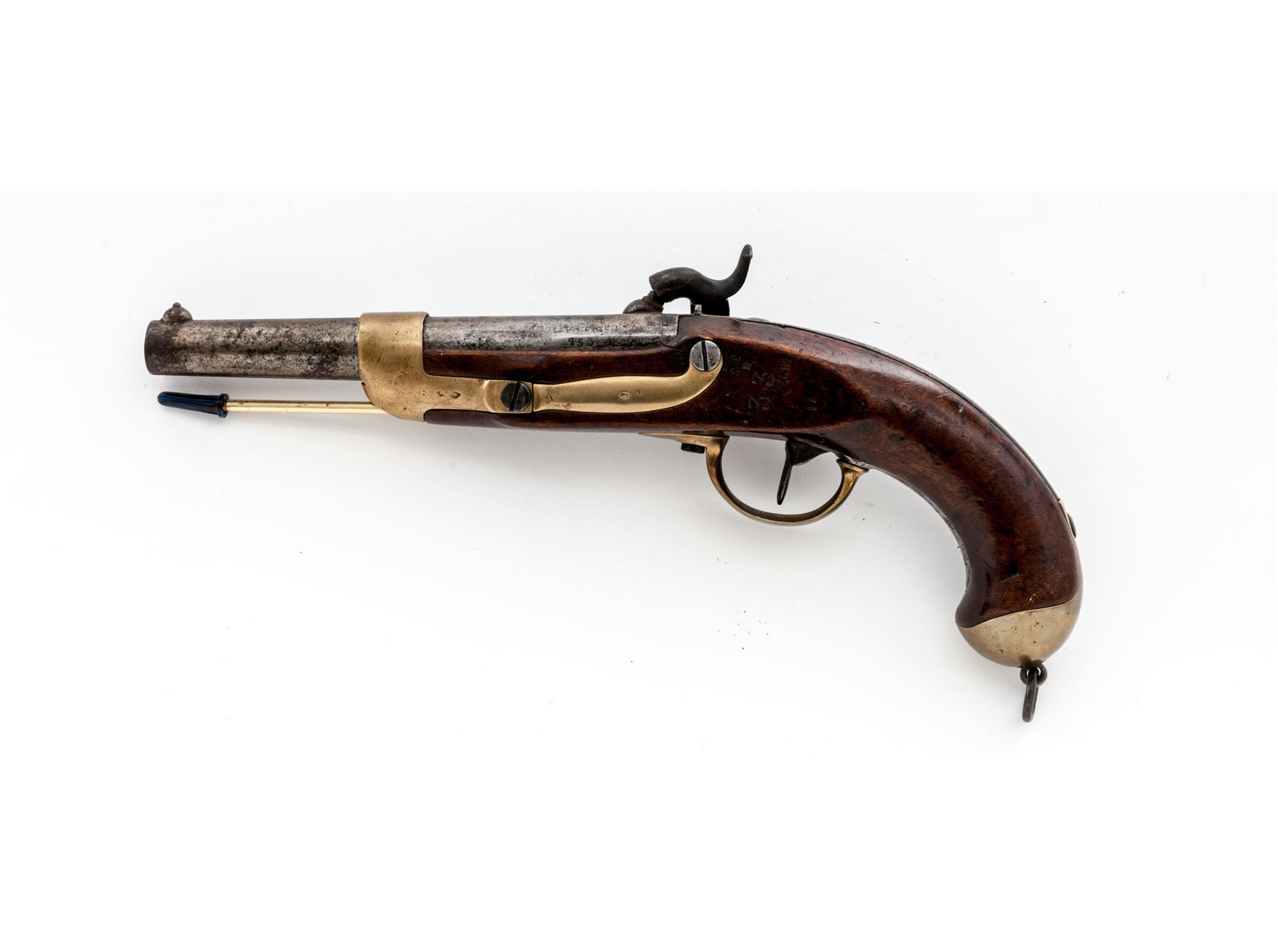 Antique French Model 1822 Military Percussion Pistol, by Mutzig Arsenal, altered from Flintlock at St. Etienne Arsenal, #33, approx. .70 cal., 8'' barrel, with raised-post front and notched rear sights, stamped with numerous proof and other marks including ''Mdle 1822 bis'' on top tang; beveled lockplate with long pointed rear tang is marked ''Mre. Impale de Mutzig'' below brass frizzen filler; hammer is uniquely curved to align with nipple; brass mountings include single wide barrel band with long tang adjoining the serpentine sideplate, triggerguard (with iron tang), and buttcap (with iron lanyard ring and iron backstrap extending to top tang). Varnished halfstock of European hardwood also bears numerous markings including ''33,'' ''St. Etienne,'' and a circular cartouche over ''Mutzig'' on raised apron opposite lock. Condition is very good: the iron parts being gunmetal gray with scattered erosion (especially at nipple area and muzzle), the brass a soft patina. Stock is sound having light age/use marks. Original cupped iron ramrod (also serves as a powder measure) is replaced by a plain brass rod. Metal and wood markings are mostly sharp and clear, action is very strong; smoothbore is clean. Est.: $400-$600. (Antique)