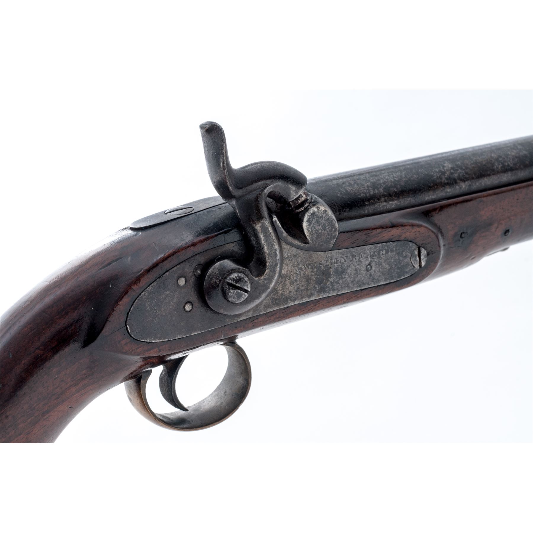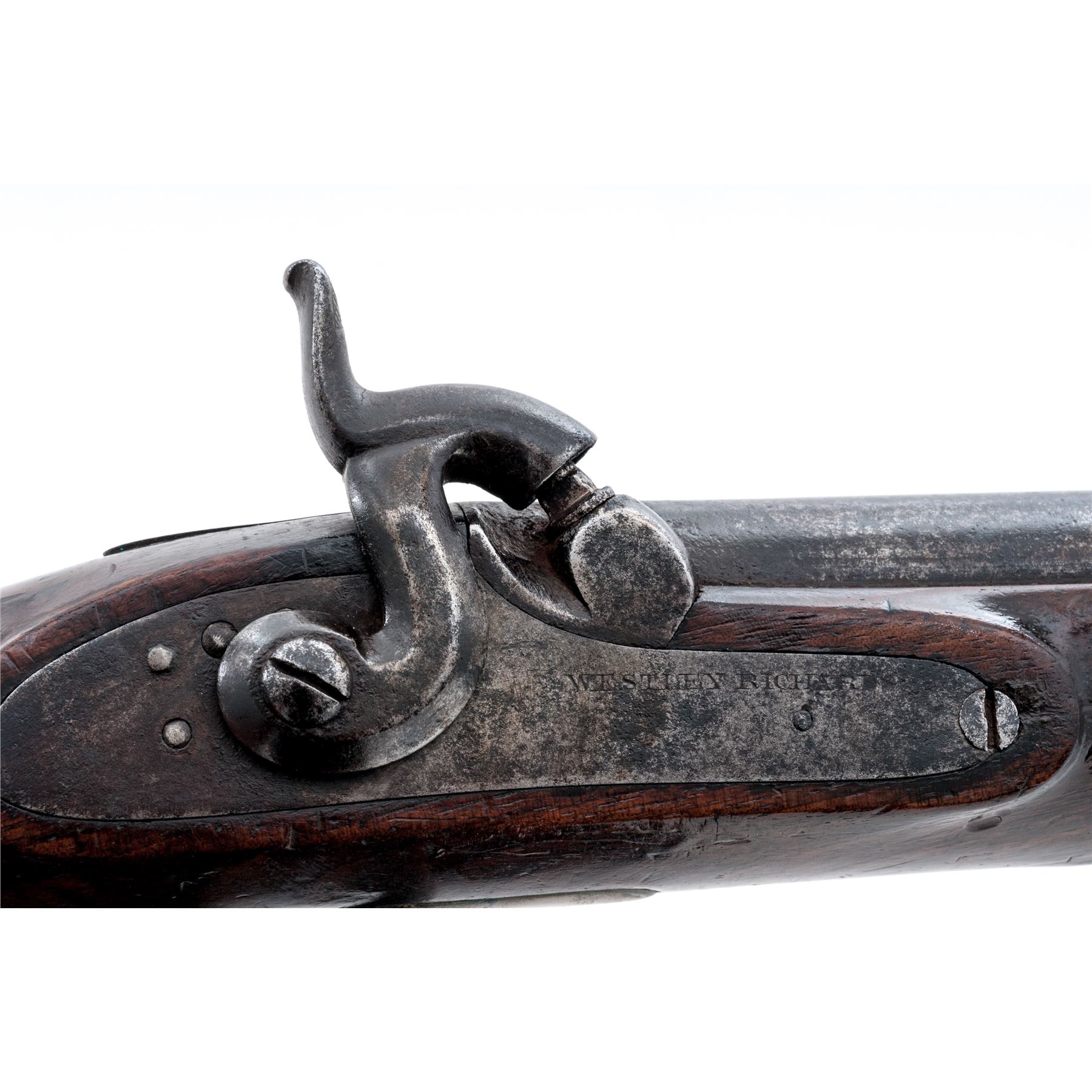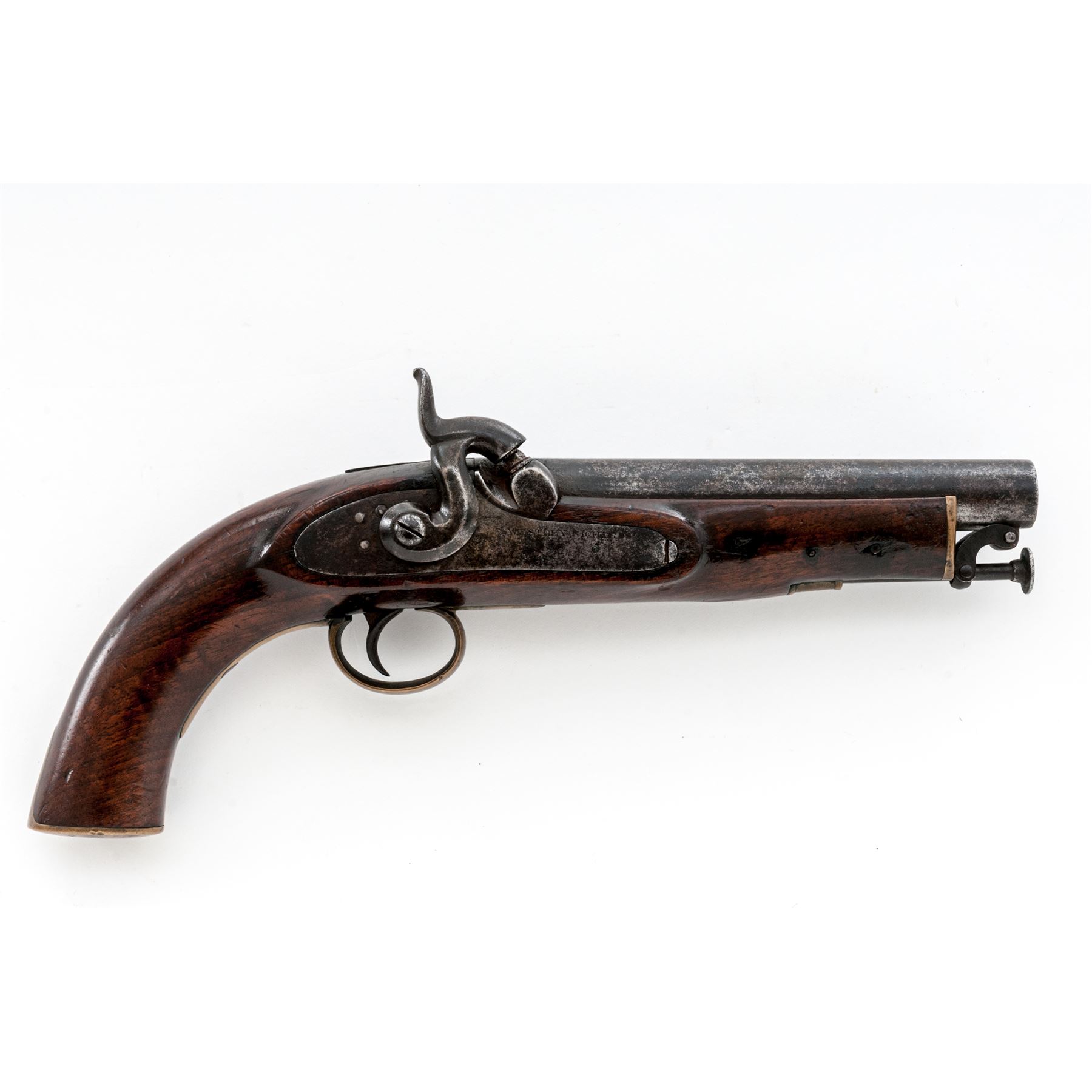 Antique British Percussion Naval-Style Belt or Boarding Pistol, by Westley Richards, NVSN, approx. 64 cal., 7'' barrel without sights marked ''18'' between two deeply-struck proofmarks at left breech; flat lockplate is marked ''Westley Richards'' below nipple bolster; 4.5'' belt hook is fitted to left side raised apron opposite the lock; brass fittings include a flat ''nosecap,'' one-piece triggerguard, single ferrule retaining the iron hinged ''captive'' button-tip ramrod, and flat oval buttcap; varnished walnut fullstock. Condition is very good. Iron parts show a dark gunmetal-gray with scattered erosion on the barrel, and clear markings; the brass an aged patina. Stock is sound and smooth with scattered age/use marks (mostly around forend area), and nice grain and color. Action is strong and sure; smoothbore is shiny with only minor erosion. Founded in Birmingham, England in 1812, Westley Richards became a premier London gunmaker, earning a number of patents and royal warrants for his innovations in firearms. This military pistol is considered quite unusual for the maker. Est.: $500-$800. (Antique)