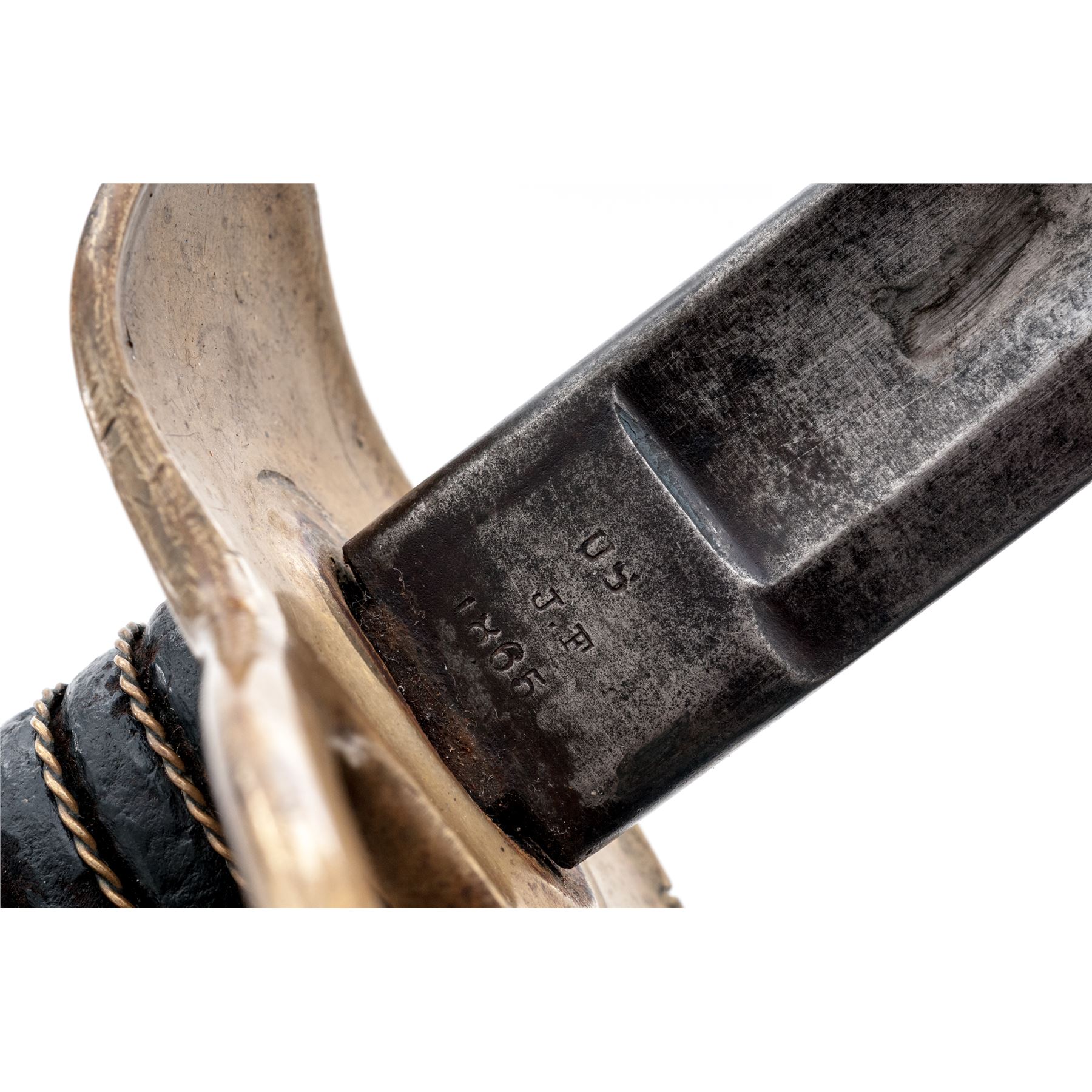 Civil War Era U.S. Model 1860 Enlisted Cavalry Sword, by Ames, with scabbard. The 35'' blade has one narrow and one wide fuller and is marked at ricasso with inspector's stamps ''U.S., J.F. 1865'', and on the other side, ''Made by Ames Mfg.Co. Chicopee....''. The three-branch guard and pommel are brass, with the pommel having inspector's stamps ''J.F.'' at the top. The grooved wood grip is covered in leather and has a single twisted brass wire wrapping. Scabbard is steel with two hanging rings. OAL is 42''. Condition is good with the blade showing age graying, very minor pitting in a couple of places, and a couple of very minor edge nicks. No blade washer present. Guard and pommel are in good shape but have been cleaned at some point. Grip shows cracks in the wood and losses to the leather covering. Wire grip wrapping is intact and tight. Scabbard has a few large dents, some heavy rust pitting at the drag, and an even dark rust patina overall. No markings evident on the scabbard. Est.: $300-$600.