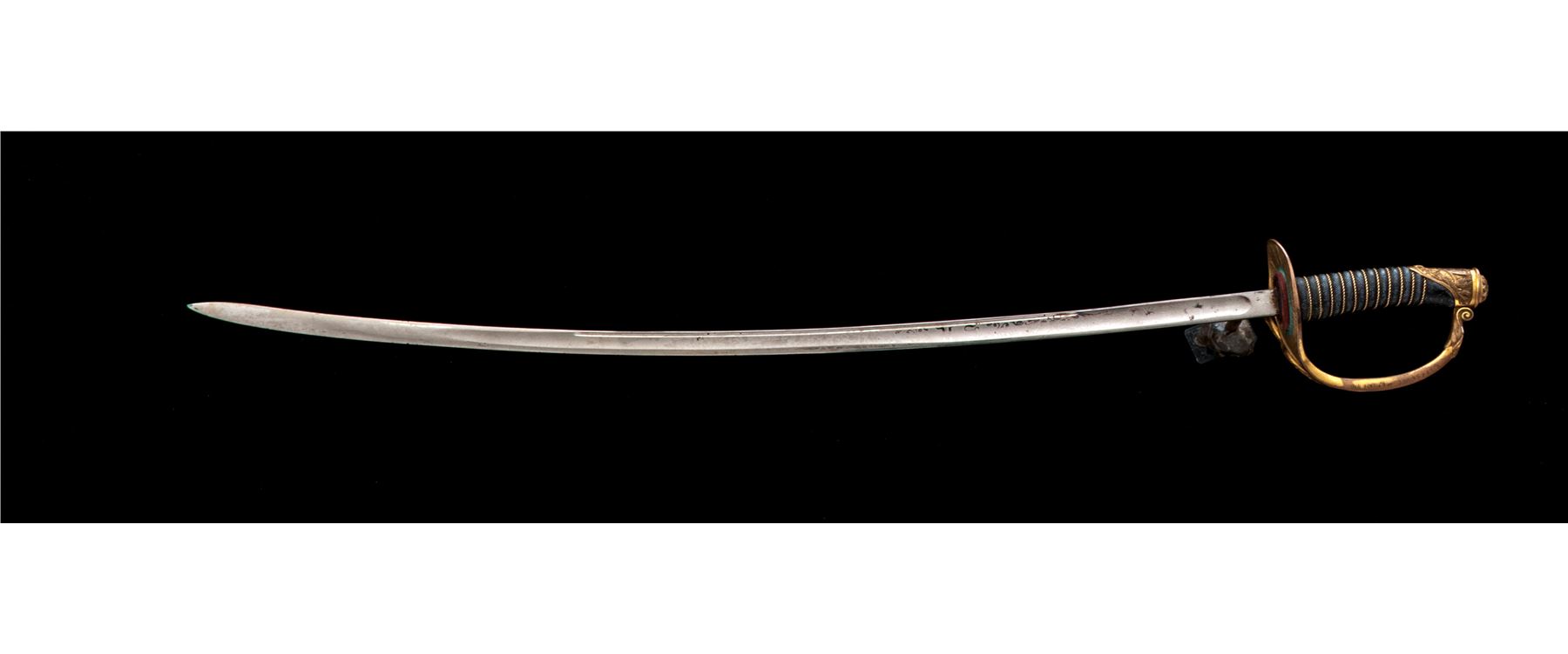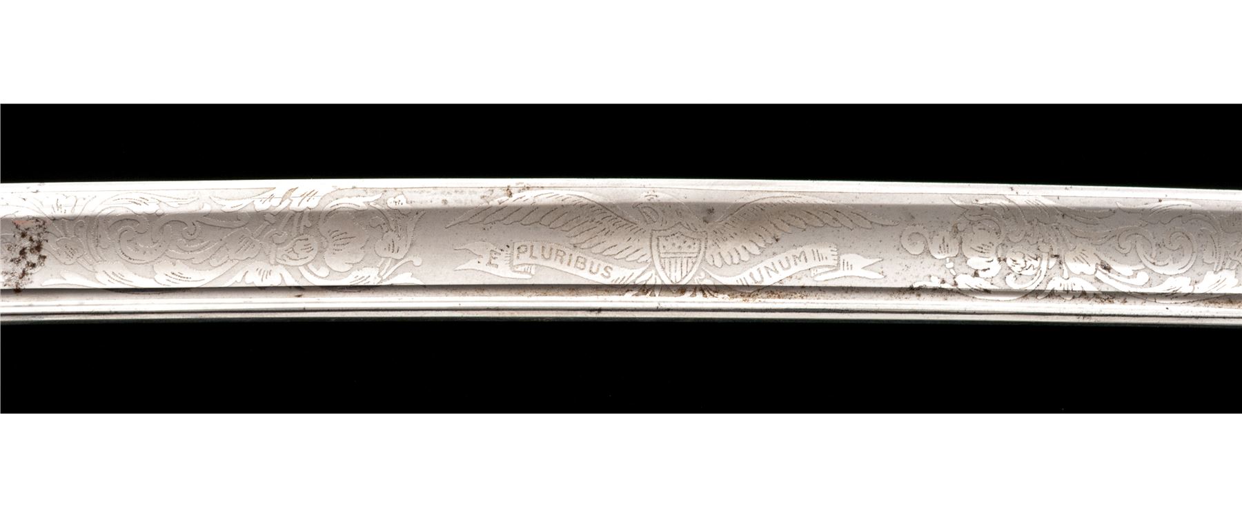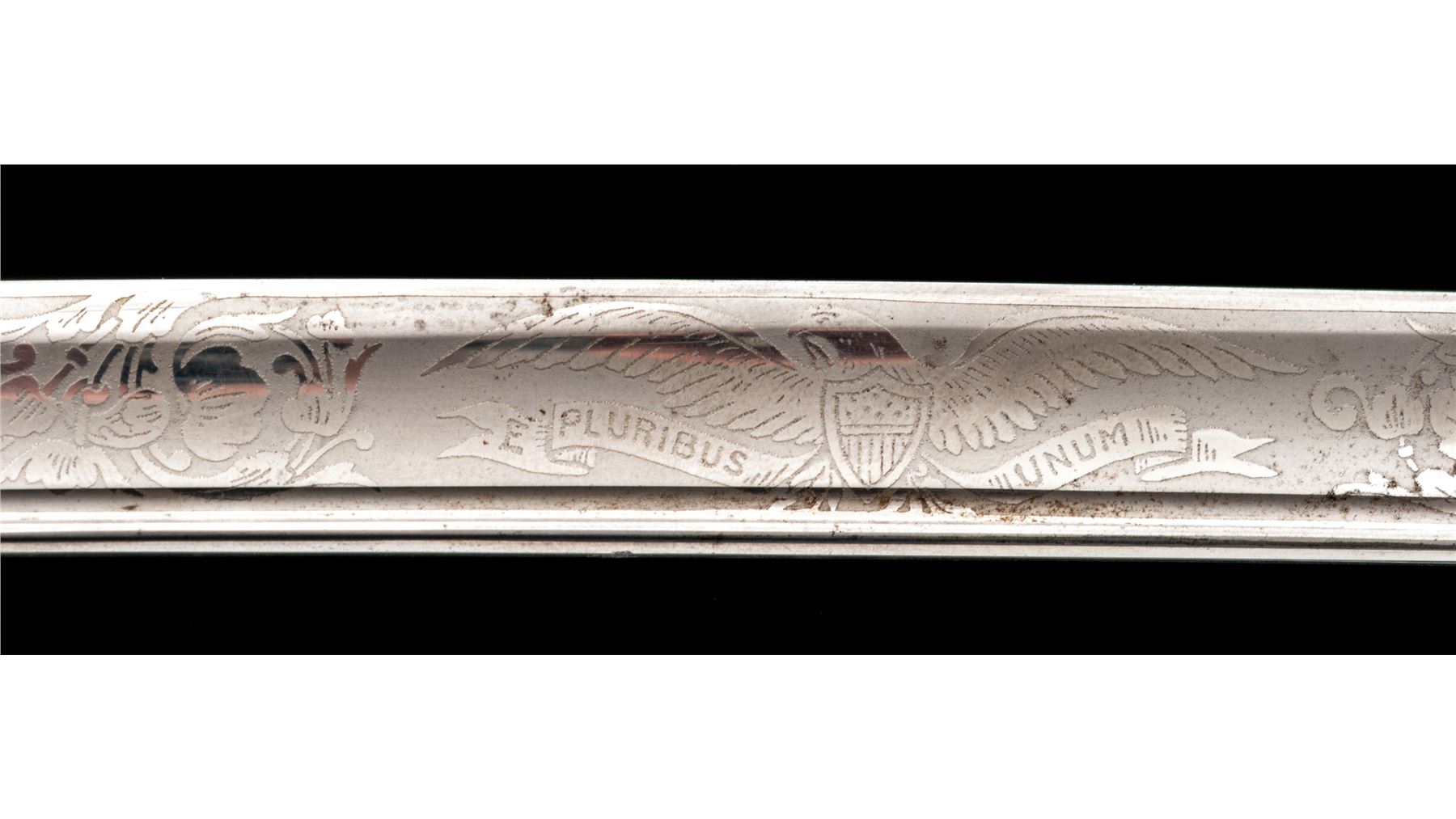 U.S. Model 1872 Cavalry Officer's Sword, no scabbard. The 33-1/4'' bright nickel-plated blade is nicely decorated with etched engraved floral designs, American eagle and shield, U.S., and military motifs. It is maker marked near the ricasso by ''Springfield Armory, Springfield, Mass. U.S.A.''. It has one narrow and one wide fuller and is double edged about 12'' toward the tip. The original leather blade washer is present. The three-branch guard and pommel are cast in high relief with vines and floral decorations, large American eagle, stars, and a shield on side of pommel. There are lightly scratched letters in the side bow of the knuckle guard that read ''K. BATT. 1st U.S.'', and on the other side ''Gettysburg-Wilderness''. The owner may have been a Civil War veteran. The grooved wood grip is covered in dark sharkskin and wrapped with a single twisted brass wire. OAL is 39''. Condition is very good with the blade nice and bright with silver frosting inside the etched engraved panels. There are some scuffs and scratches, with a couple of spots of light rust, and a few minor edge nicks. Guard and pommel retain a lot of the original gold fire gilt finish. Sharkskin on the grip shows some wear and lightening to the color, with all the wire wrapping intact and tight. Handle is nice and tight to the blade. Est.: $250-$450.