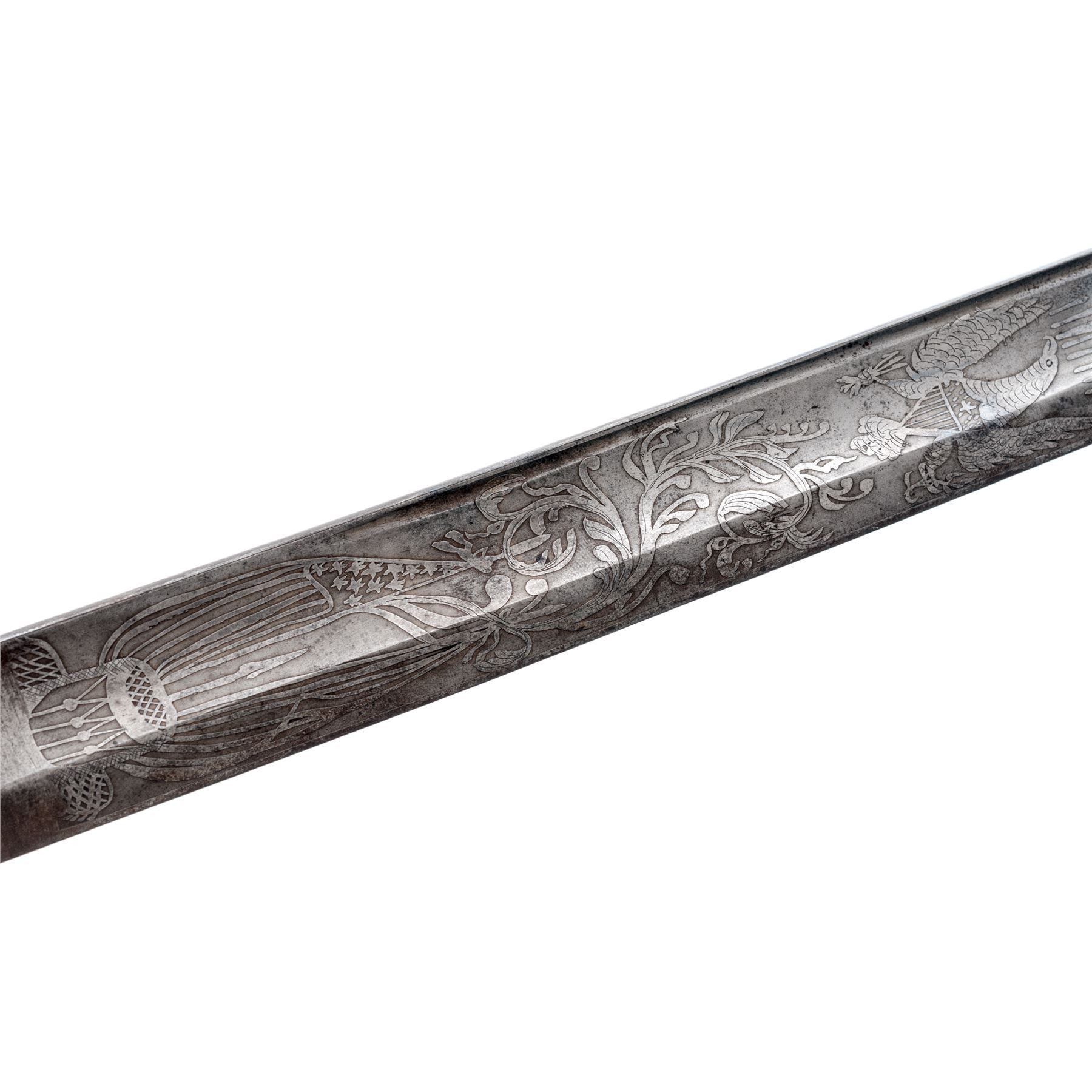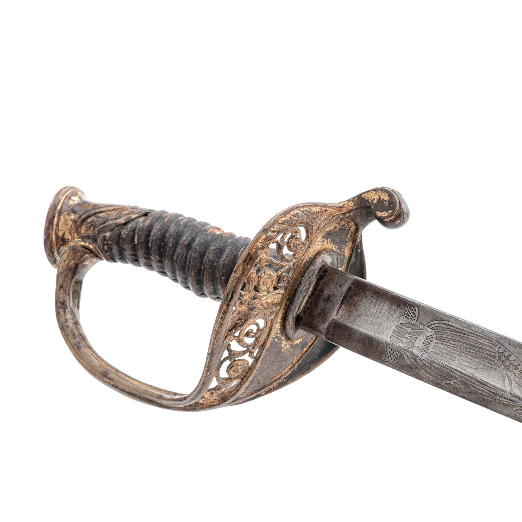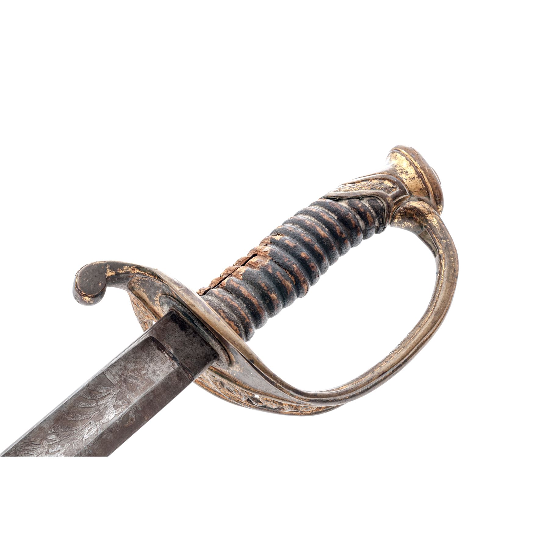 Civil War Era Model 1850 U.S. Field Officer's Sword. The 31-1/2'' blade is nicely decorated and etched engraved ''U.S.'', American eagle, floral, and military motifs, with single narrow and single wide fuller. There are no maker's marks visible anywhere. The original leather blade washer is present. The pierced brass guard has floral designs and retains some of its original gold fire gilt finish in protected areas. Pommel cap is brass. Grooved wood grip is covered with leather. Condition is good with the blade being mostly bright, with light rust stains and scattered scratches and scuffs, but should clean up nicely. Guard and pommel are uncleaned with bright gilt finish showing in a few areas. Wood grip is cracked with some minor lossses to the wood and leather covering. The grip wire wrapping is missing. No scabbard. OAL is 37-1/2''. Est.: $250-$400.