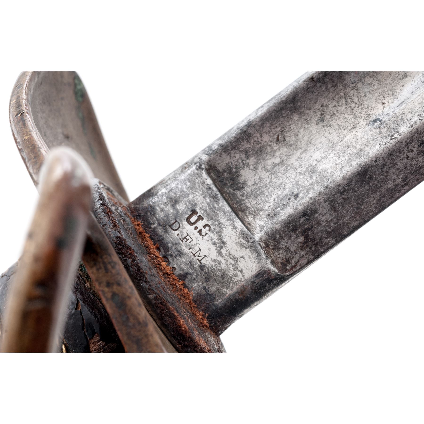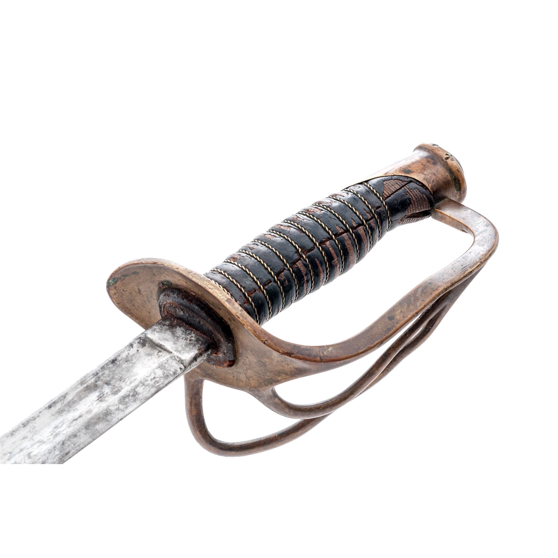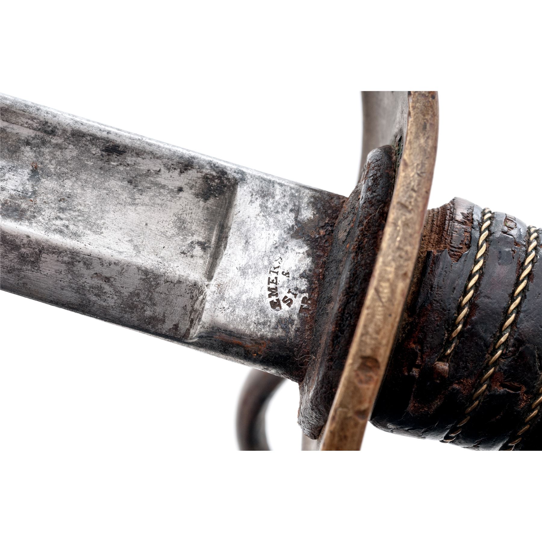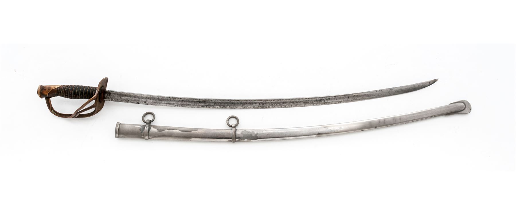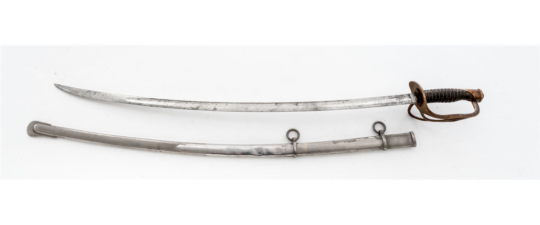 Civil War Model 1860 Enlisted Cavalry Sword, by Emerson & Silver. The 34-3/4'' blade has one narrow and one wide fuller, marked at ricasso with inspector's stamps ''U.S., D.F.M.'', and on the other side is a partial maker's stamp of Emerson & Silver of Trenton, New Jersey. The original leather blade washer is present. The three-branch guard is made of solid brass with a brass pommel cap. Grip is grooved wood with thin leather covering and wrapped with a twisted brass wire. Scabbard is steel with two hanging rings. Condition is good with the blade showing scattered rust stains, age graying, and minor pinprick pitting in a few areas. There are no edge nicks. The guard is a bit mis-shapened and bent, but has a pleasing dark patina, having not been cleaned or polished for many years. Handle is nice and tight. Wood grip has some lengthwise cracks and shows losses to the leather covering. All the twisted wire wrapping is intact and tight. Scabbard has been chrome plated and the majority of the chrome has peeled off, with the bare polished metal showing underneath. OAL is 42-1/2''. Est.: $300-$600.