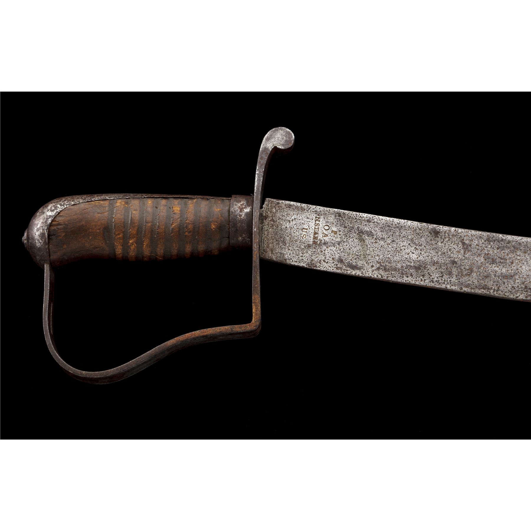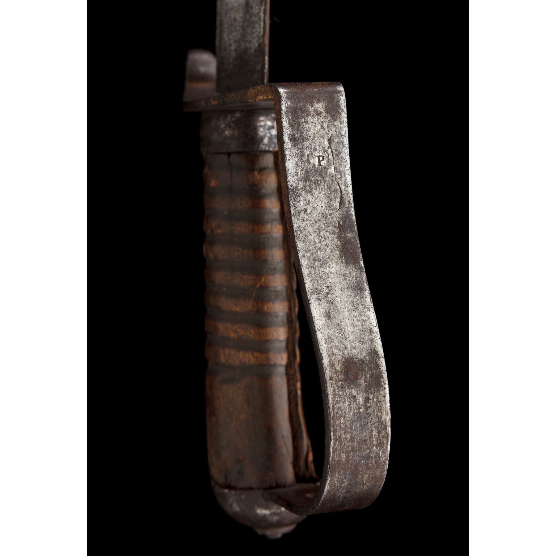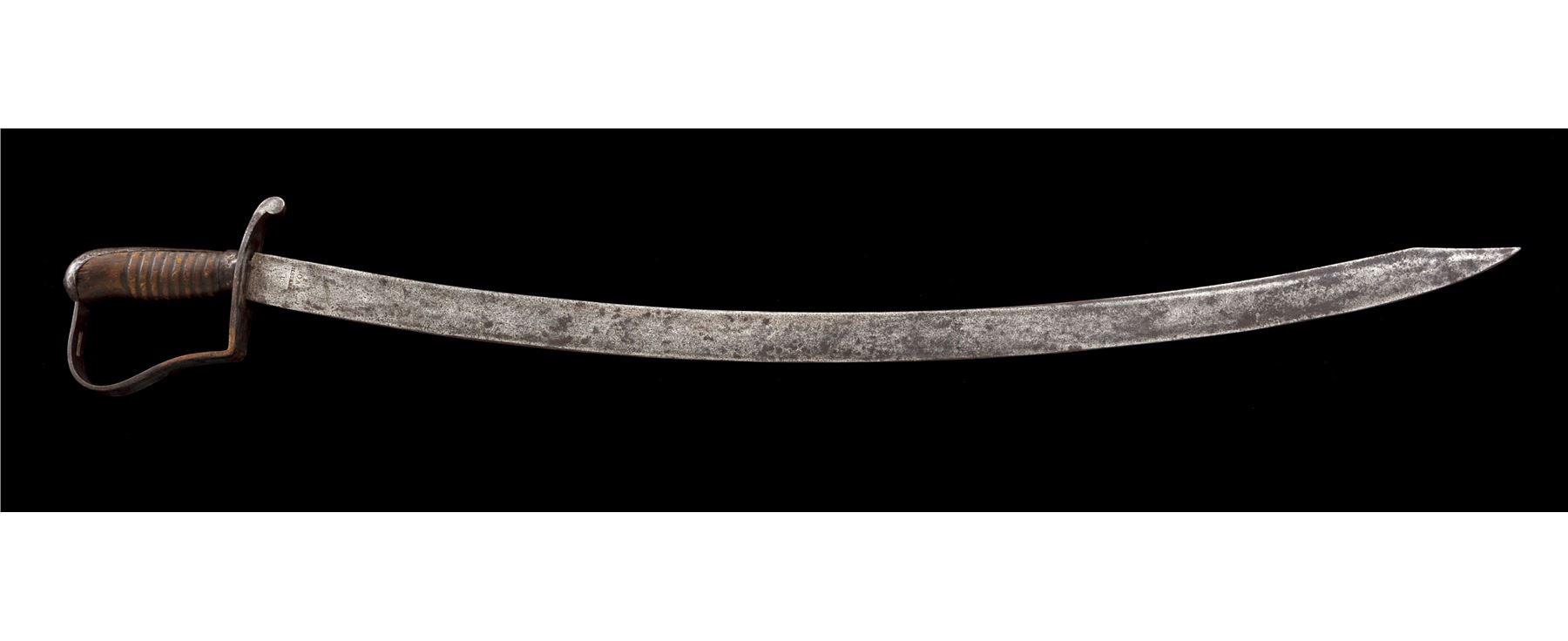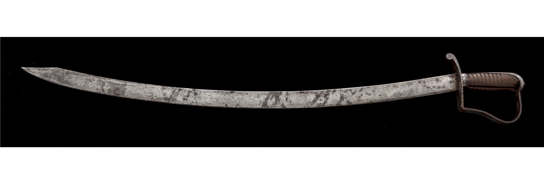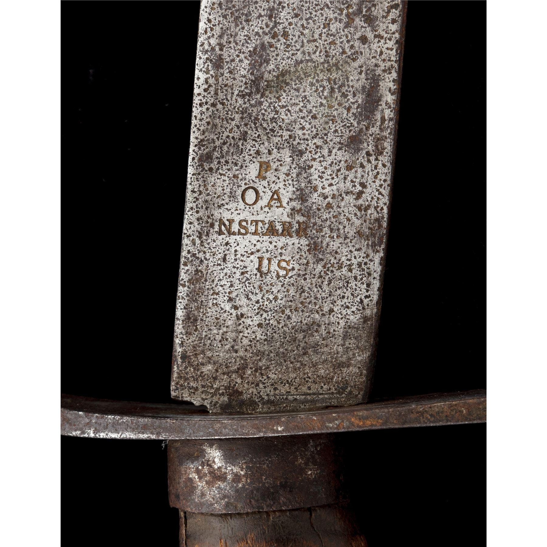 Model 1812 U.S. Cavalry Saber, by Nathan Starr, no scabbard. The 34'' blade has flat sides with no fuller and a chisel point tip, marked at base ''P, OA, N.STARR, and US''. Handle features a ''P''-shaped steel knuckle bow, flat crossguard, and quillion. Backstrap is steel with a grooved wooden grip. Condition is fair with fine pinprick pitting over the entire blade, some light cleaning, and scattered age graying. Wood grip has a large crack with material missing down the middle of the grip, and some chipping at the top. Guard and backstrap have been lightly cleaned. There is an inspector's stamp ''P'' on the knuckle guard. OAL is 39.5''. Est.: $400-$600.