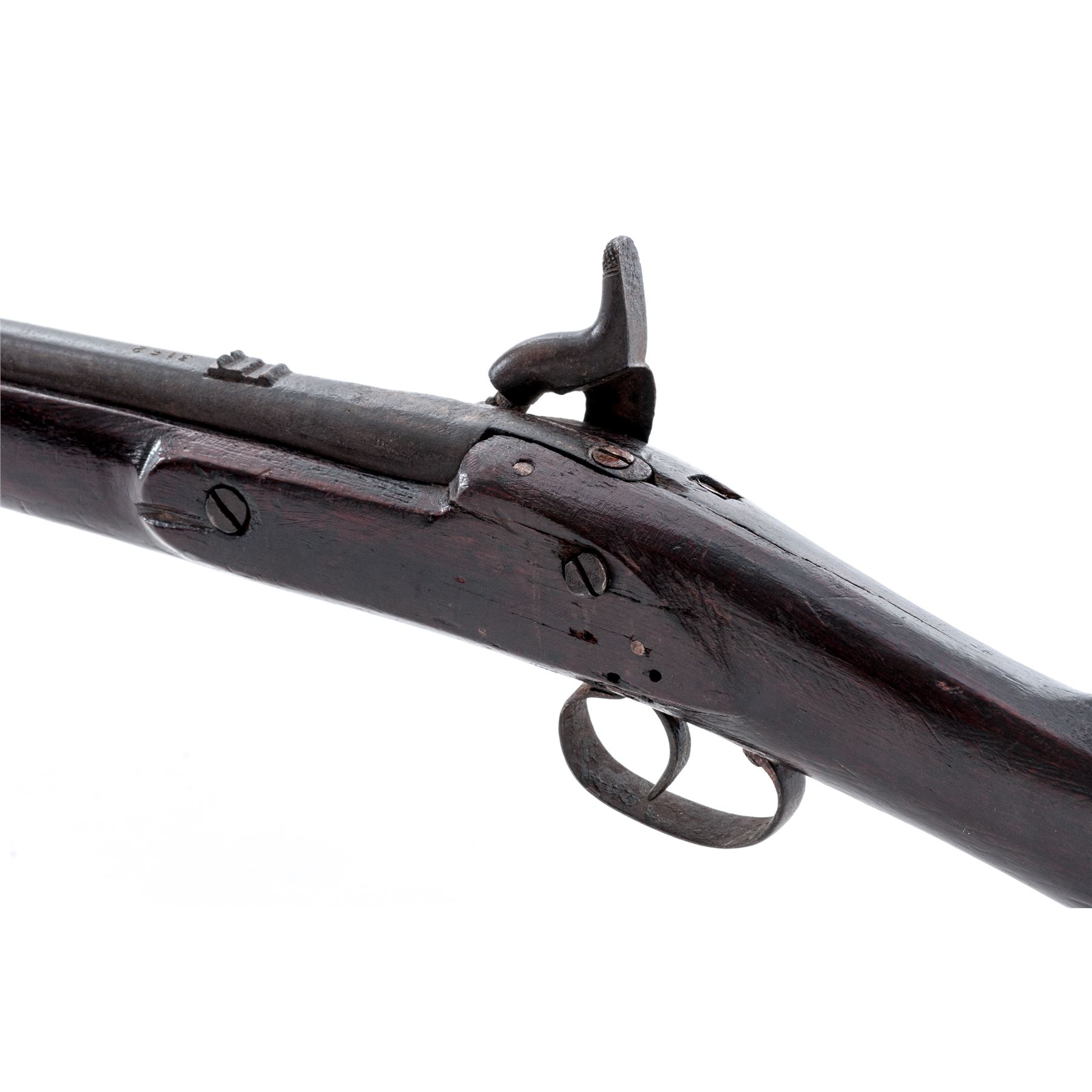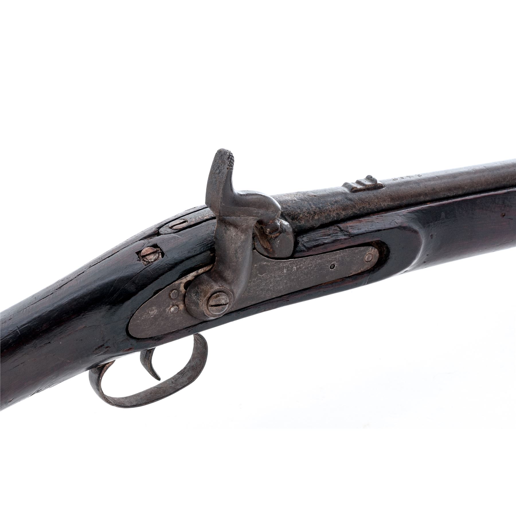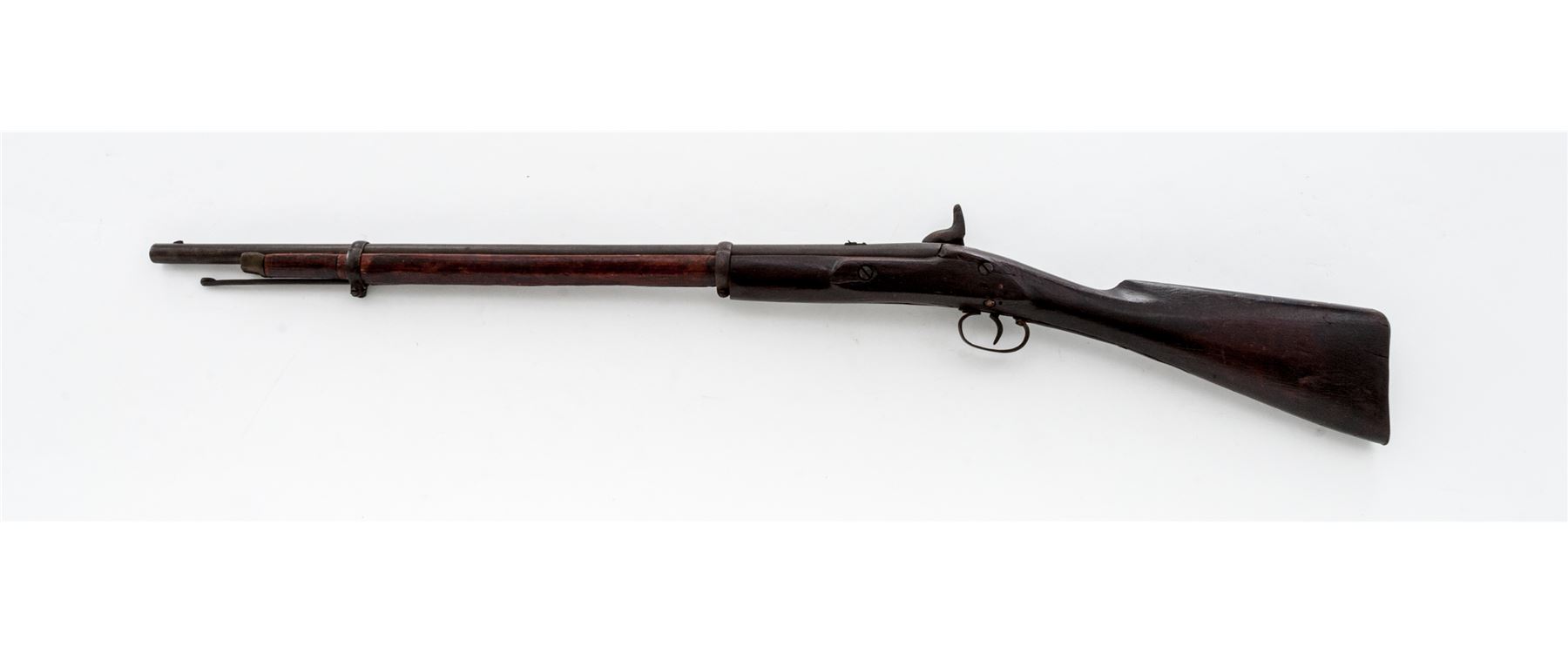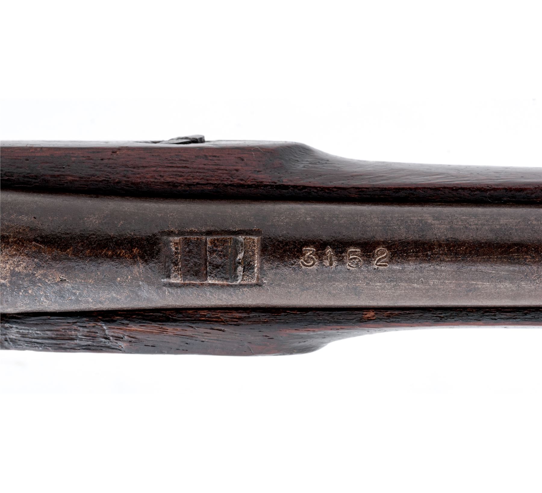 Civil War Era Percussion Two-Band Artillery Musketoon, having characteristics of those made by Cook & Brother of New Orleans and Athens (GA), circa 1861-64, #3152, .58 cal., 28'' barrel, with small integral blade front and small notched rear sights, marked only ''3152'' ahead of rear sight; flat lockplate appears unmarked (or markings have eroded), has a high-spur hammer and percussion nipple bolster with integral flash-guard; iron triggerguard with long rear tang; iron buttplate with rounded edge at top tang; two screw-retained iron barrel bands (top band missing its sling swivel) retain the iron ramrod; walnut fullstock with characteristic ''step'' at bottom band and brass nosecap, has five brass tacks on right side and a vacant screw hole at bottom where perhaps a sling swivel was once fitted. Condition is good to very good. Iron surfaces have a dark brown (but mostly smooth) age patina; barrel appears to show occasional traces of twist pattern, with deep black powder pitting in the nipple area; lockplate may be a period replacement as it is ill-fitted at front (or it may be age erosion of the wood); triggerguard may likewise be a period replacement, as is the ramrod. Stock shows the expected marks of age and military use, but is sound with a later coat of varnish. Action is smooth and strong; smoothbore shows erosion but is clean. This musketoon, styled after the British Enfield P-1853 (Ferdinand and Francis Cook were Englishmen), presents an enigma: it is surely ''of the period,'' but is it Confederate? We leave it to the buyer to decide. Est.: $500-$650. (Antique)