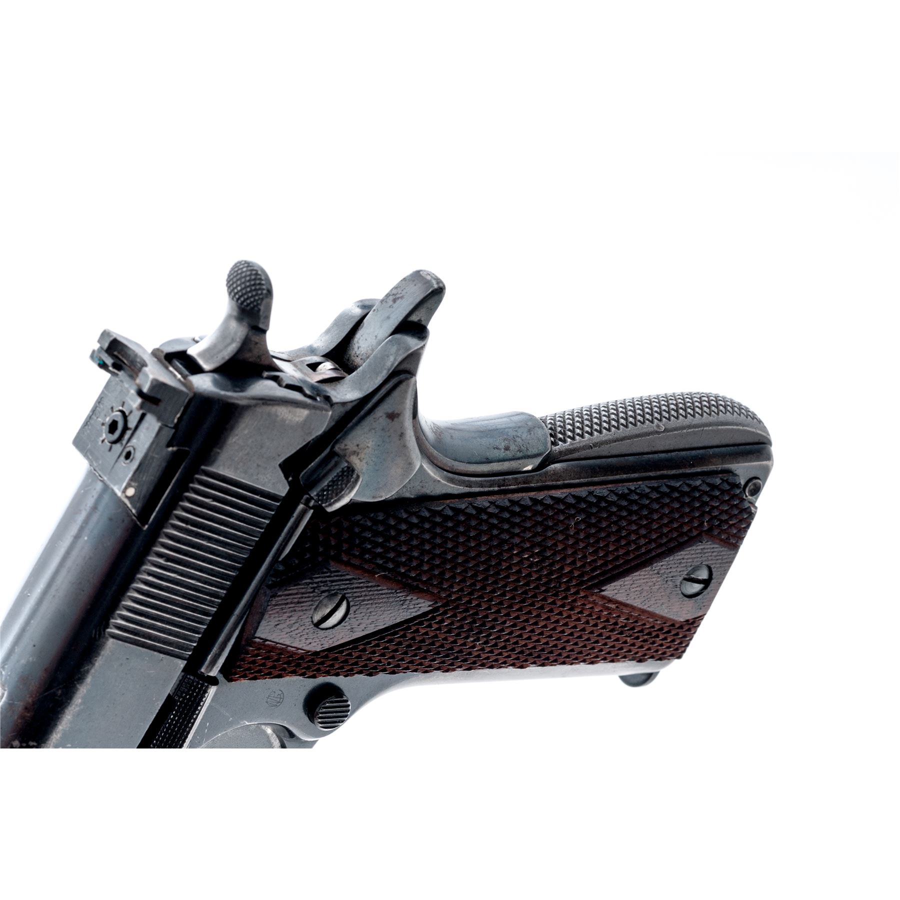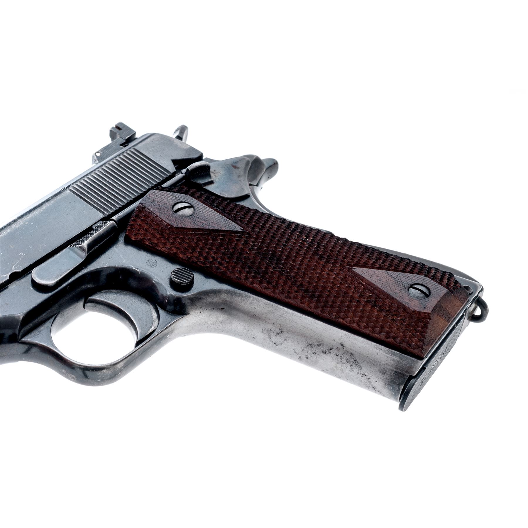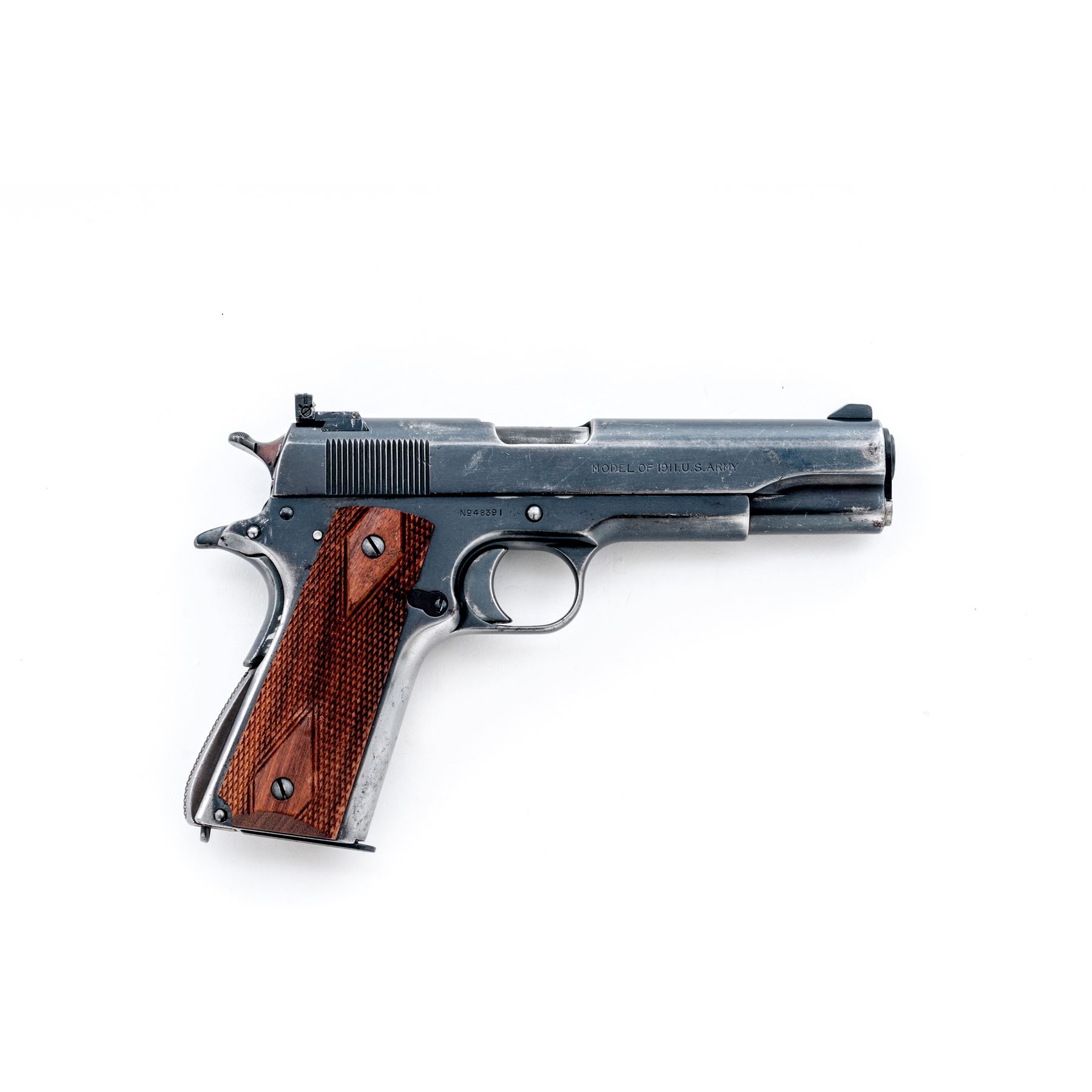 Colt Model 1911 Semi-Automatic Pistol, in 1943 Boyt holster, #48391, .45 ACP cal., 5'' barrel, blue finish, WWI era Savage contract slide, later added Micro target sights, Match barrel, aftermarket checkered walnut grips, with modern Springfield magazine. Condition is very good as modified and refinished, retaining approx. 85% blue. Grips and action are crisp, bore is fine. Holster is very good having been darkened after WWII. Est.: $500-750. (C&R/PPT)