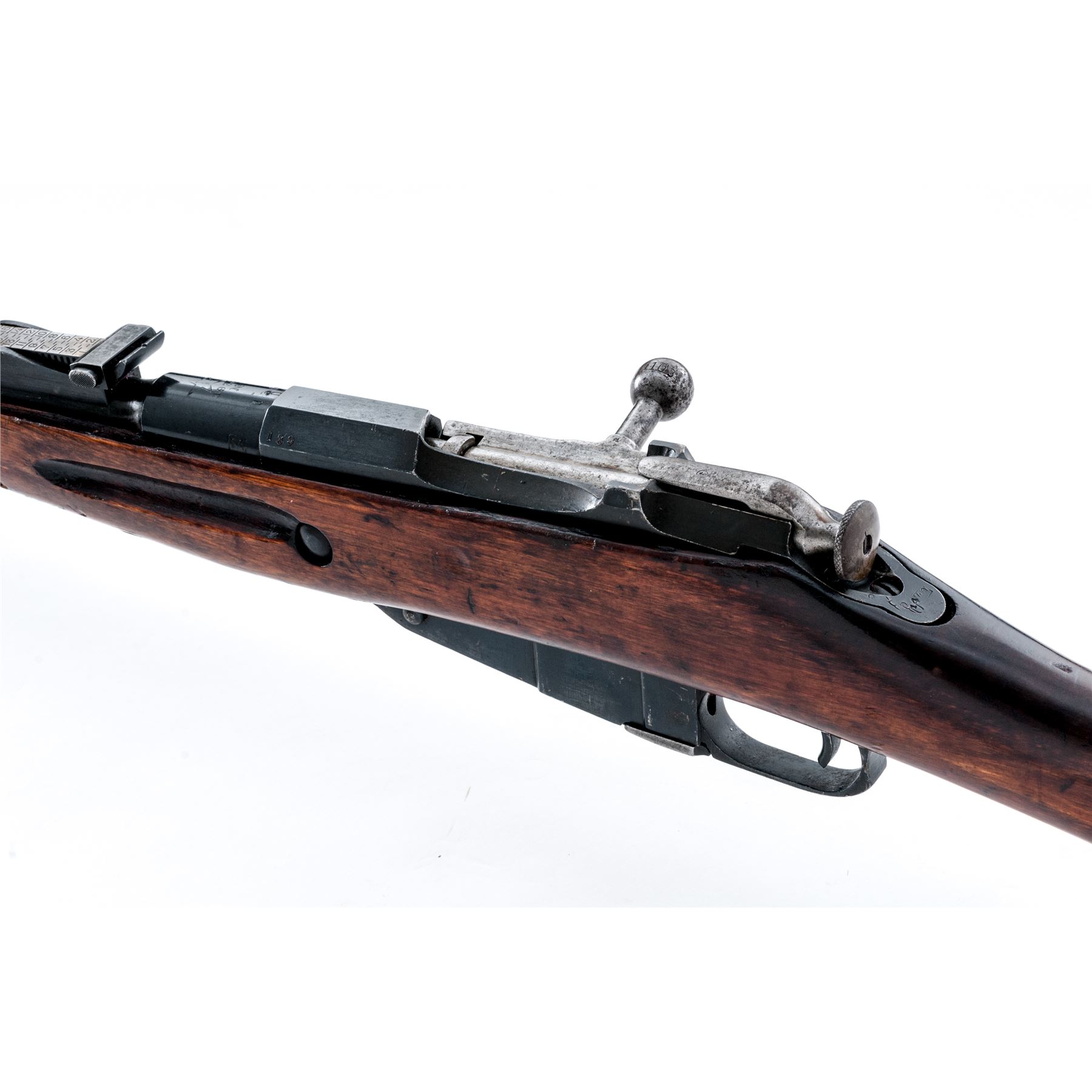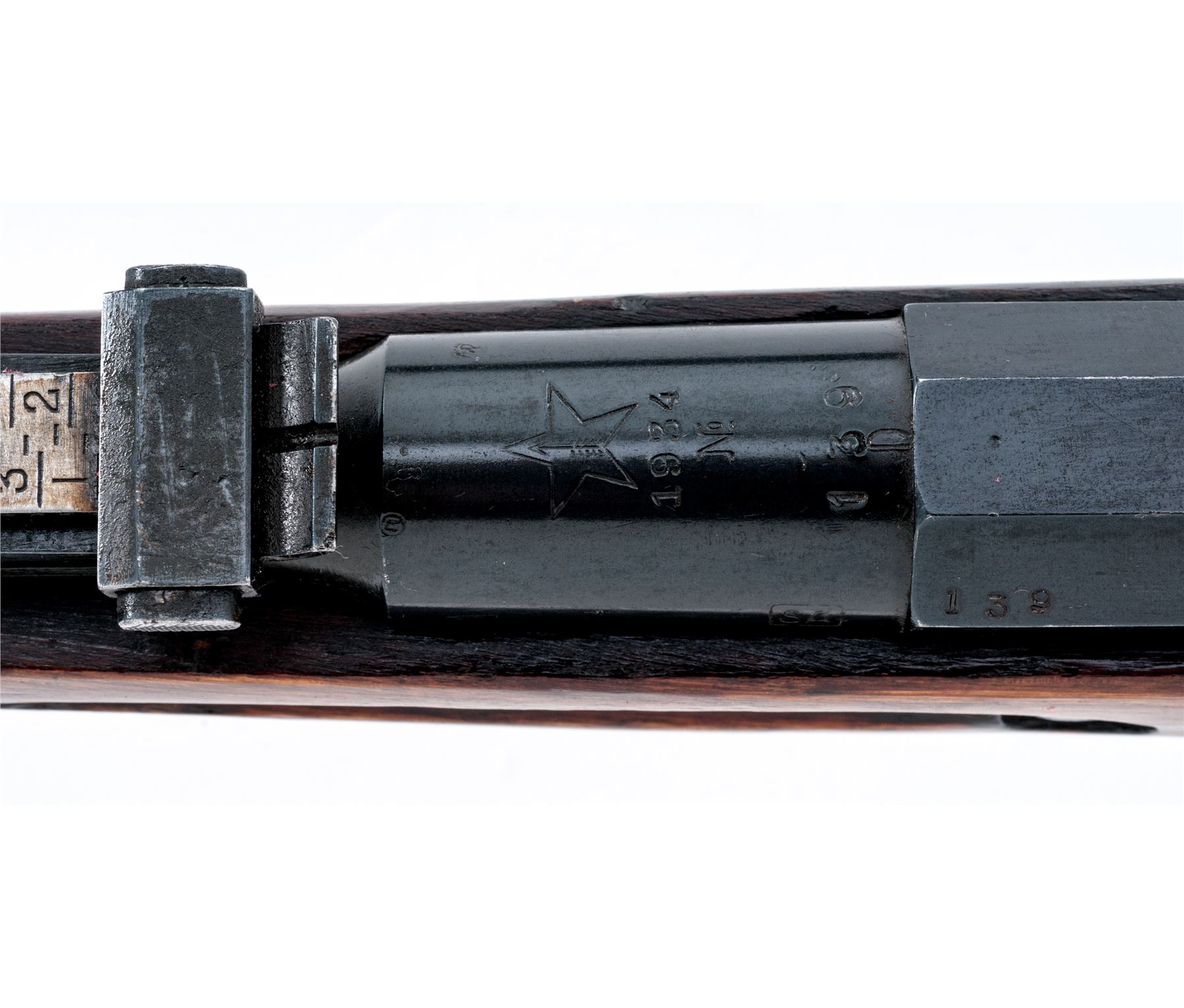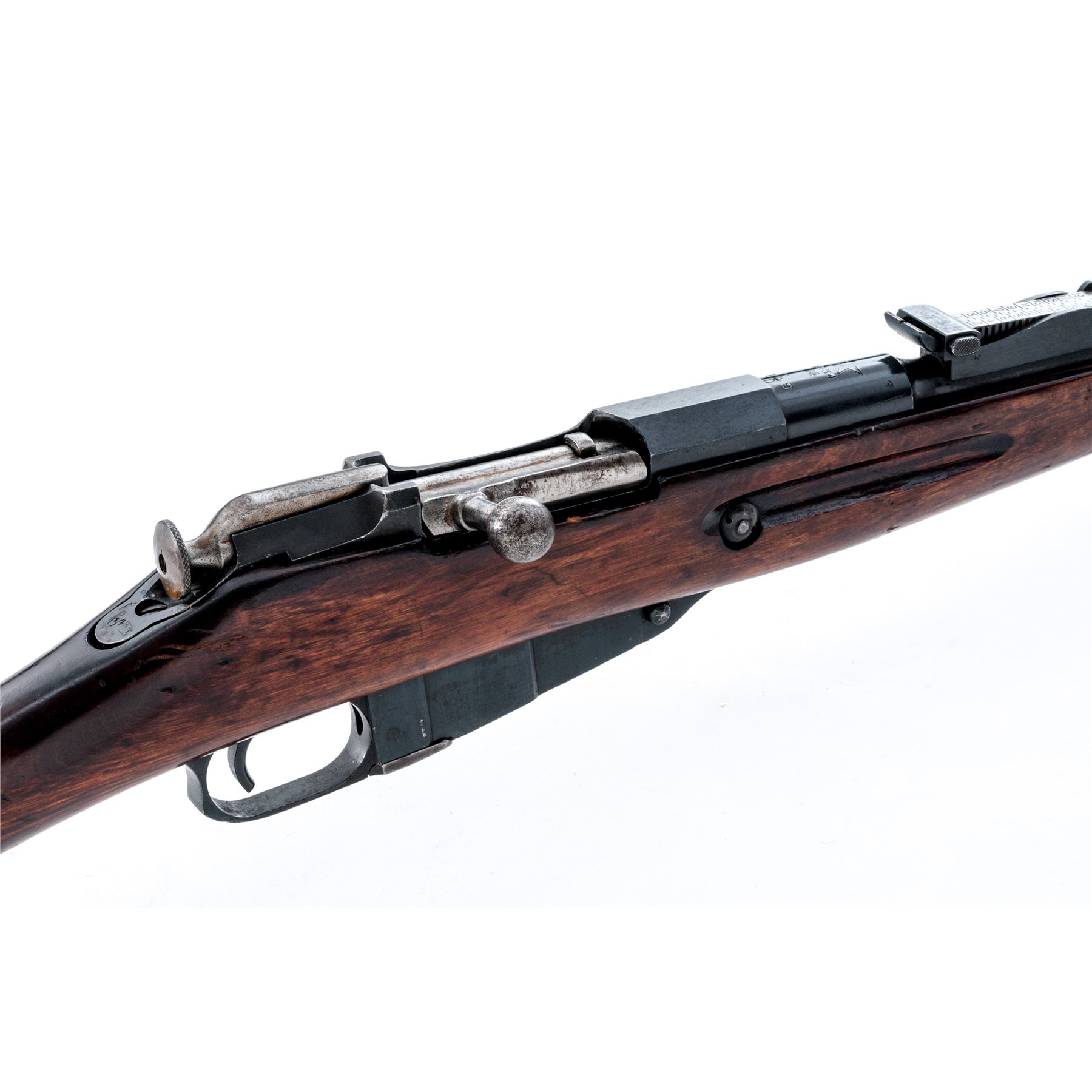 Low Serial Number Finnish issue Soviet Model 91/30 Mosin-Nagant Bolt Action Rifle, #139, 7.62x54R cal., 28.7'' barrel, blued finish, birchwood stock, cleaning rod, blade front sight and adjustable tangent rear sight. Marked on barrel shank with the five-pointed star symbol of the Tula Arsenal over ''1934'' and ''D''. Left side marked with Finnish ''SA'' property stamp. Stock is Finnish replacement with interlocked fingers. Bolt has been Finnish renumbered to match. Buttplate has mismatched number. Condition overall is very good with approx. 85% finish remaining on the metal with patina on the bolt and buttplate. Wood is very good with darkening showing a few gouges along with other handling marks. Action is smooth, bore is good with darkening forward of the chamber and very good rifling. Import stamped on right side of barrel. Est.: $450-$650. (C&R)