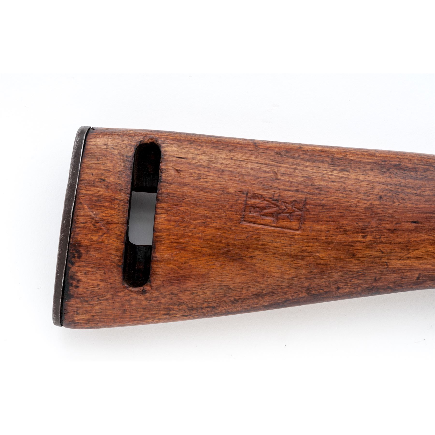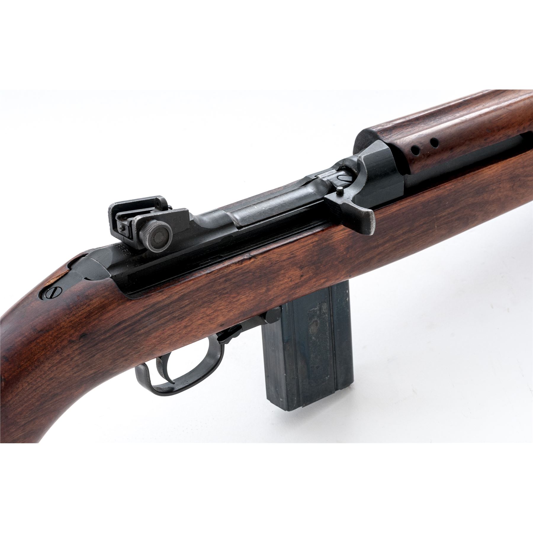 U.S. M1 Semi-Automatic Carbine, by Underwood, #1386862, .30 Carb. cal., 18'' barrel, parkerized finish, hardwood stock, marked on chamber ''U.S.CARBINE CAL..30 M1'', and on rear of receiver ''UNDERWOOD''. Barrel behind front sight is marked ''UNDERWOOD 3-43/(flaming bomb)''. Stock is Italian made and is stamped on right side buttstock ''(star)/FAT 82''. Includes one U.S.G.I. 15-round magazine stamped ''IU''. Condition overall is very good with approx. 90% of the Italian re-parkerized finish remaining on metal surfaces. The potbelly type stock is very good with stamped rack numbers and areas of scratches and marring. Action is smooth, bore is very good. No visible import stamps. Est.: $600-$800. (C&R)(High-cap mags not available to Calif. residents.)