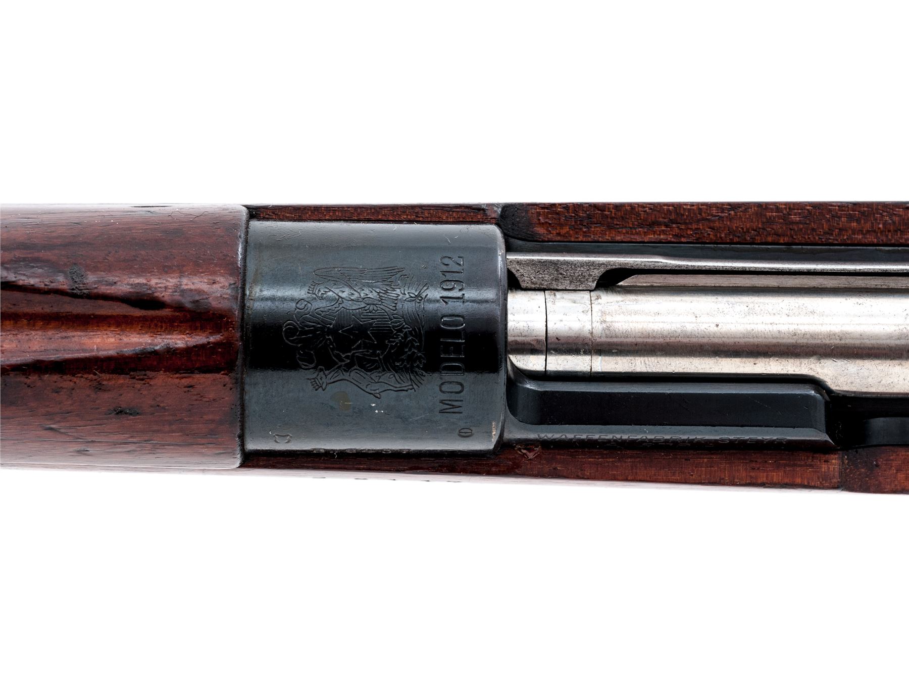 Chilean Model 1912 Mauser Bolt Action Rifle, #B8407, 7.62x51mm cal., 29'' barrel, blued/bright finish, hardwood stock, inverted ''V'' front sight and adjustable tangent rear sight. Marked on receiver ring with ''(Chilean crest)/1912'', and behind charger bridge ''7.62 N'' indicating arsenal conversion to 7.62x51 cal. Mismatched numbers, painted rack number on wrist. Includes cleaning rod. Condition overall is very good with metal retaining over 95% of its reblued finish. Wood is also very good with a high-gloss varnish finish applied over old dents and scratches. Action is smooth, bright bore is very good with some wear. Import stamped on right side of barrel. Est.: $300-$500. (C&R)