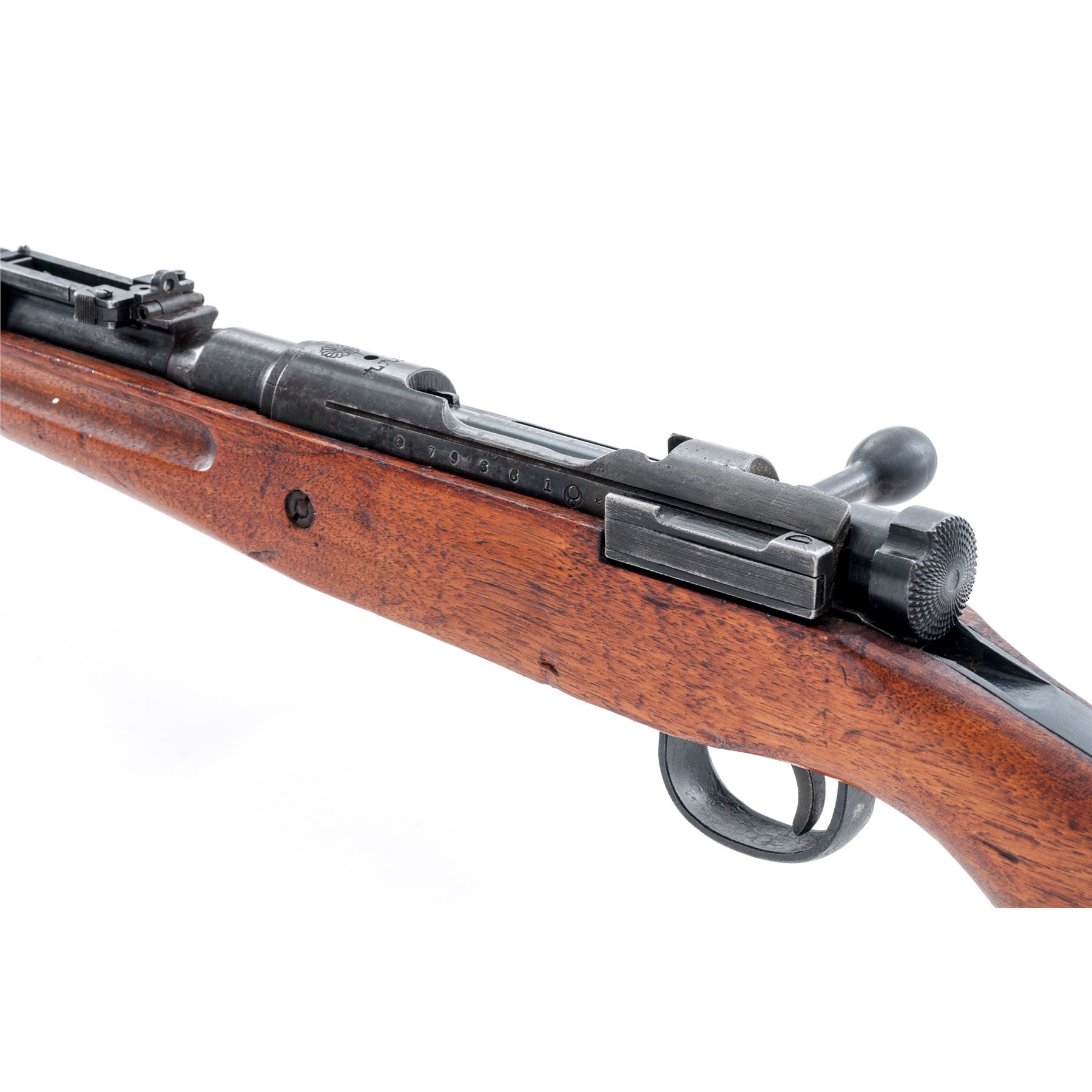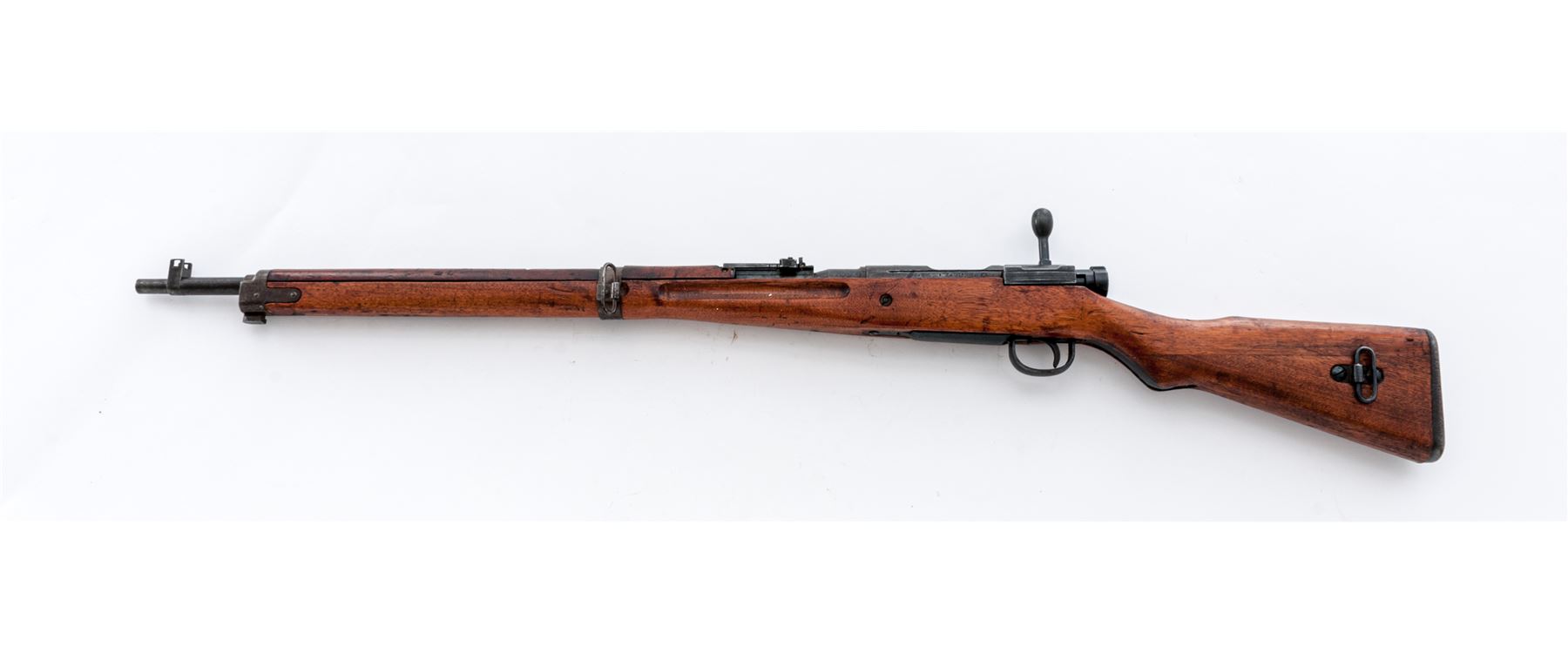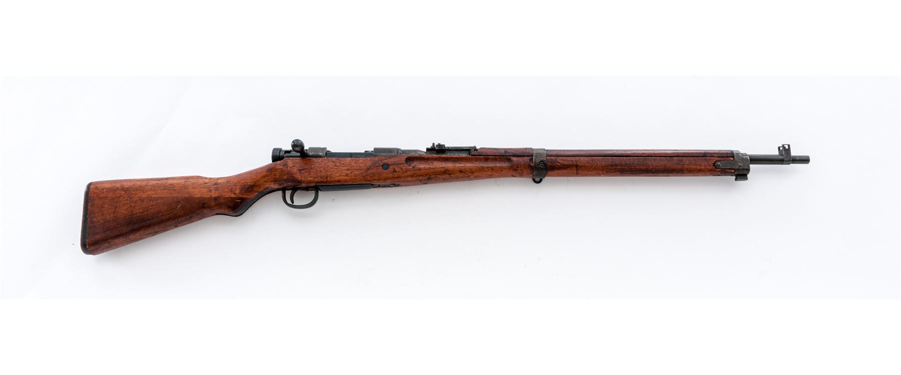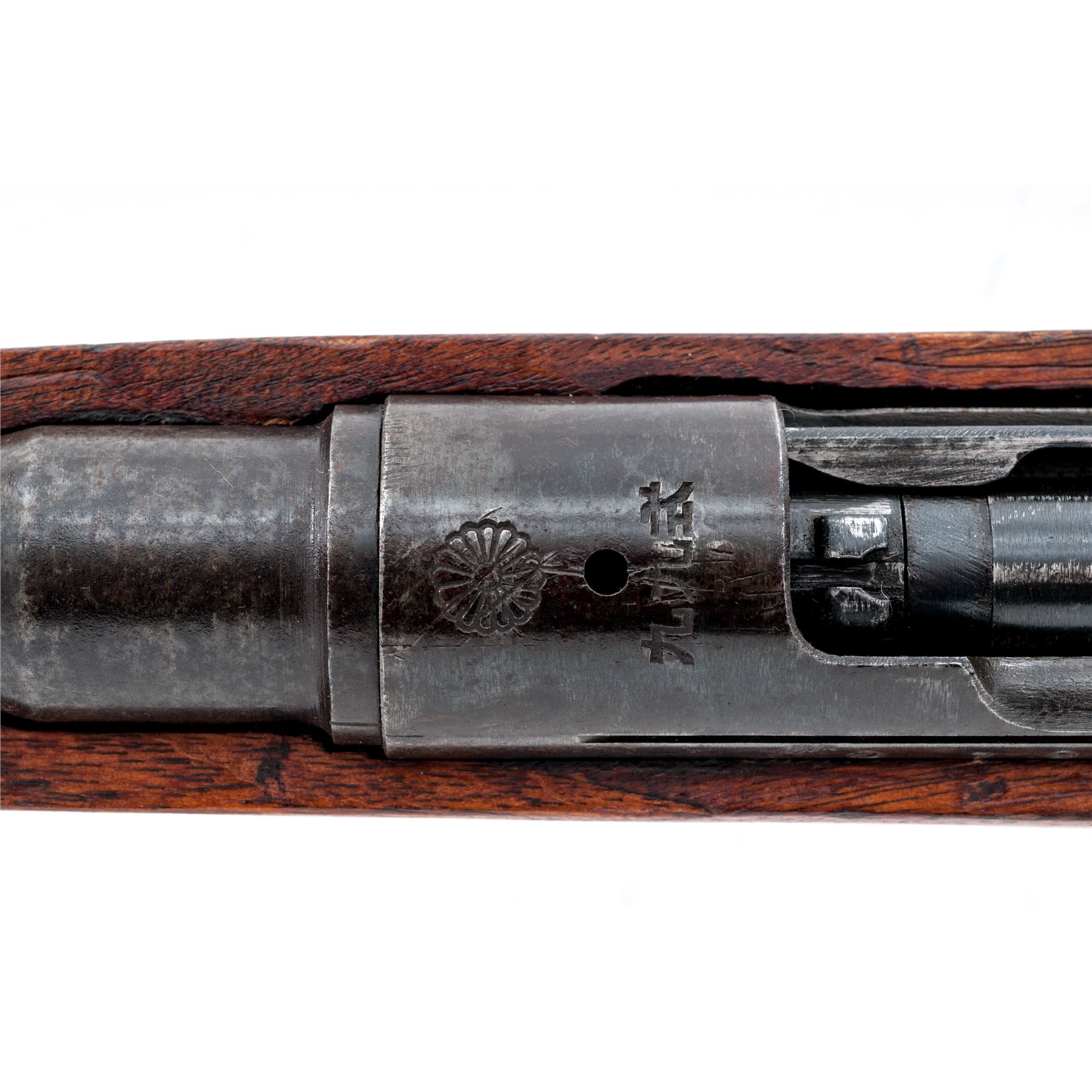Japanese Type 99 Arisaka Bolt Action Rifle, #79661, 7.7x58mm cal., 25.5'' barrel, blued finish, hardwood stock, inverted ''V'' front sight with protectors and adjustable folding leaf rear sight with peep. Stamped on left side of receiver with 7th Series mark and code of the Nagoya Arsenal. Mum crest is lightly defaced. Mismatched numbers on bolt handle and bayonet lug. Condition overall is very good with approx. 70% finish remaining on the metal, which has been cleaned on the rear of the receiver and shows overall thinning and brown patina. Wood has several gouges, otherwise very good with overall handling marks. Bright bore has shallow rifling. Action is stiff but serviceable. Est.: $350-$500. (C&R)
