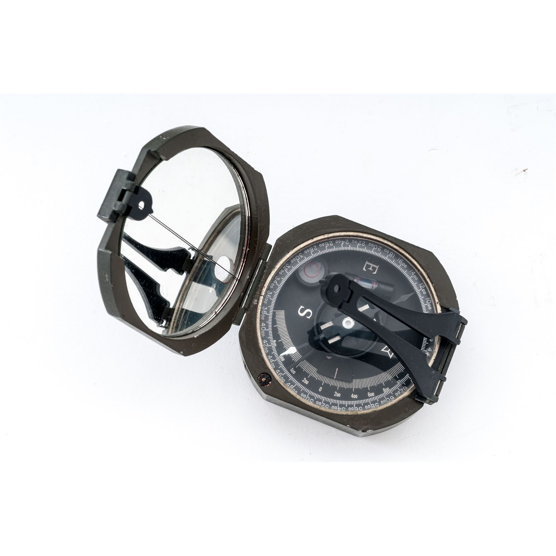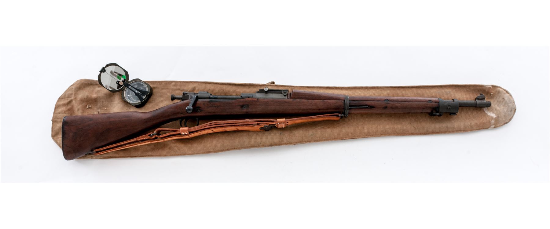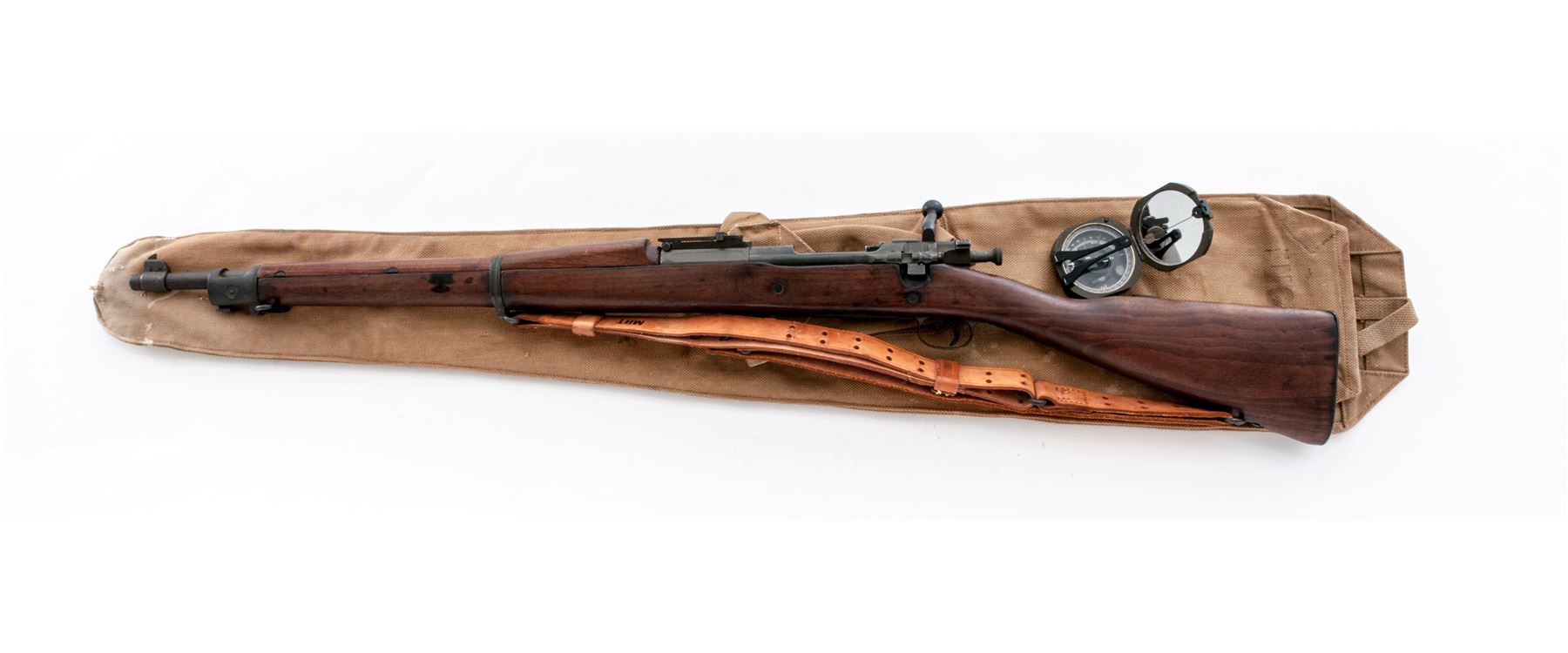 Springfield Model 1903 Bolt Action Rifle, #347648, .30-06 cal., 24'' barrel, parkerized finish, walnut stock, blade front sight and adjustable folding leaf rear sight. Marked on receiver ring ''U.S.SPRINGFIELD ARMORY MODEL 1903'', and on barrel behind the front sight ''U.S.M.C. 10-43 (circle S)''. There is a faint ''FJA'' stamp on the left side of the stock and a ''circle P'' firing proof on the underside of the wrist. Condition overall is very good with over 80% of the re-parkerized finish remaining on the metal,which has areas of rust spots and brown patina. Stock has a wood splice and two wood putty repairs and has been sanded and refinished, showing light handling marks. Action is smooth, bright bore is very good with sharp rifling. Rear sight bed is slightly loose. Includes a U.S. leather sling in very good condition marked ''MRT'', and a British Pattern 37 rifle case in good condition. Also included is a U.S. military compass dated ''2-81'' in good condition. Est.: $500-$750. (C&R)