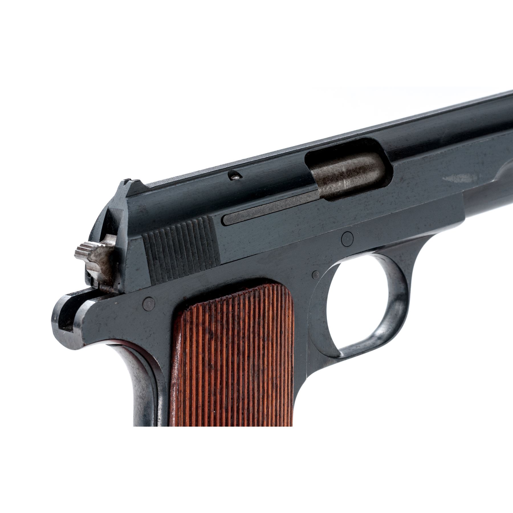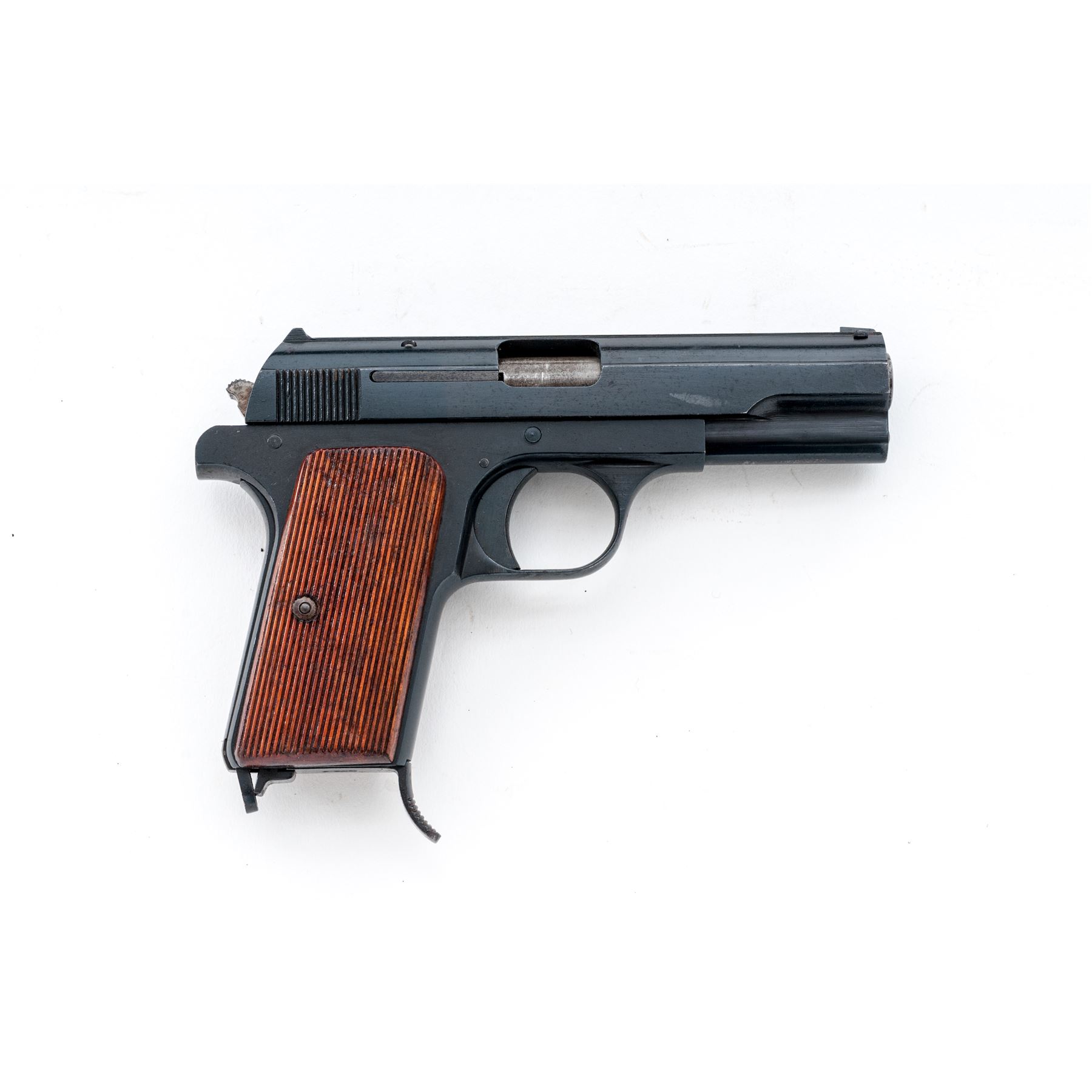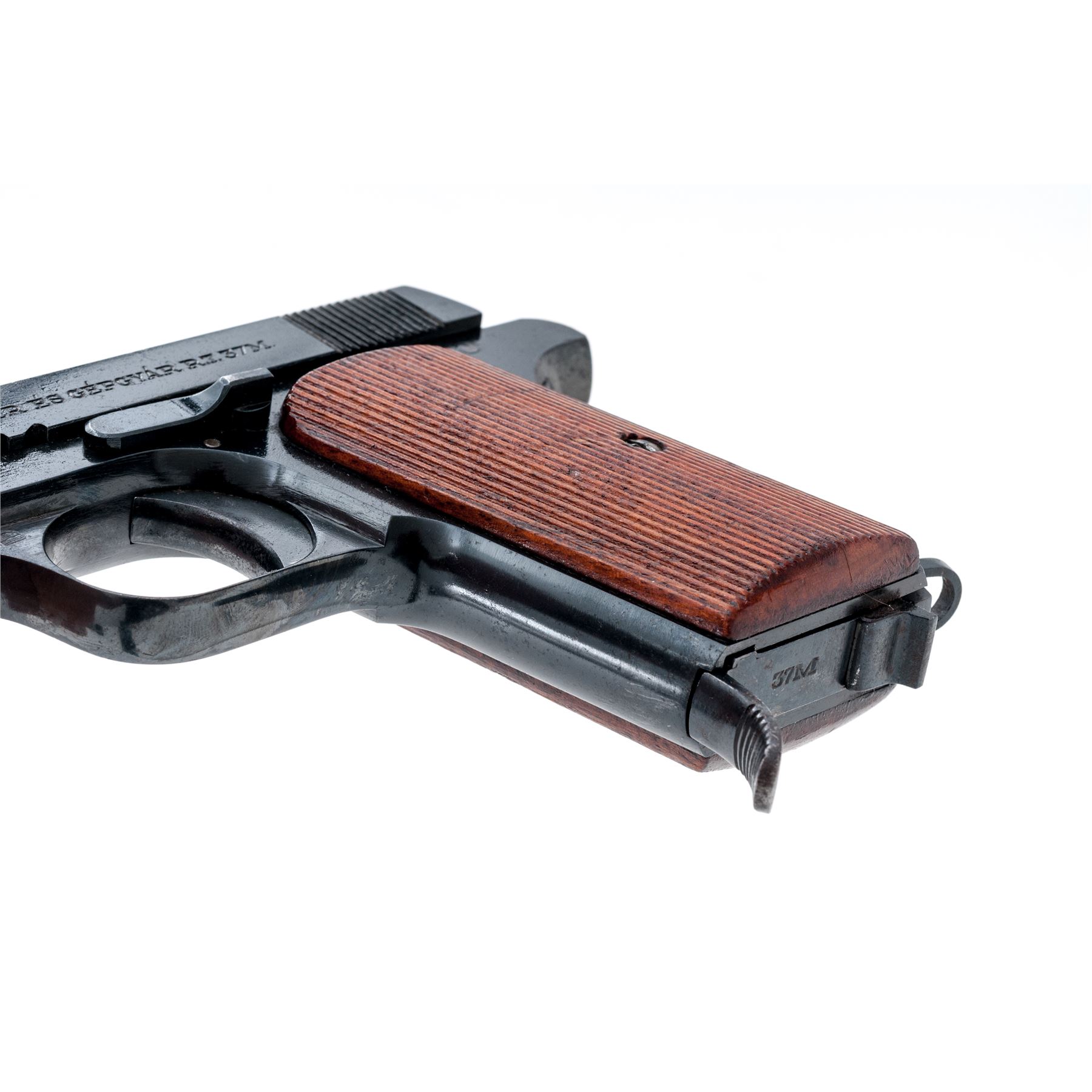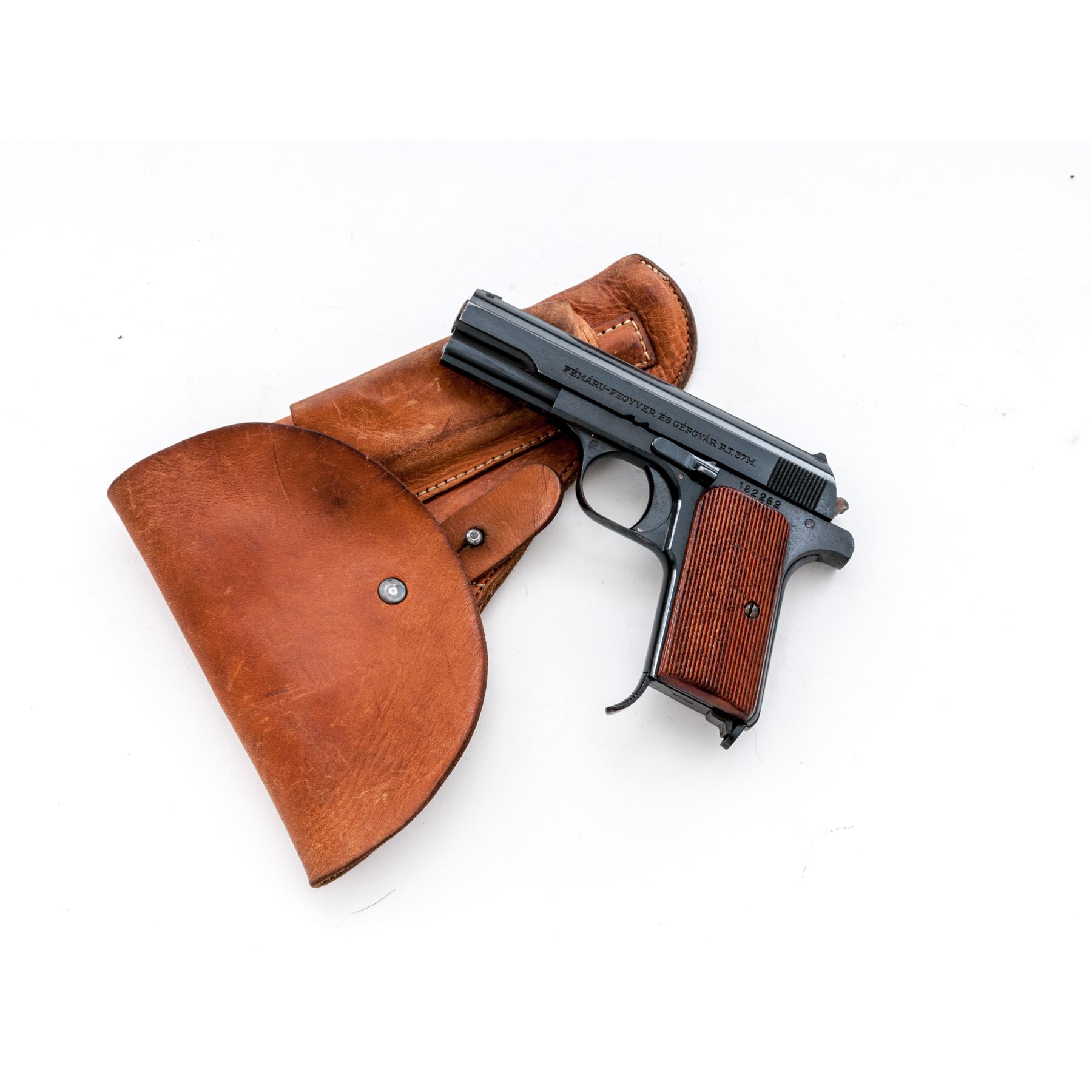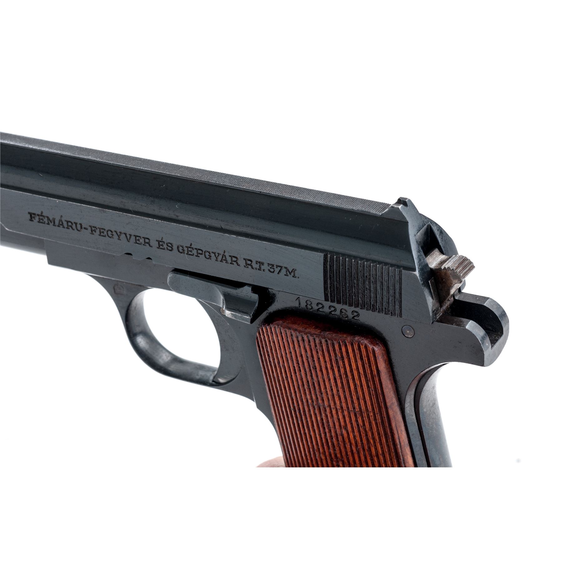 Hungarian Femaru Model 37M Semi-Automatic Pistol, with Czech CZ-52 holster, #182262, .380 ACP cal., 4'' barrel, blue finish, serrated wood grips, standard sights, with one ''37M'' marked magazine. Left side of slide is marked ''FEMARU-FEGYVER ES GEPGYAR R.T. 37M''; left side of triggerguard with ''St. Stephens Crown'' acceptance mark. Included is a ''61'' dated Czech CZ-52 holster with cleaning rod. Approx. 95% original finish remains and pistol rates as very good overall. Metal with general specks of light freckling to the finish. Factory lettering, proofmarks, etc. are clear and defined. Grips show signs of moderate age and wear including scattered small impressions to the serrations. Very good action; bore is moderately pitted but not worn out, rifling is good. CZ-52 holster shows normal age and wear, color on the magazine pouch has thinned, stamp on the inside is clear, stitching is intact. Est.: $300-$500. (C&R)