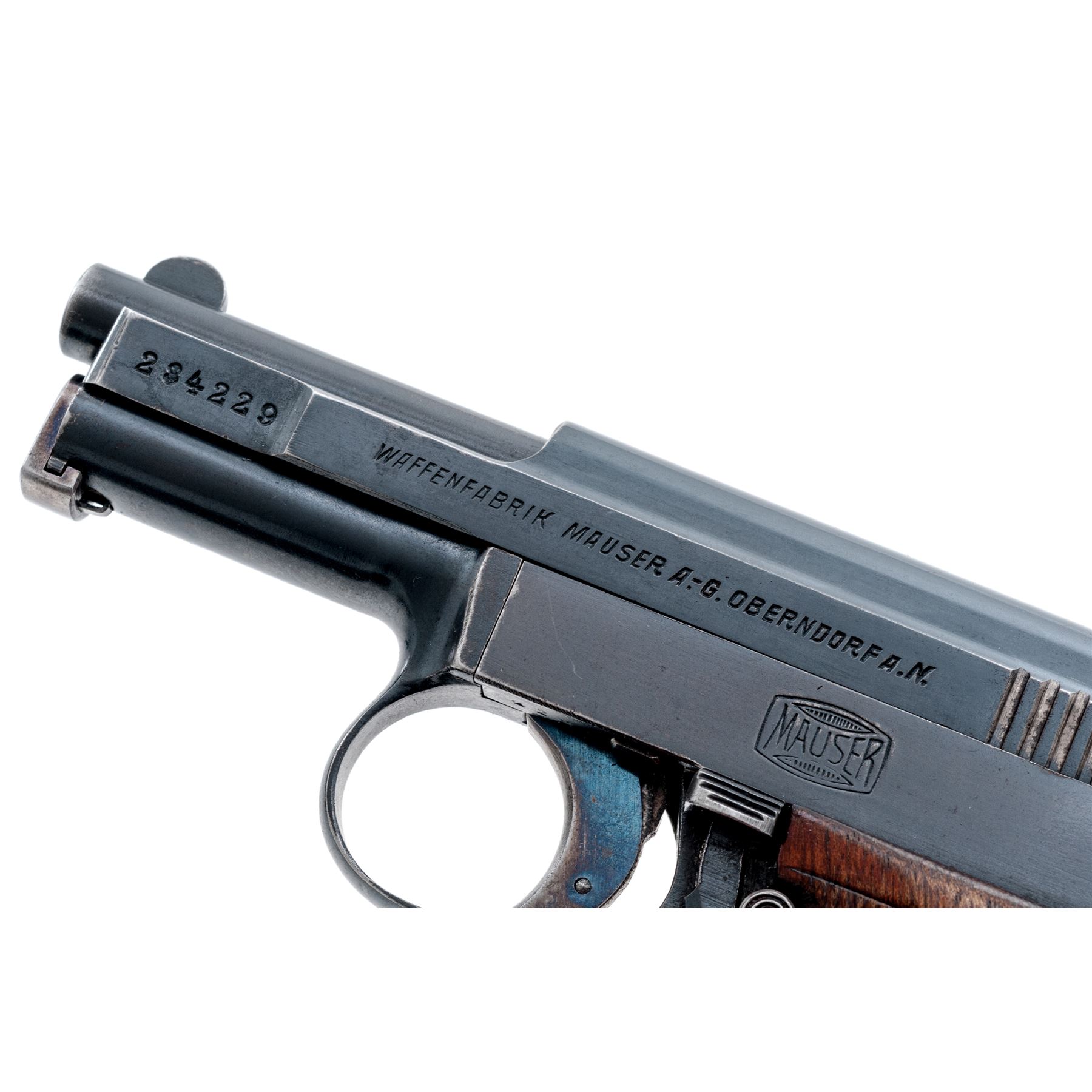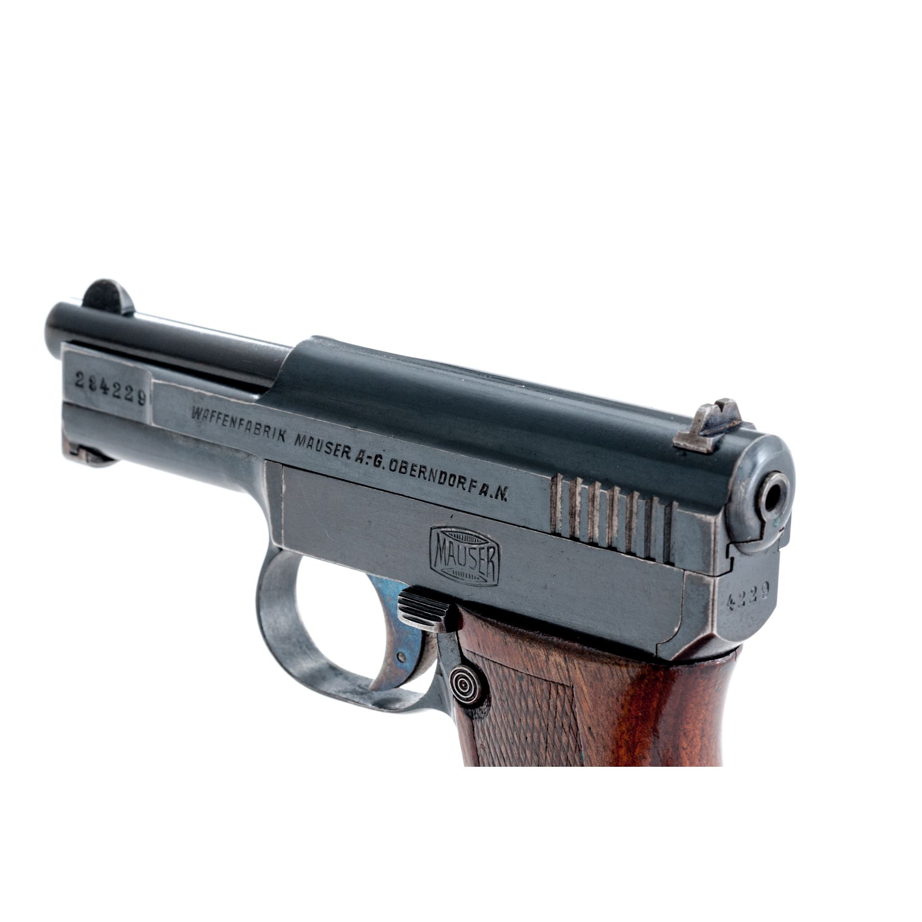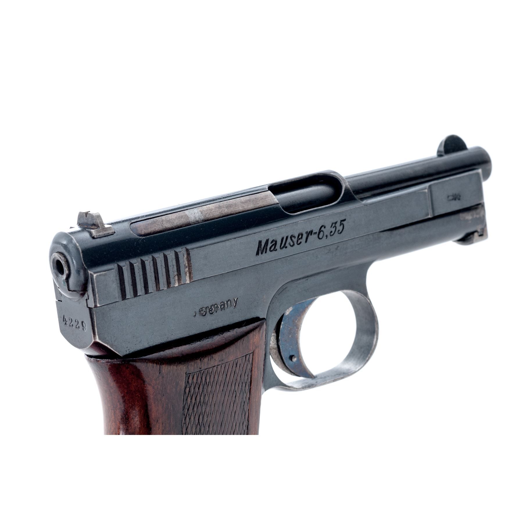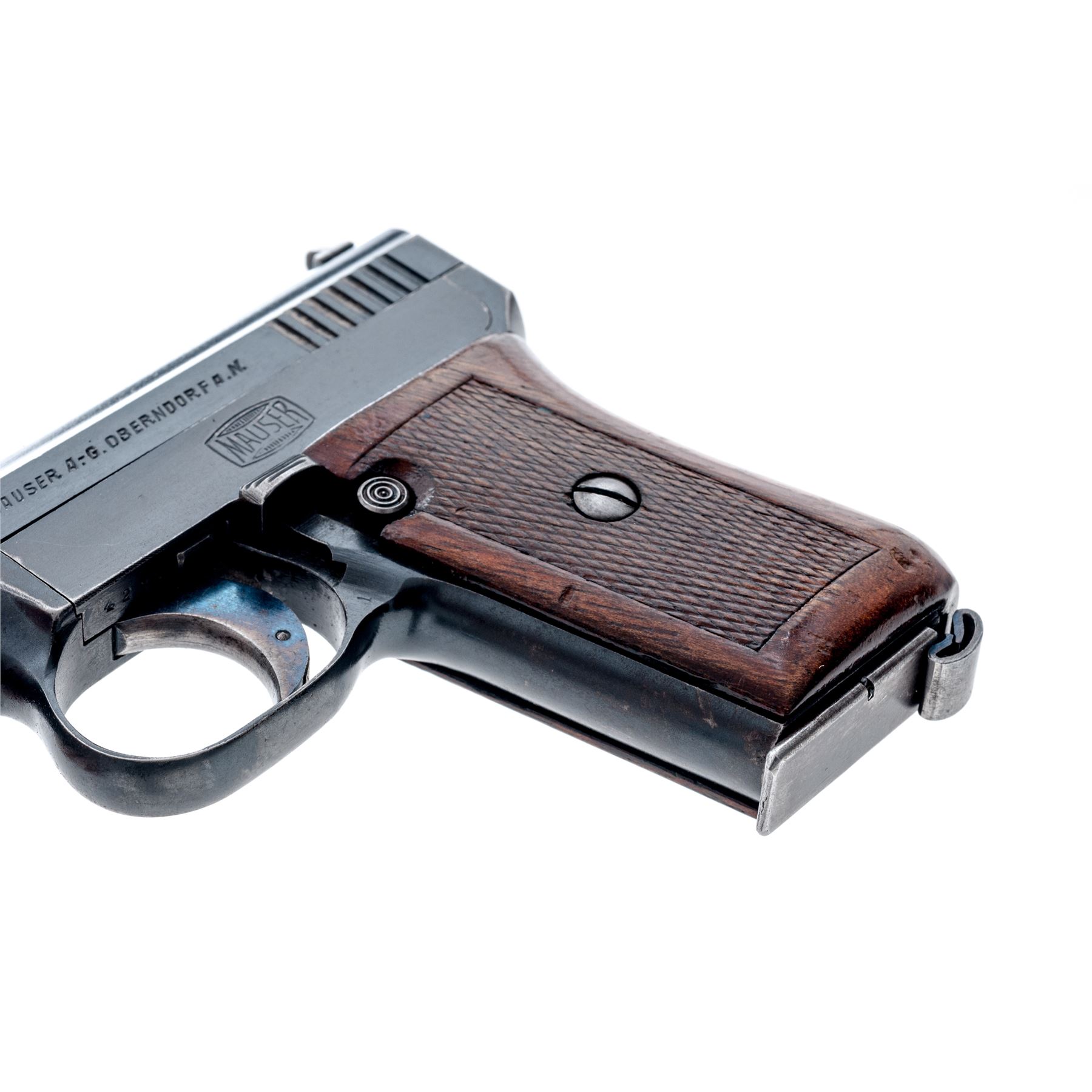 Mauser Model 1914 Semi-Automatic Pistol, #284229, .25 Auto cal., 3'' barrel, blue finish, wraparound pressed checkered walnut grips, with one factory magazine. Condition is fine retaining approx. 92% original blue. Germany stamped through the finish to right side of frame. Grips with mild impressions and some losses to varnish. Good action, very good bore. Est.: $250-$450. (C&R)