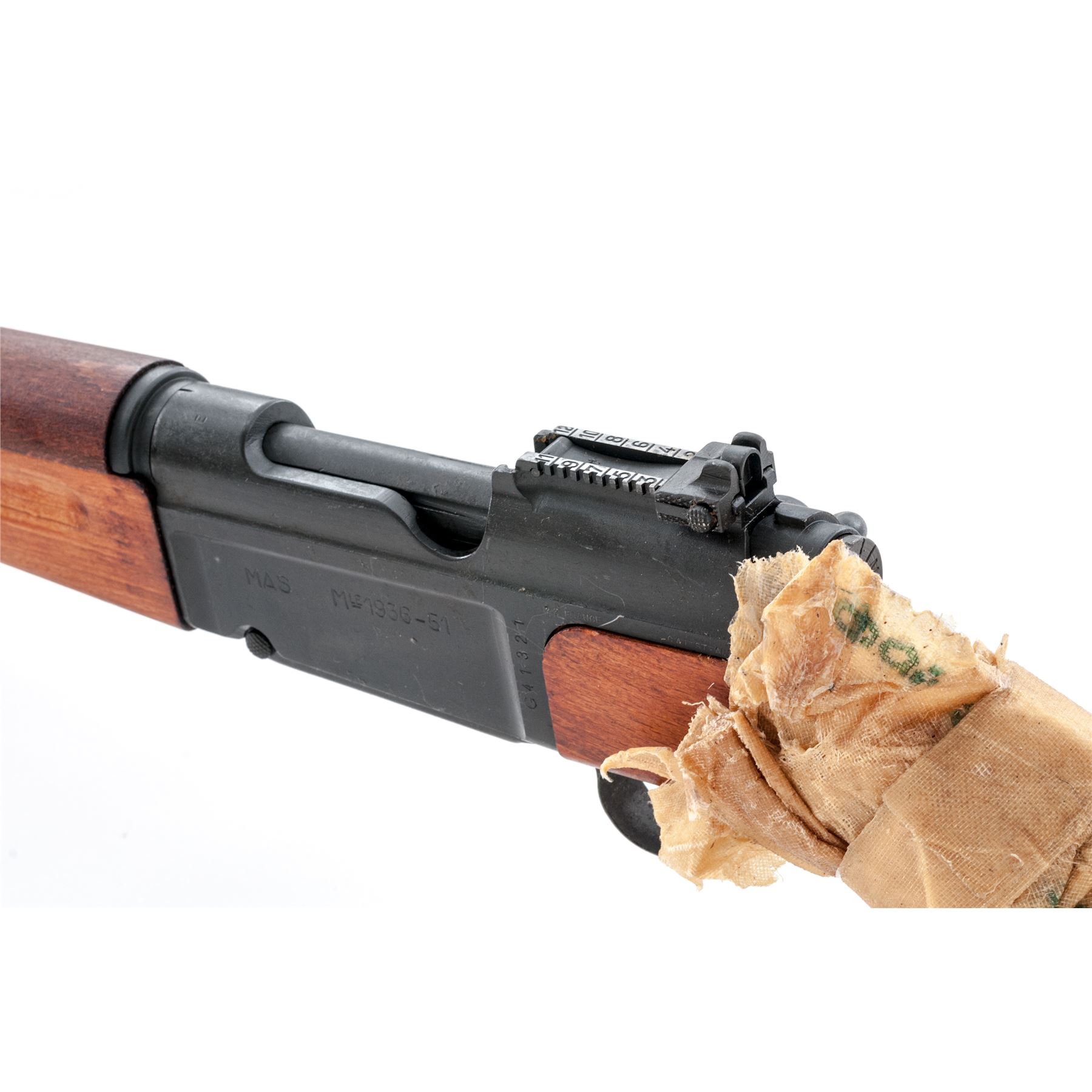 French MAS 36/51 Bolt Action Rifle, with bayonet, #G41321, 7.5x54mm cal., 22.64'' barrel, parkerized finish, hardwood stock, blade front sight with protecting ears and ramp with aperture rear sight. Marked on left side of receiver ''MAS MLE 1936-51''. Matching number on bolt handle; mismatched number on buttstock and forend. Condition overall is excellent/unissued as arsenal refinished. Rear portion of rifle is still in its protective grease wrap. Metal has one scratch to left side. Wood has light scratch and a few light impressions. Muzzle has been counter bored, rifling and bore are excellent, action is smooth. Import stamped on left side of receiver. Est.: $350-$500. (C&R)