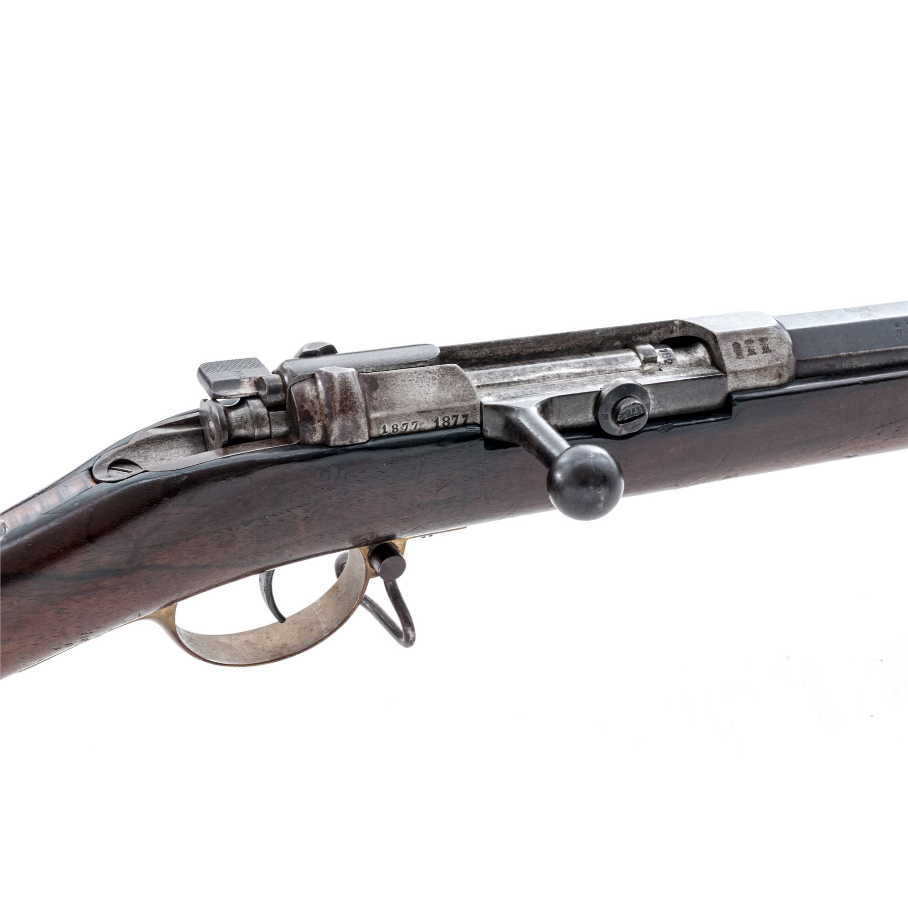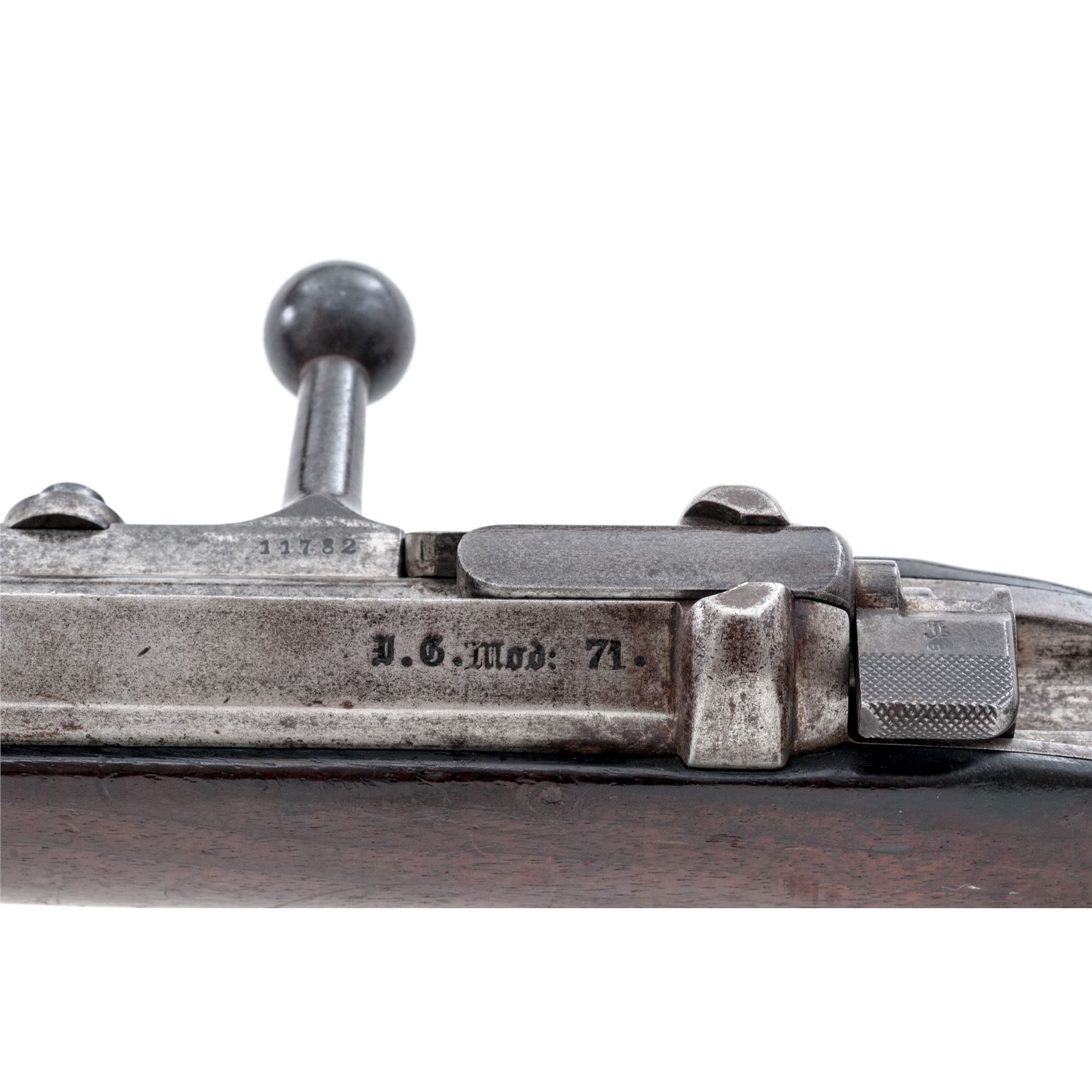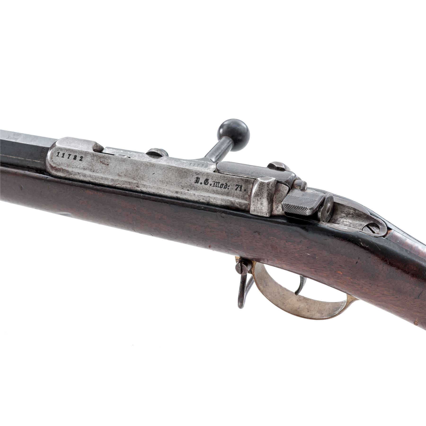 German Model 1871 Gewehr Bolt Action Rifle, #11782, 10.95mm cal., 33.66'' barrel, blued/bright finish, hardwood stock, inverted ''V'' front sight and notched rear sight (missing rear sight leaf). Marked on left side of receiver ''I.G.Mod:71.'', and on right side ''1877'' and again ''1877''.''(Crown)Amberg'' marked on chamber flat. Buttplate tang is regimentally marked ''B2R 7226''. Stock has crowned inspection stamps on right side of butt and underside of wrist. Matching numbers. Missing cleaning rod and rear triggerguard screw. Stock tang has spliced wood repair. Condition overall is very good with approx. 70% finish remaining on the metal, with browning to the receiver and patina on the buttplate. Wood is very good with darkening and overall gouges and scratches to the finish. Action is smooth, bright bore is very good with very good rifling. No visible import stamps. Est.: $250-$450. (Antique)