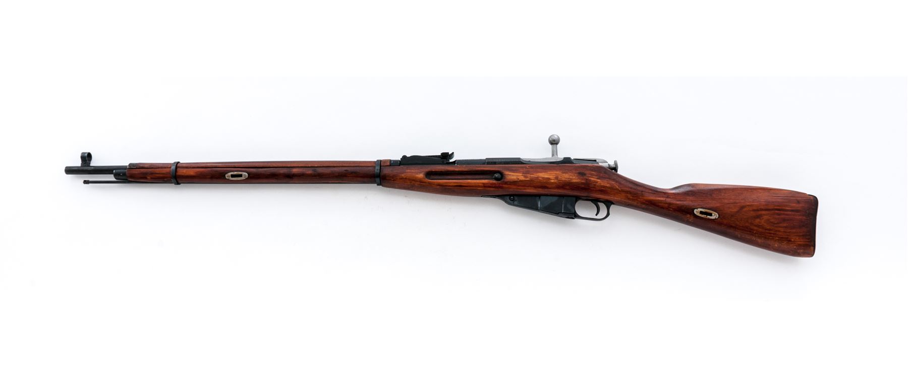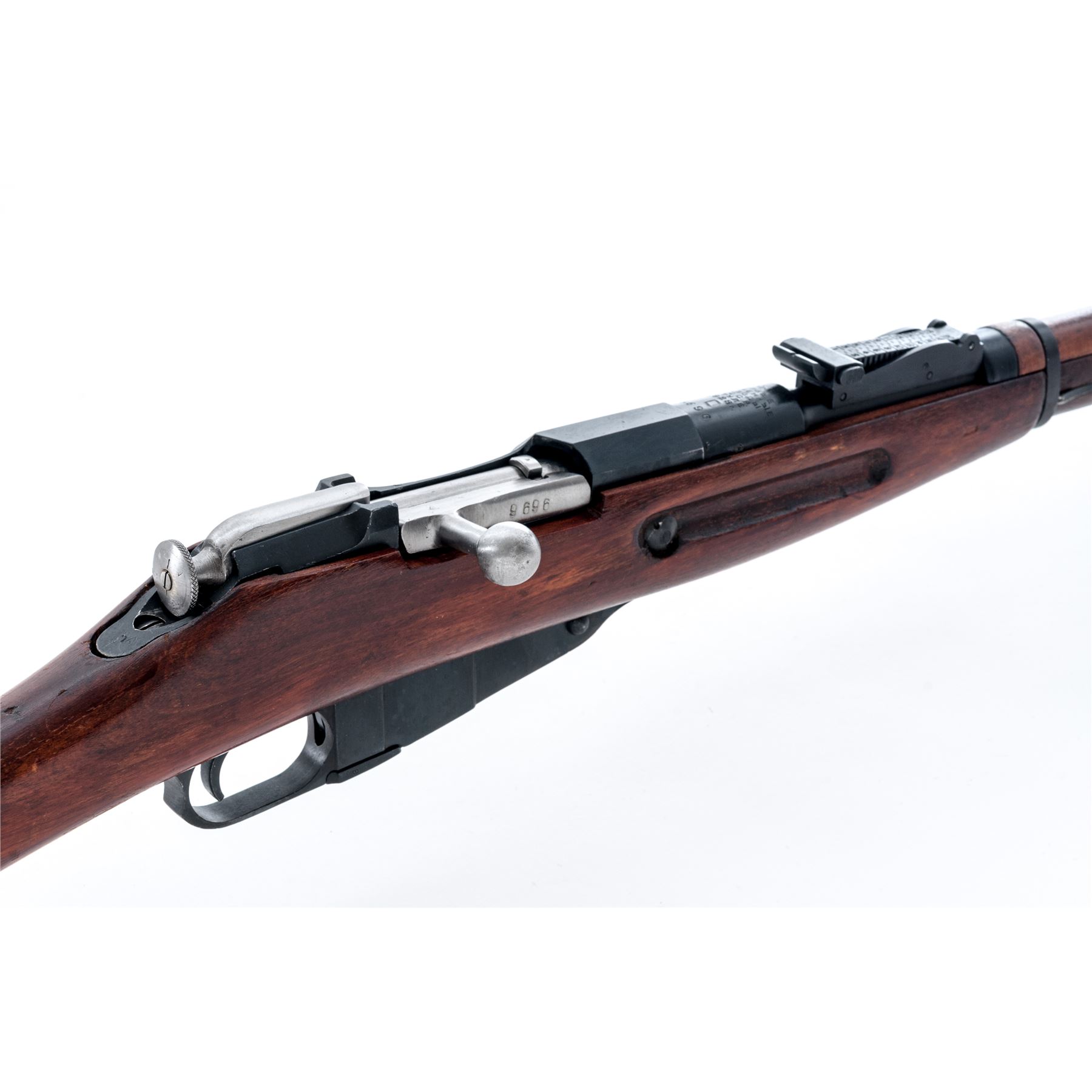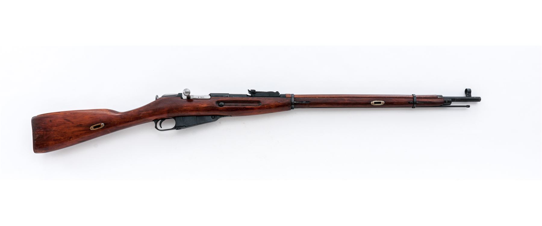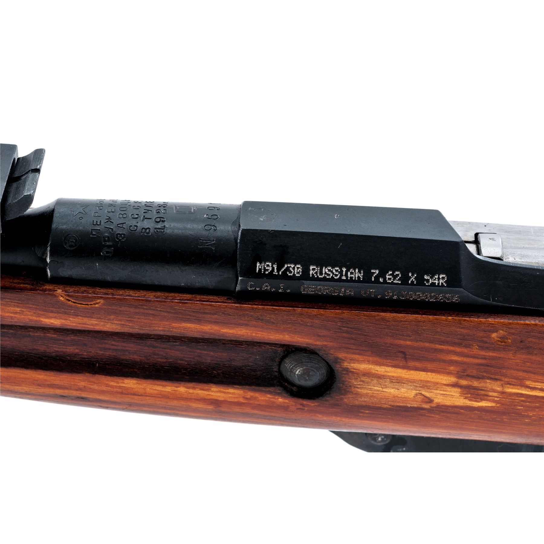Soviet 91/30 (Ex-Dragoon) Mosin-Nagant Bolt Action Rifle, #9130002656, 7.62x54R cal., 28.7'' barrel, blued finish, hardwood stock, hooded post front sight and adjustable tangent rear sight. Marked on barrel shank with five-pointed star over three line Cyrillic script over ''C.C.C.P./BTYNE/1928r''. Wreathed hammer and sickle stamp on flat of hexagonal receiver. Matching original numbers. Includes cleaning rod. Condition overall is very good with metal surfaces retaining approx. 98% finish. There is an old hairline crack at the tip of the forend, otherwise wood is very good with some light sanding and flaking to the shellac finish. Action is smooth, bright bore is about excellent. Large import markings on left side of receiver. Est.: $300-$450. (C&R)