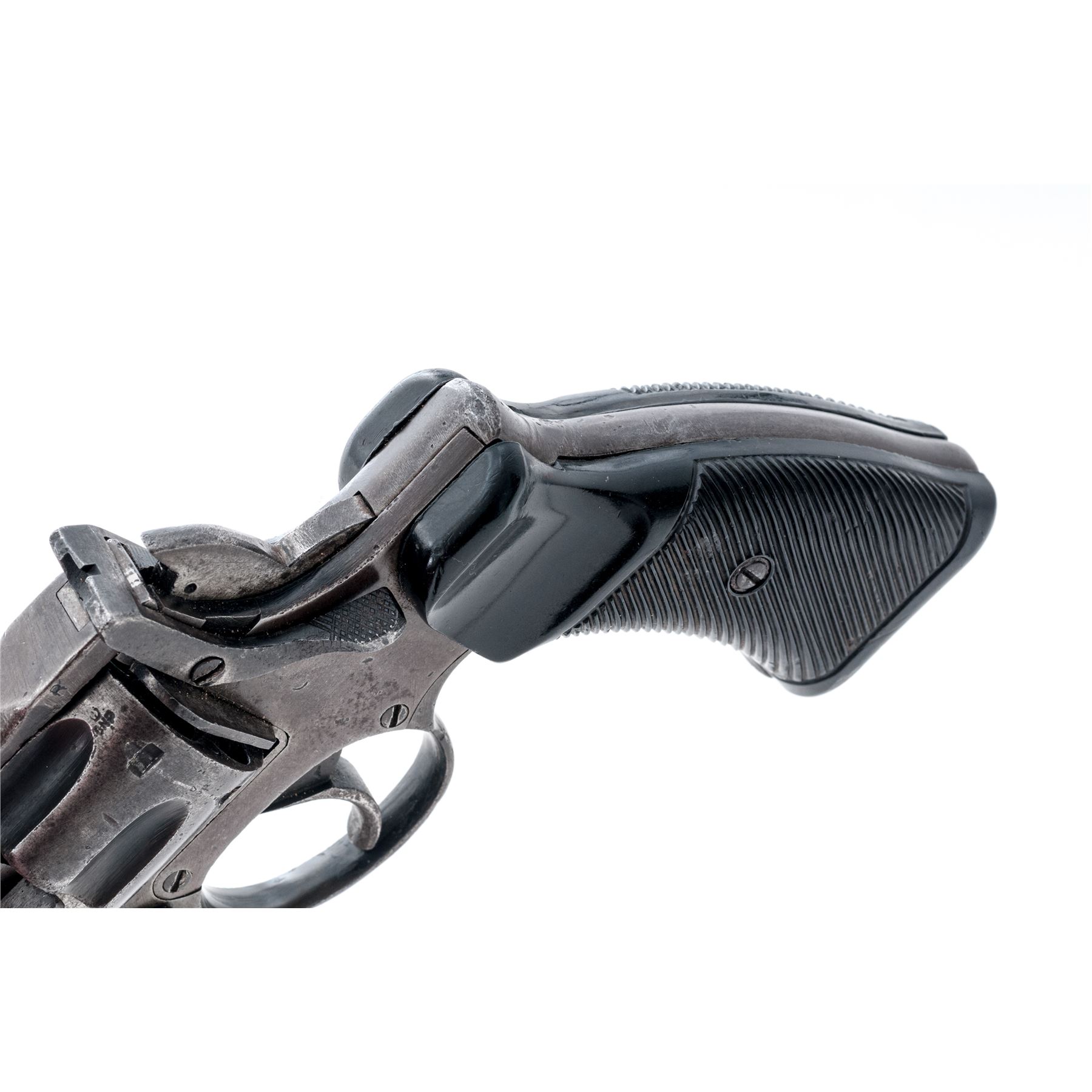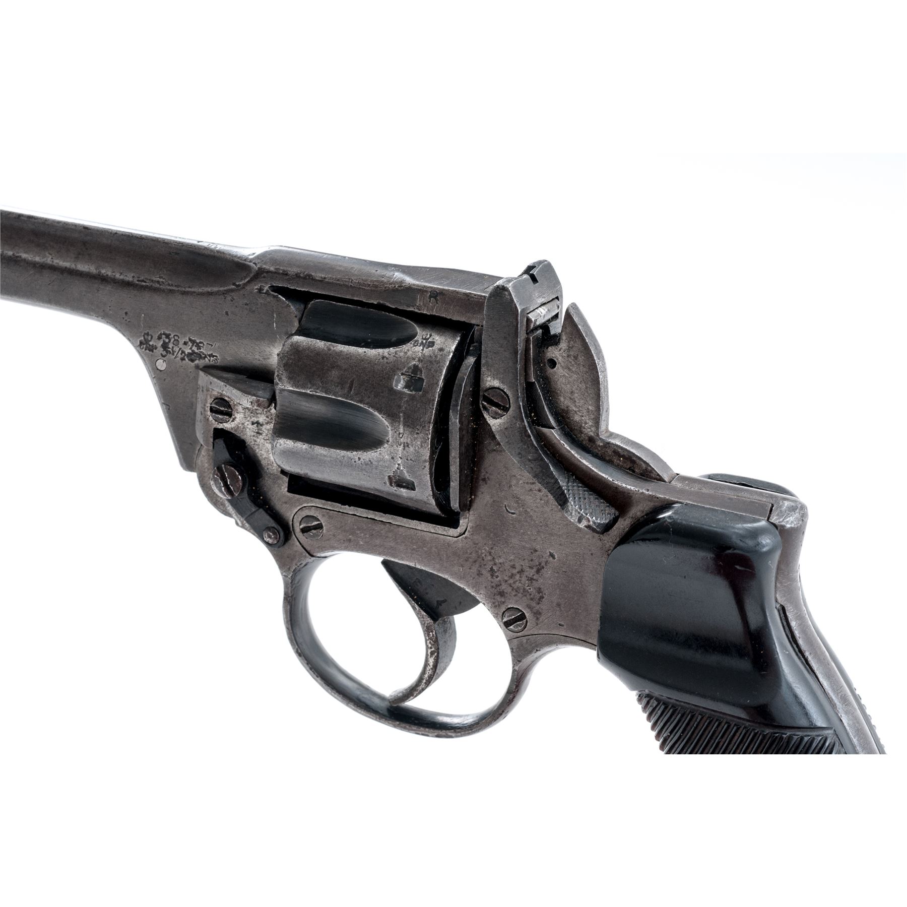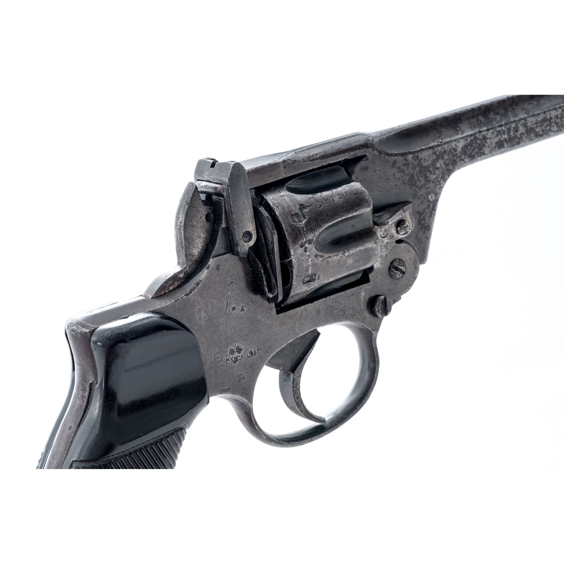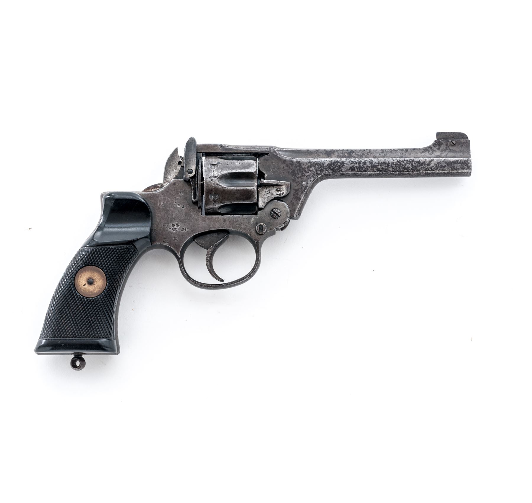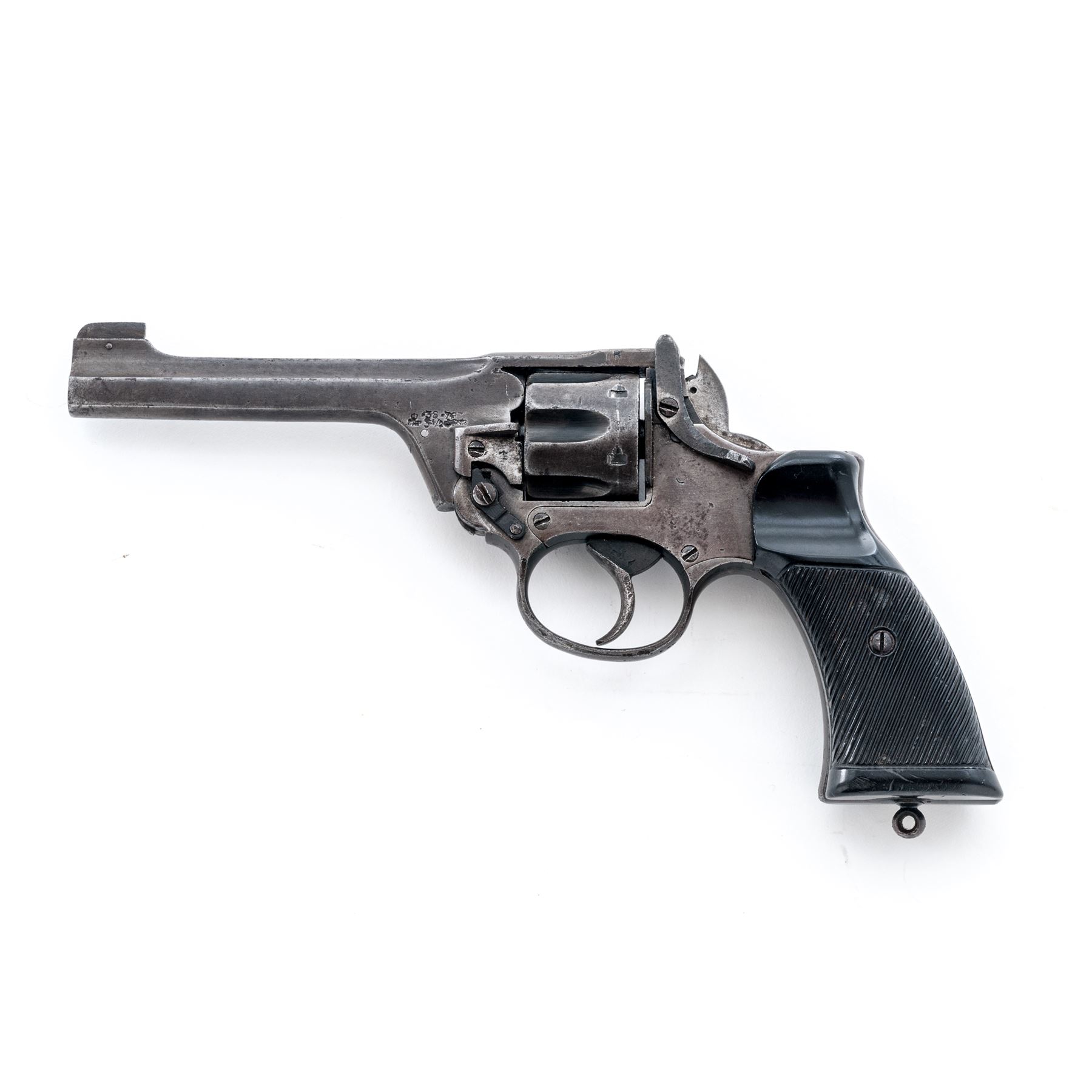British No. 2 Mk 1**Enfield Double Action Revolver, #ZH1696, .38 S&W cal., 5'' barrel, bright finish, plastic grips, blade front sight and fixed notch rear sight. Marked on right side of frame with Enfield ''D 1'' and (obliterated ''**''), below a faint ''FTR/(obliterated #)4''. Top of barrel stamped ''54''. Matching numbers, faint inventory number engraved on frame. Condition overall is fair with virtually none of the finish remaining on the metal and patina and pitting across the surface. Left grip has a section missing at the butt, otherwise both are very good with light chips and flattening. Action is smooth; bore is poor with pitting, chambers are dark with pitting. No visible import stamps. Est.: $250-$400. (C&R/PPT)