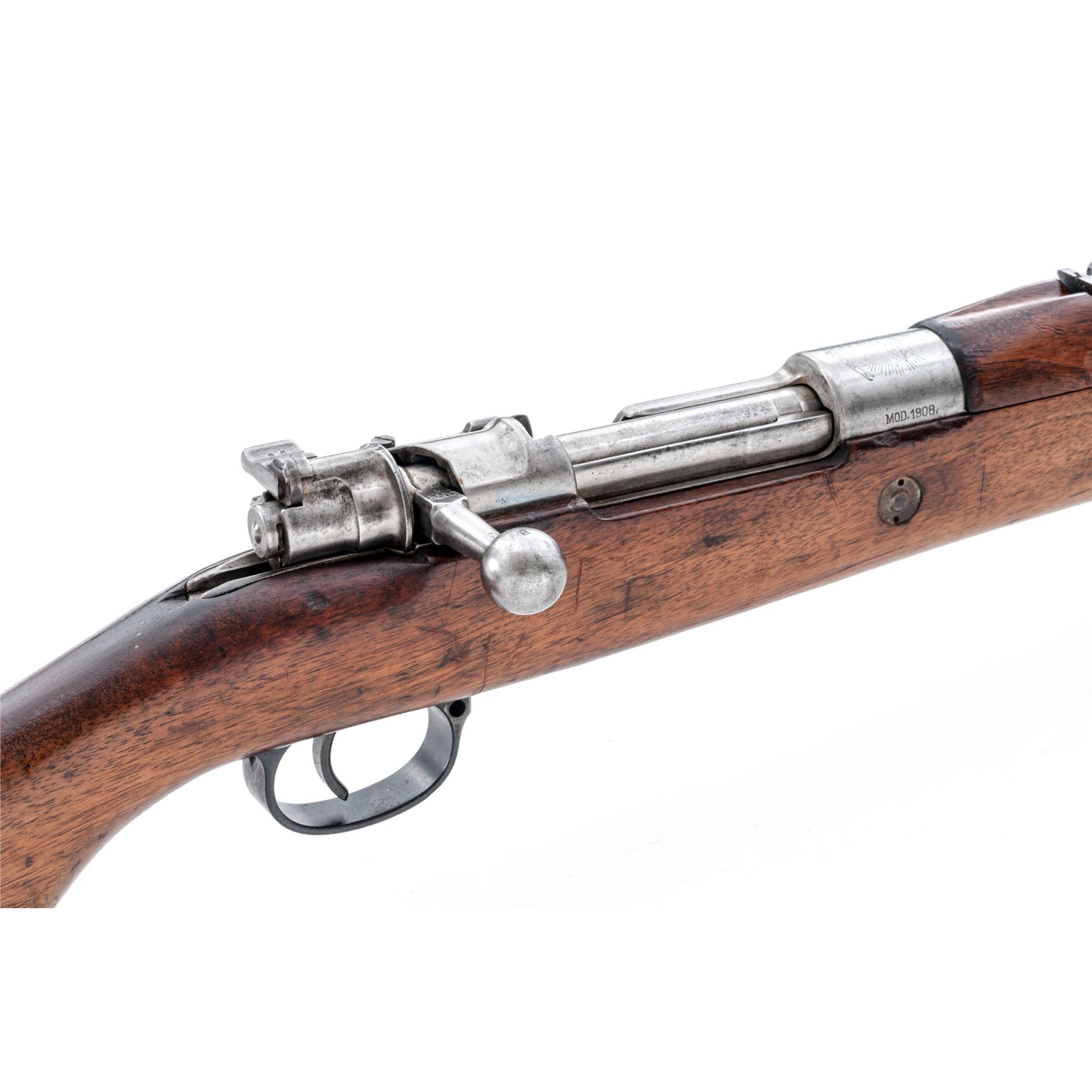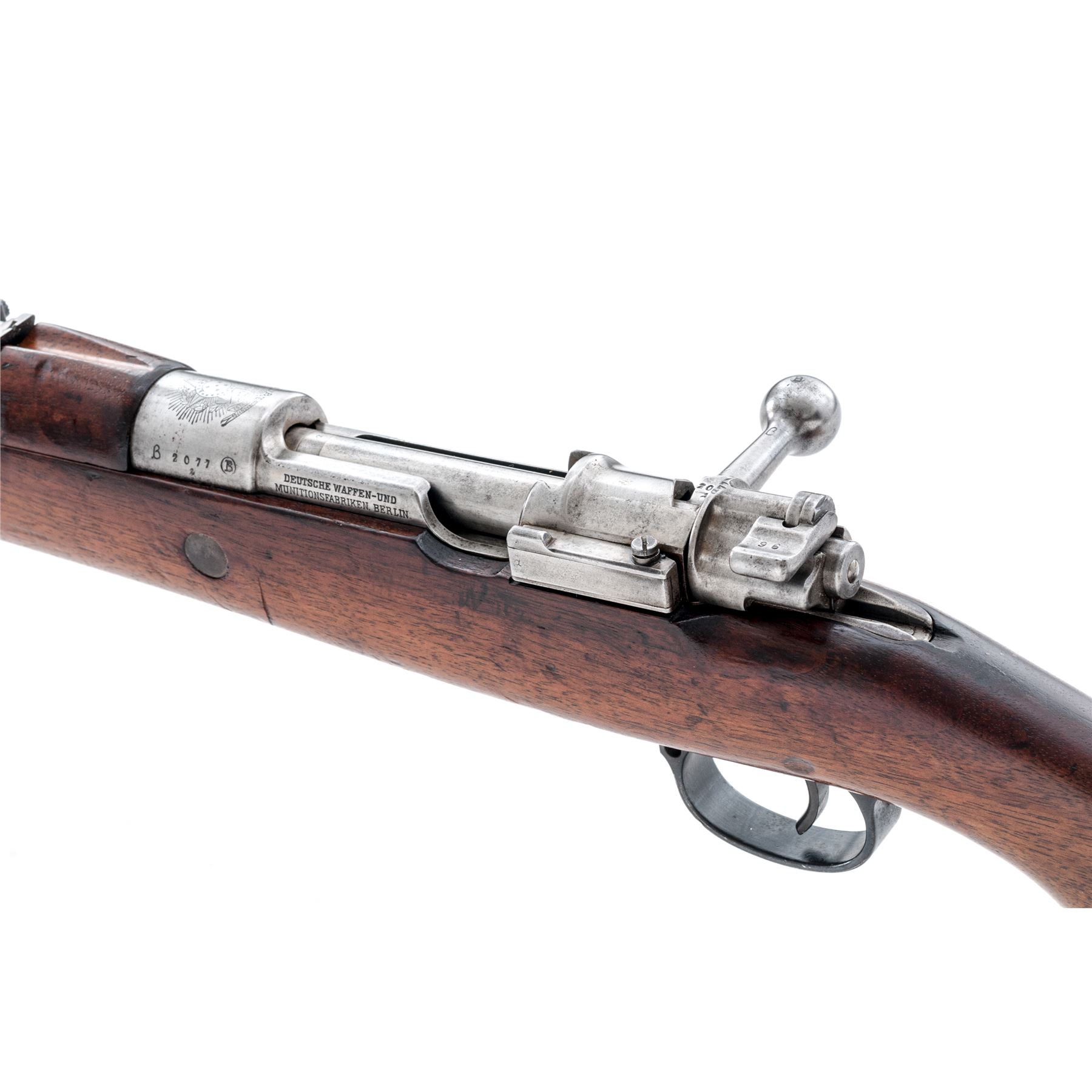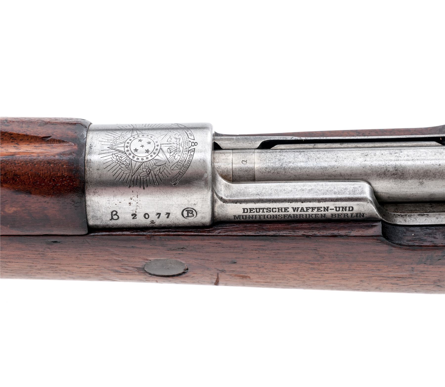 Brazilian Model 1908 Mauser Bolt Action Rifle, #B2077t, 7x57mm cal, 29.3'' barrel, blued/bright finish, hardwood stock, inverted ''V'' front sight and adjustable tangent rear sight. Marked on top of receiver ring with Brazilian crest, and on right side ''MOD.1908''.'' DEUTSCHE WAFFEN-UND MUNITIONSFABRIKEN.BERLIN'' marked on left receiver rail. Six-pointed star cartouche on right side of buttstock. Matching numbers except safety lever. Missing cleaning rod. Condition overall is good with approx. 70% finish remaining on the metal, with the cleaned receiver bright and light rust and patina on the barrel. Buttplate has old rust and patina. Stock has a glue repaired area at the tang and dark dry rotting from moisture. Wood has added varnish over old and new gouges and handling marks. Action is smooth, bore is very good. Import stamped on underside of barrel. Est.: $250-$350. (C&R)