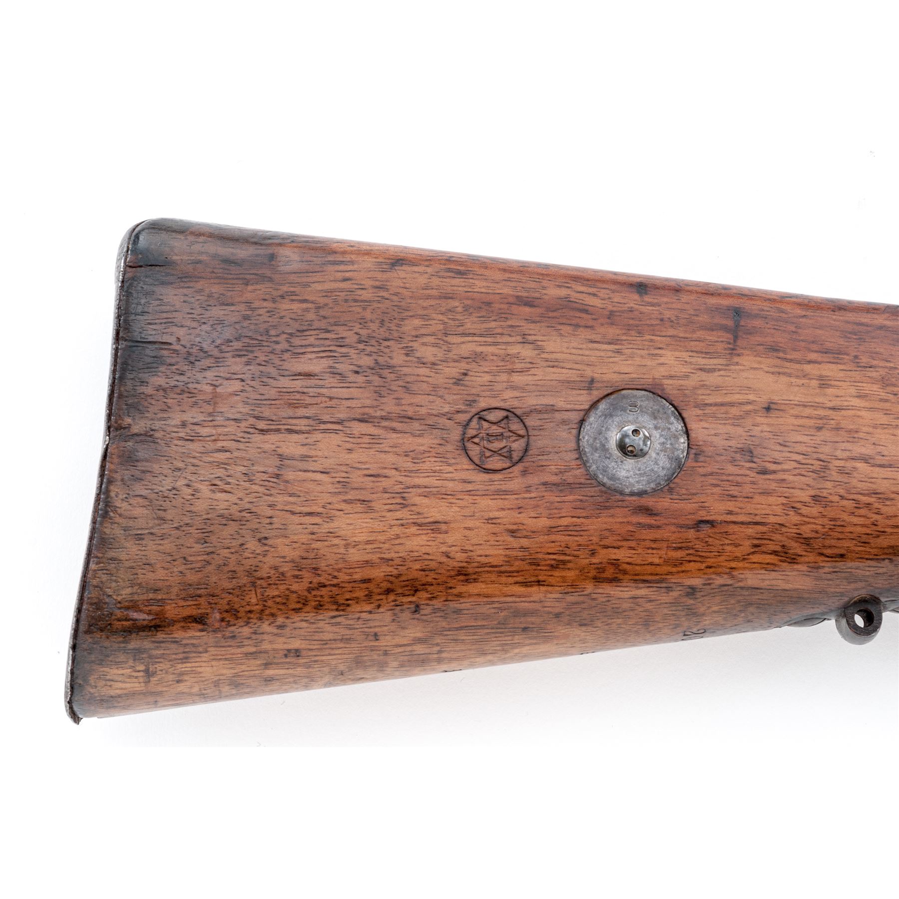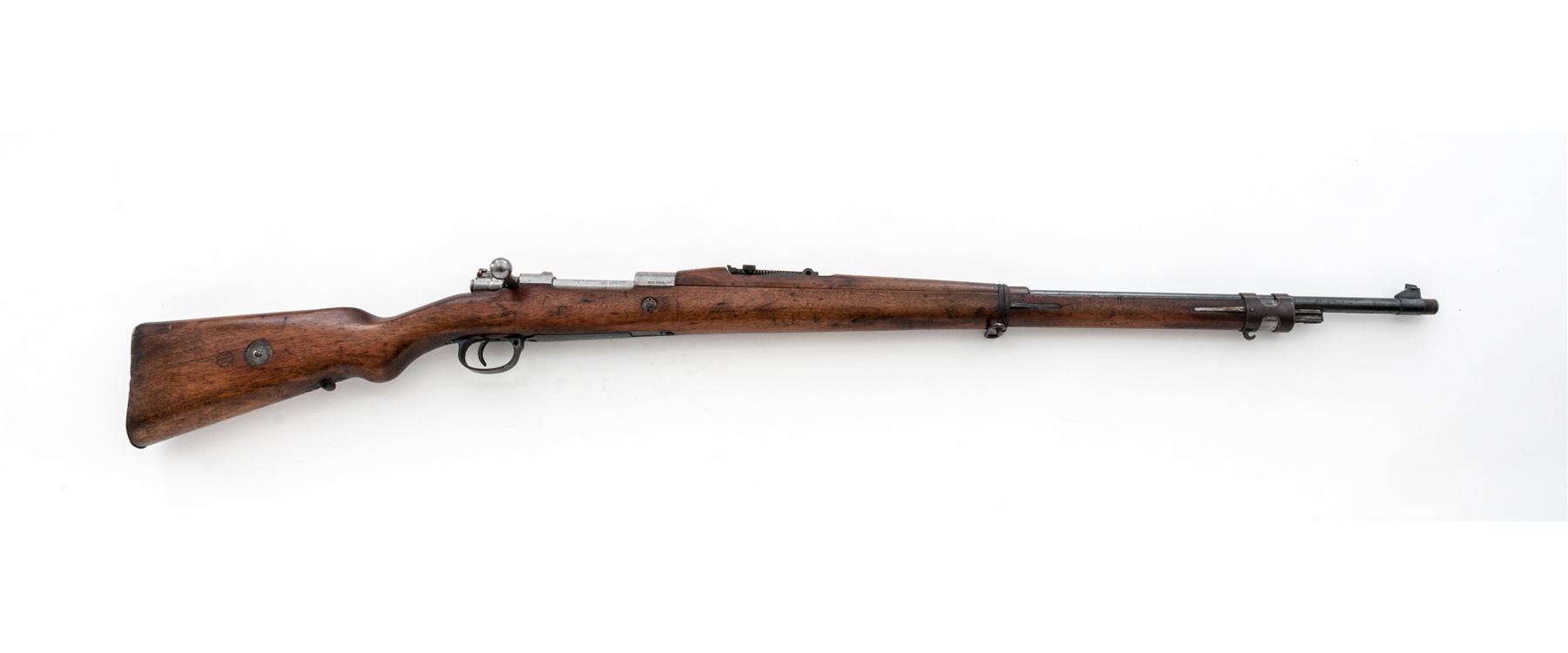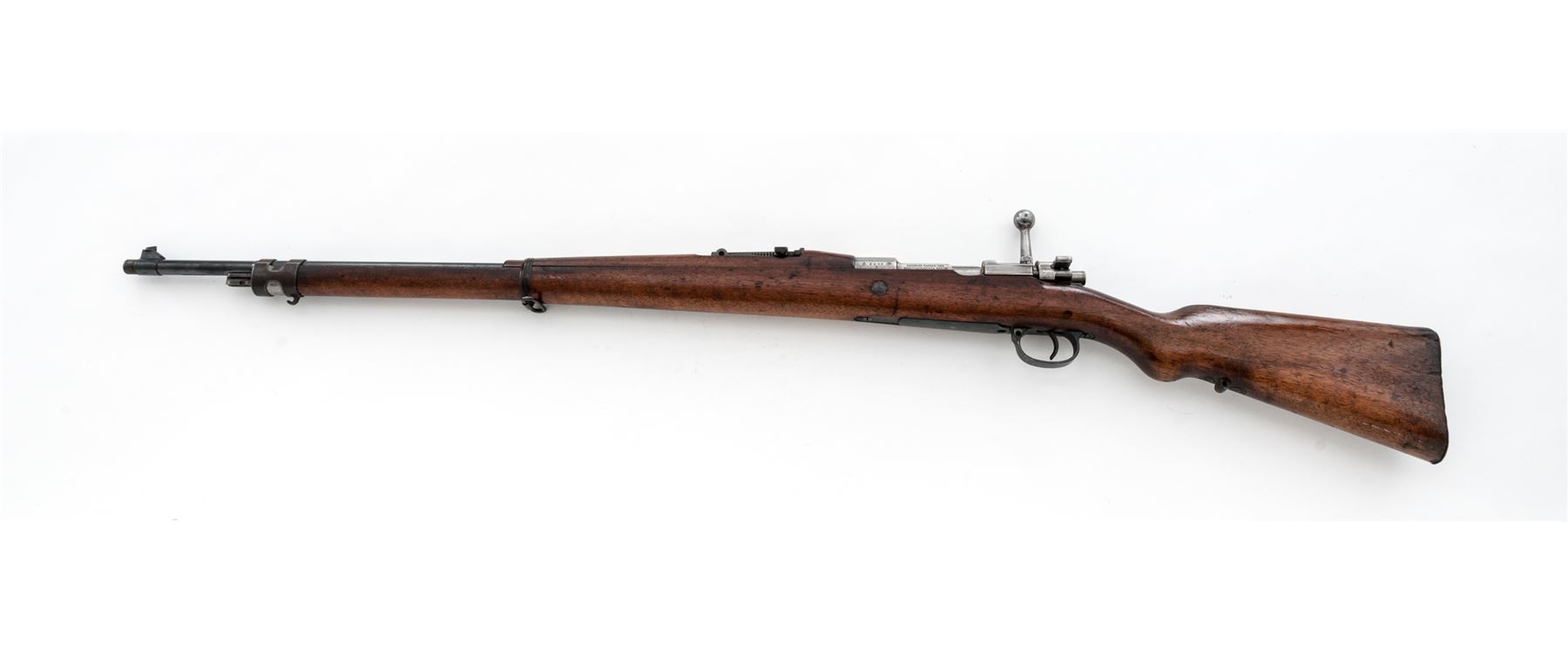 Brazilian Model 1908 Mauser Bolt Action Rifle, #B2077t, 7x57mm cal, 29.3'' barrel, blued/bright finish, hardwood stock, inverted ''V'' front sight and adjustable tangent rear sight. Marked on top of receiver ring with Brazilian crest, and on right side ''MOD.1908''.'' DEUTSCHE WAFFEN-UND MUNITIONSFABRIKEN.BERLIN'' marked on left receiver rail. Six-pointed star cartouche on right side of buttstock. Matching numbers except safety lever. Missing cleaning rod. Condition overall is good with approx. 70% finish remaining on the metal, with the cleaned receiver bright and light rust and patina on the barrel. Buttplate has old rust and patina. Stock has a glue repaired area at the tang and dark dry rotting from moisture. Wood has added varnish over old and new gouges and handling marks. Action is smooth, bore is very good. Import stamped on underside of barrel. Est.: $250-$350. (C&R)