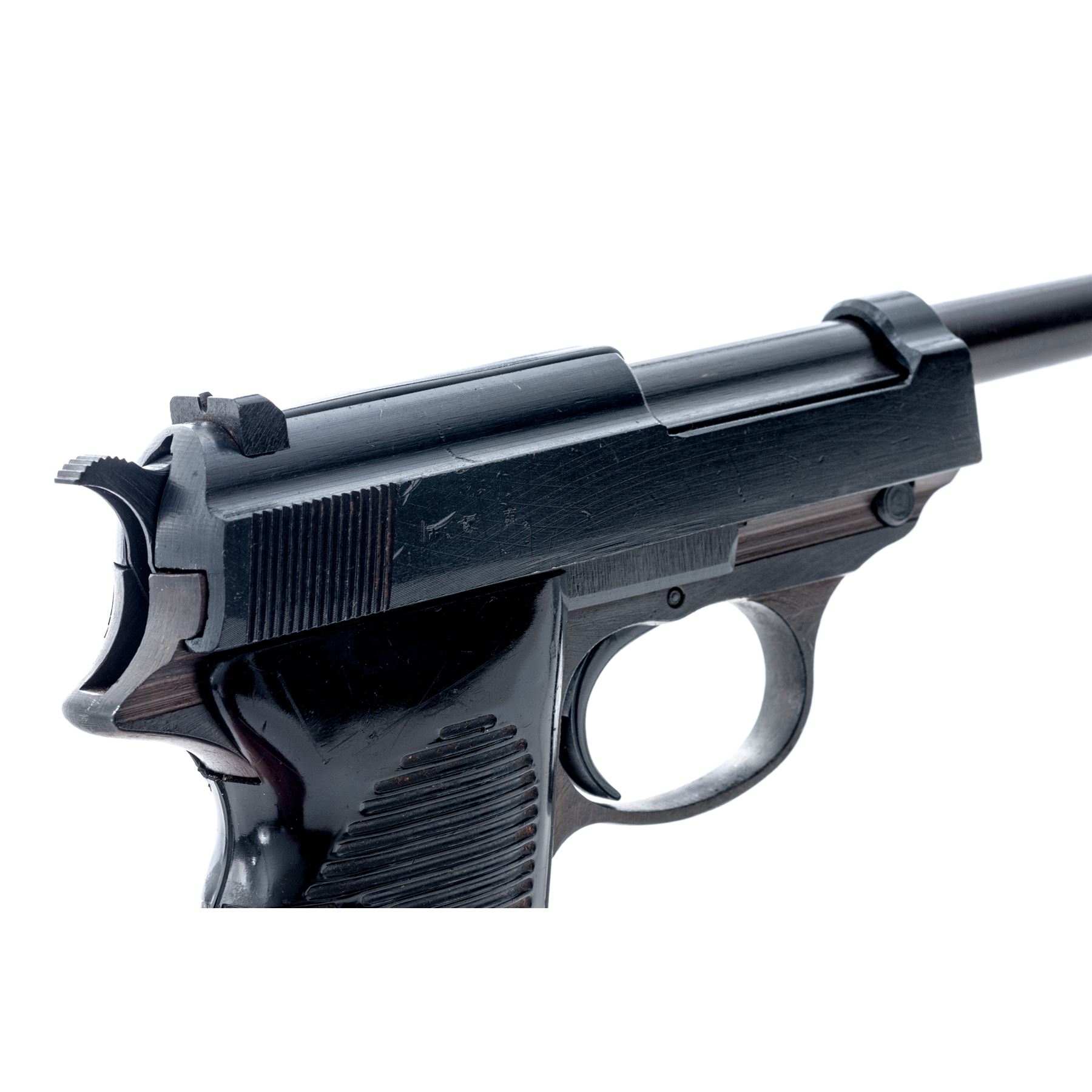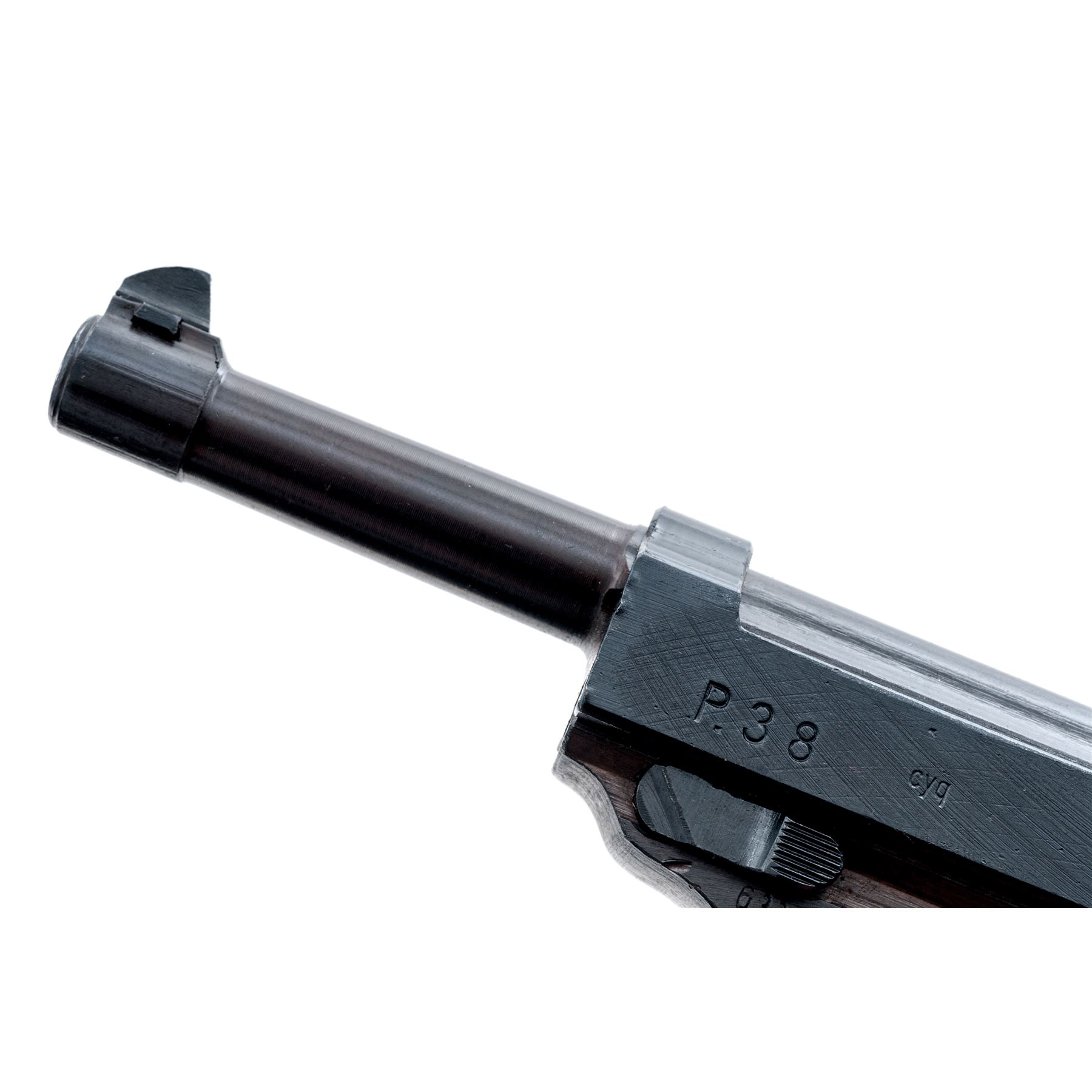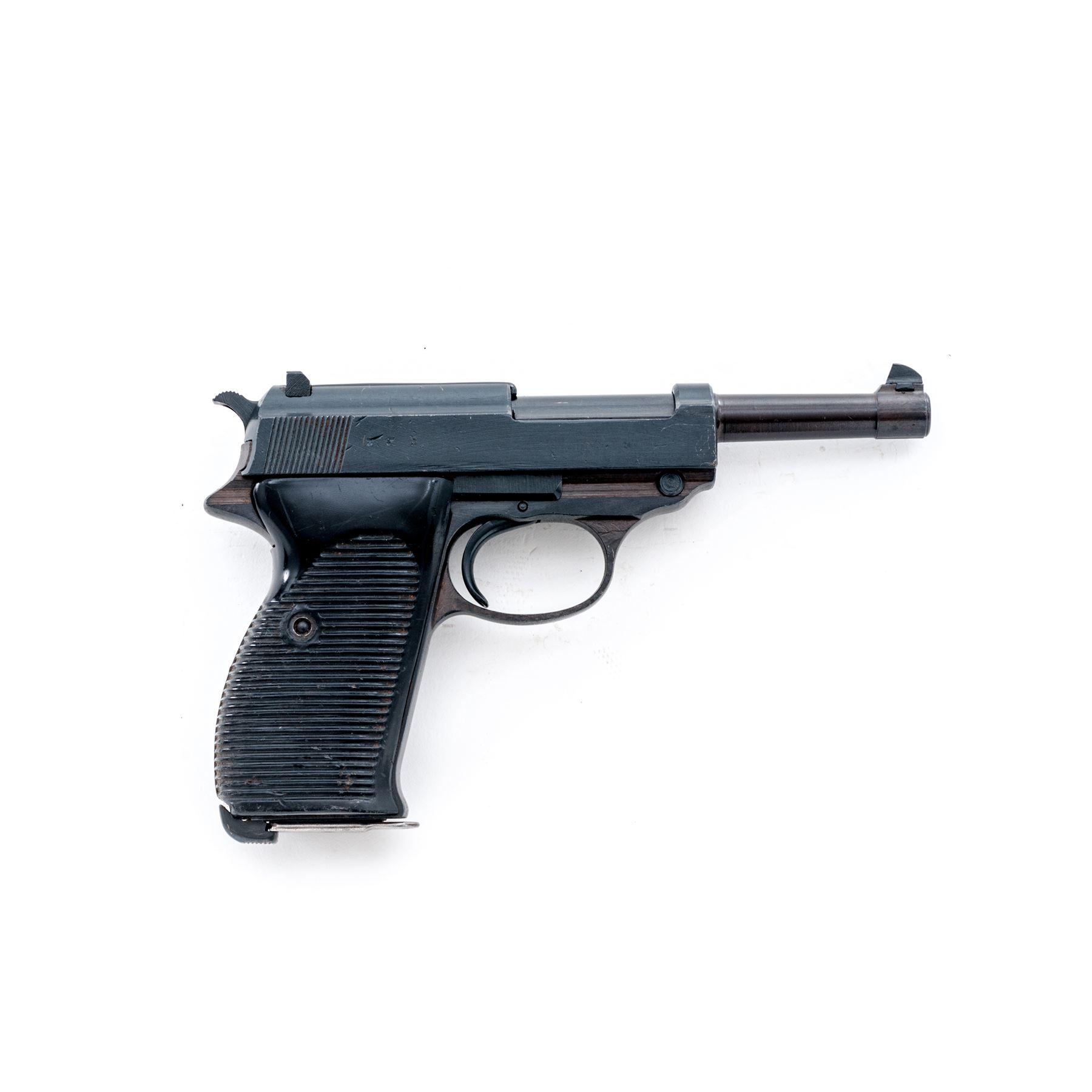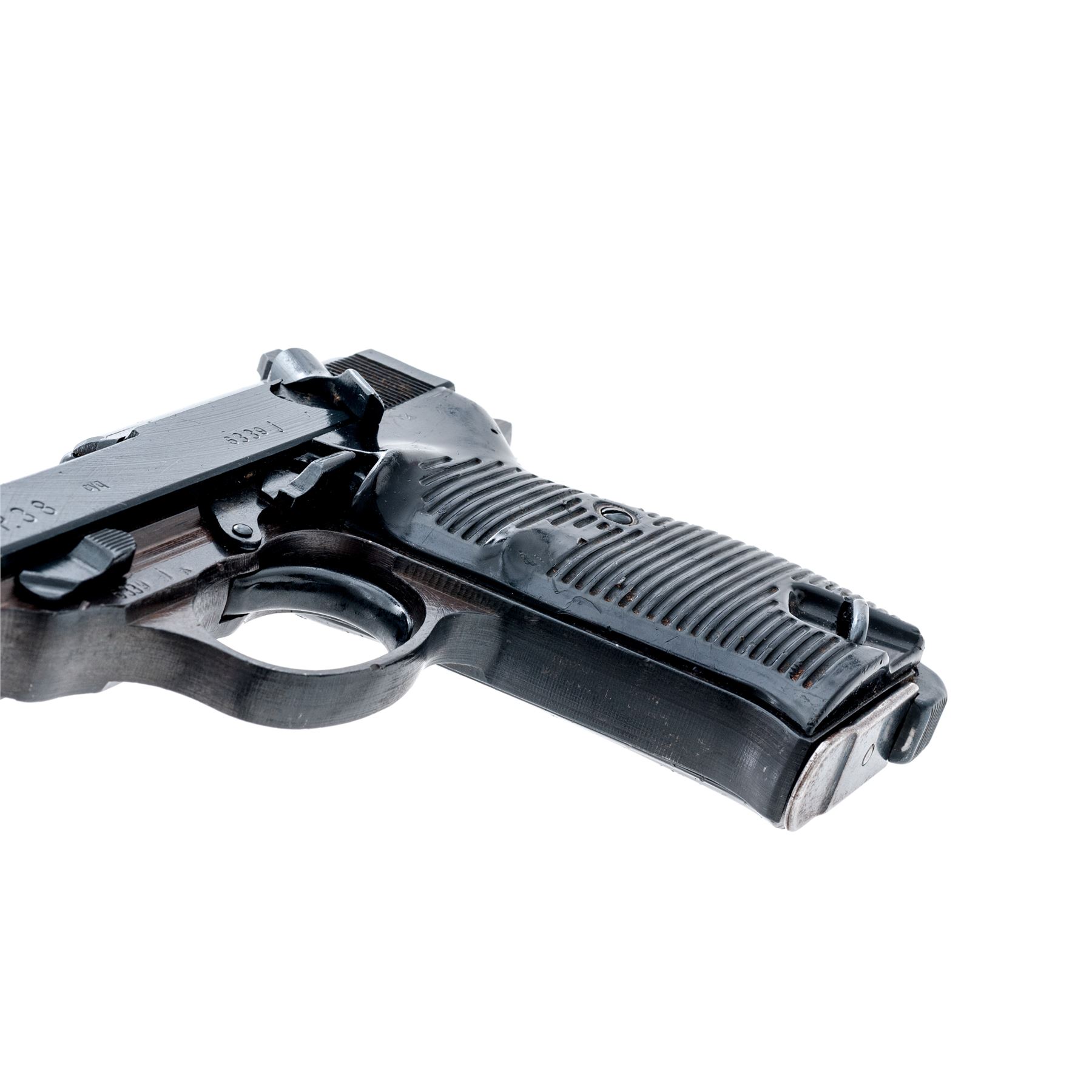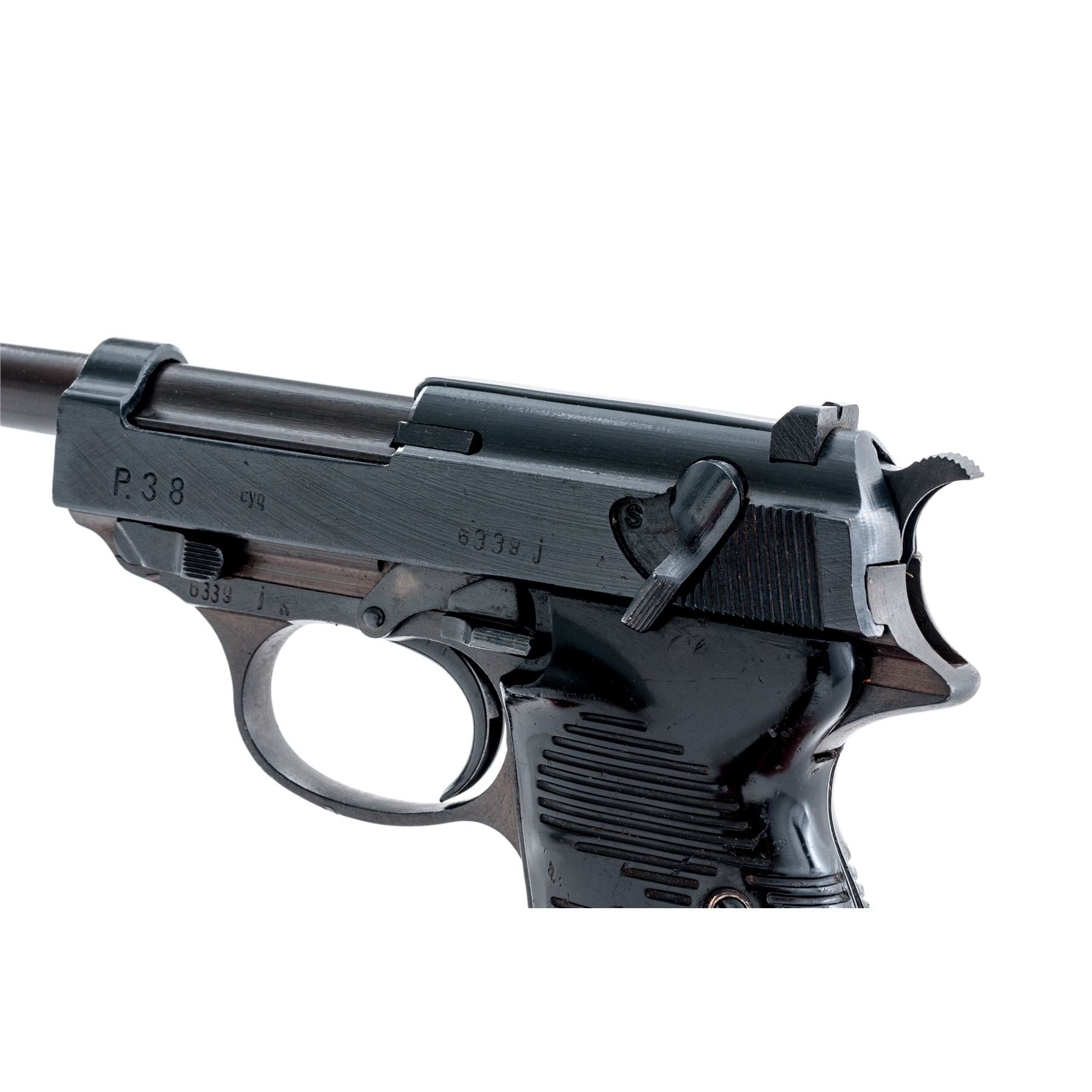 WWII Spreewerk P.38 Semi-Automatic Pistol, (CYQ), #6339j, 9mm, 4-7/8'' barrel, blue finish, black phenolic resin grips, with one non-matching numbered magazine. All visible matching numbers on gun, including lock block. ''P.38'', cyq, and serial number on left side of slide; firing proofs and eagle 88 proofmark on right side of slide; serial number and ''(eagle)88'' on left side of frame, and faint import stamped mark on front gripstrap. Magazine is marked with two ''(eagle)359'' proofs at bottom back spine, and ''P.39/1076'' on left side. Condition is excellent retaining approx. 97%-98% of its reblued finish. Metal surfaces show typical late-war rough machining marks, slide being a dark blue/black finish, along with the small parts. Slide shows a few nicks and dings that appear to be blued over; frame shows a two-toned blued and plum-colored finish. Grip panels show age and use with numerous scratches and dings. Magazine finish is approx. 60% with some light rust spots. Bore has moderate pitting with strong lands. Est.: $500-$750. (C&R/PPT)