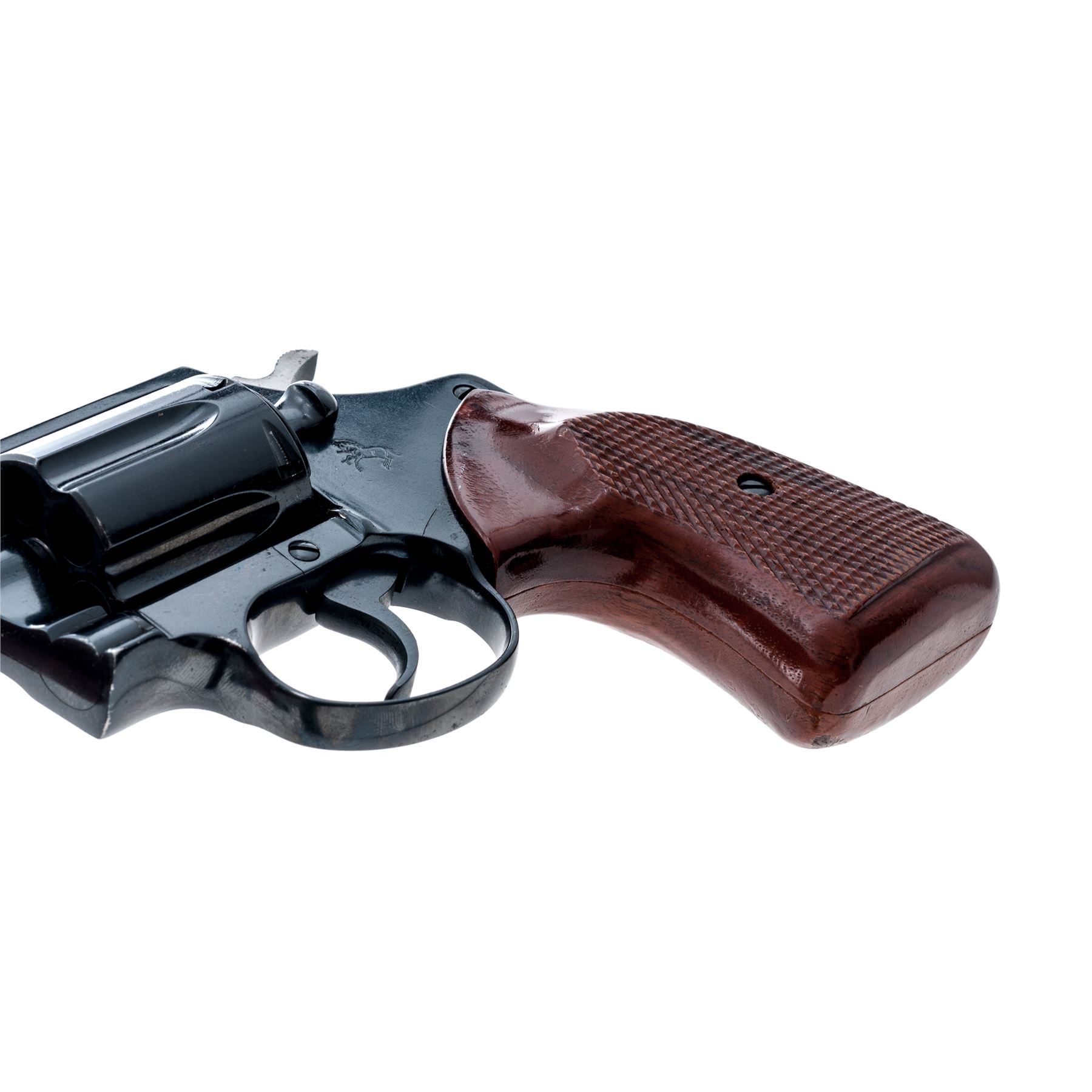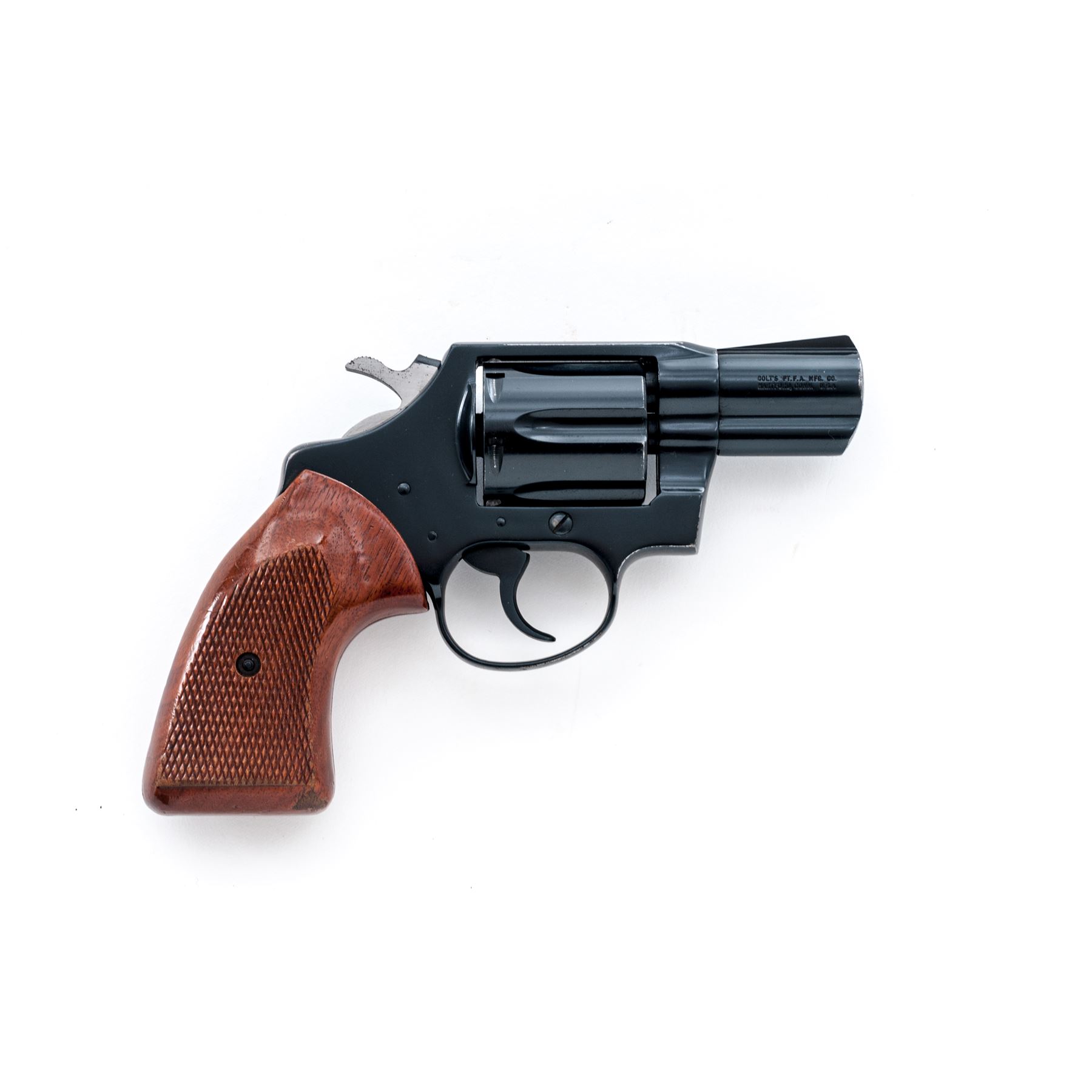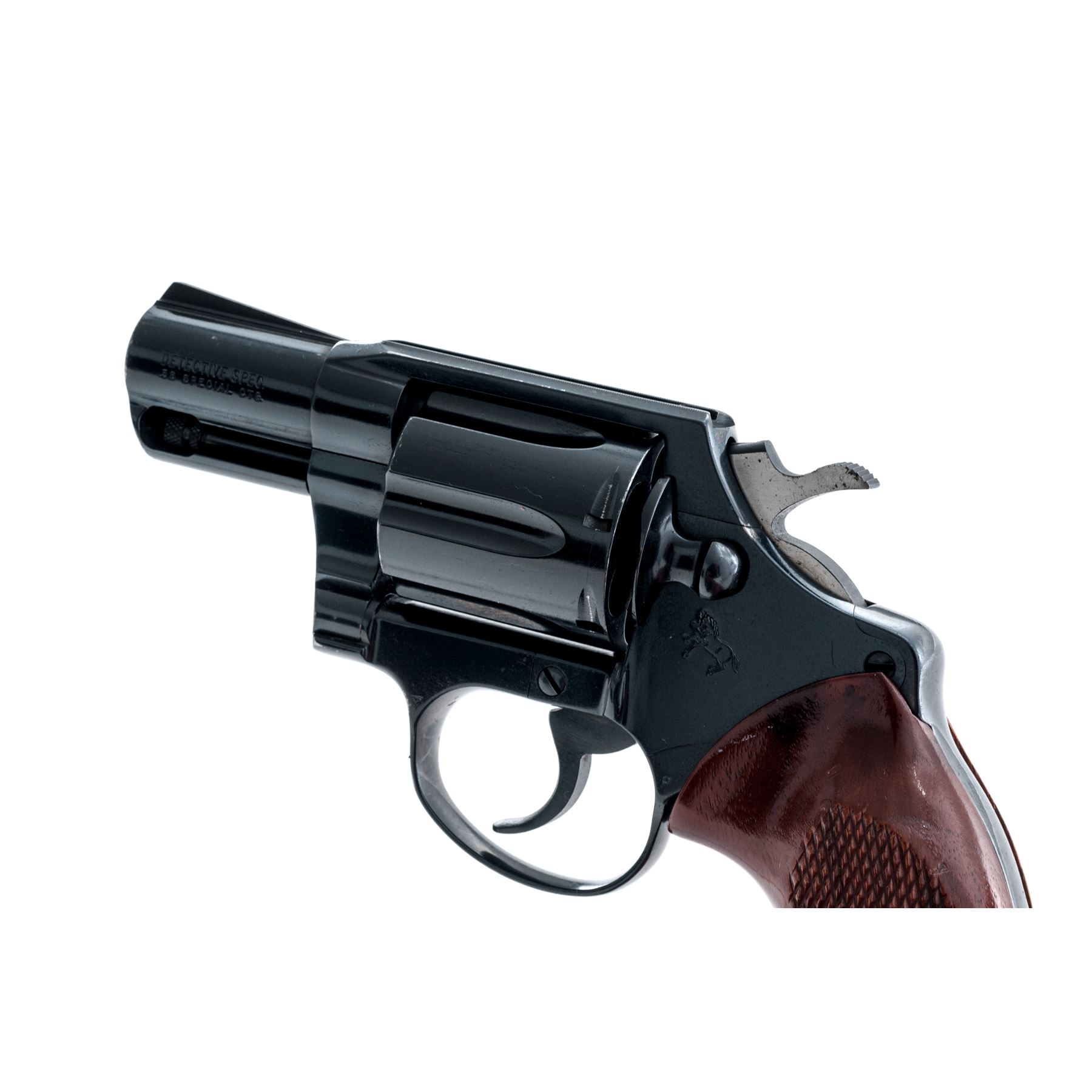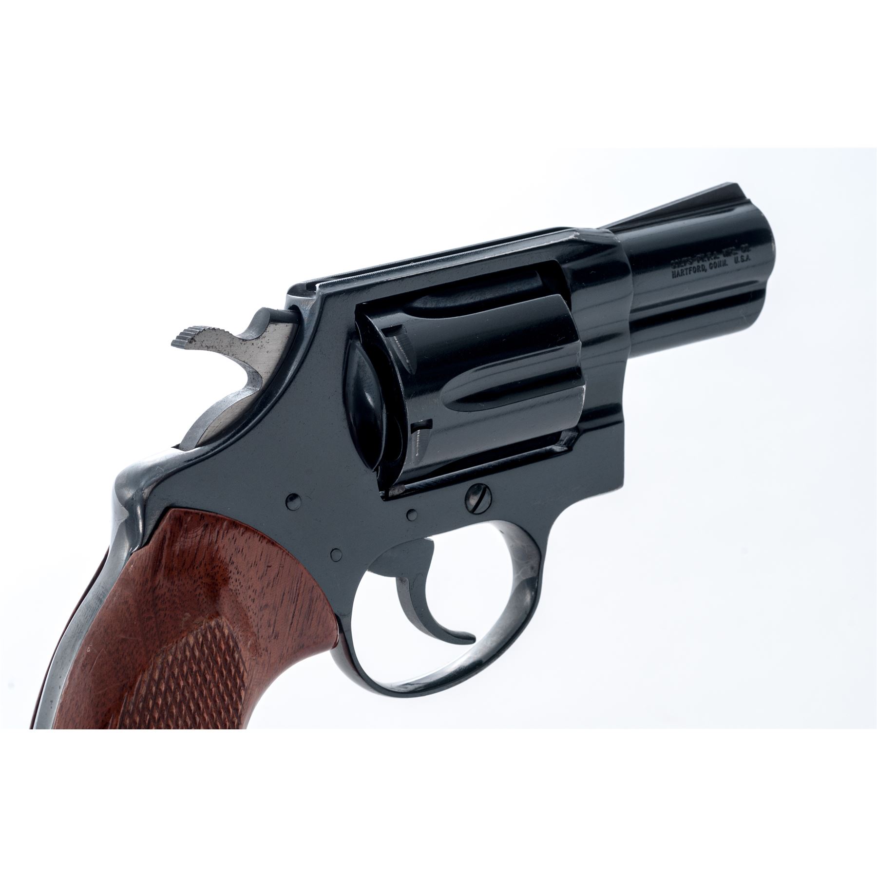 Colt Detective Special Third Issue Double Action Revolver, #57814M, .38 Spec. cal., 2'' barrel, blue finish, checkered wraparound wood grips, with standard fixed sights. Condition overall is very good with approx. 97% remaining original finish. Triggerguard with some tiny specks of pitting. Factory lettering is clear, screw heads are straight. Grips with scattered shallow handling marks, approx. 95% of the factory finish remains with a dime-sized spot of finish loss to bottom corner of right grip. Cylinder with only a light index line. Crisp action, bright bore rates excellent. Est.: $400-$600. (Modern/PPT)