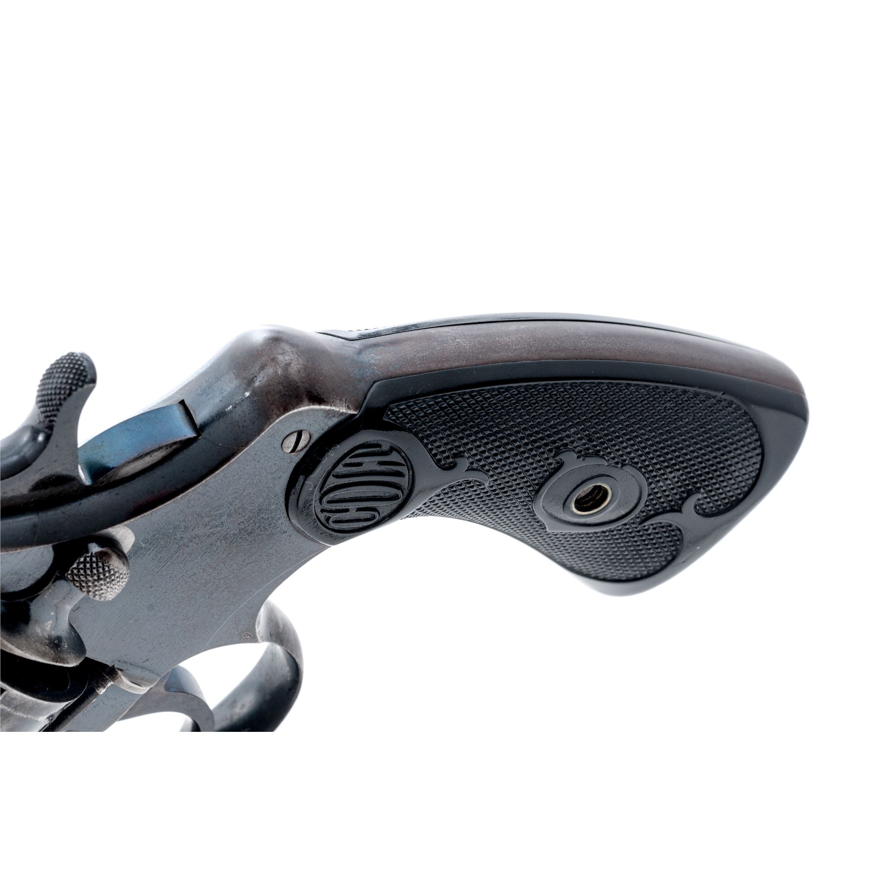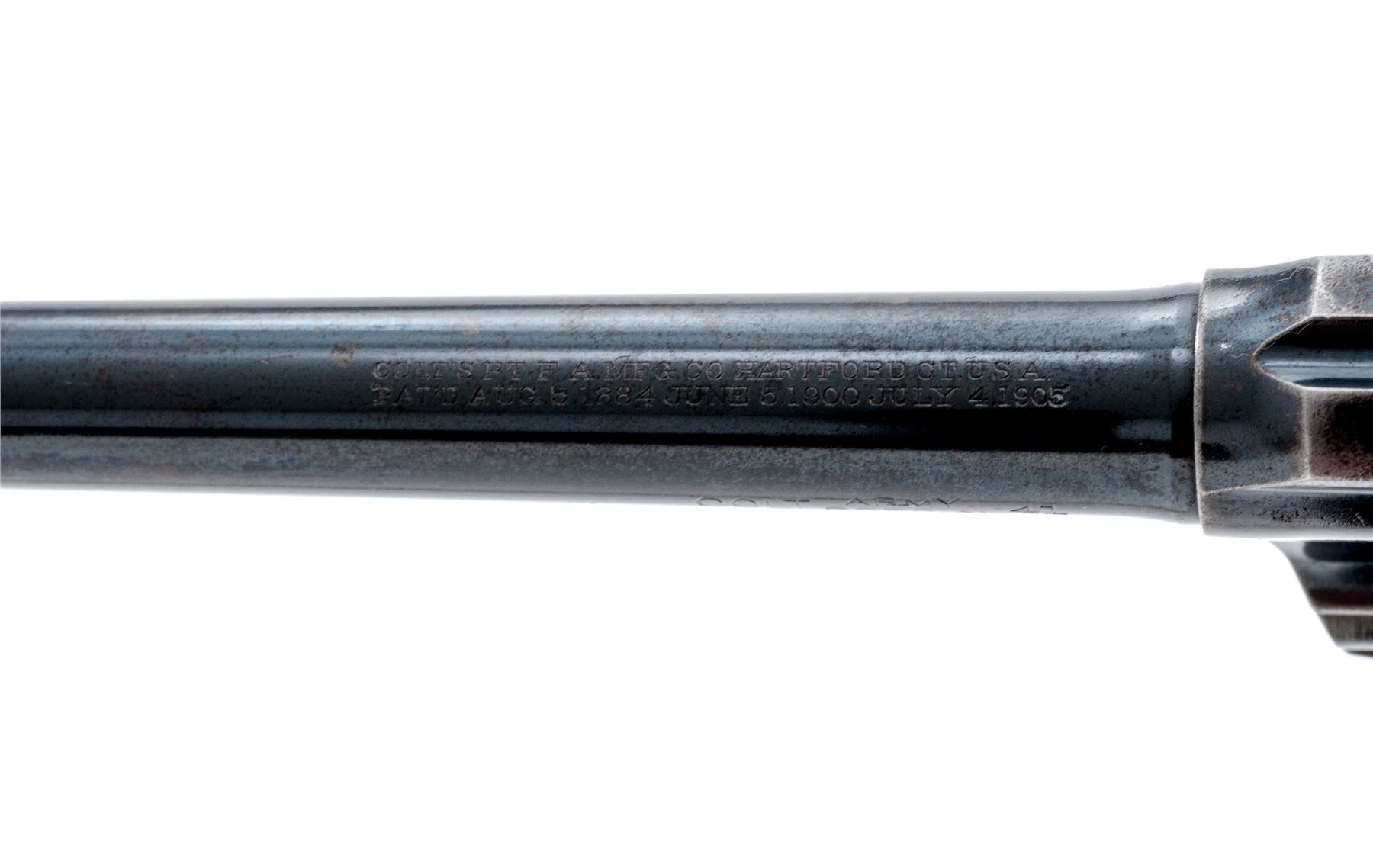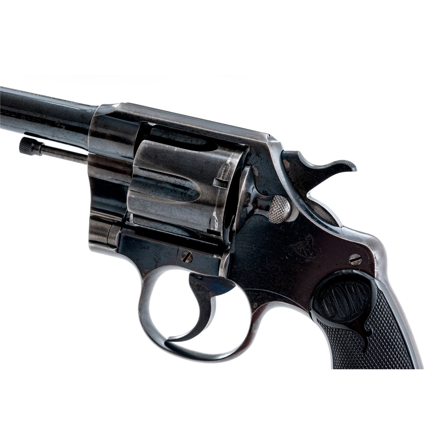 Colt Army Special Double Action Revolver, #335163, .41 Colt cal., 6'' barrel, blue finish, factory checkered hard rubber grips. Mfg'd 1911. Condition is fine retaining approx. 85% thinning and lightly toning blue. Grips with only the lightest flattening to checks. Good action, fine bore. Est.: $500-$750. (C&R/PPT)