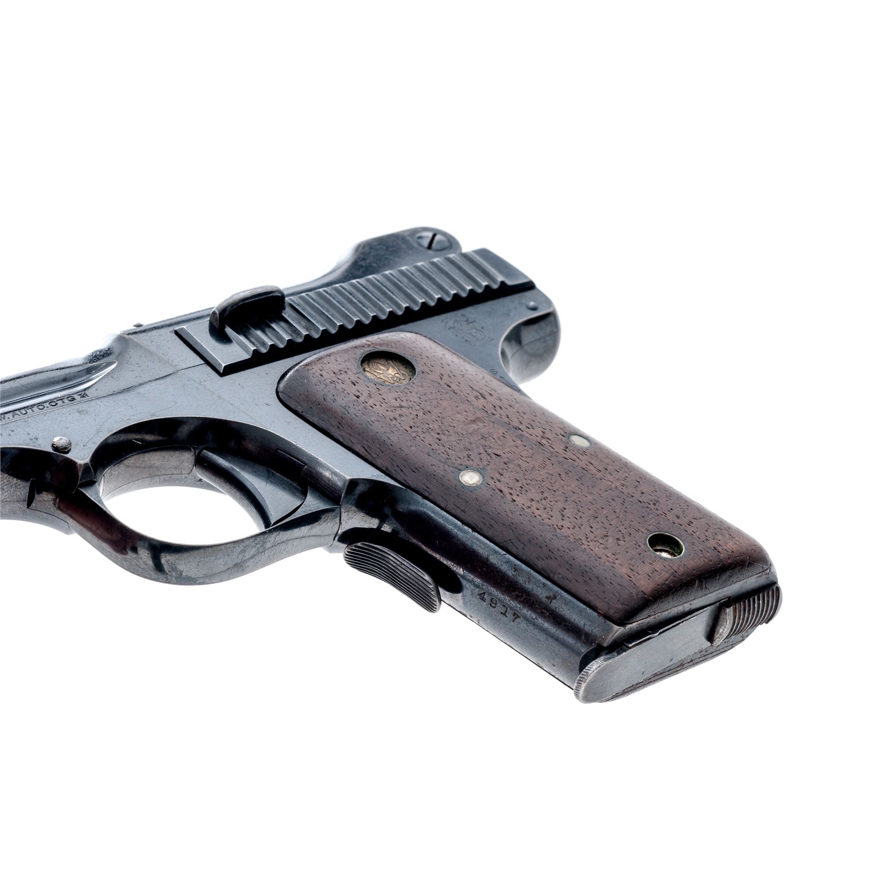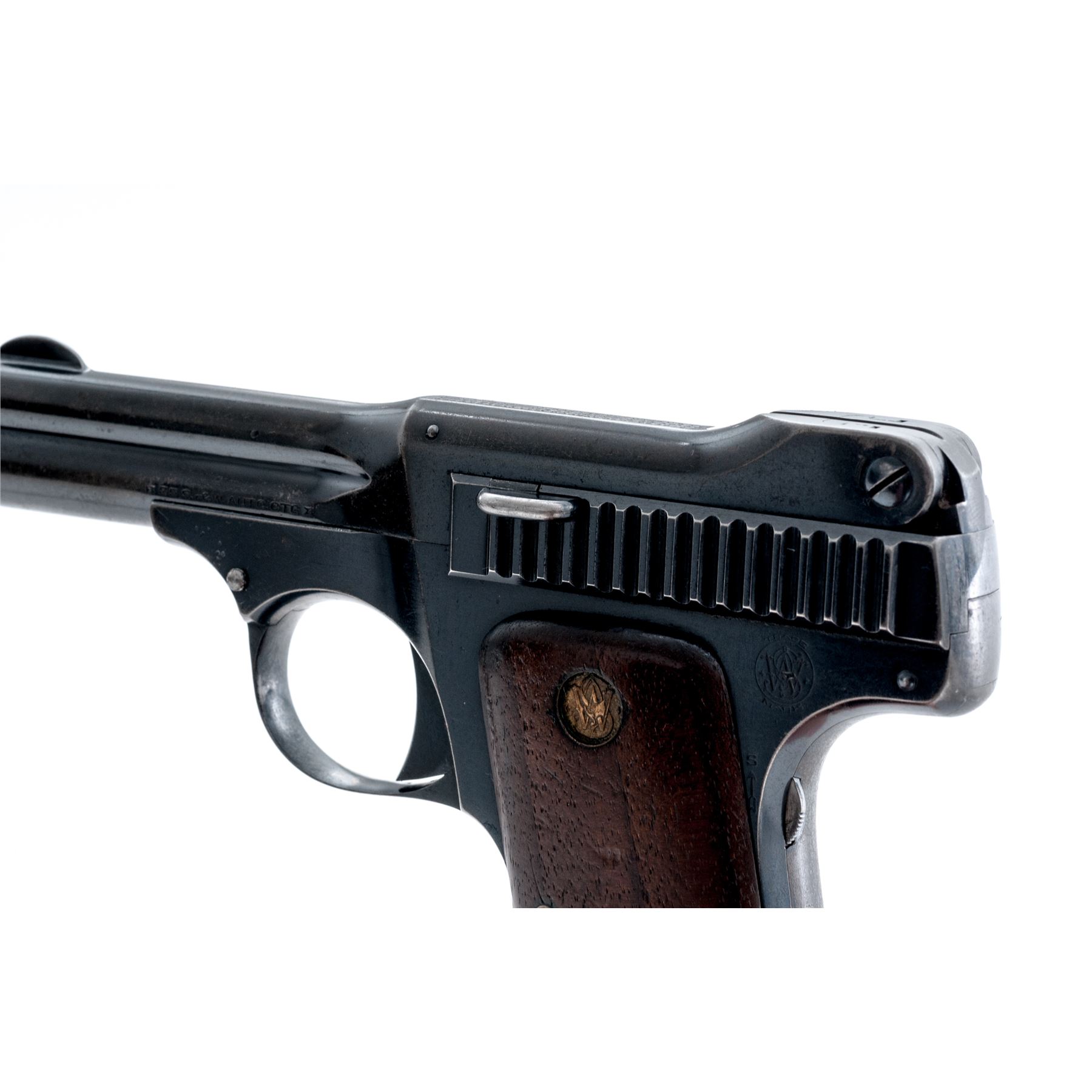 Smith & Wesson Model of 1913 Semi-Automatic Pistol, #4917, .35 S&W Auto cal., 3.5'' barrel, blue finish, smooth walnut grips with S&W medallions, with one factory magazine. Condition is fine retaining approx. 85%-90% blue. Grips with even wear and little of their original varnish remaining. Base of magazine is slightly bent downward. Good action, fine bore. Est.: $400-$600. (C&R/PPT)