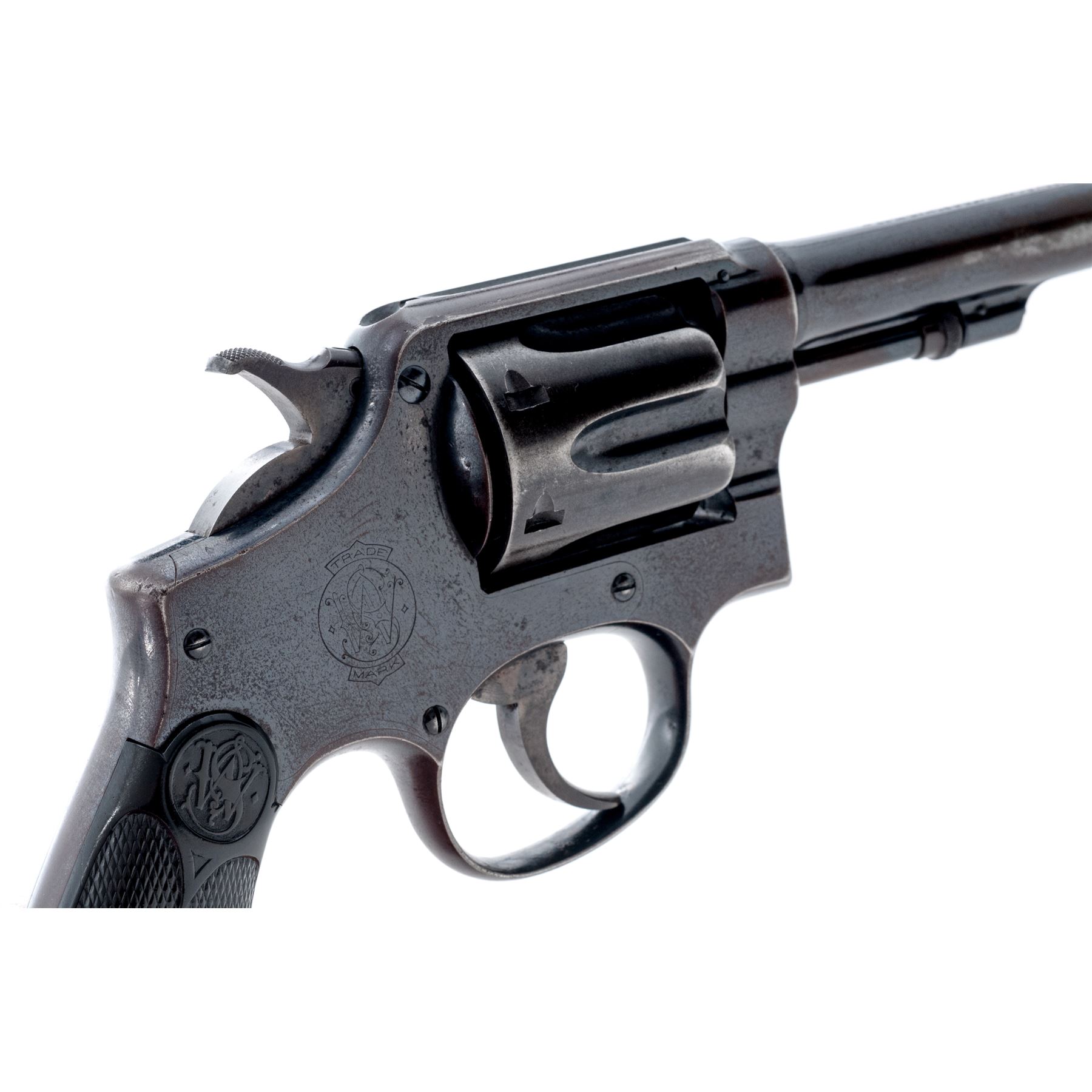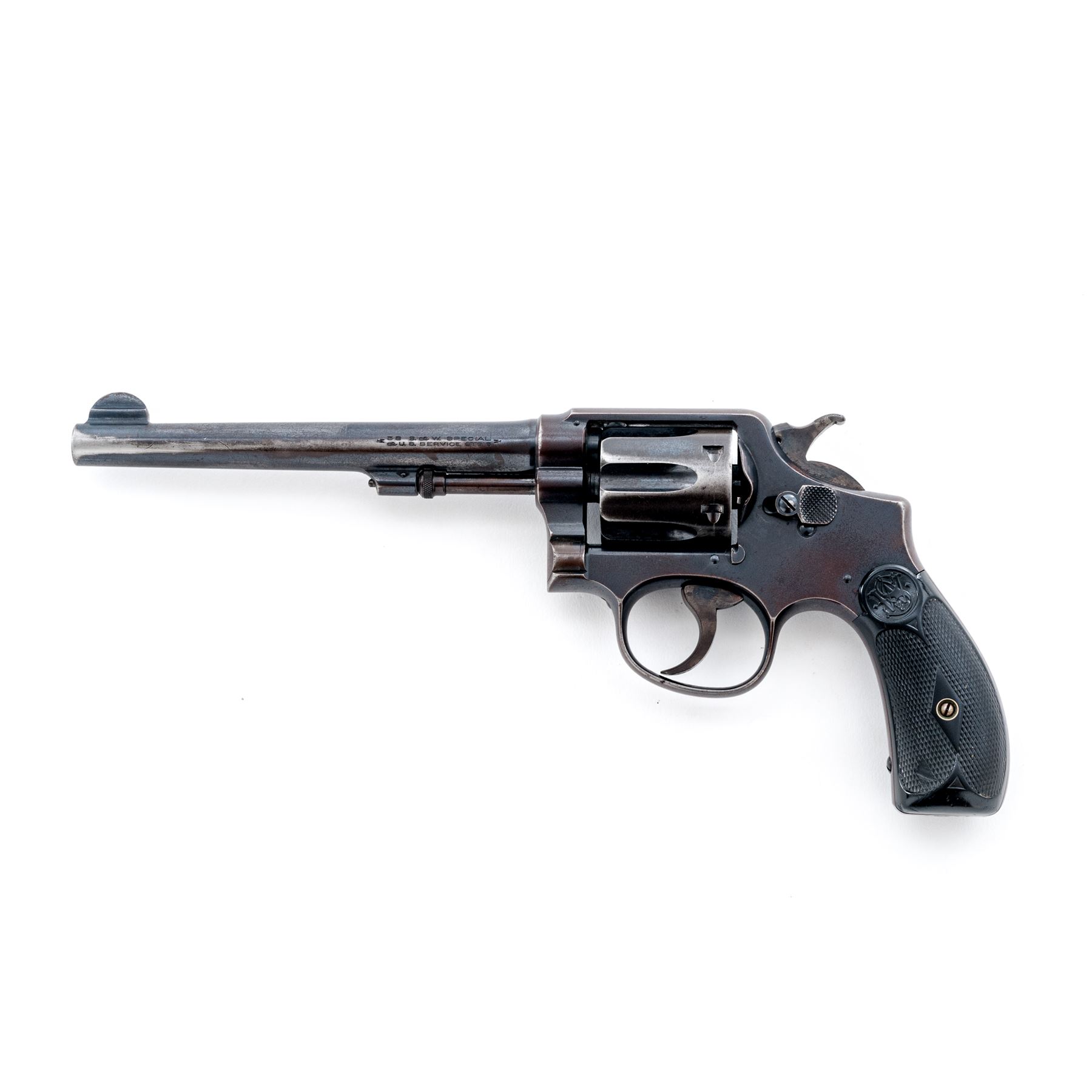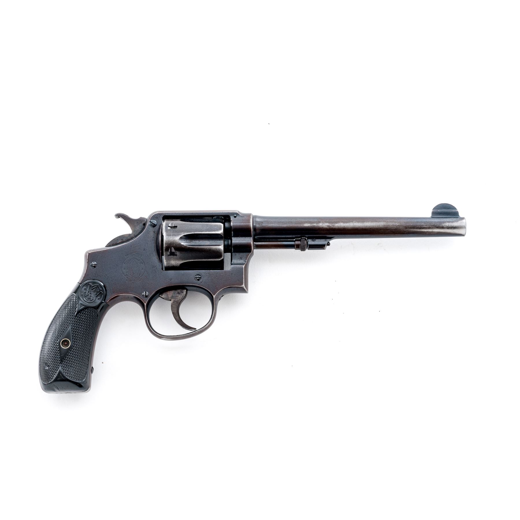 Smith & Wesson M&P (Model of 1905) 2nd Change Double Action Revolver, #89238, .38 Spec. cal., 6.5'' barrel, blue finish, factory checkered round butt hard rubber grips. Mfg'd approx. 1907. Condition is fine retaining approx. 85% original factory high-polish blue, the balance having thinned and toned. Grips are very good as well, with mild thinning to details and light impressions to both panels. Good crisp action, bright bore. Est.: $400-$600. (C&R)