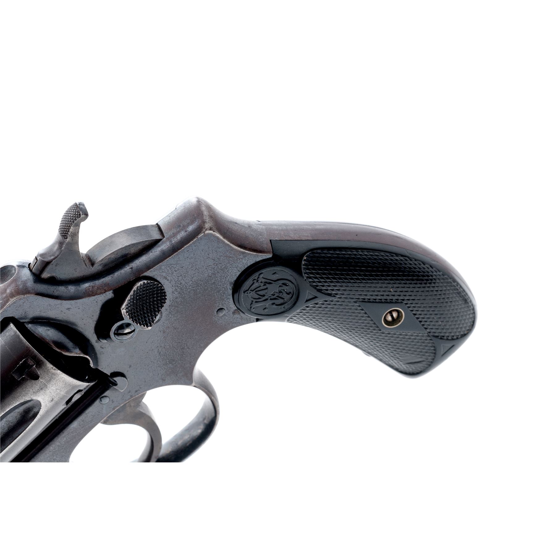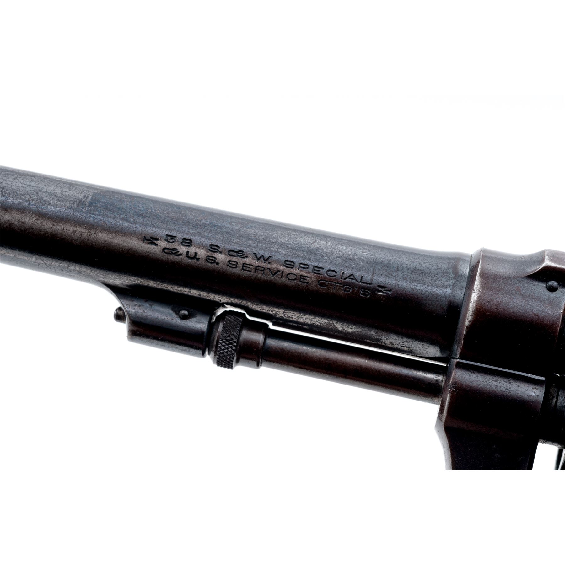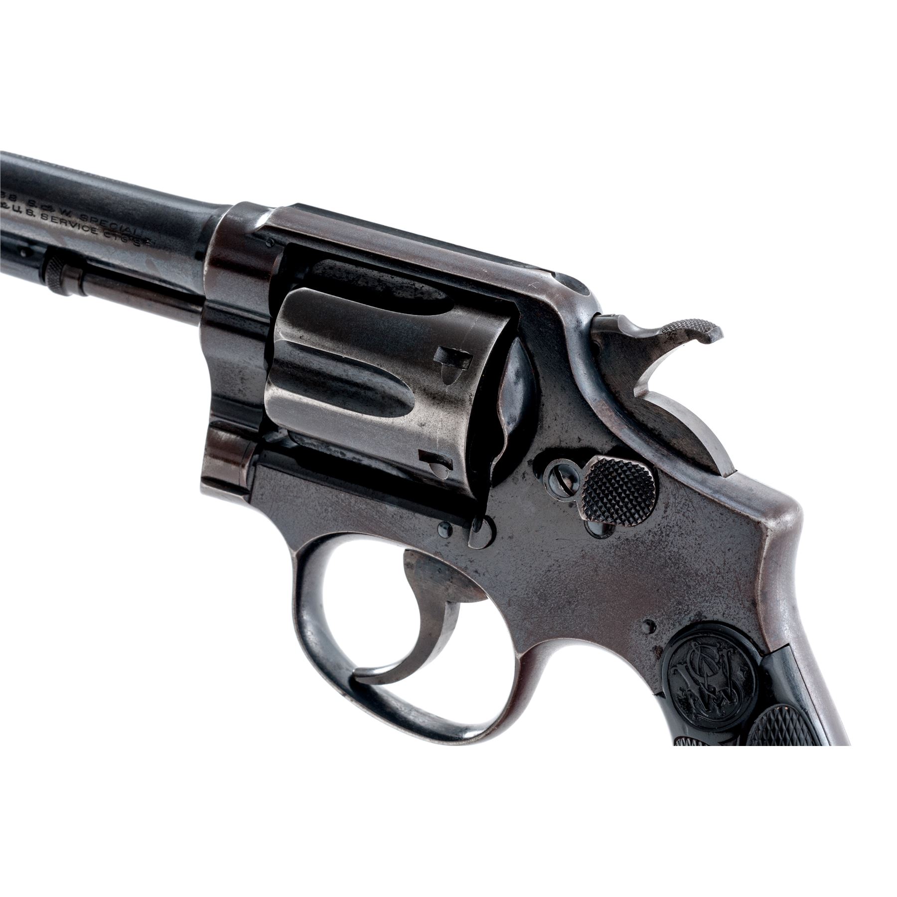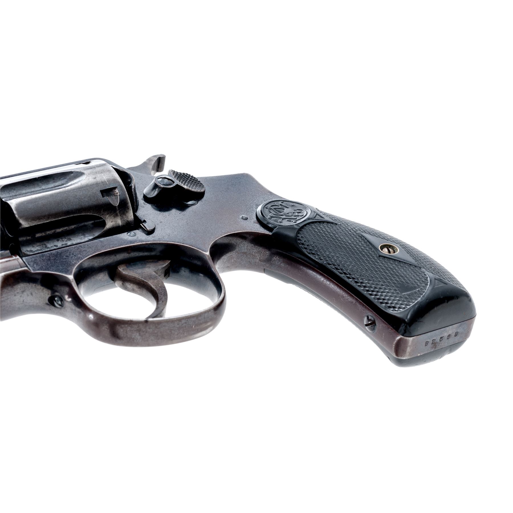 Smith & Wesson M&P (Model of 1905) 2nd Change Double Action Revolver, #89238, .38 Spec. cal., 6.5'' barrel, blue finish, factory checkered round butt hard rubber grips. Mfg'd approx. 1907. Condition is fine retaining approx. 85% original factory high-polish blue, the balance having thinned and toned. Grips are very good as well, with mild thinning to details and light impressions to both panels. Good crisp action, bright bore. Est.: $400-$600. (C&R)