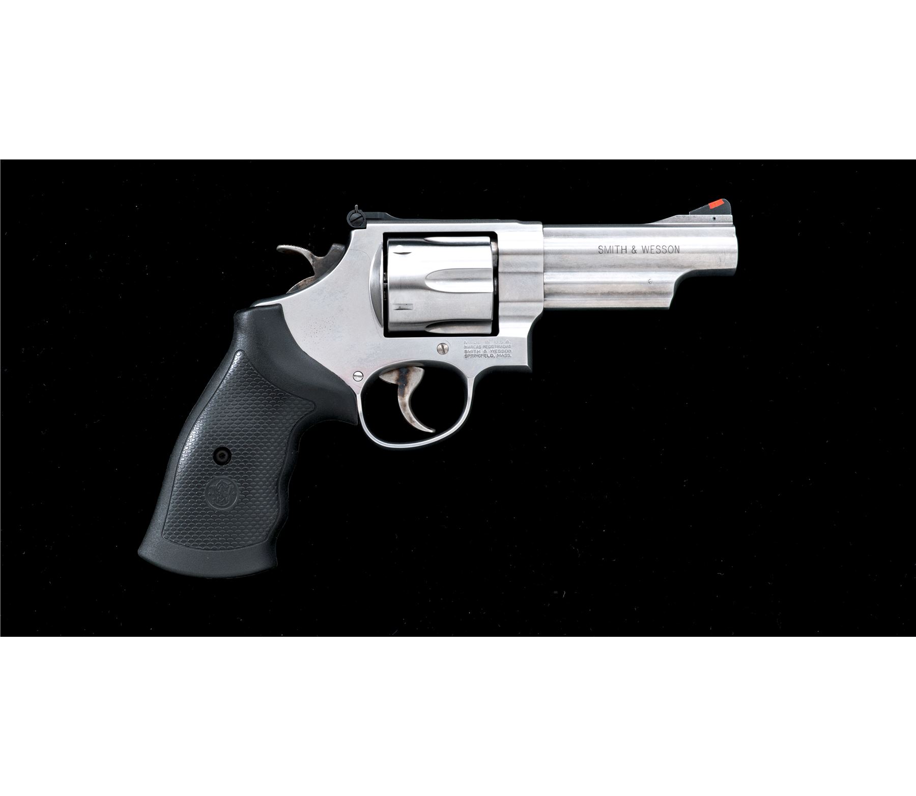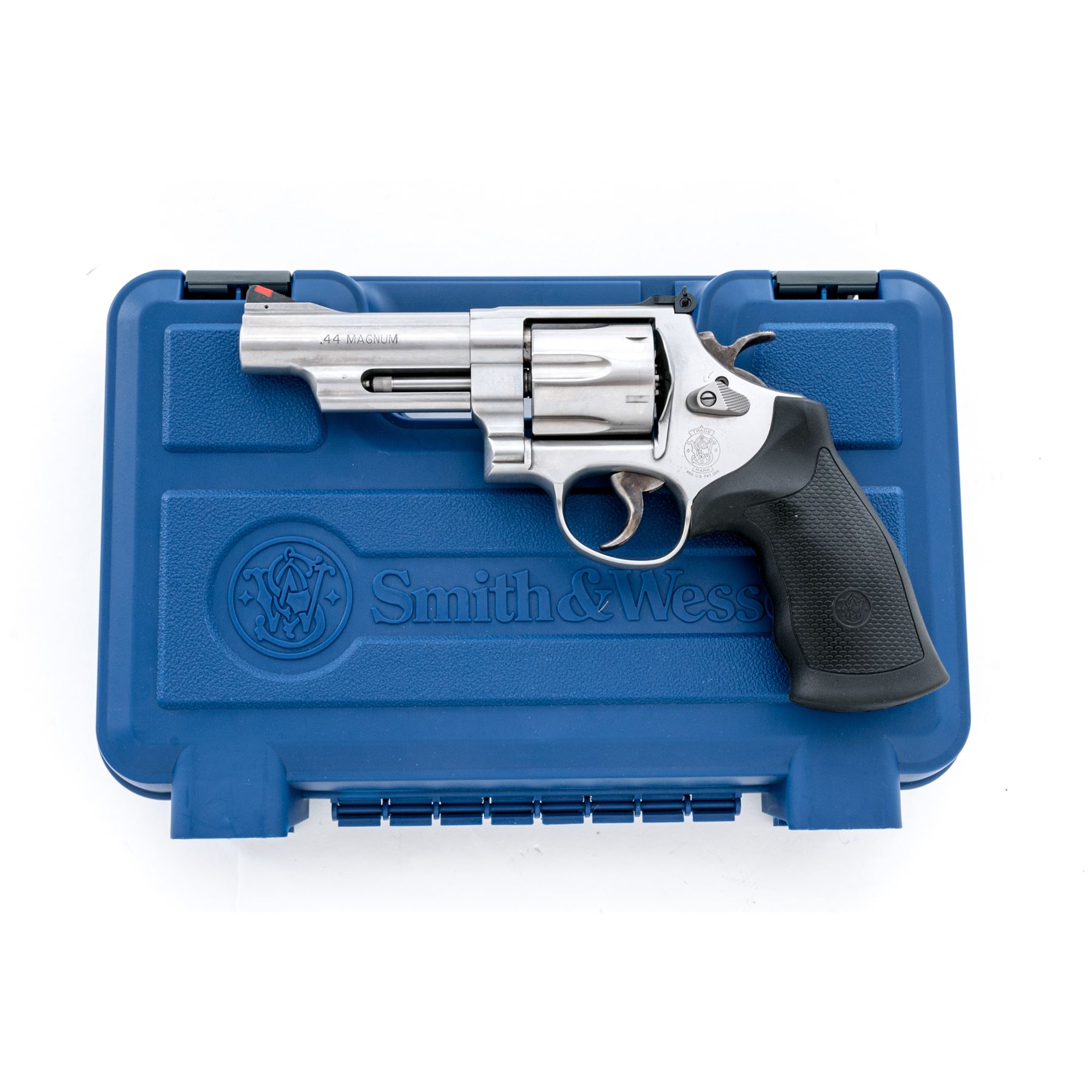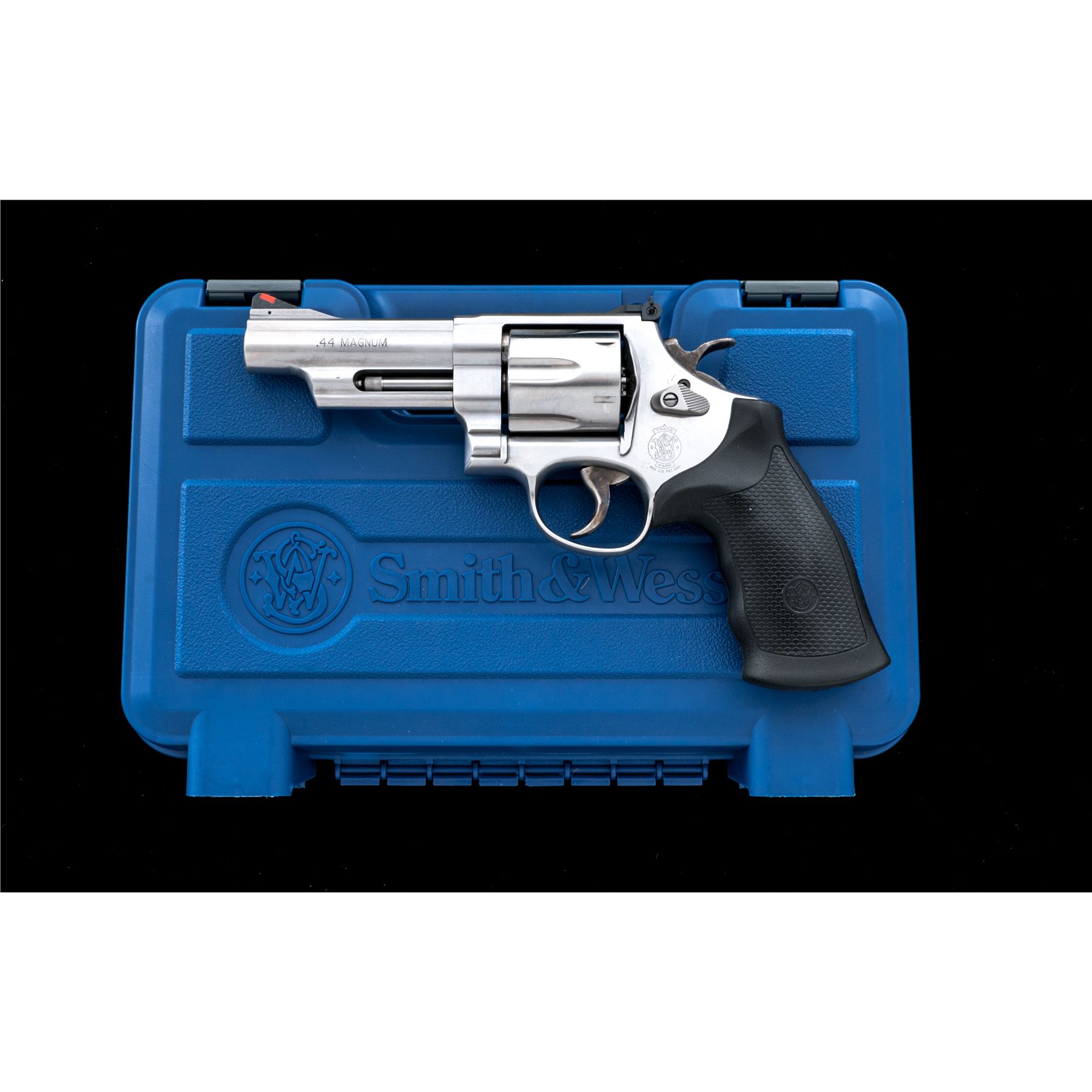 Smith & Wesson Model 629-6 Double Action Revolver, #CXZ6626, .44 mag. cal., 4'' barrel, stainless steel, finger-grooved black rubber S&W grips, red ramp front sight and fully adjustable white outline rear sight, case hardened checkered target hammer, and smooth combat trigger. Revolver features an internal safety locking mechanism and includes one key. In original blue plastic S&W box with matching end label, cable lock, S&W packing paper, and owner's manual. Showing normal signs of light range use, this revolver rates as near excellent overall. Metal with scattered micro-scratching and small handling marks. Factory lettering is clear. Screw heads are straight. Grips are excellent with only a few minor handling marks. Cylinder with a moderate index line. Action is smooth and crisp. Bore is excellent with defined rifling. Est.: $600-$800. (Modern/PPT)