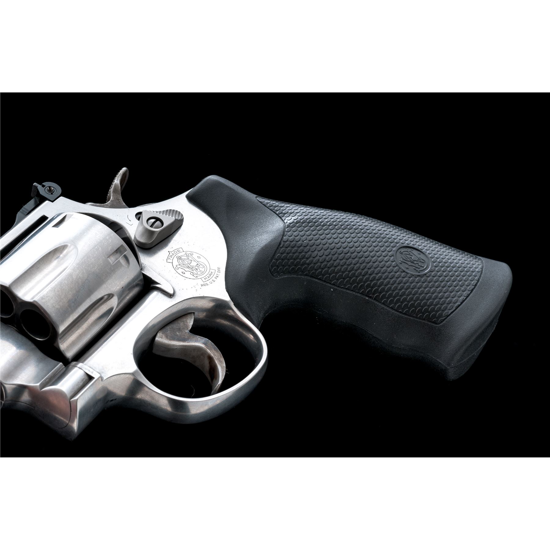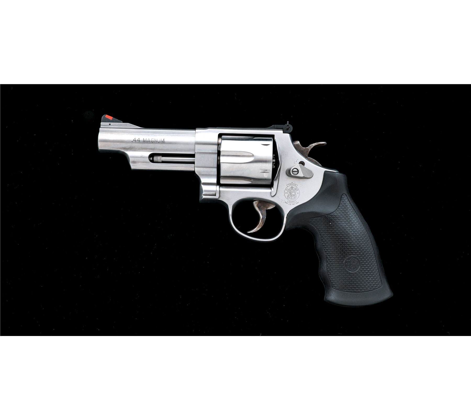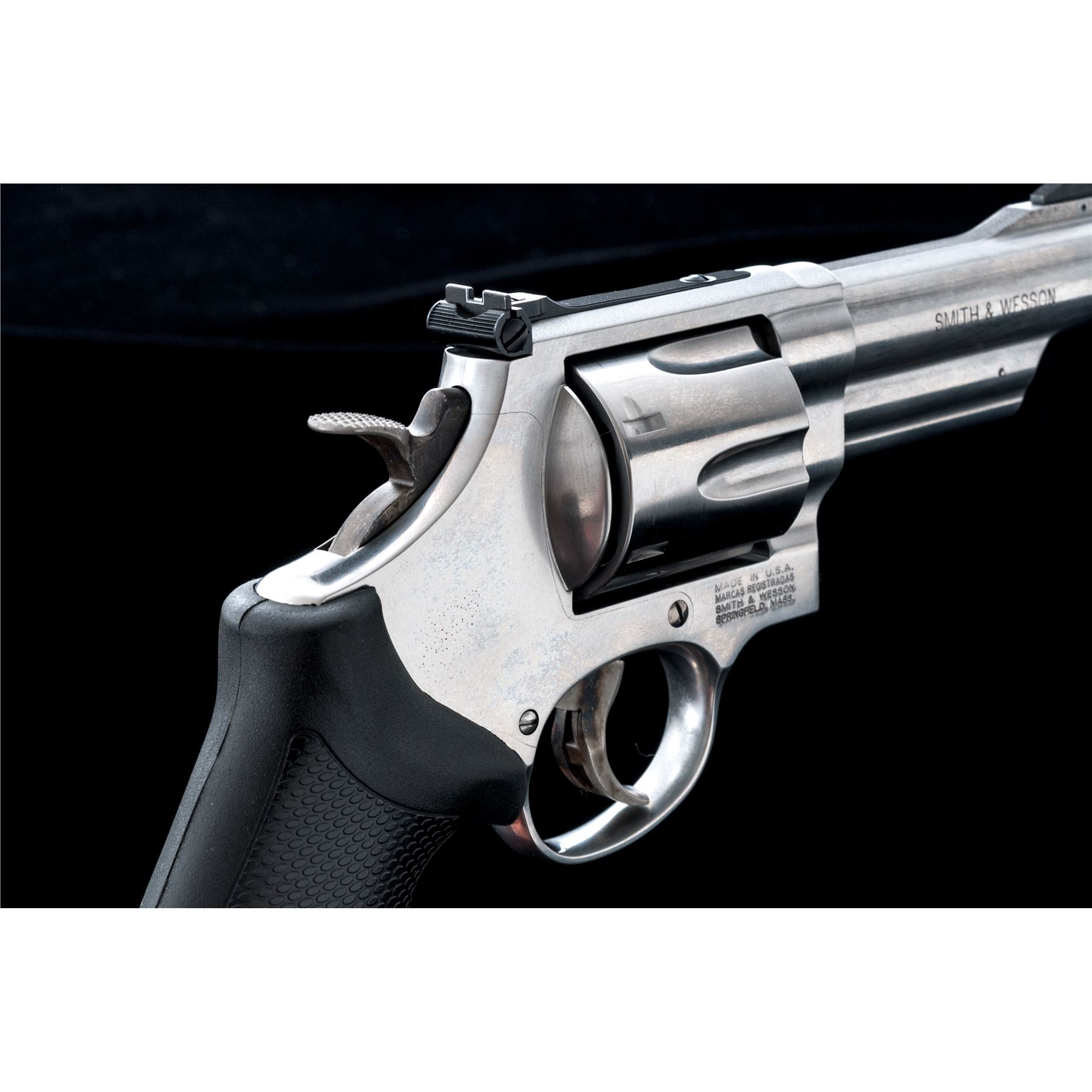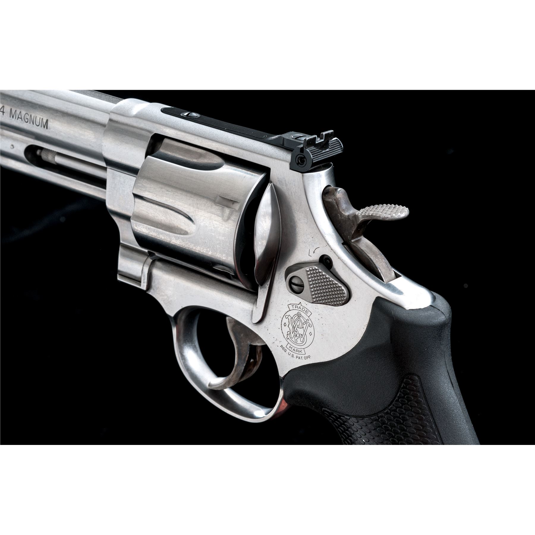 Smith & Wesson Model 629-6 Double Action Revolver, #CXZ6626, .44 mag. cal., 4'' barrel, stainless steel, finger-grooved black rubber S&W grips, red ramp front sight and fully adjustable white outline rear sight, case hardened checkered target hammer, and smooth combat trigger. Revolver features an internal safety locking mechanism and includes one key. In original blue plastic S&W box with matching end label, cable lock, S&W packing paper, and owner's manual. Showing normal signs of light range use, this revolver rates as near excellent overall. Metal with scattered micro-scratching and small handling marks. Factory lettering is clear. Screw heads are straight. Grips are excellent with only a few minor handling marks. Cylinder with a moderate index line. Action is smooth and crisp. Bore is excellent with defined rifling. Est.: $600-$800. (Modern/PPT)