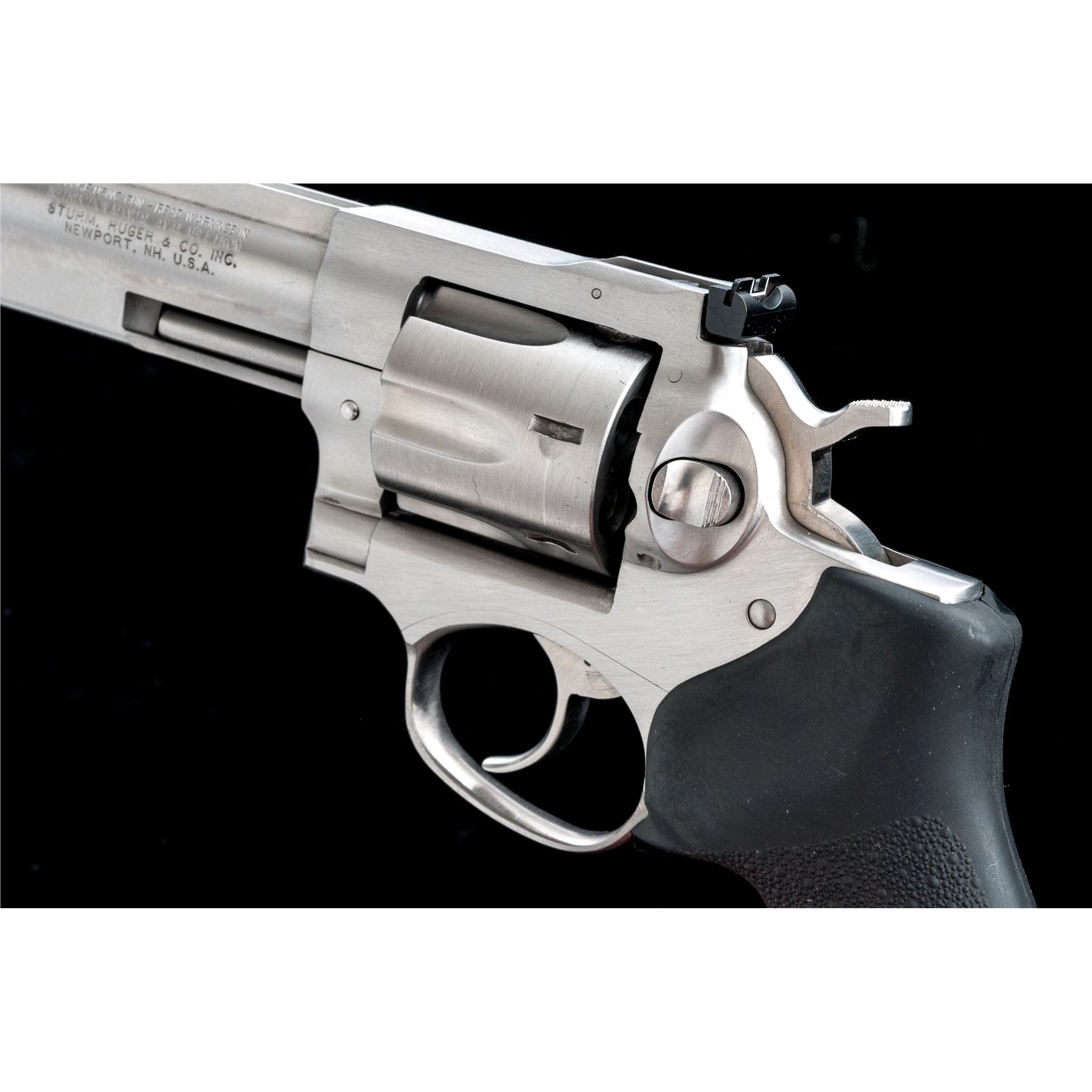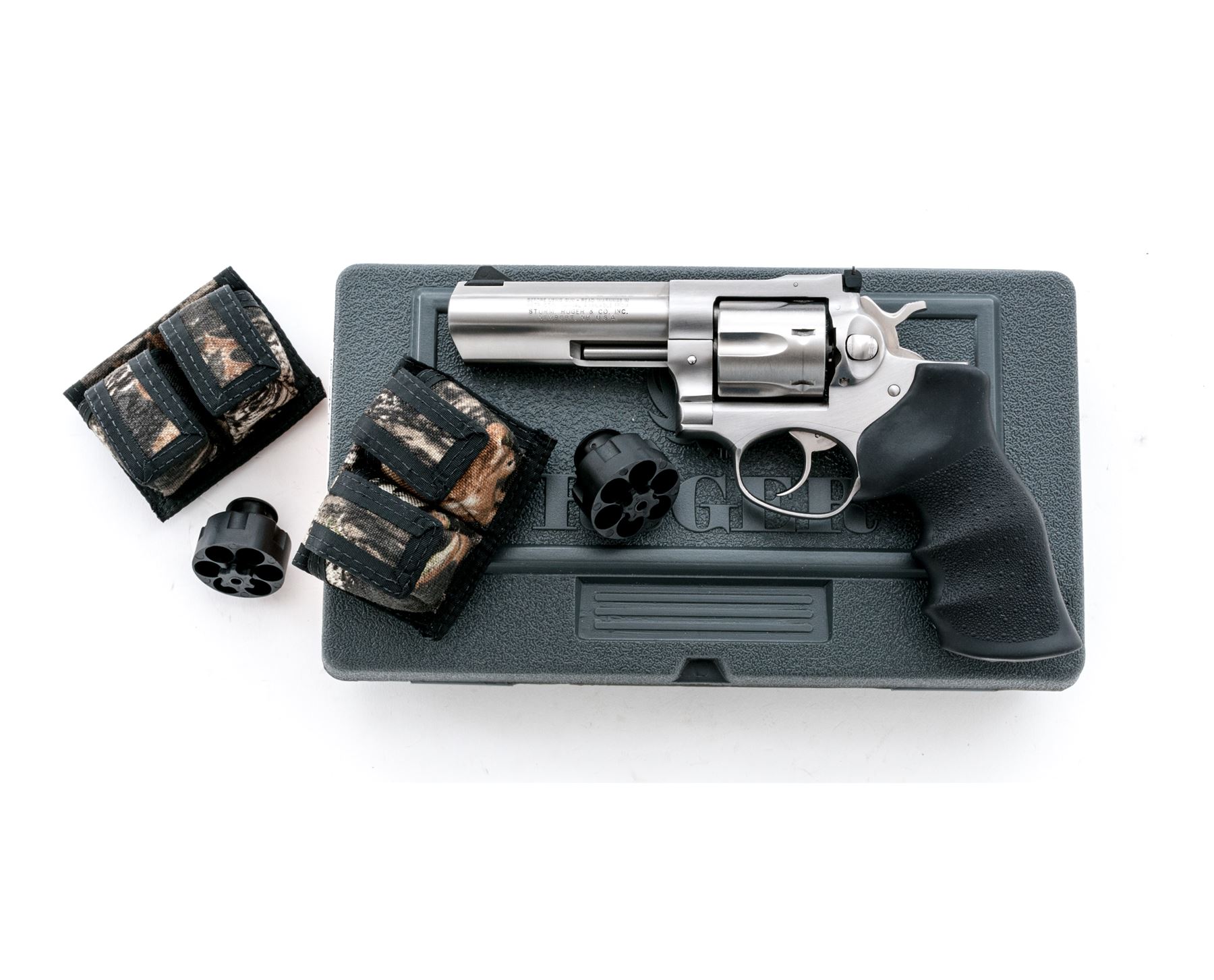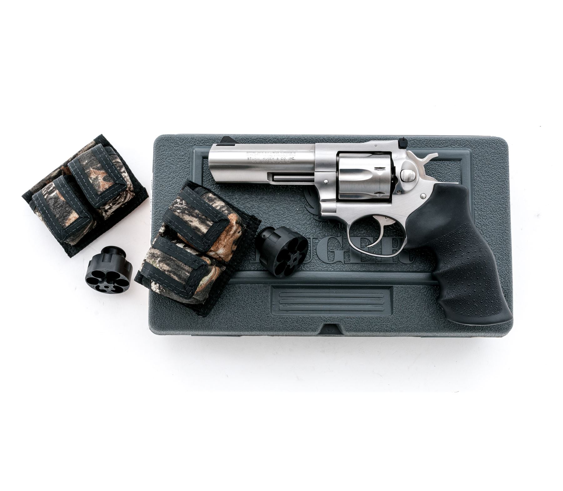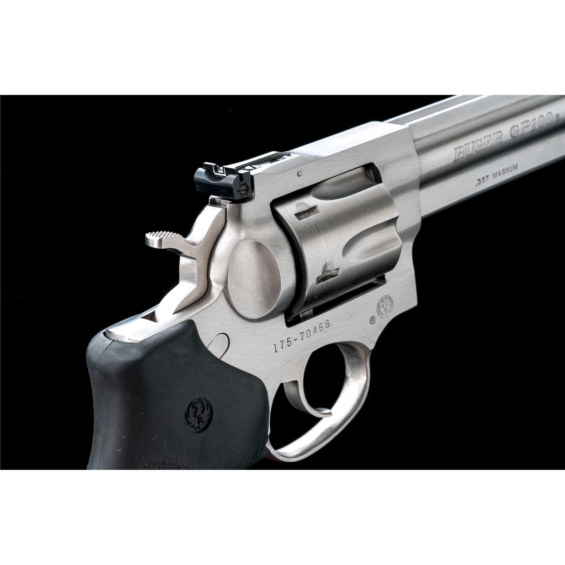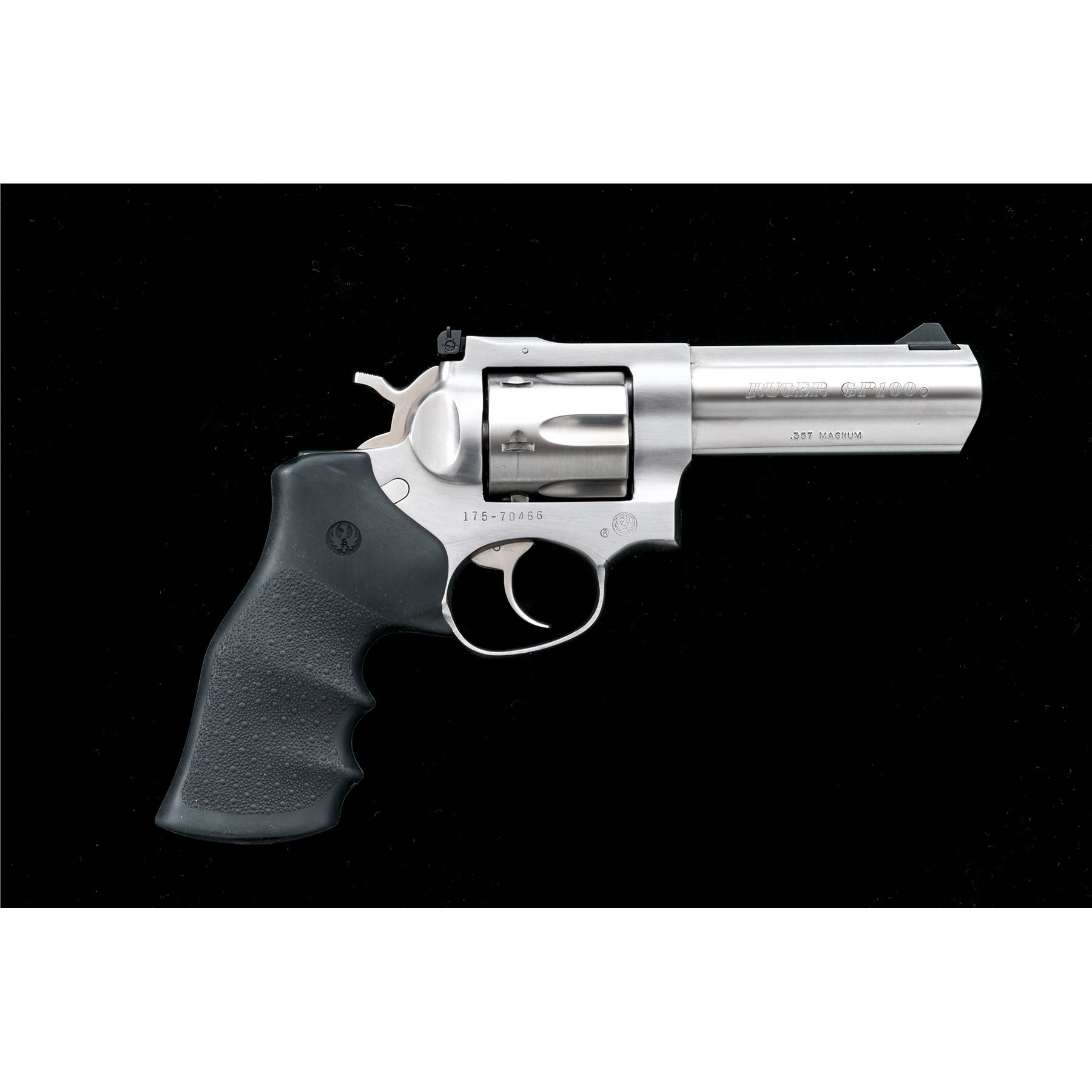 Ruger GP-100 Double Action Revolver, #175-70466, .357 mag. cal., 4.2'' barrel, satin stainless steel, stippled black rubber finger-grooved Ruger grips, with fixed blade front sight and white outline square-notched fully adjustable rear sight. Included are four (4) Safariland speedloaders, two (2) camouflage double speedloader pouches and six (6) A-Zoom snap caps. In original hard plastic Ruger case with matching end label and instruction manual. Condition is excellent showing normal signs of light range use, with intermittent small handling marks to the grips and metal. Cylinder with a light index line; face and inside of frame are clean with little powder residue. Action is crisp and smooth, bore is bright and clean with defined rifling. Est.: $400-$600. (Modern/PPT)