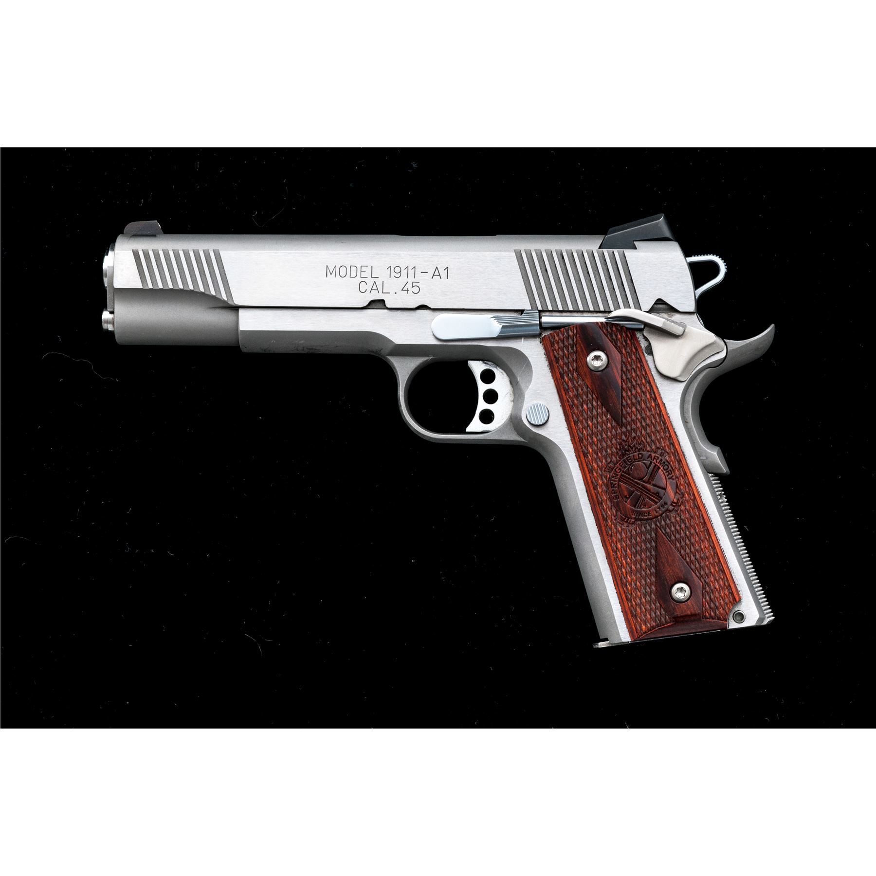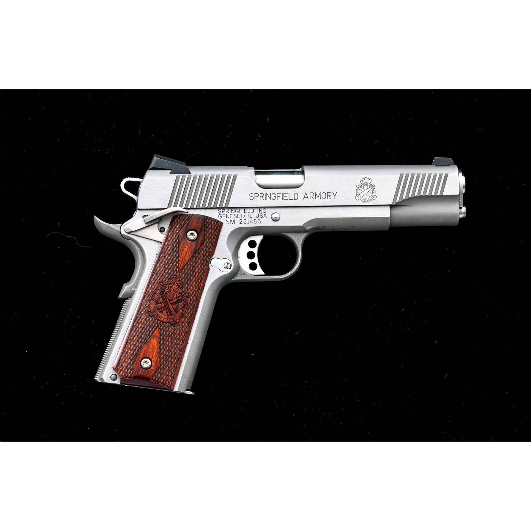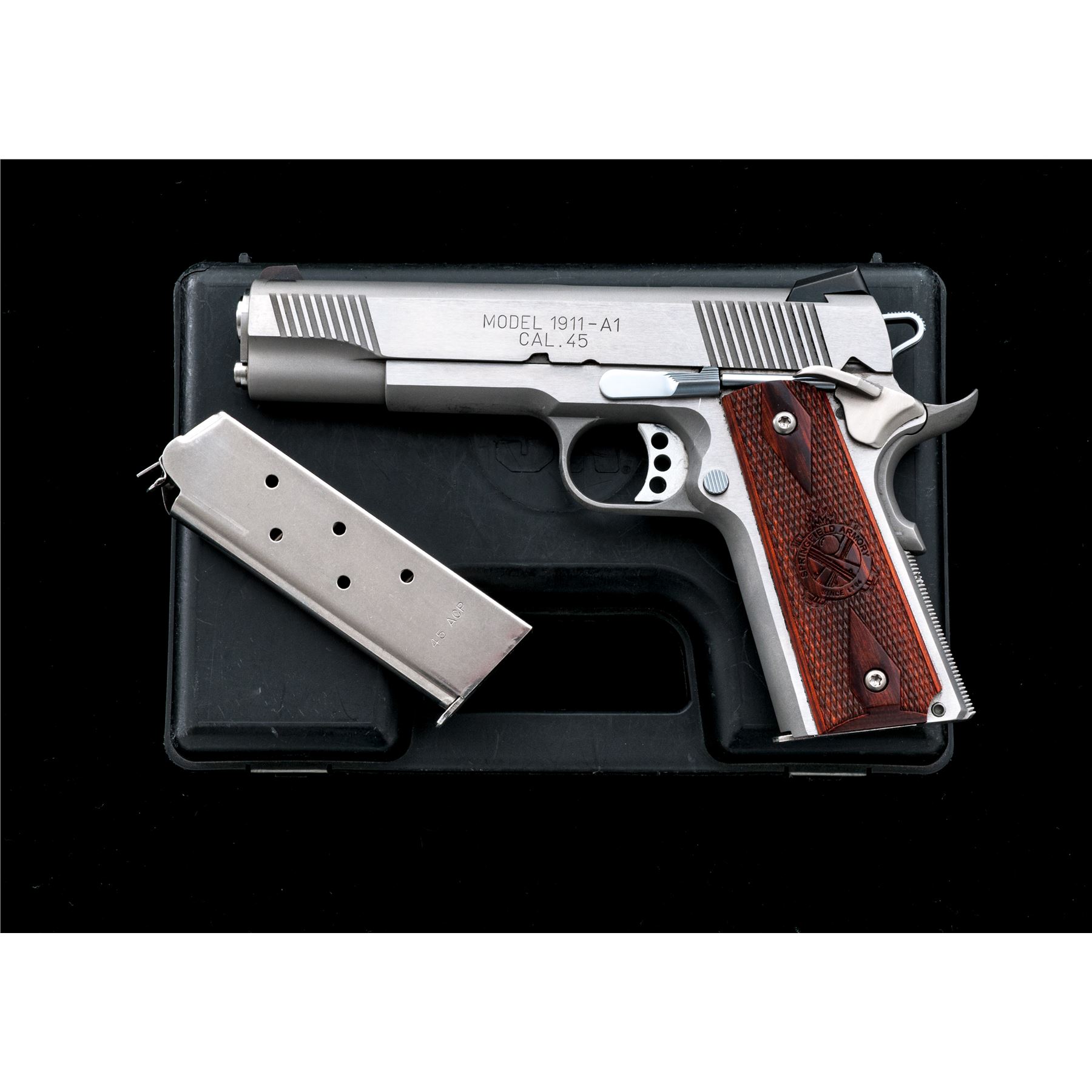 Springfield Armory 1911-A1 Loaded Semi-Automatic Pistol, #NM251486, .45 ACP cal., 5'' stainless barrel, combination matte and satin stainless slide and frame, checkered double diamond hardwood grips with Springfield Armory logo, white 3-dot sights, slanted front and rear slide serrations, skeletonized hammer and trigger with two (2) stainless steel magazines. In black plastic Springfield Armory case. Left side of frame and slide with arched reassembly marks, otherwise metal surfaces rate fine+ overall, with scattered small handling marks and surface scuffs to the matte finished triggerguard. Grips appear near new. Action is smooth and functions properly; excellent bright and shiny bore. Est.: $600-$800. (Modern/PPT)