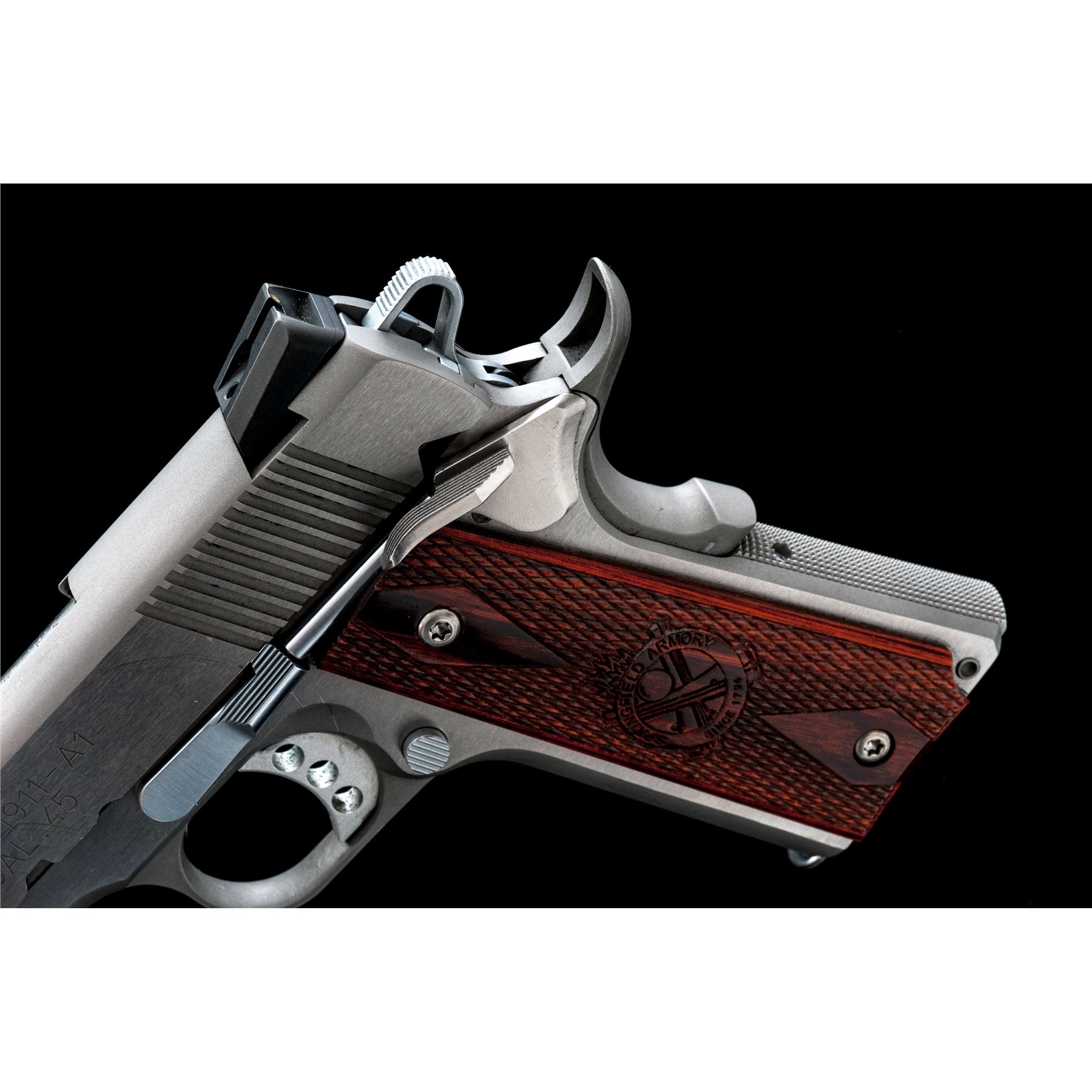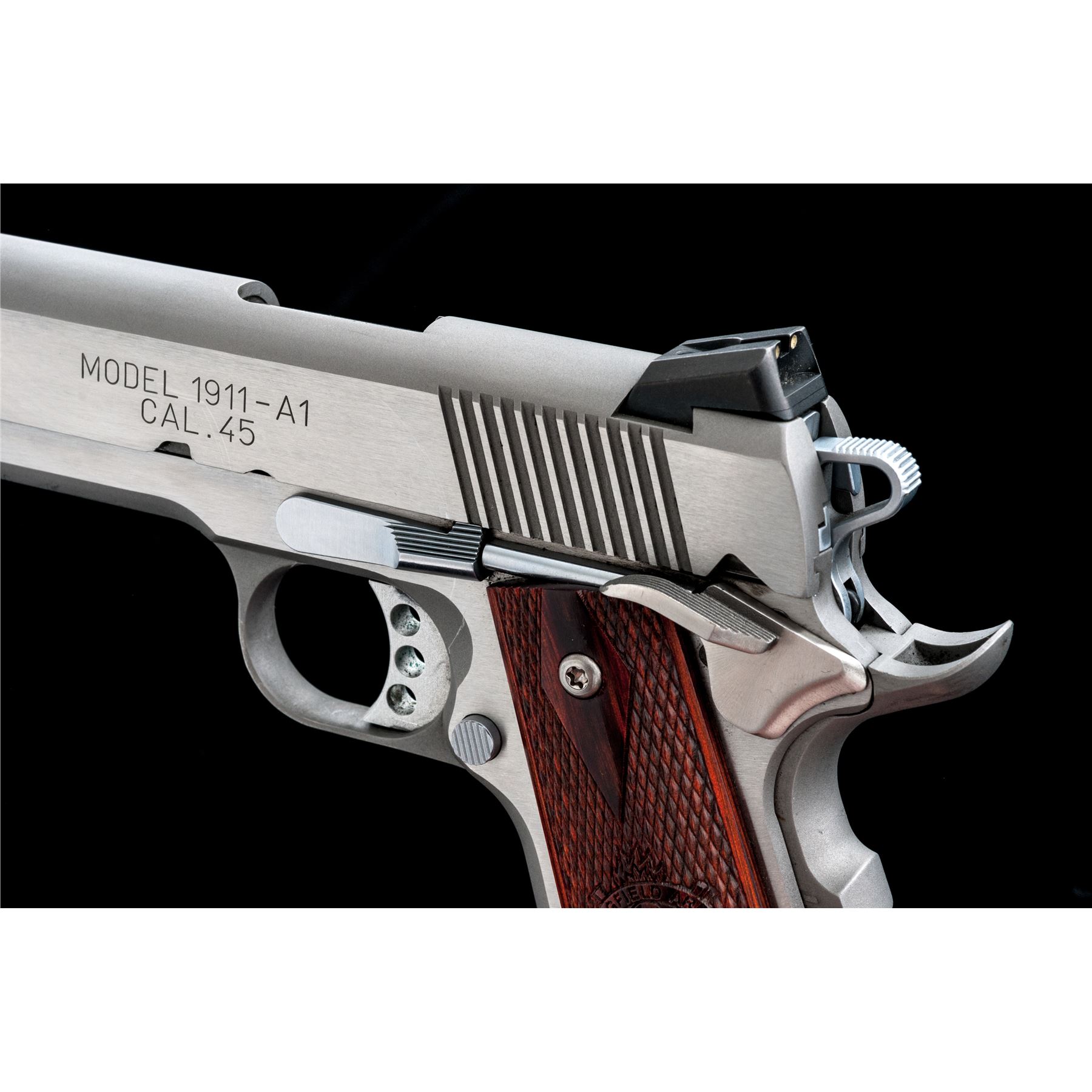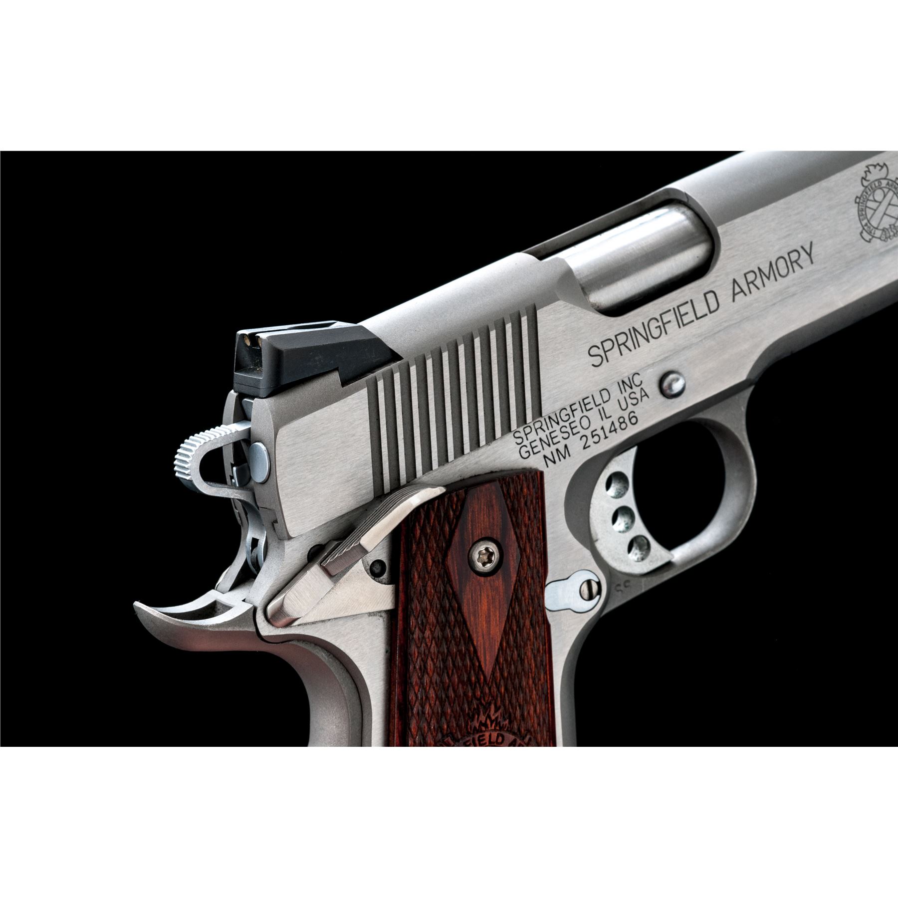Springfield Armory 1911-A1 Loaded Semi-Automatic Pistol, #NM251486, .45 ACP cal., 5'' stainless barrel, combination matte and satin stainless slide and frame, checkered double diamond hardwood grips with Springfield Armory logo, white 3-dot sights, slanted front and rear slide serrations, skeletonized hammer and trigger with two (2) stainless steel magazines. In black plastic Springfield Armory case. Left side of frame and slide with arched reassembly marks, otherwise metal surfaces rate fine+ overall, with scattered small handling marks and surface scuffs to the matte finished triggerguard. Grips appear near new. Action is smooth and functions properly; excellent bright and shiny bore. Est.: $600-$800. (Modern/PPT)