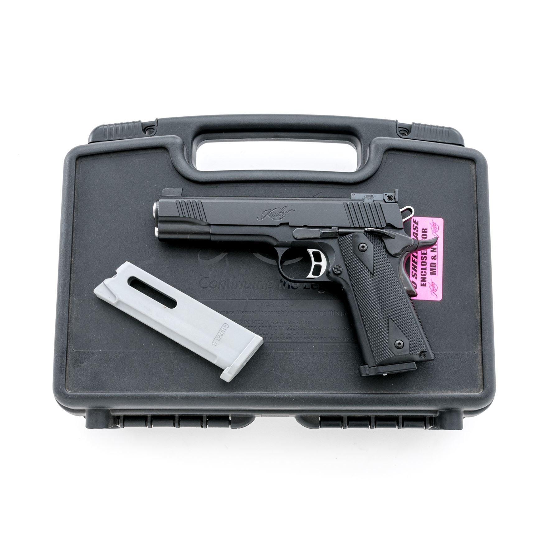 Kimber Rimfire Target Semi-Automatic Pistol, #K151621, .17 Mach 2 cal., 5'' barrel, matte black finish, aluminum frame, checkered black rubber double diamond grips, blade front sight and Kimber marked rear sight adjustable for both windage and elevation, skeletonized hammer and trigger, with two (2) Kimber magazines, one black and one light gray. In original black plastic case with matching end label, bushing wrench, owner's manual, and other misc. factory paperwork. Condition overall is excellent retaining approx. 98% original finish; frame and slide with a few light scuffs and handling marks. Thumb safety and slide stop show light edgewear. Grips are excellent, appearing near new. Smooth action, bright bore. Overall a nice lightly used pistol. Est.: $500-$750. (Modern/PPT)