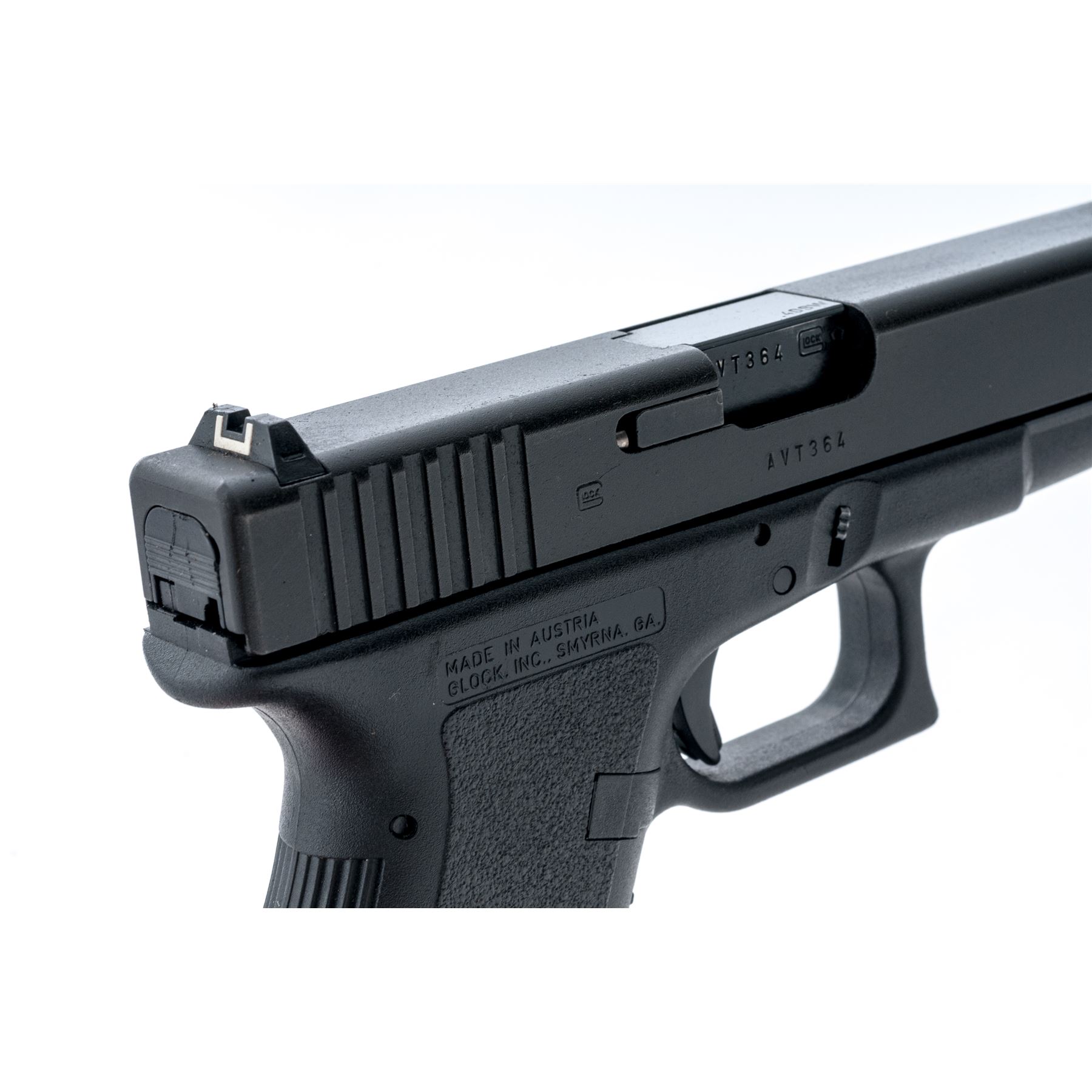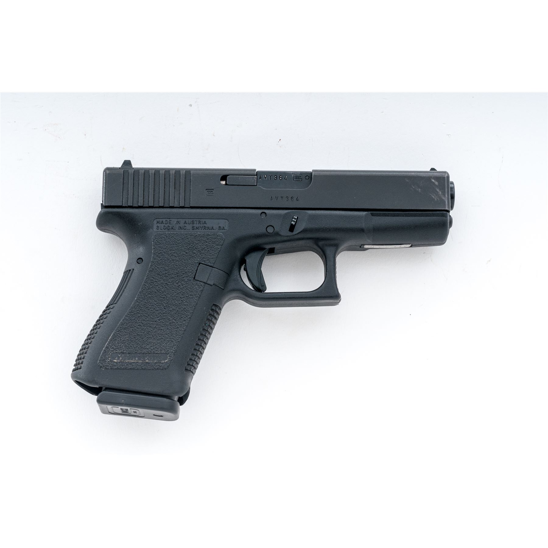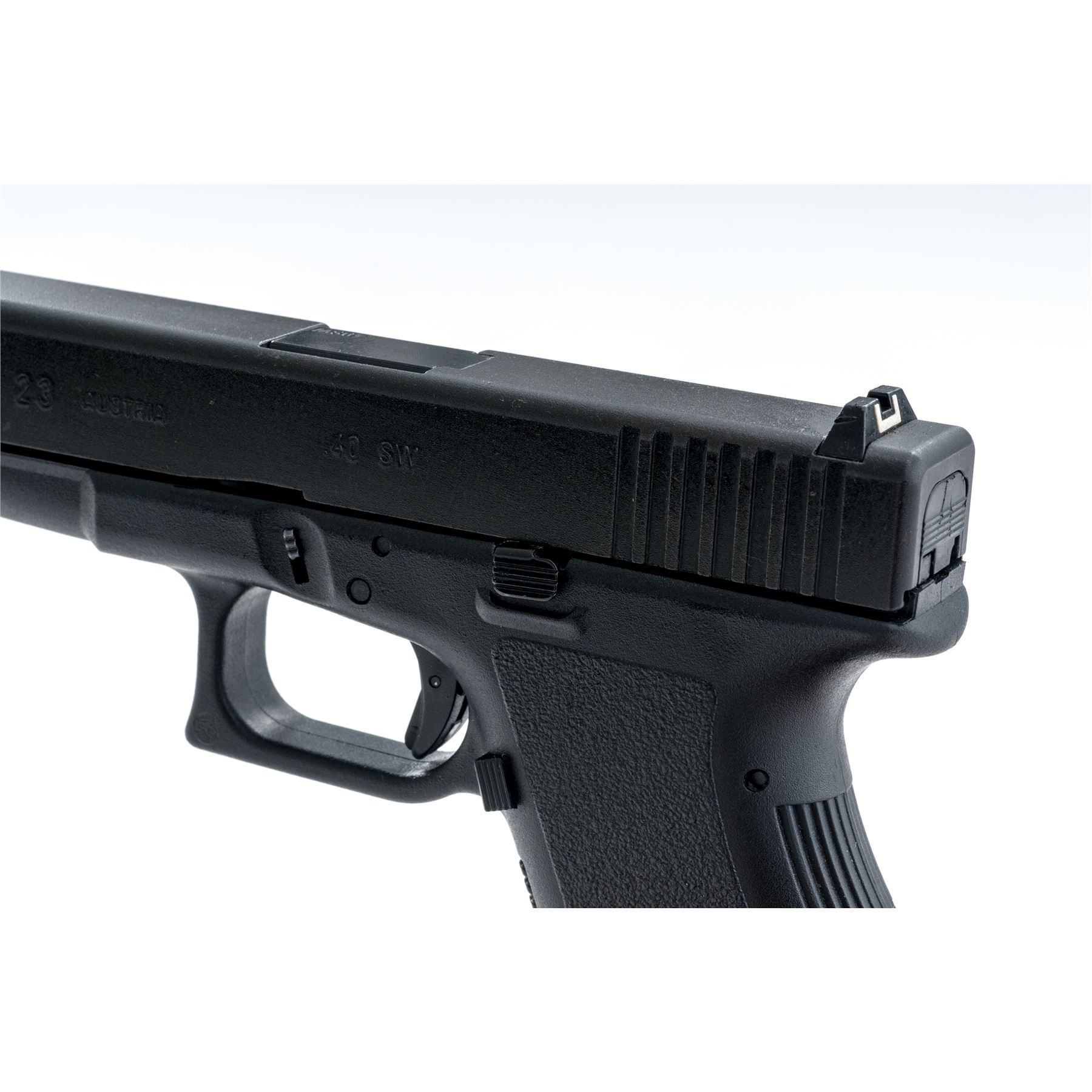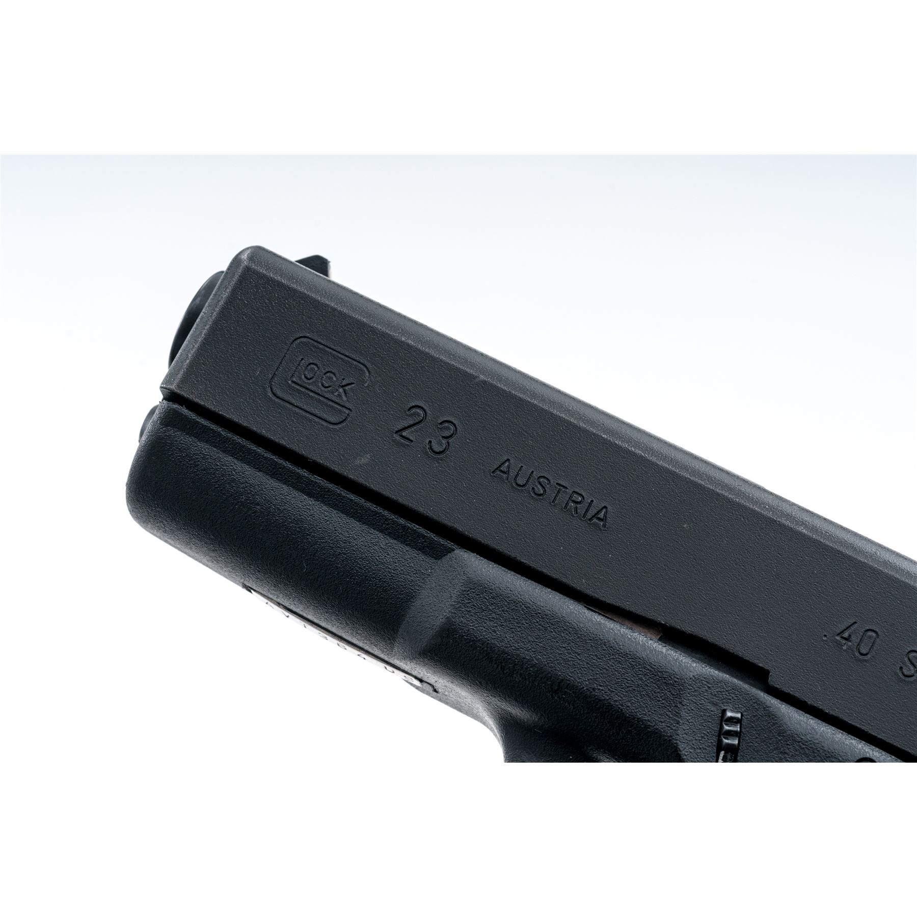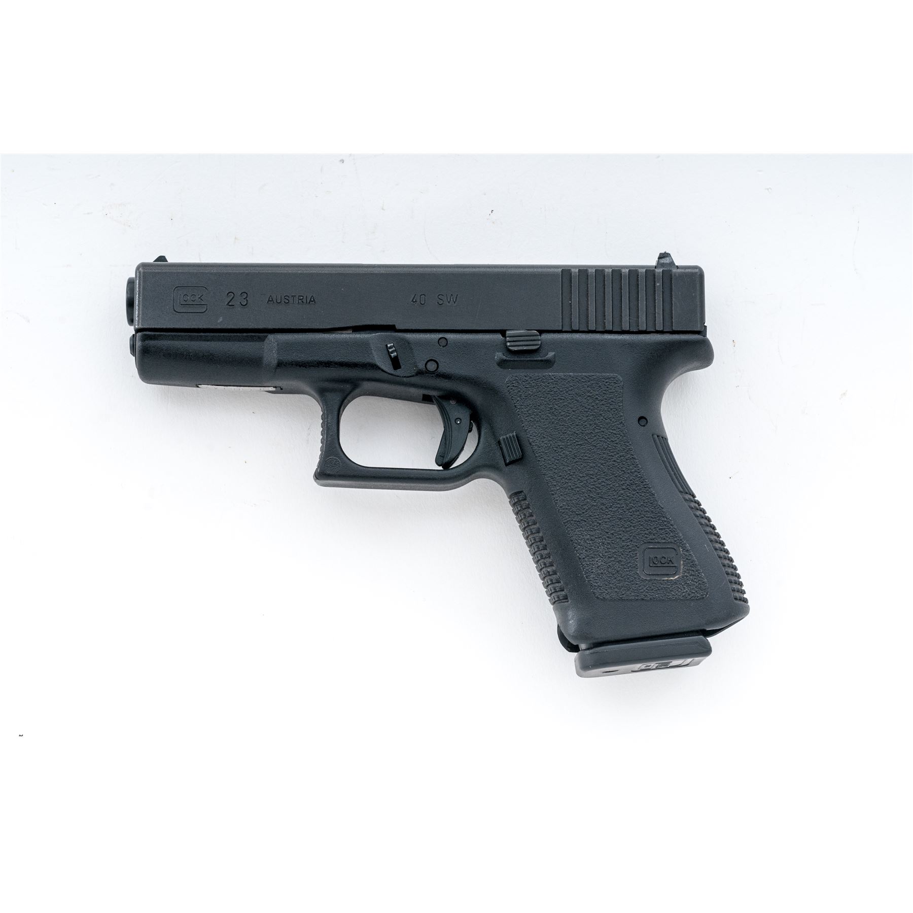 Glock Model 23 Gen 2 Semi-Automatic Pistol, #AVT364US, .40 S&W cal., 4'' barrel, matte black slide, black polymer frame, white-dot front sight and white outline square-notched rear sight, with one factory 13-round Glock magazine. Condition is excellent with a few light scuffs to the right front side of slide. Action is smooth, bright bore with sharp rifling. Overall a nice lightly used pistol. Est.: $300-$450. (Modern/PPT) (High-cap mag not available to Calif. residents.)
