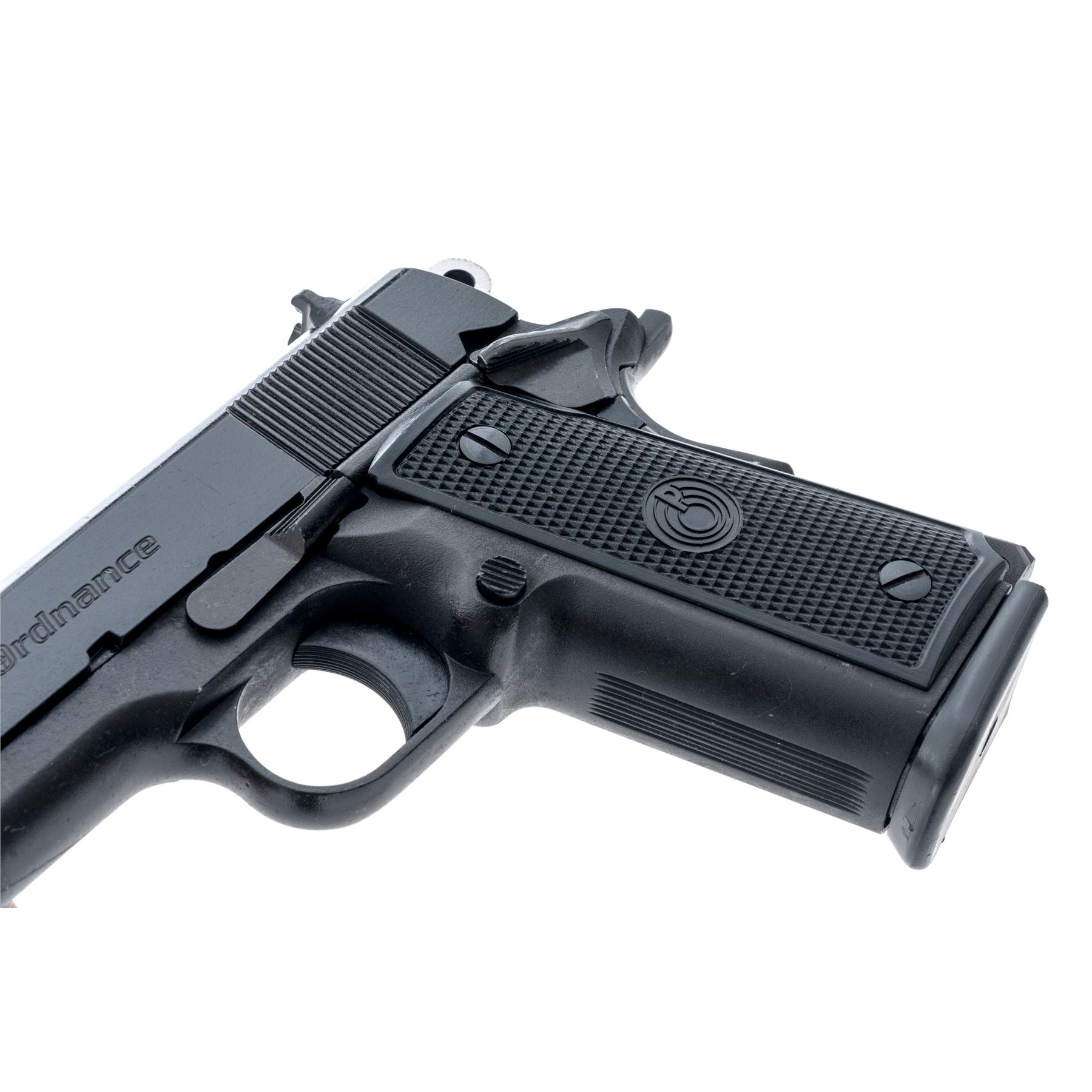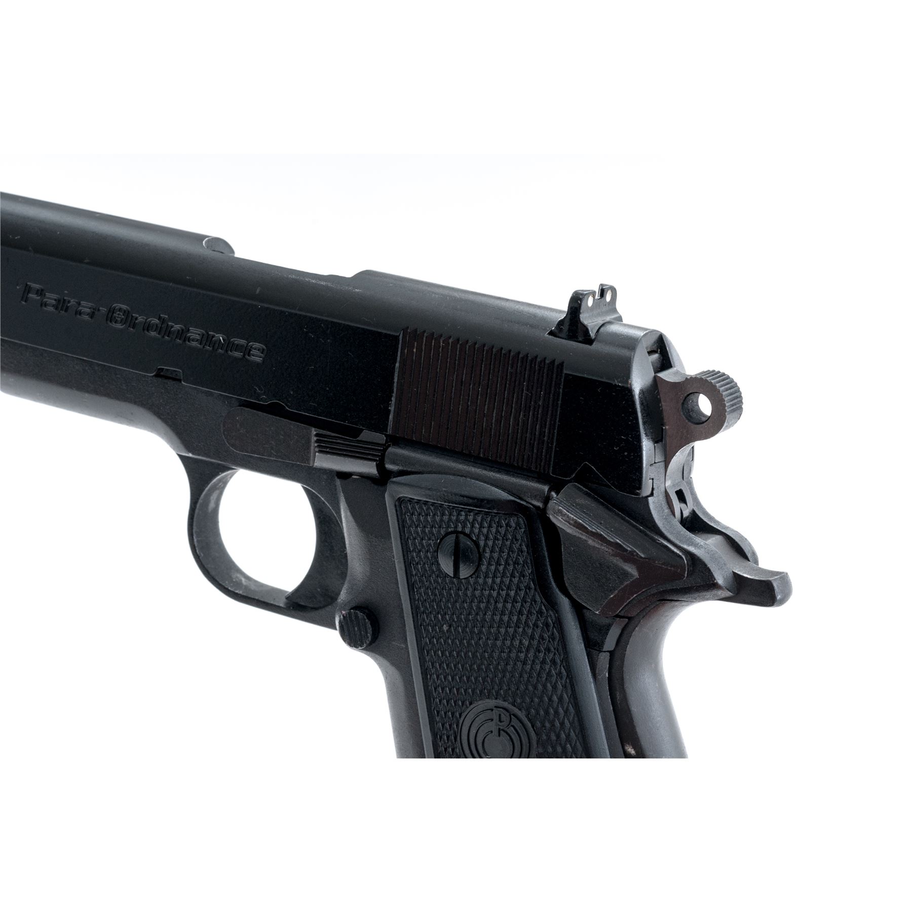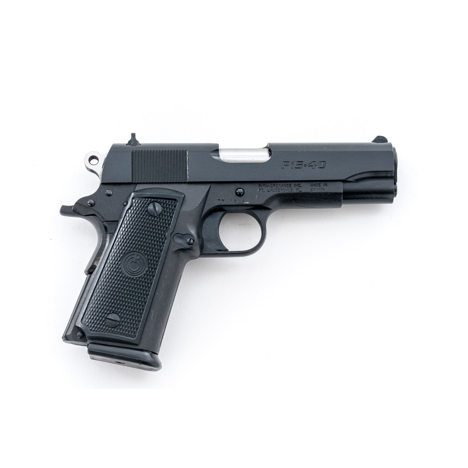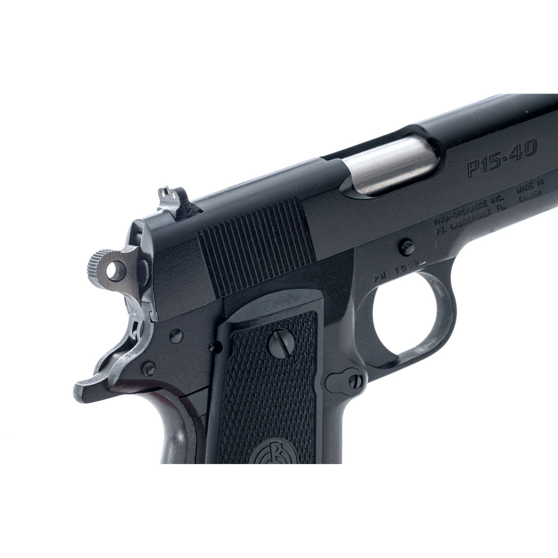 Para-Ordnance Model P15 Semi-Automatic Pistol, #PN1008, .40 S&W cal., 4.25'' barrel, black slide, matte black alloy frame, factory checkered black plastic grips, white 3-dot sights, and one unmarked 13-round magazine. Approx. 98% original finish remains and the frame and slide rate very good+ overall, slide with faint scratches and other small surface marks, factory lettering is clear and defined. Grips are near excellent with only a few minor handling marks. Tight smooth action, bright bore with excellent rifling. Est.: $350-$500. (Modern/PPT)(High-cap mags not available to Calif. residents.)