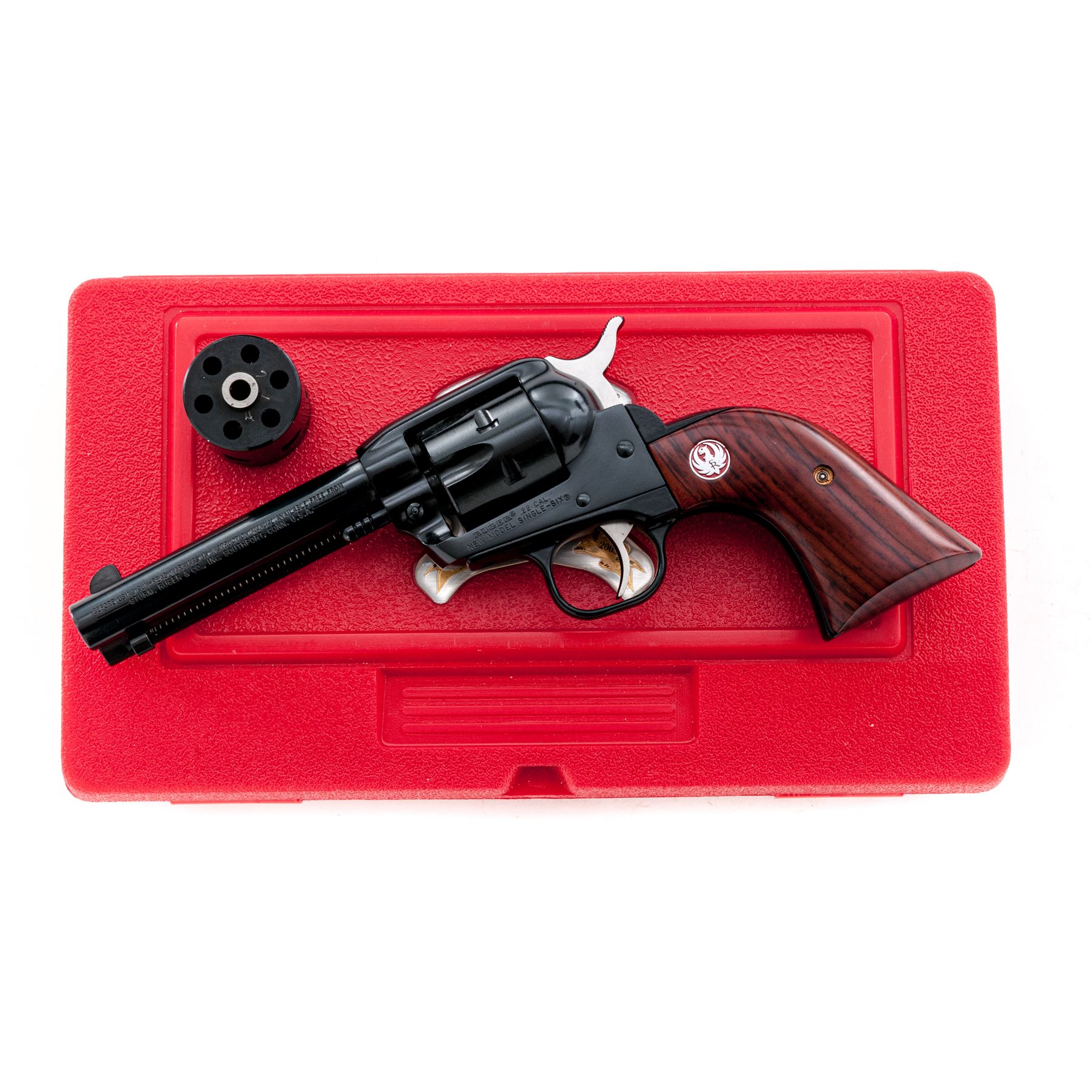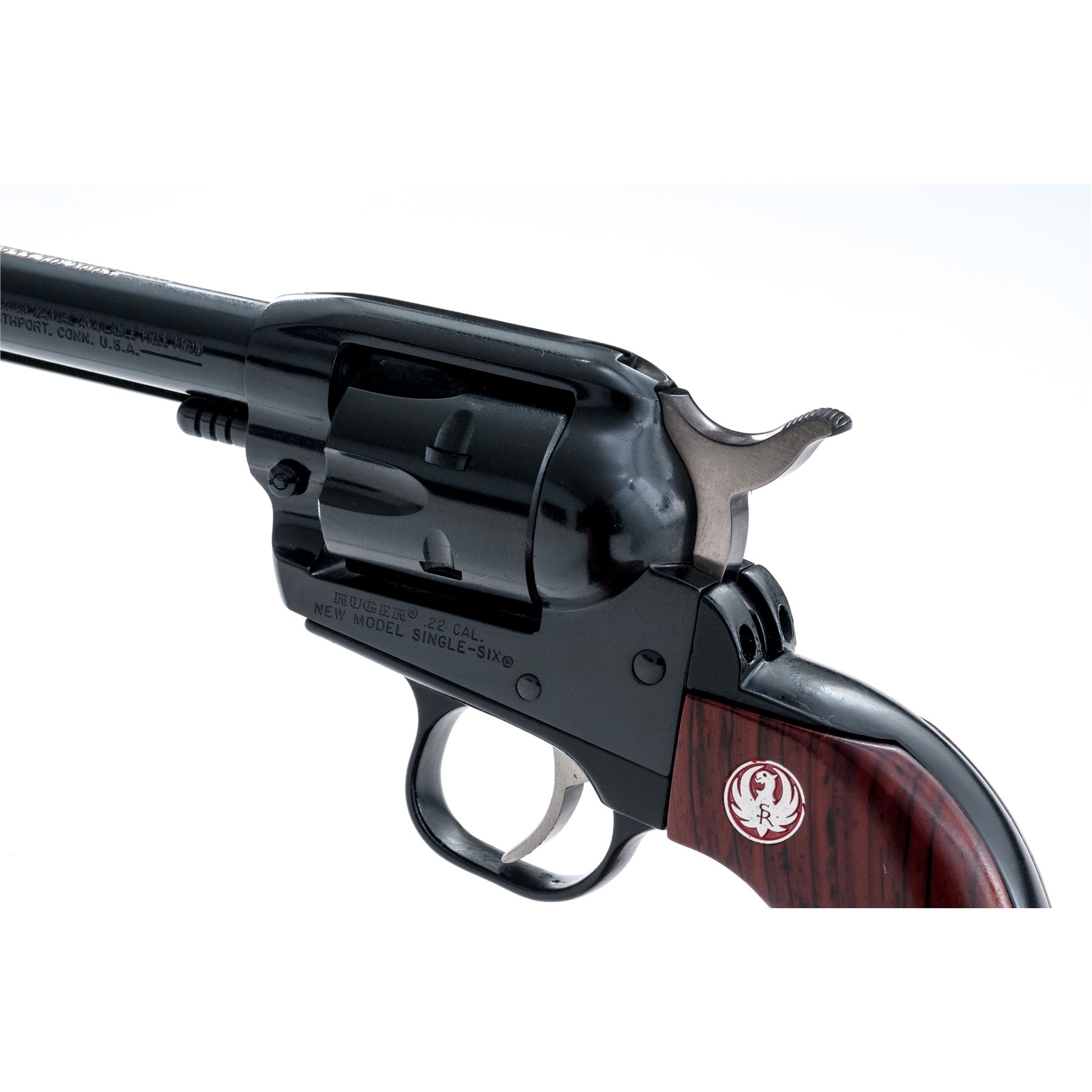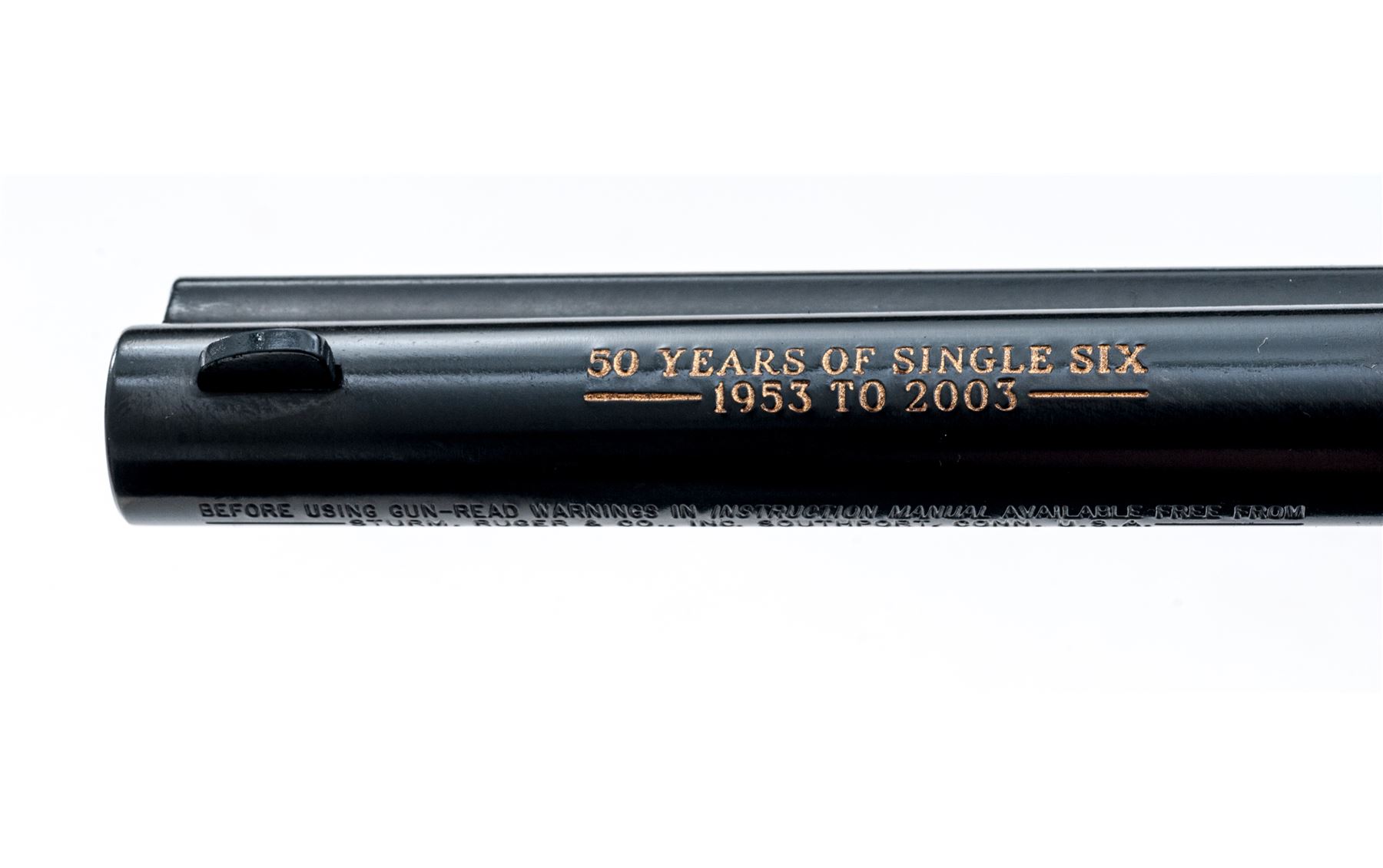 Mint Ruger 50th Anniversary New Model Single-Six Convertible Single Action Revolver, #268-43416, with both .22 LR and .22 Win. Mag. cylinders, 4.75'' barrel, blue finish, smooth cocobolo wood grips with red & silver Ruger medallions, with standard fixed sights. The top of the barrel is marked in gold lettering ''50 YEARS OF SINGLE SIX / 1953-2003''. In the original red plastic Ruger case with matching end label, gun lock, owner's manual, and other misc. paperwork. Condition is excellent appearing as new and unfired. Both cylinders appear unturned, .22 LR cylinder with a single faint surface scratch. Grips also look as new. Bore is mirror bright. Est.: $350-$500. (Modern)