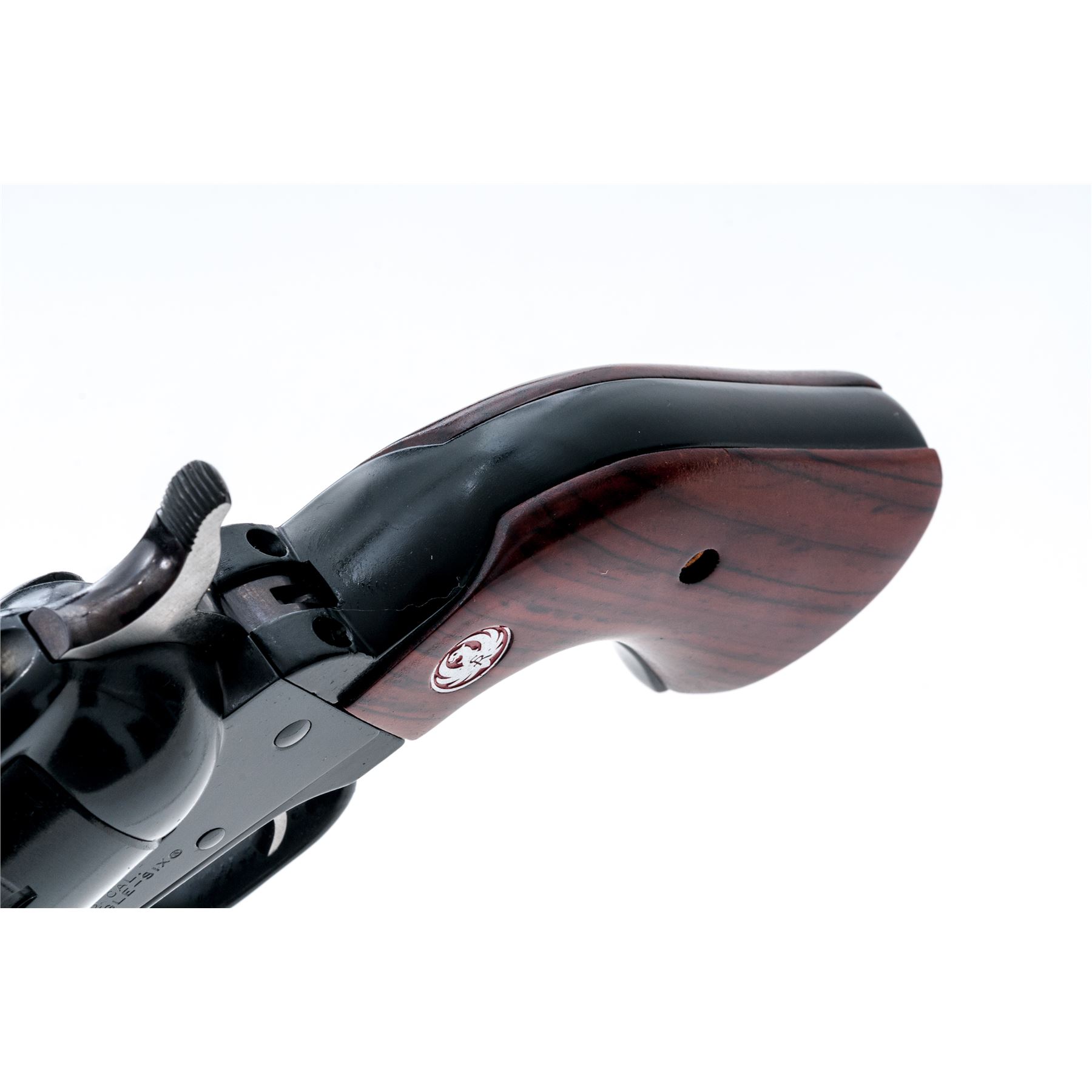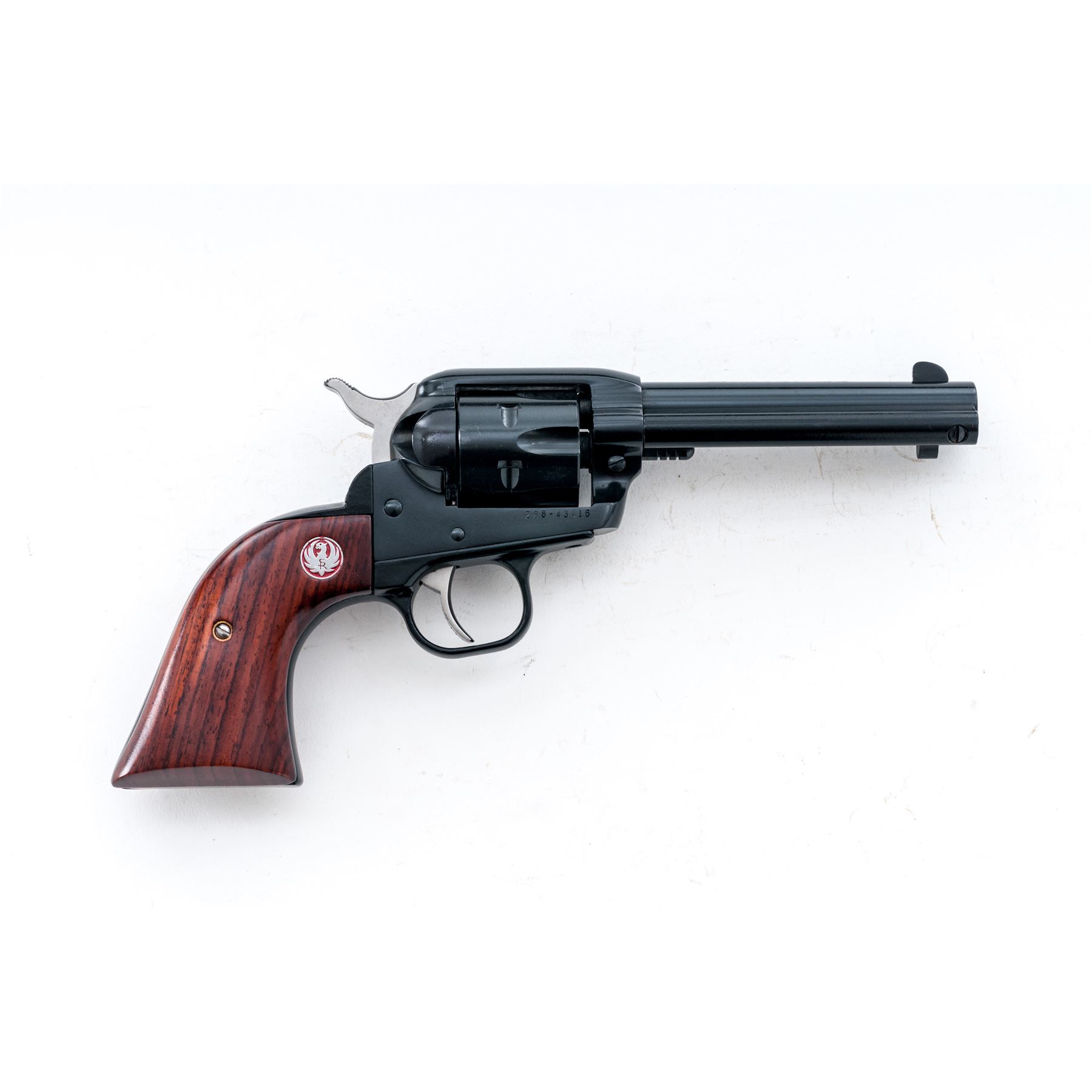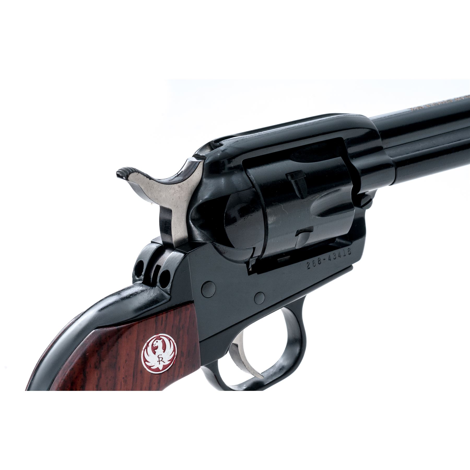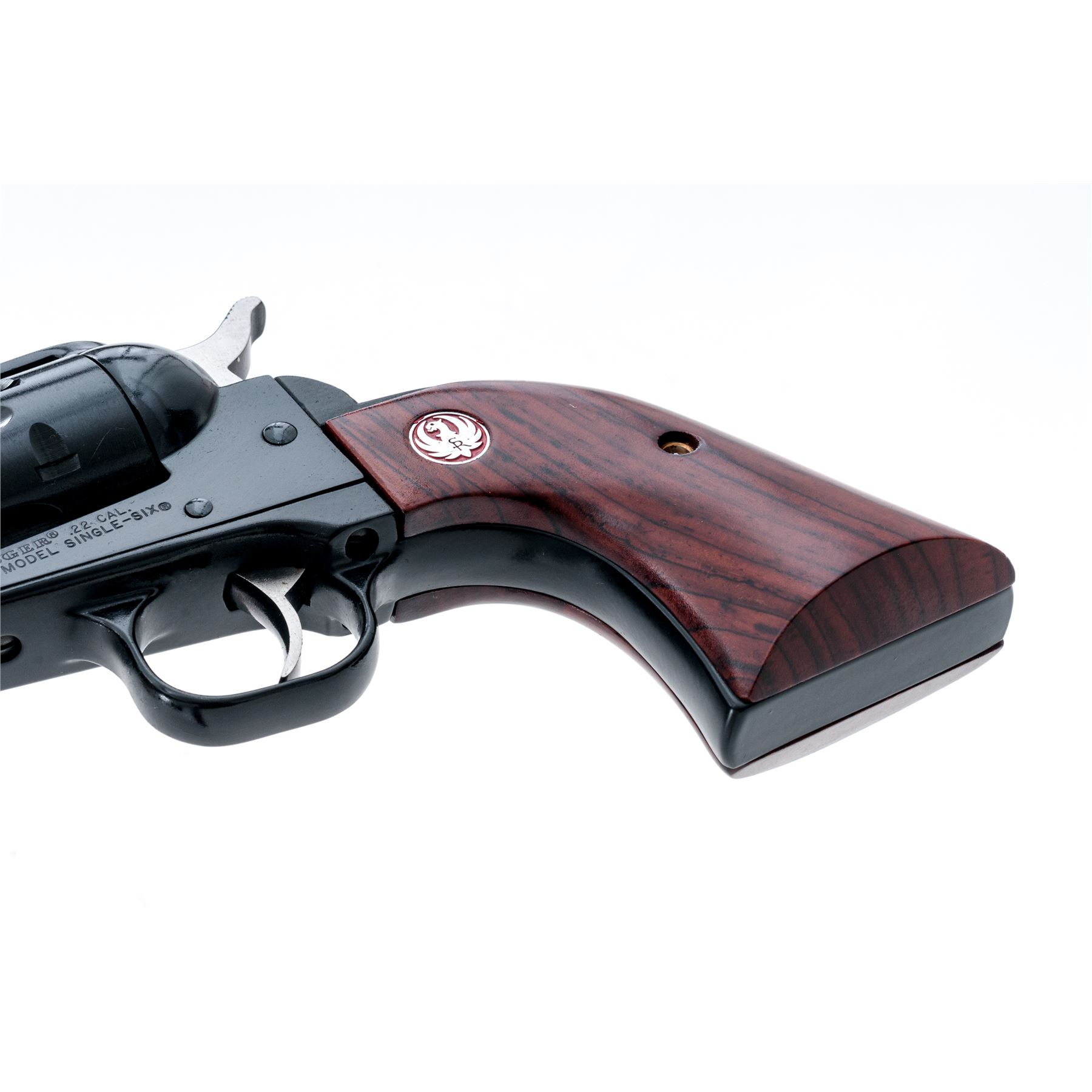 Mint Ruger 50th Anniversary New Model Single-Six Convertible Single Action Revolver, #268-43416, with both .22 LR and .22 Win. Mag. cylinders, 4.75'' barrel, blue finish, smooth cocobolo wood grips with red & silver Ruger medallions, with standard fixed sights. The top of the barrel is marked in gold lettering ''50 YEARS OF SINGLE SIX / 1953-2003''. In the original red plastic Ruger case with matching end label, gun lock, owner's manual, and other misc. paperwork. Condition is excellent appearing as new and unfired. Both cylinders appear unturned, .22 LR cylinder with a single faint surface scratch. Grips also look as new. Bore is mirror bright. Est.: $350-$500. (Modern)